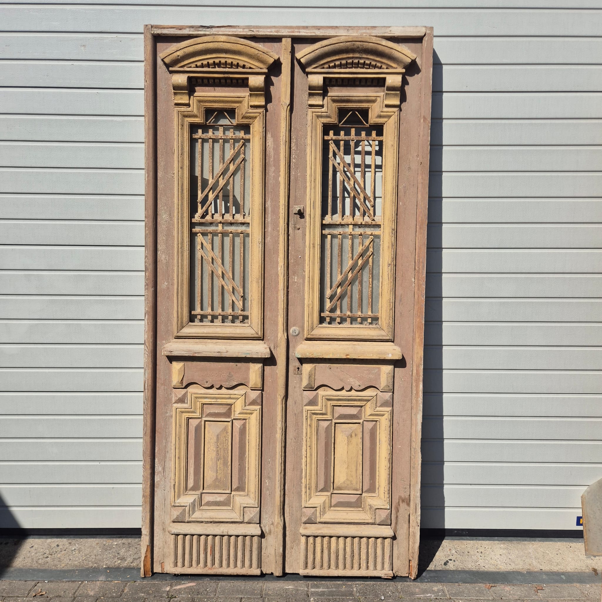 Geef uw bouwproject een uniek karakter! Te koop aangeboden: een indrukwekkende, massieve dubbele voordeur uit circa 1880. Dit architectonische juweel imponeert met zijn imposante verschijning en het meesterlijke vakmanschap van de late 19e eeuw.