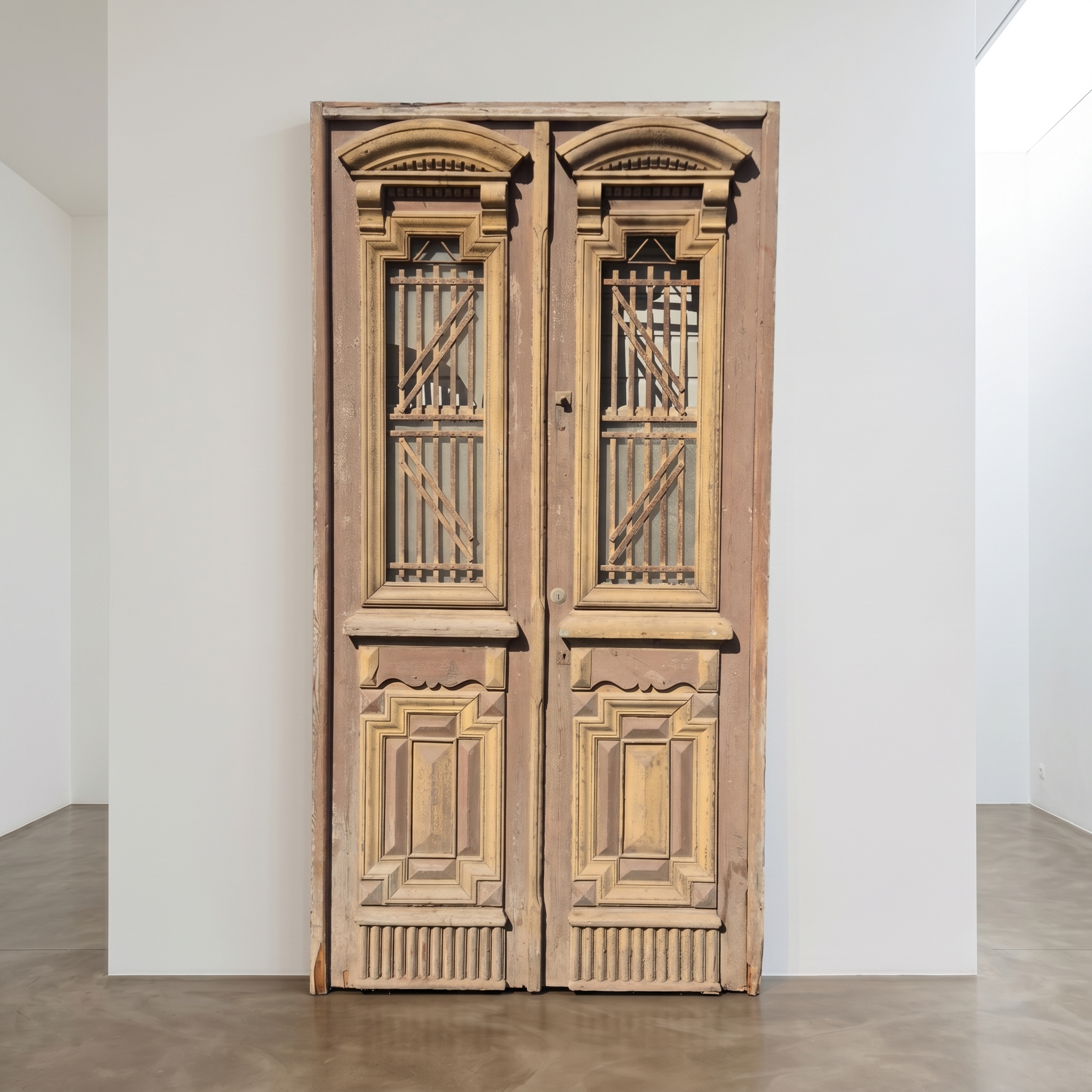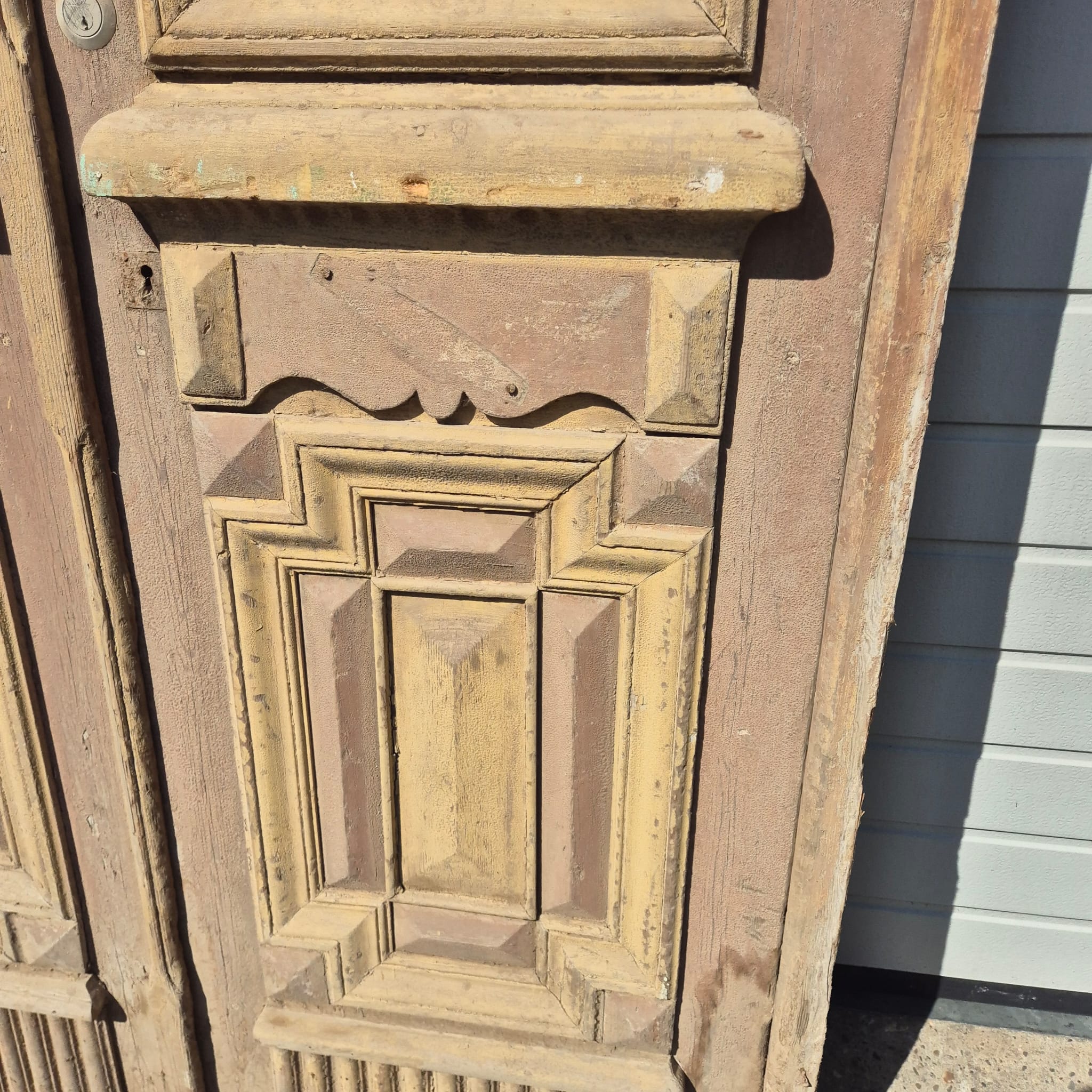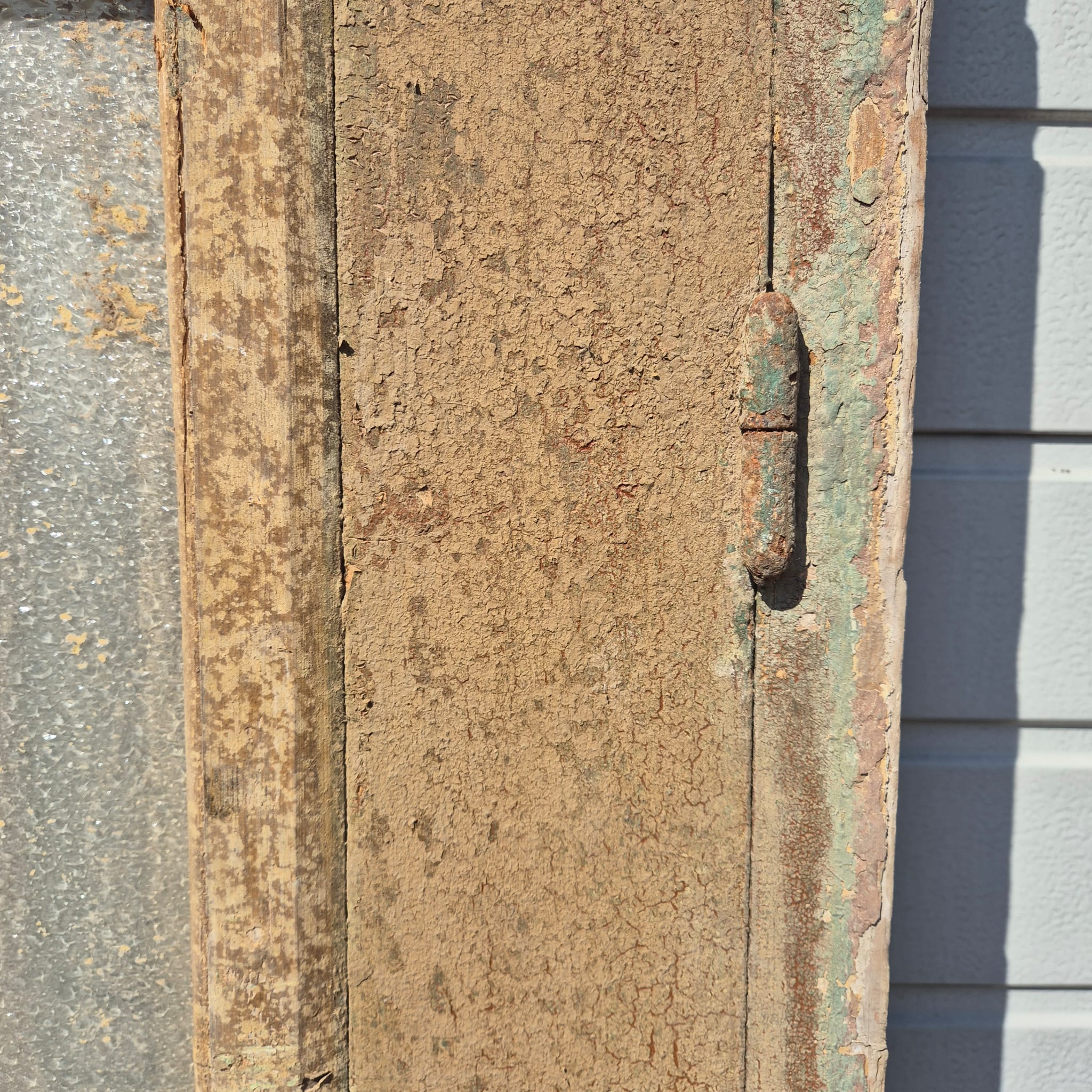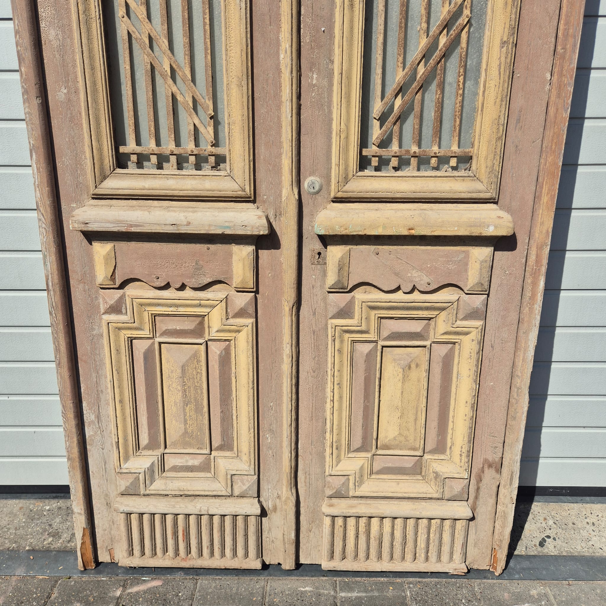 Historisch ontwerp: Het kozijn en de deurvleugels zijn in ongerestaureerde originele staat met een fascinerende, meerlaagse beige verfafwerking die een unieke patina heeft ontwikkeld.
