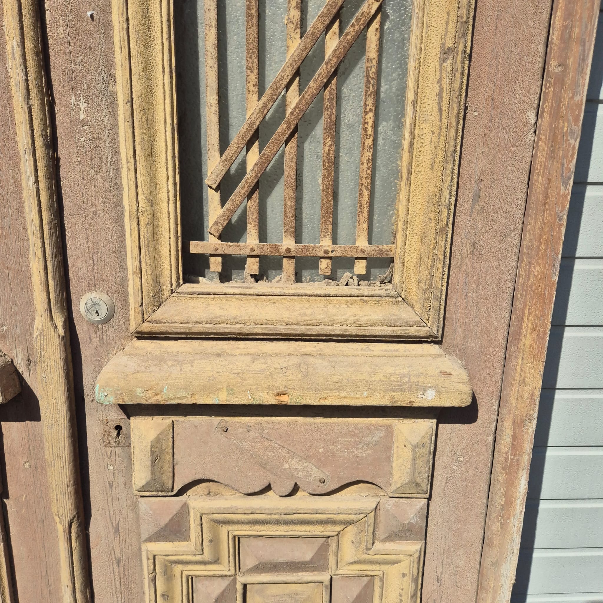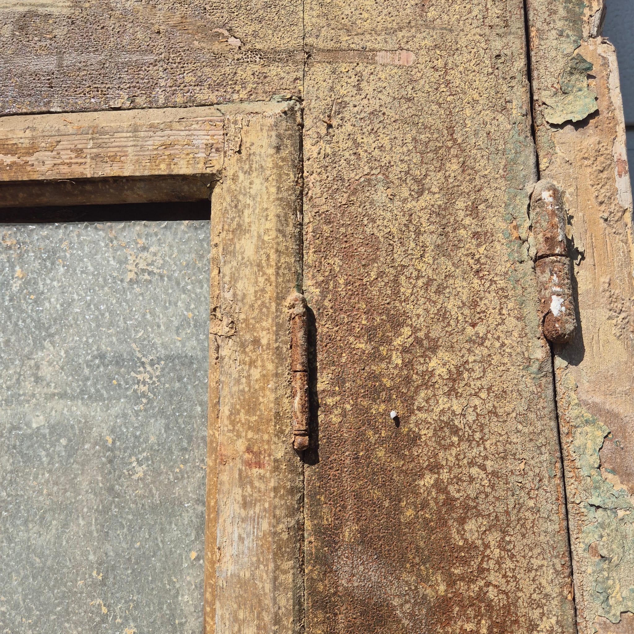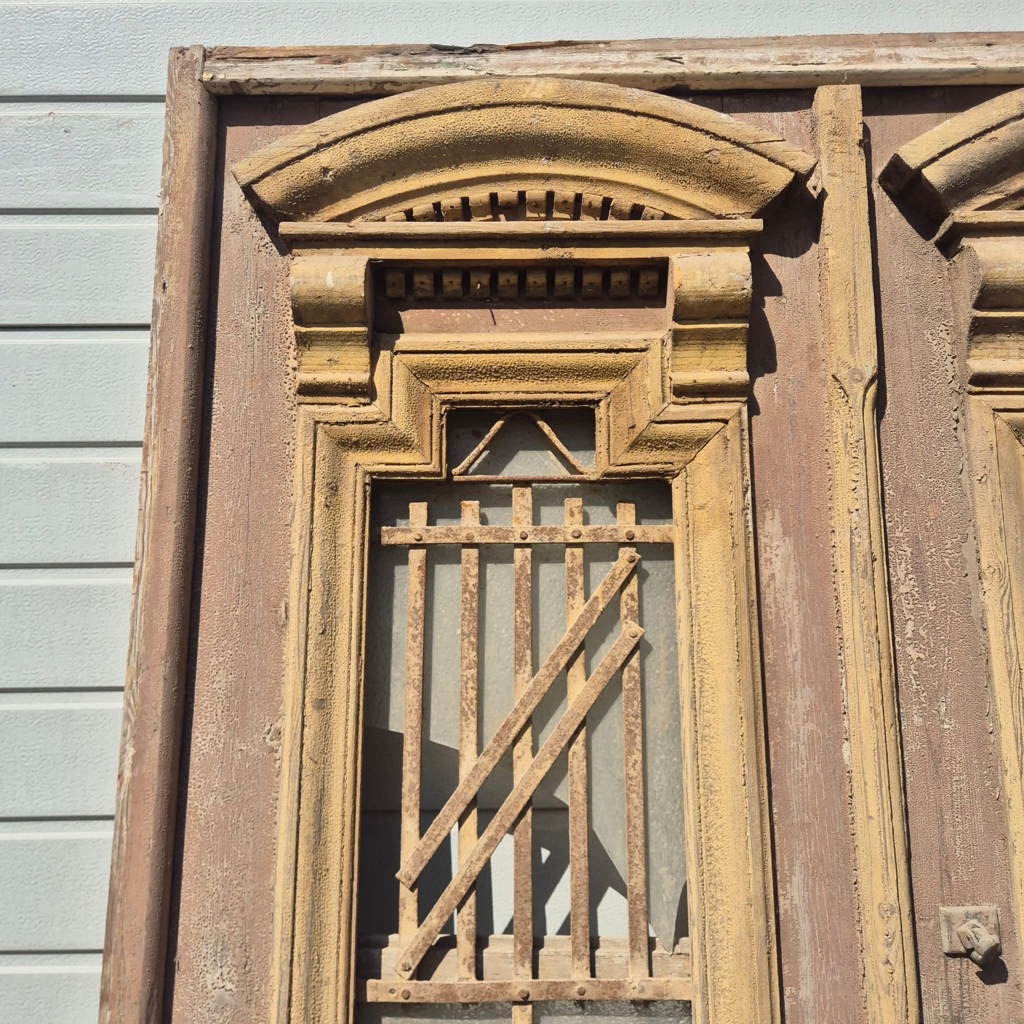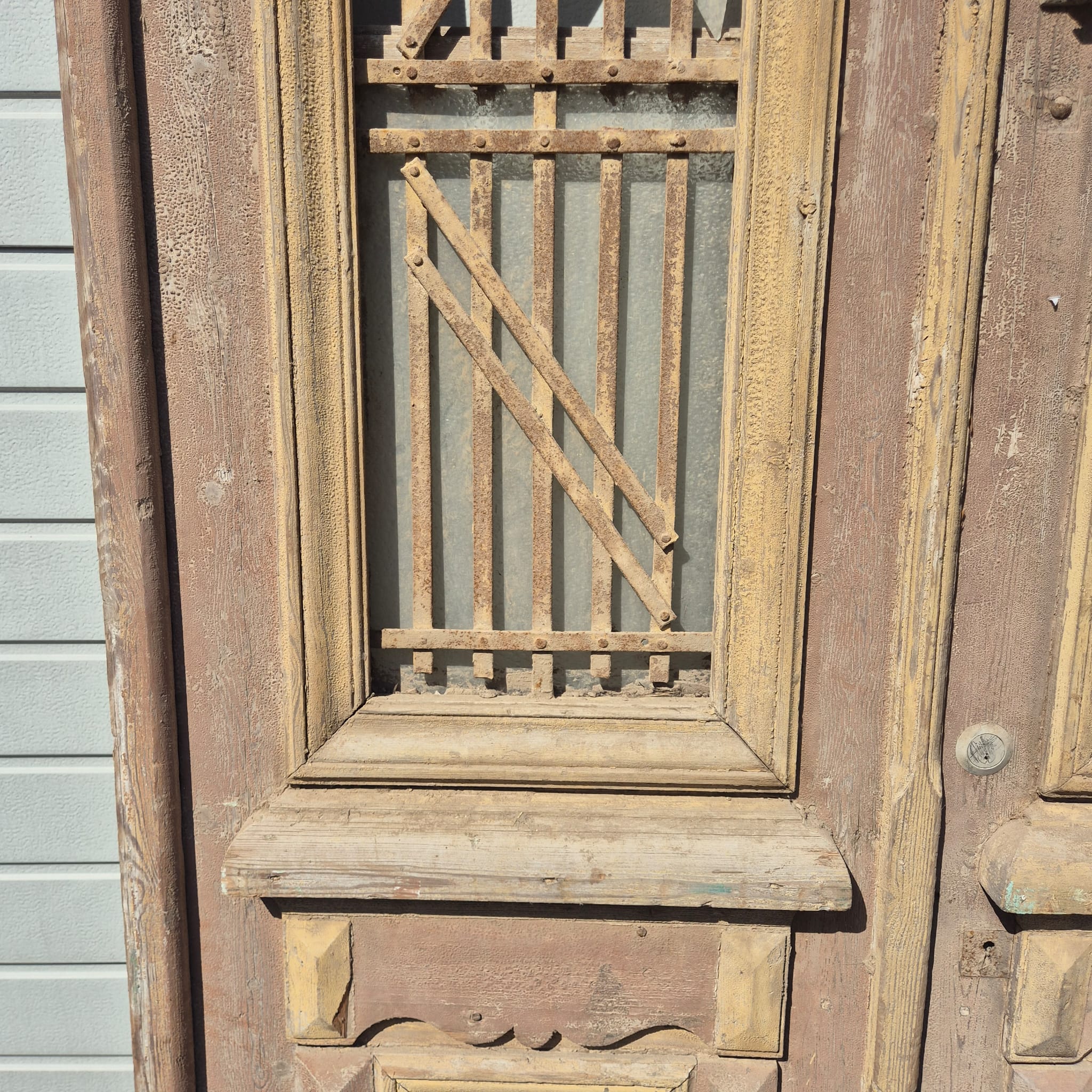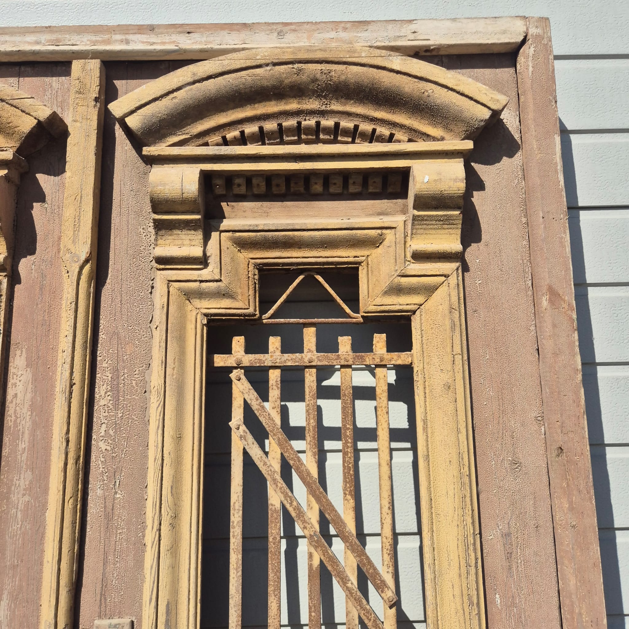 Historisch ontwerp: Het kozijn en de deurvleugels zijn in ongerestaureerde originele staat met een fascinerende, meerlaagse beige verfafwerking die een unieke patina heeft ontwikkeld.