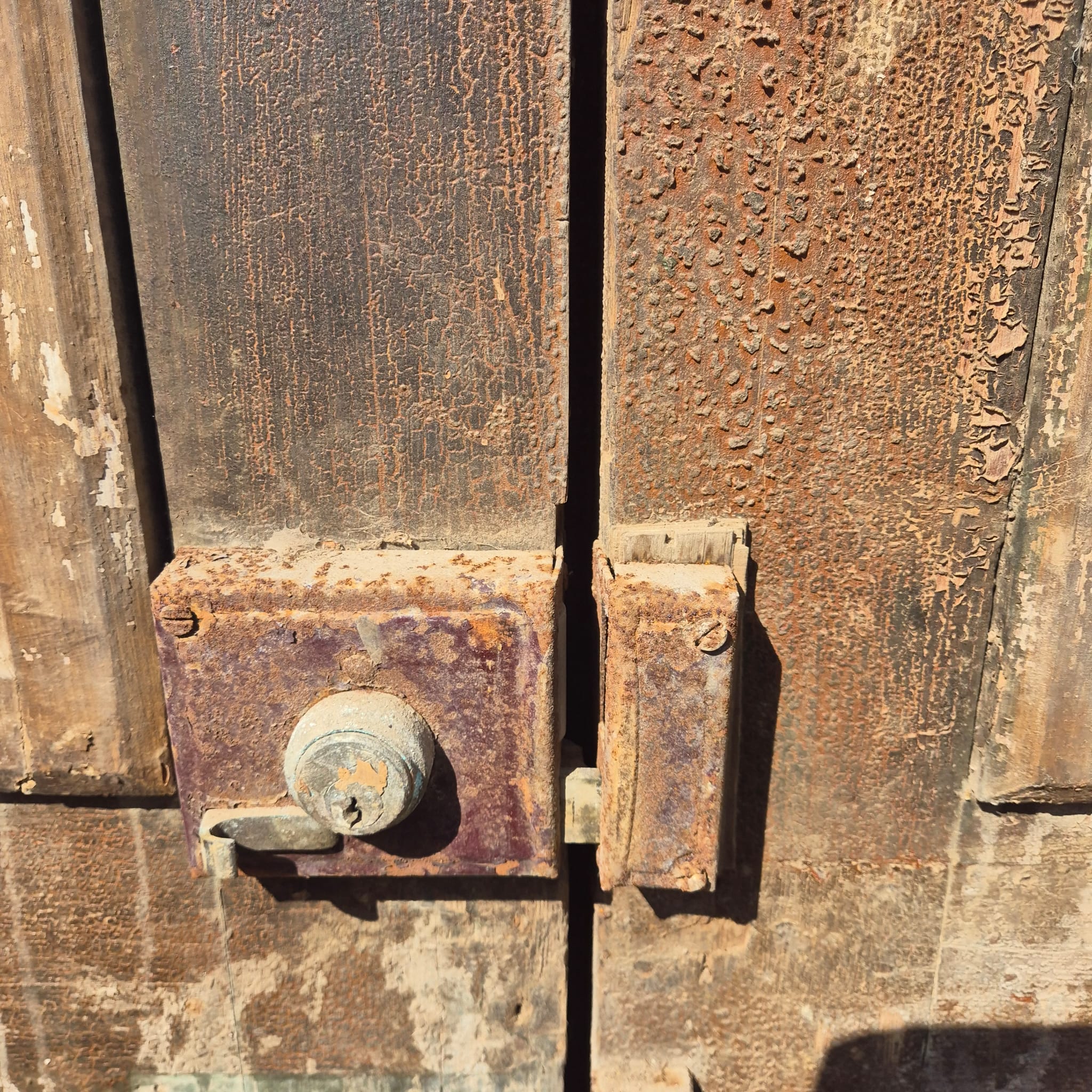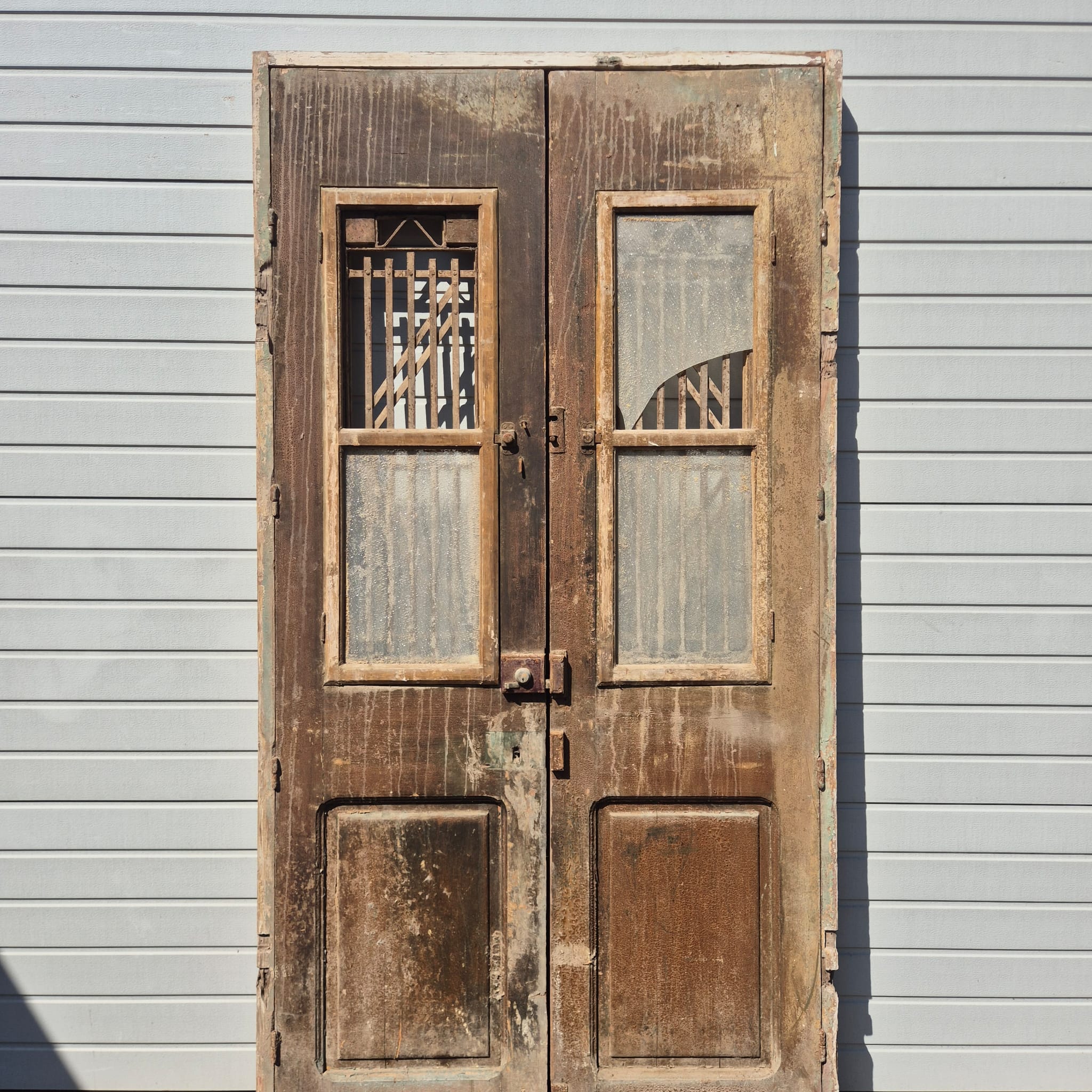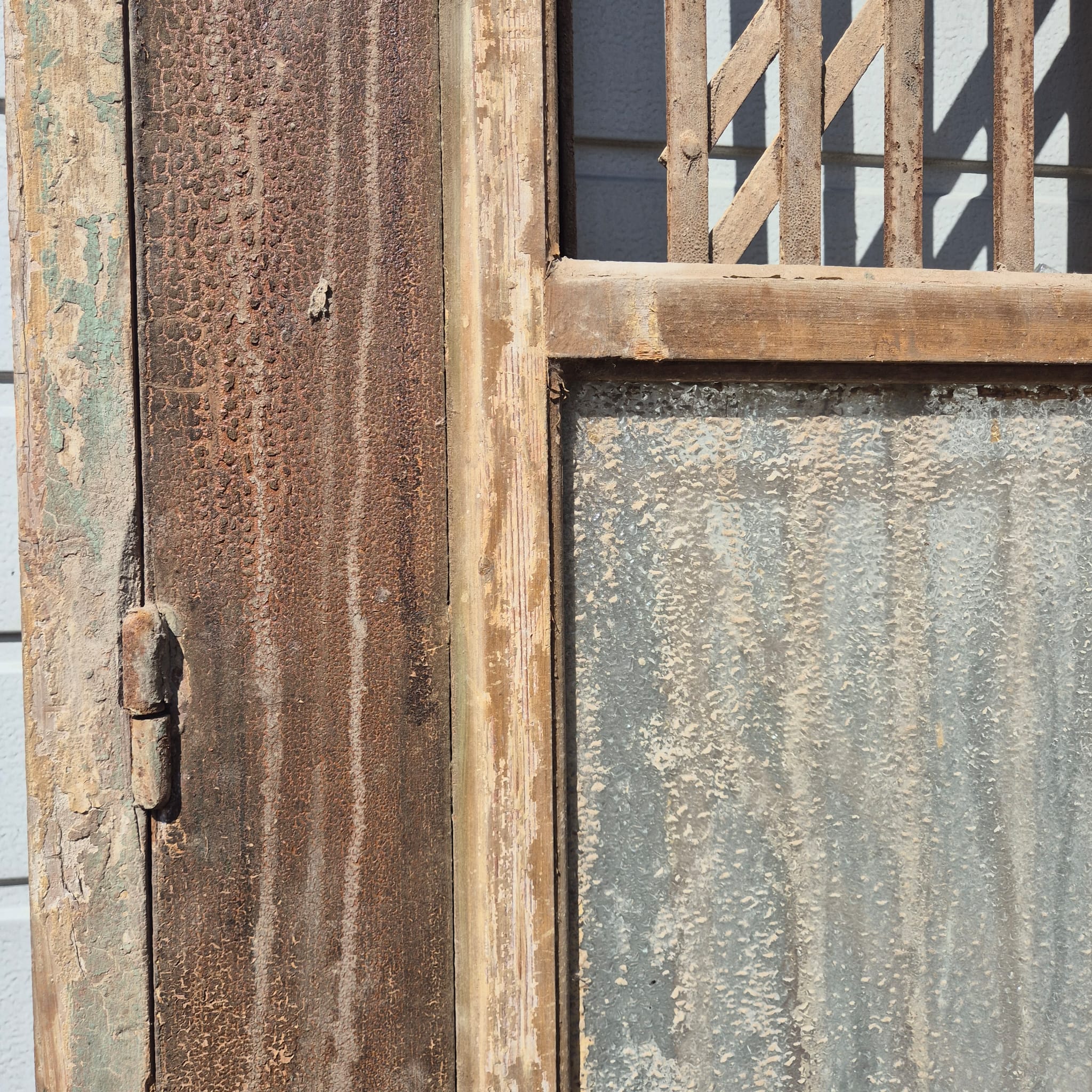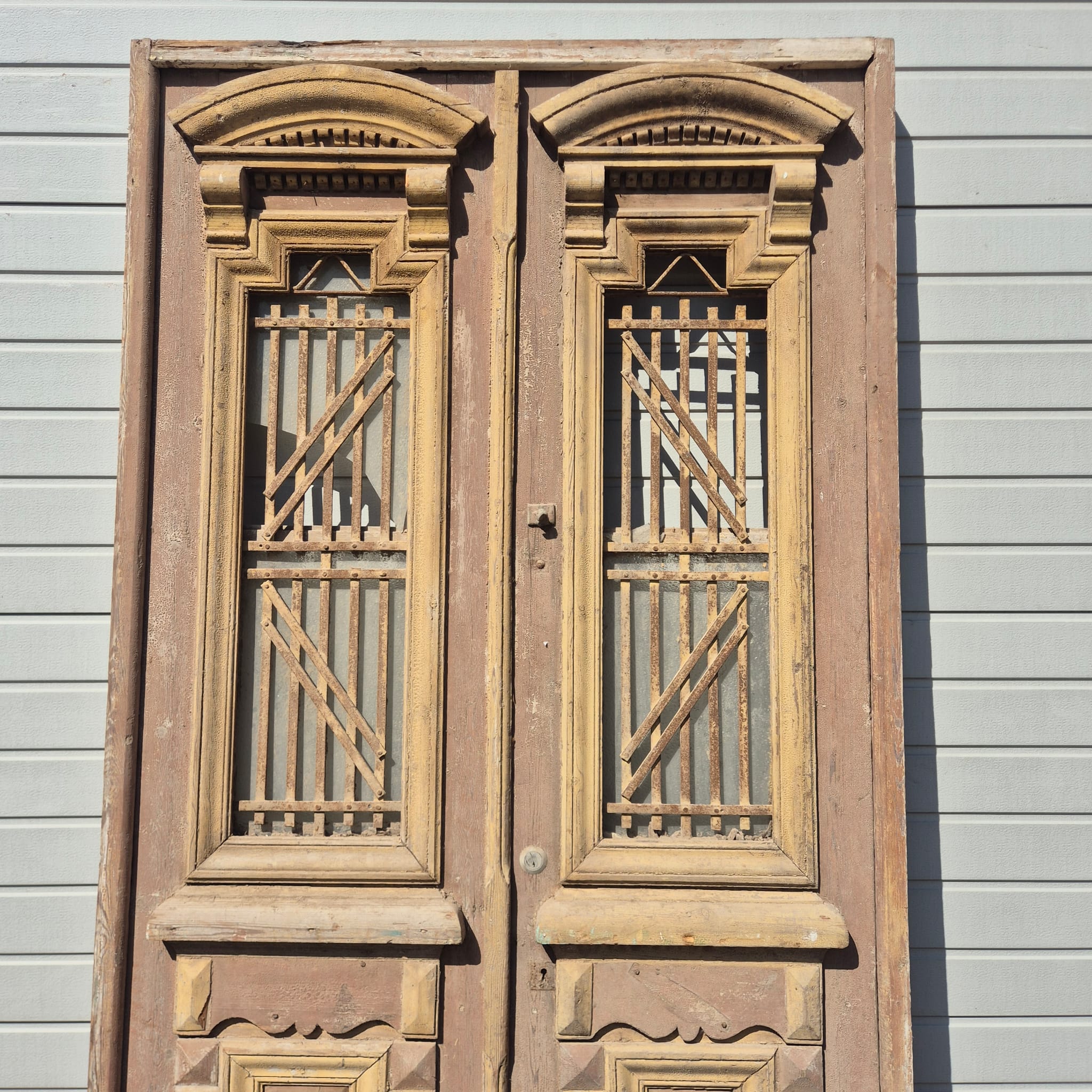 Historisch ontwerp: Het kozijn en de deurvleugels zijn in ongerestaureerde originele staat met een fascinerende, meerlaagse beige verfafwerking die een unieke patina heeft ontwikkeld.