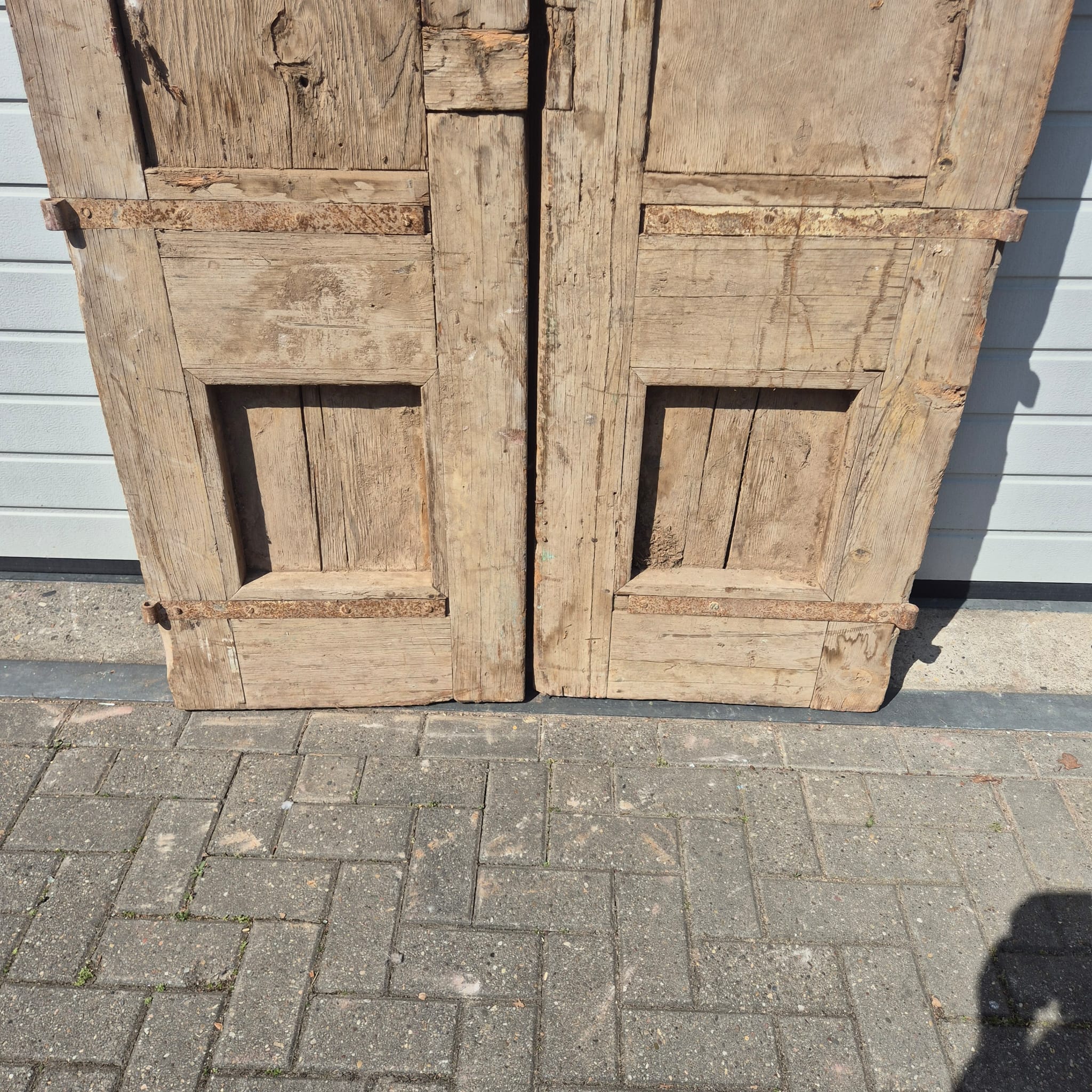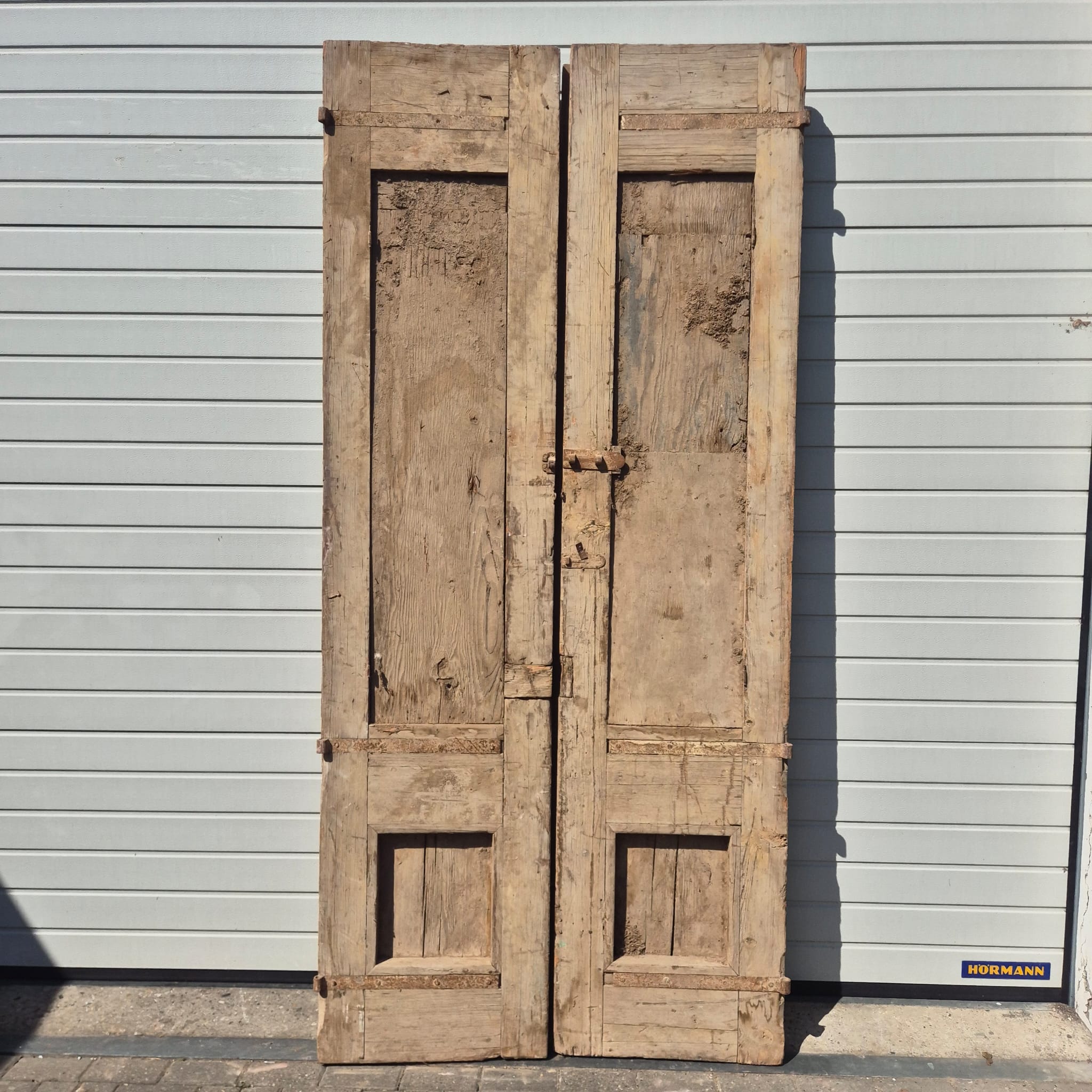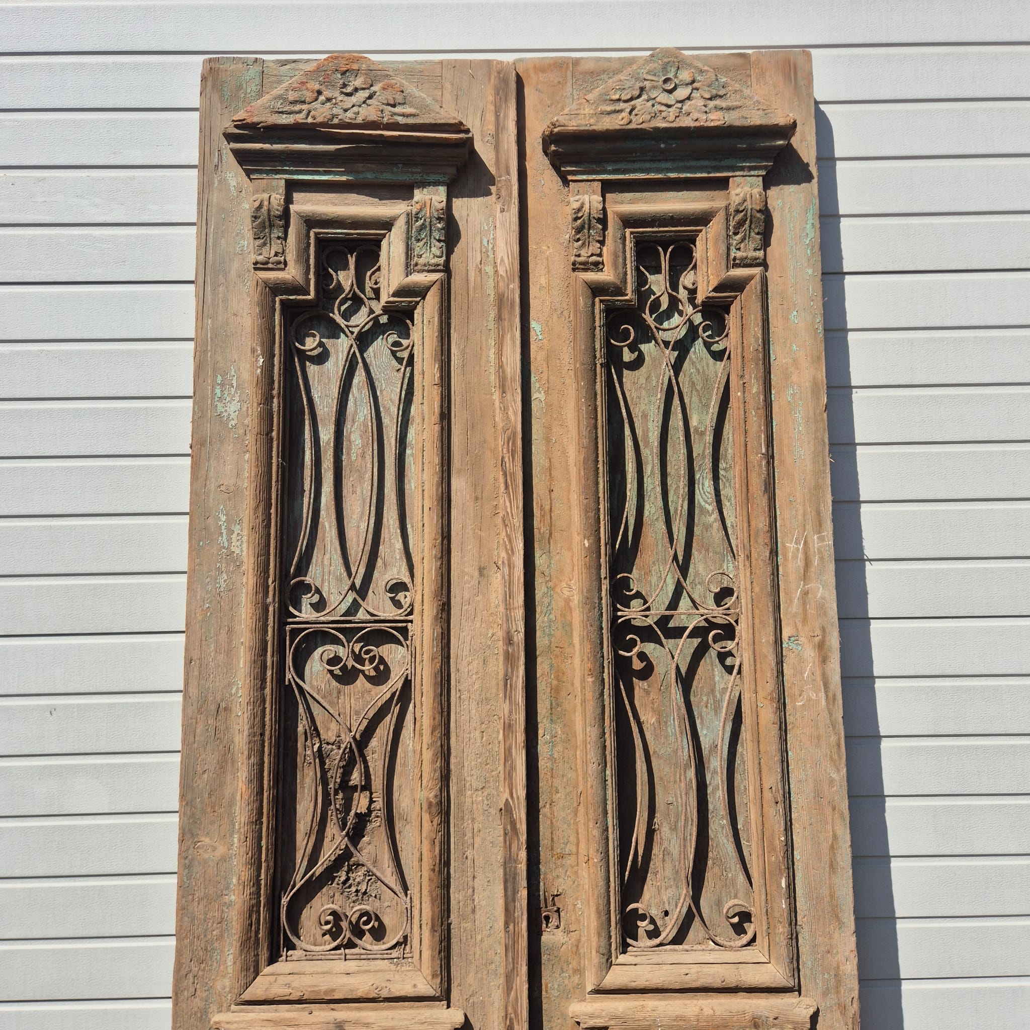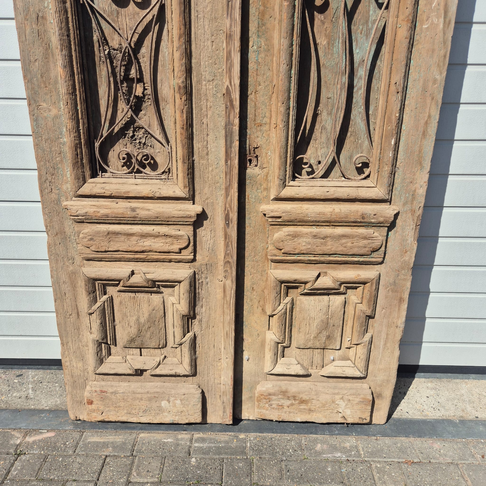 Historisch ontwerp: De deurvleugels zijn in ongerestaureerde originele staat met een fascinerende, meerlaagse beige afwerking die een unieke patina heeft ontwikkeld.