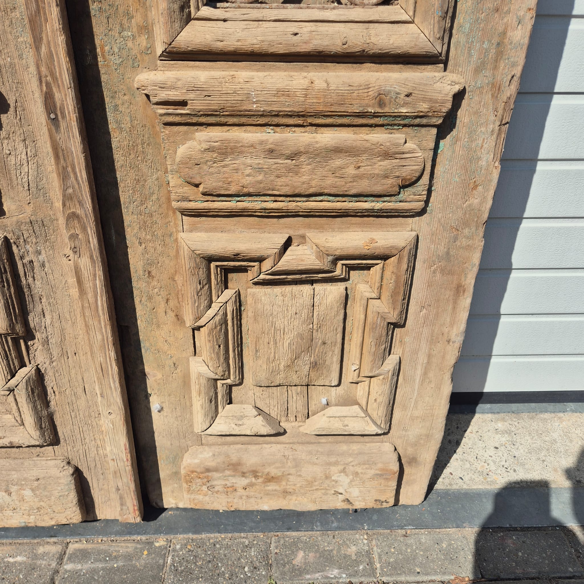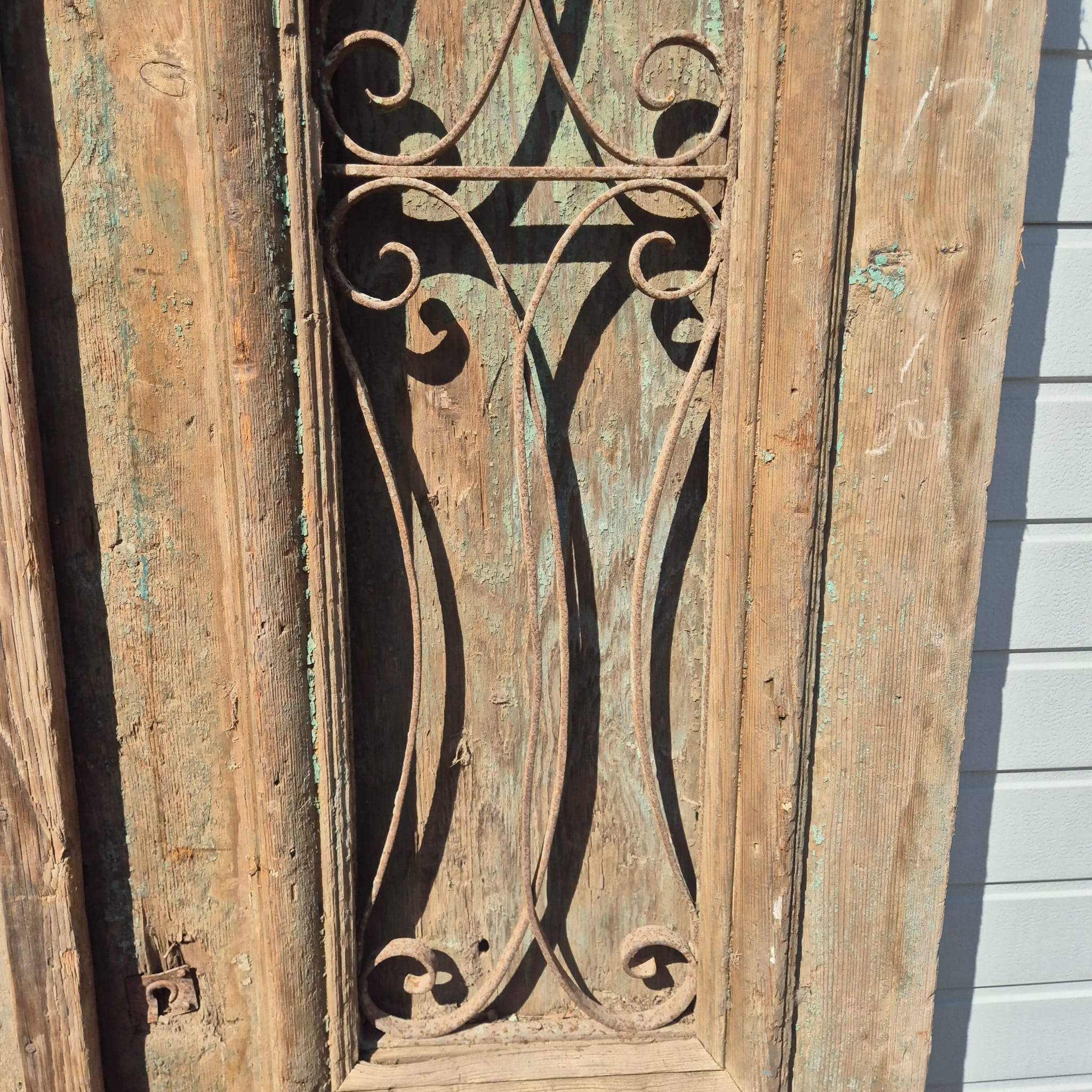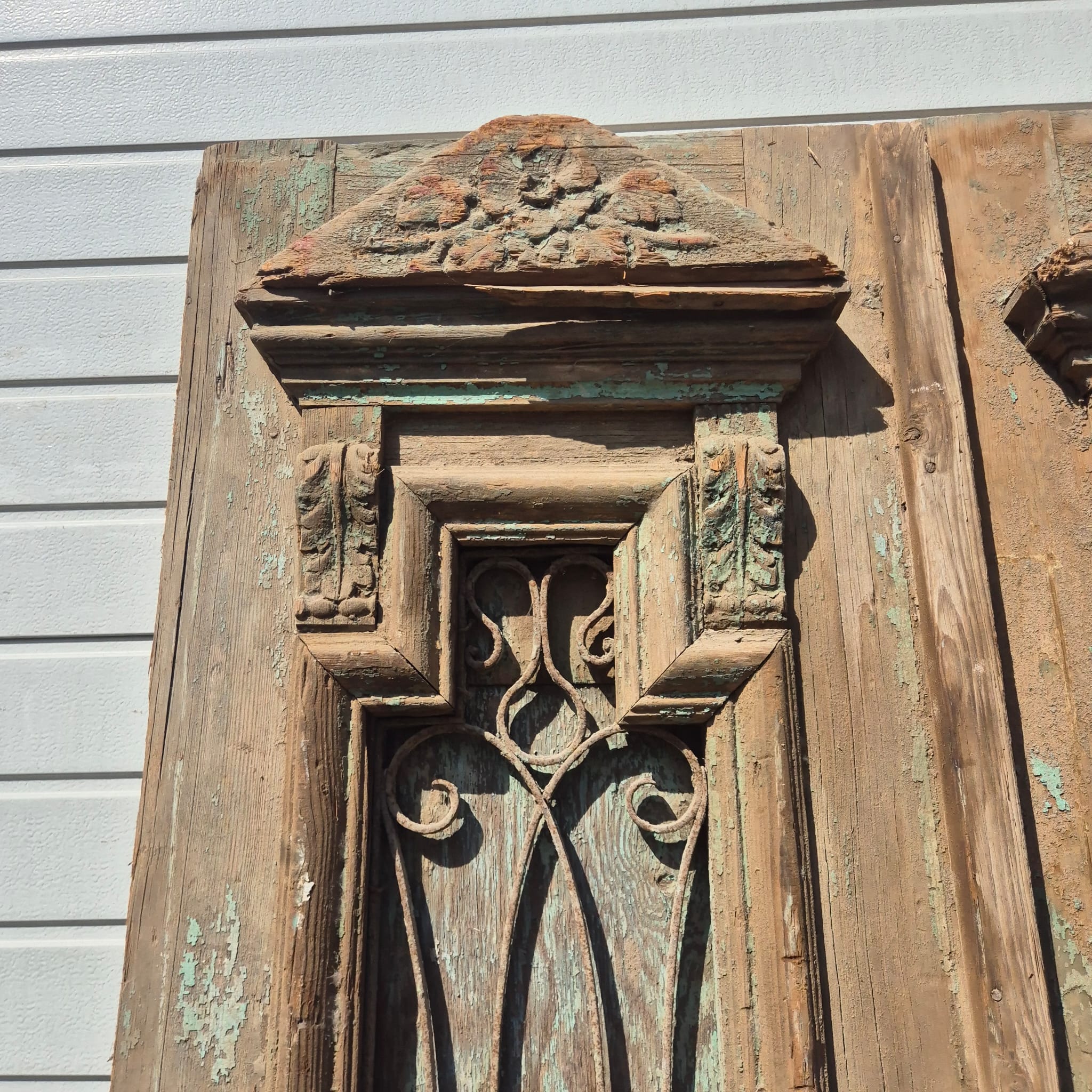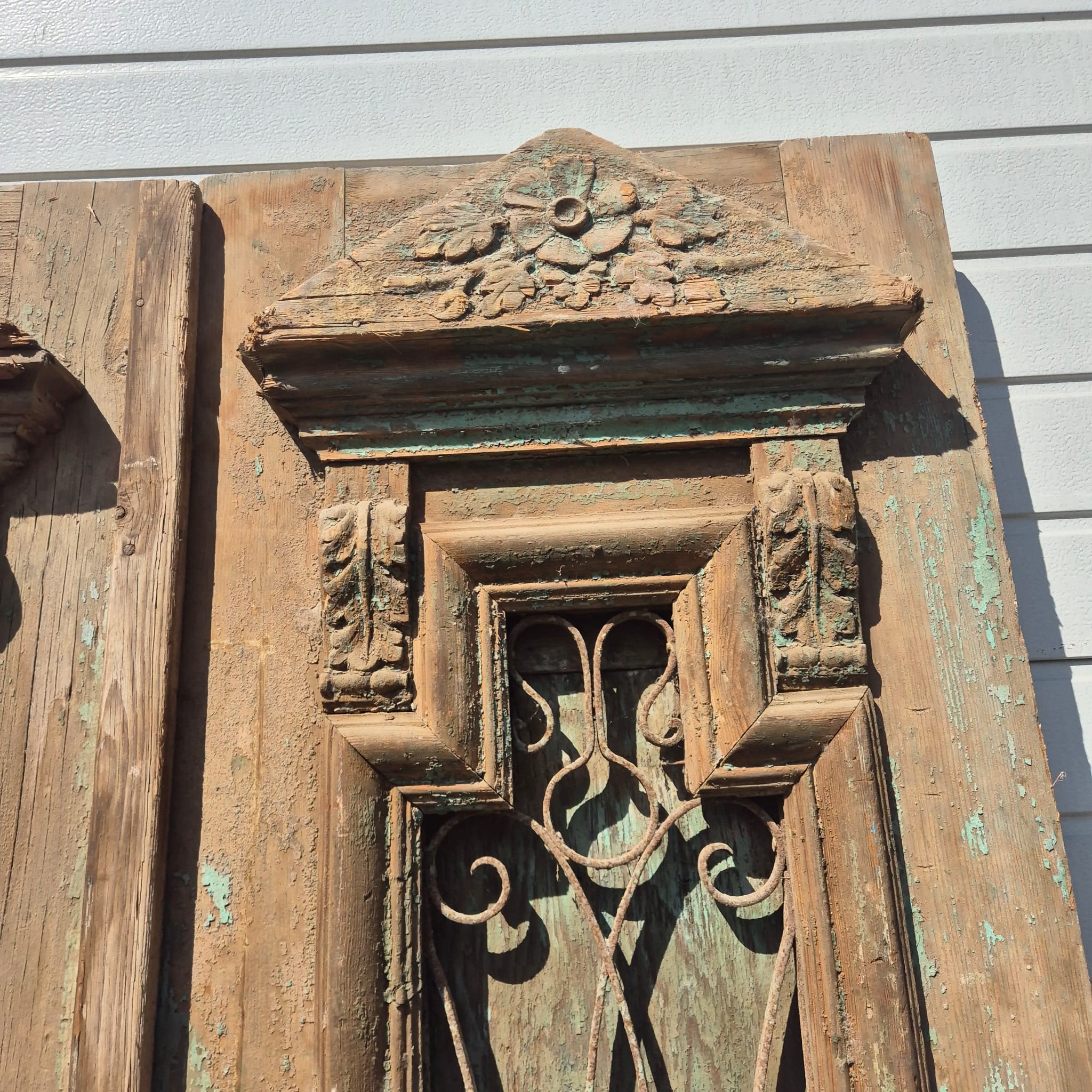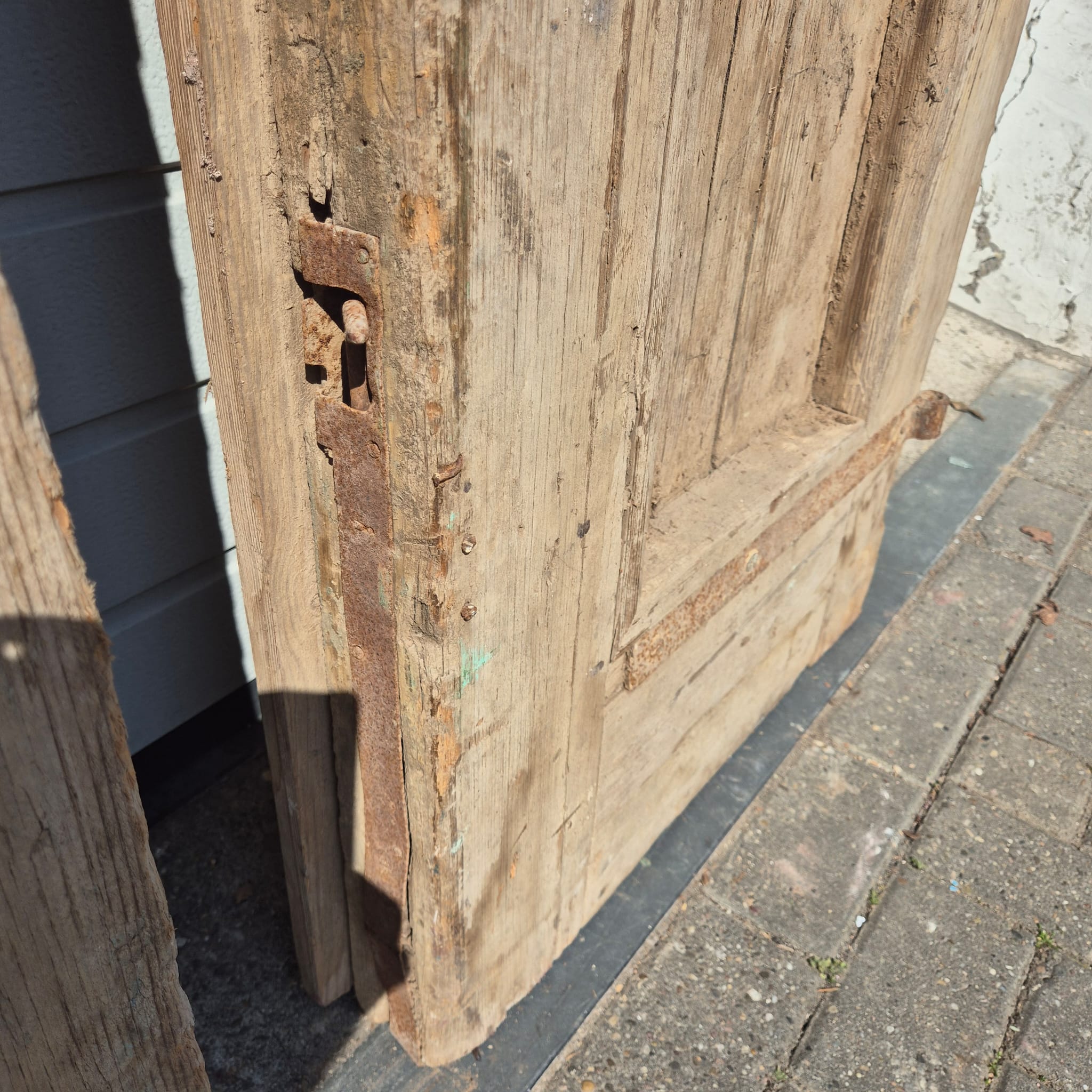 Historisch ontwerp: De deurvleugels zijn in ongerestaureerde originele staat met een fascinerende, meerlaagse beige afwerking die een unieke patina heeft ontwikkeld.