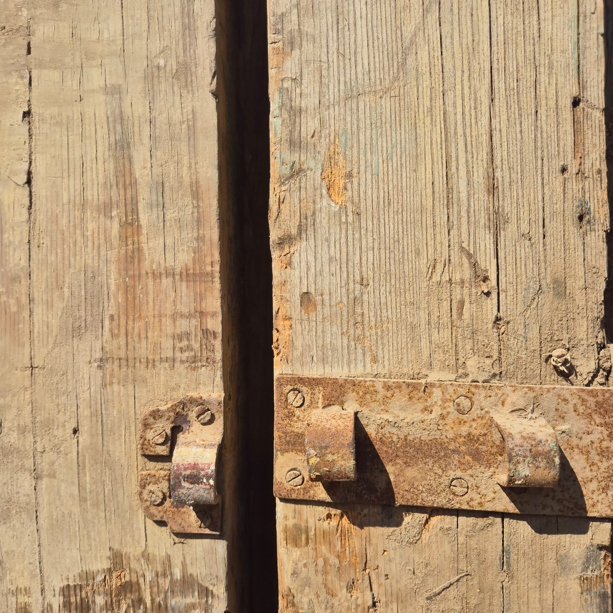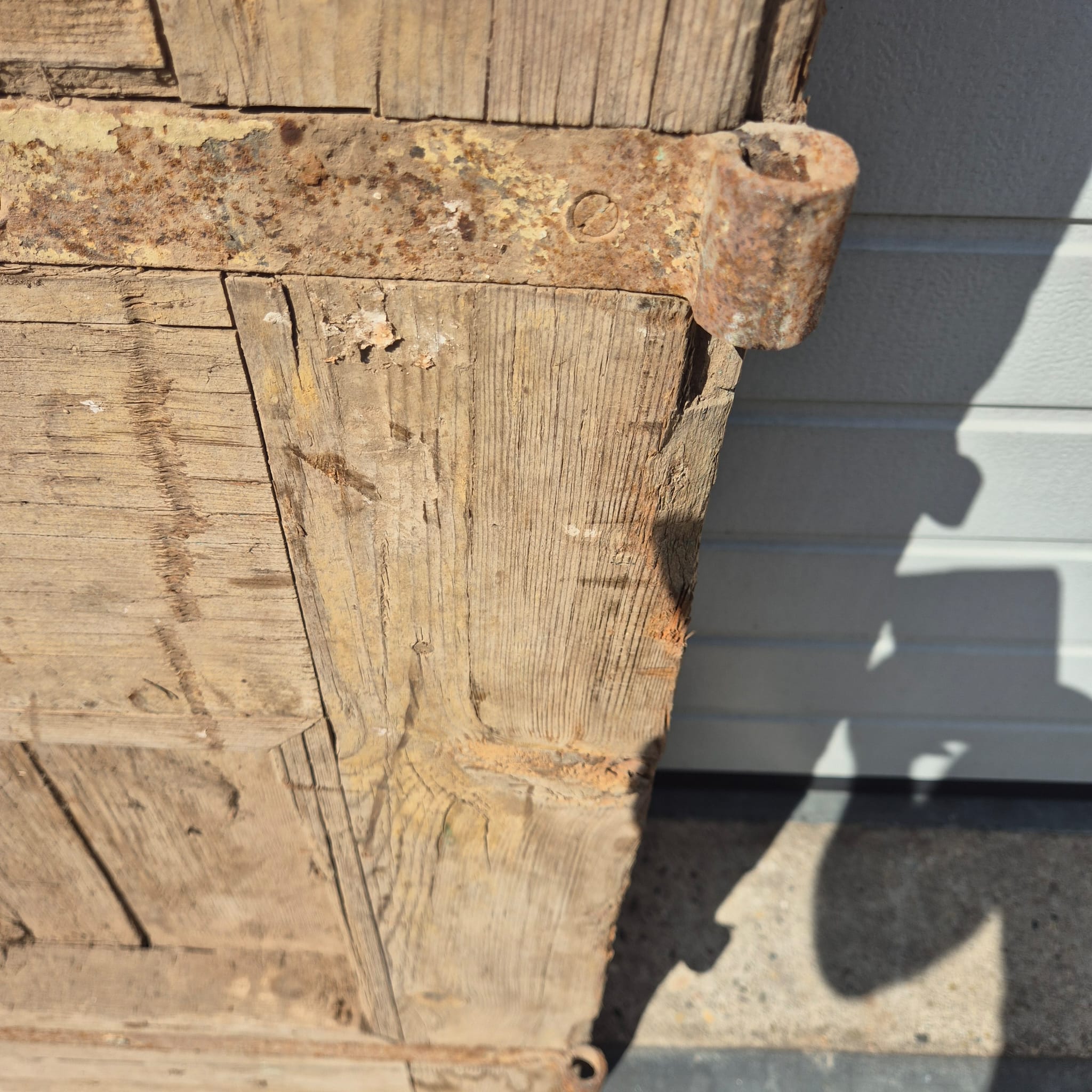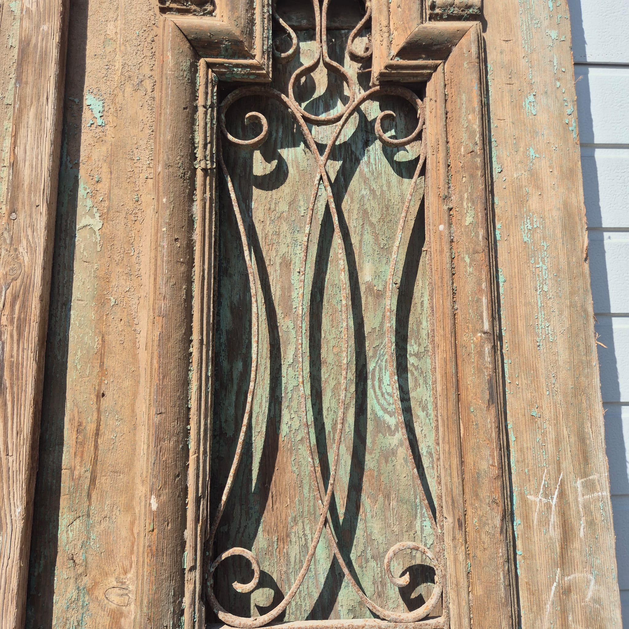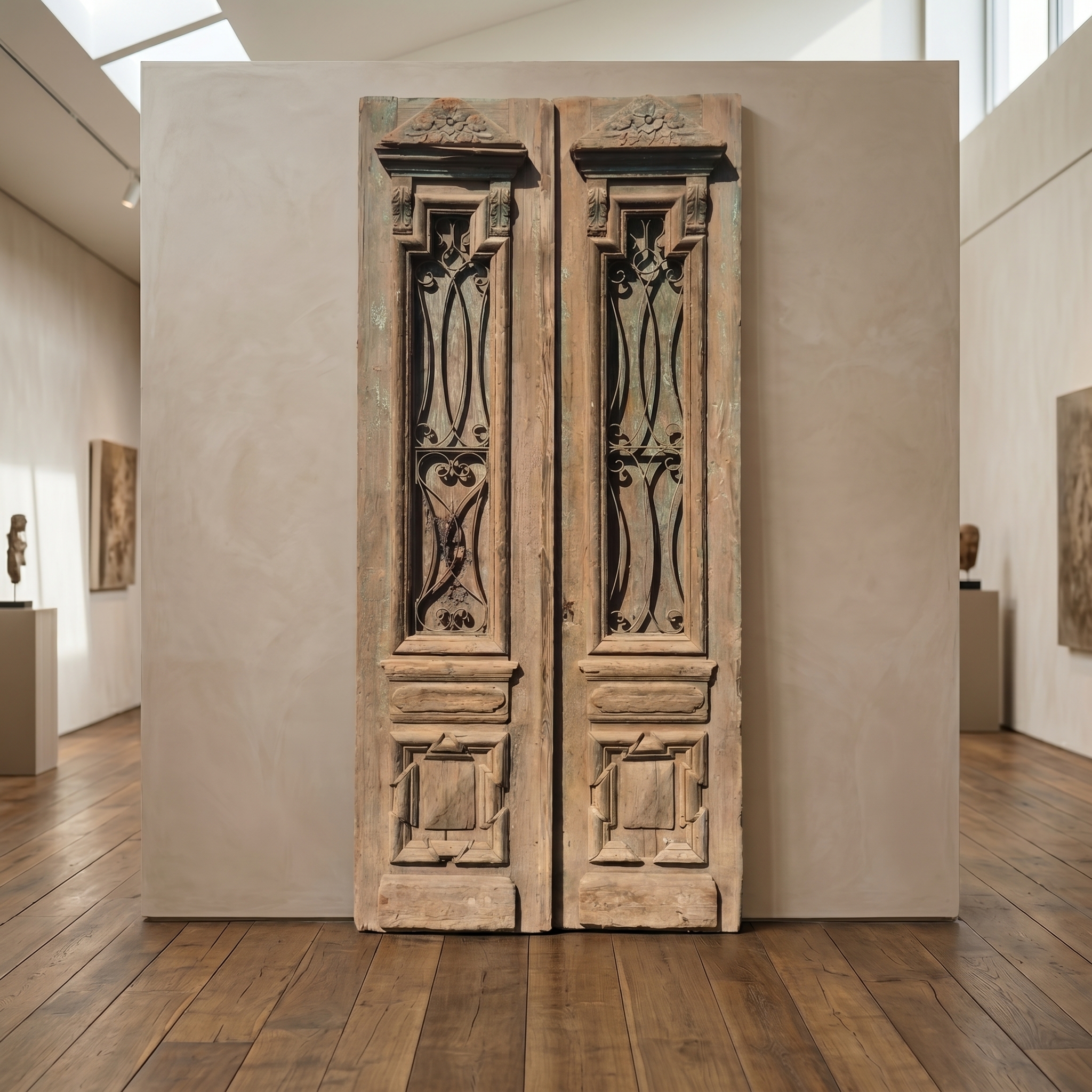 Historisch ontwerp: De deurvleugels zijn in ongerestaureerde originele staat met een fascinerende, meerlaagse beige afwerking die een unieke patina heeft ontwikkeld.