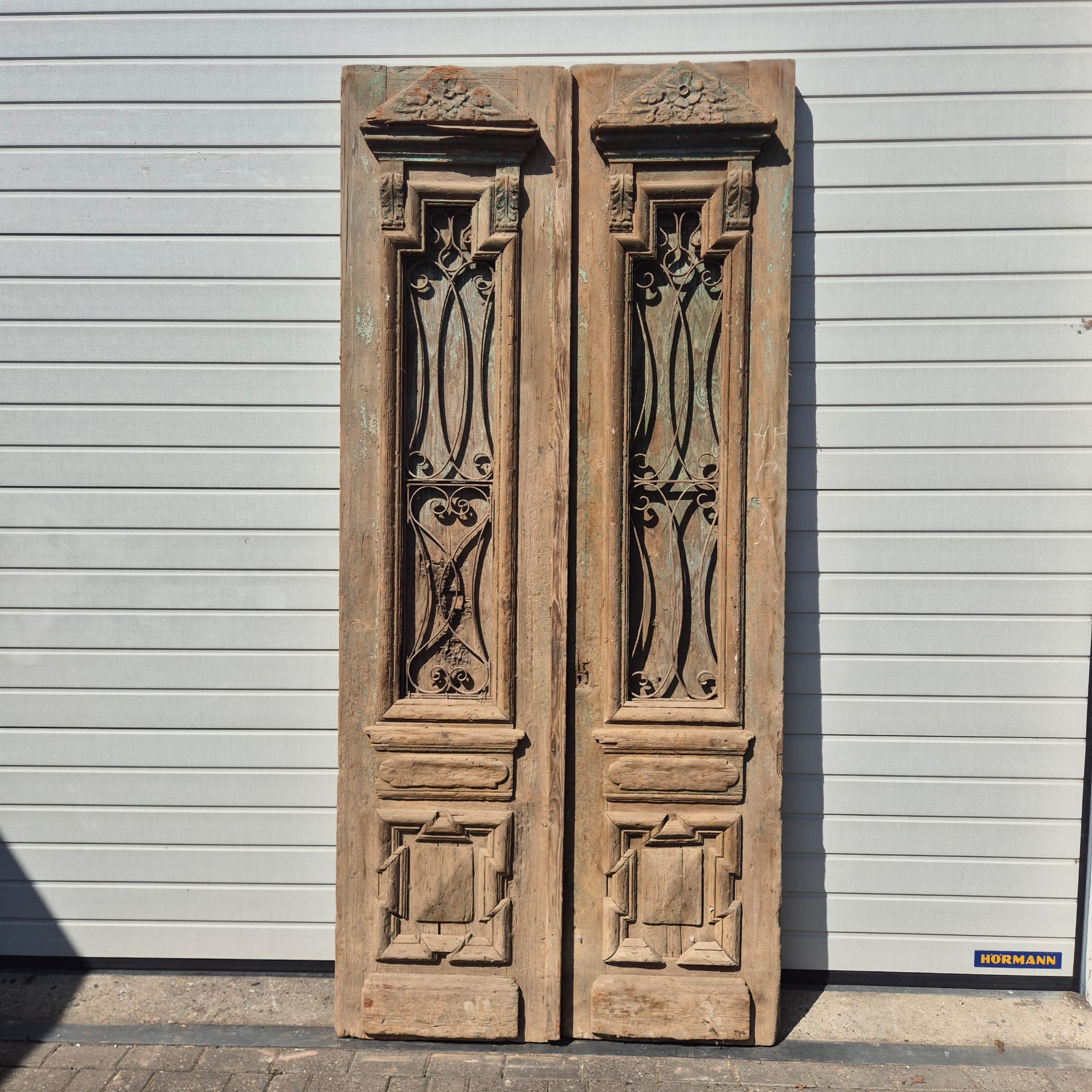 Geef uw bouwproject een uniek karakter! Te koop aangeboden: een indrukwekkende, massieve dubbele voordeur uit circa 1880. Dit architectonische juweel imponeert met zijn imposante verschijning en meesterlijke vakmanschap.