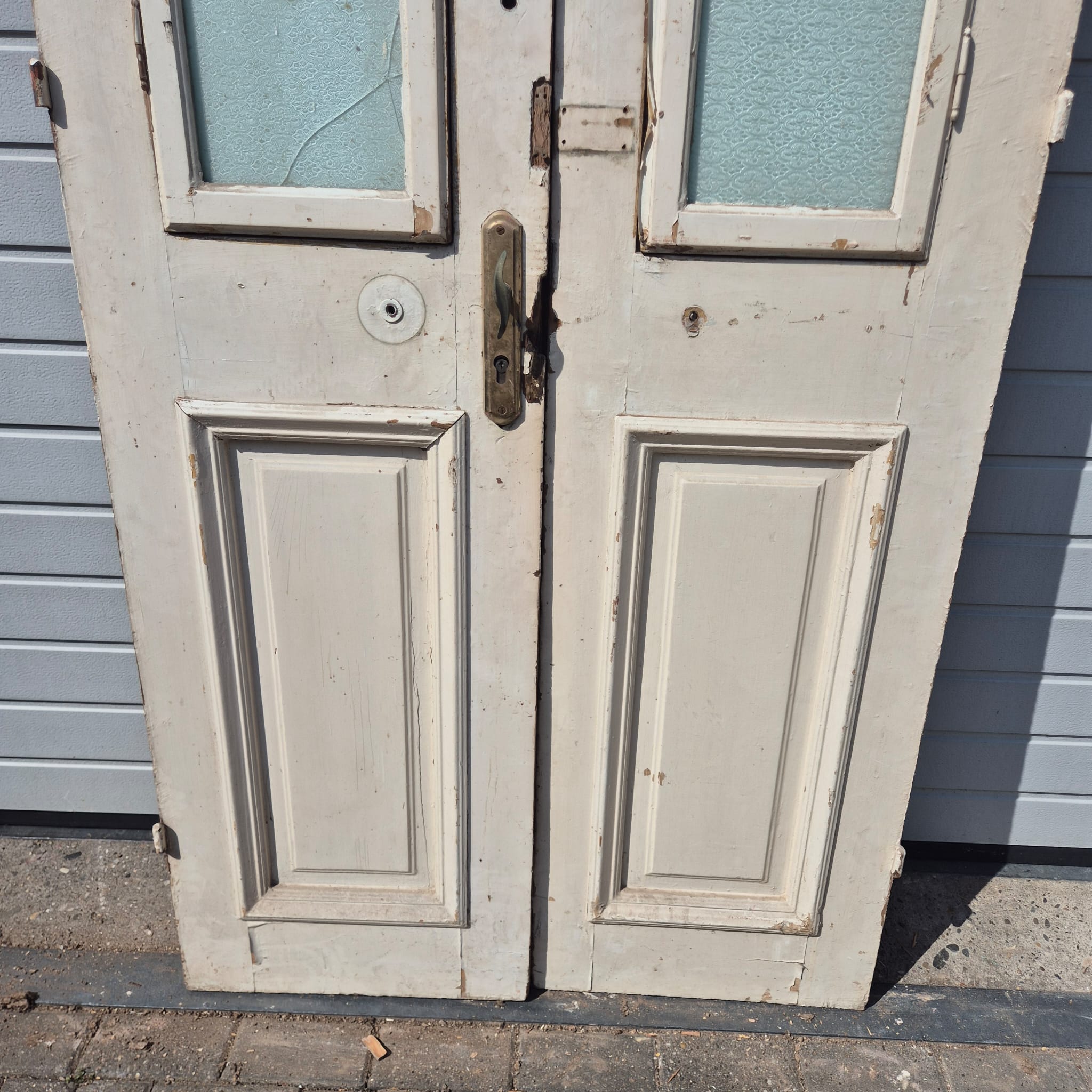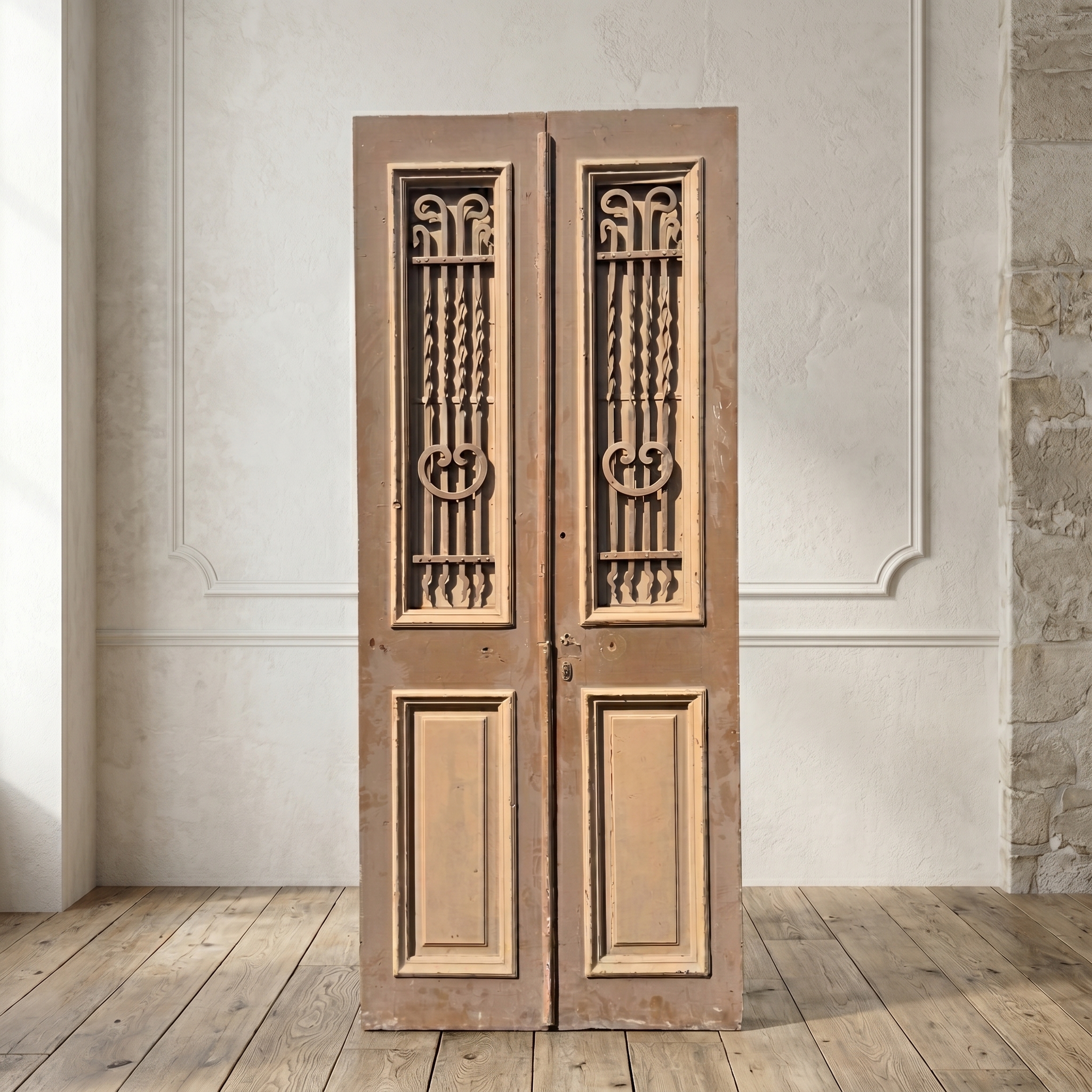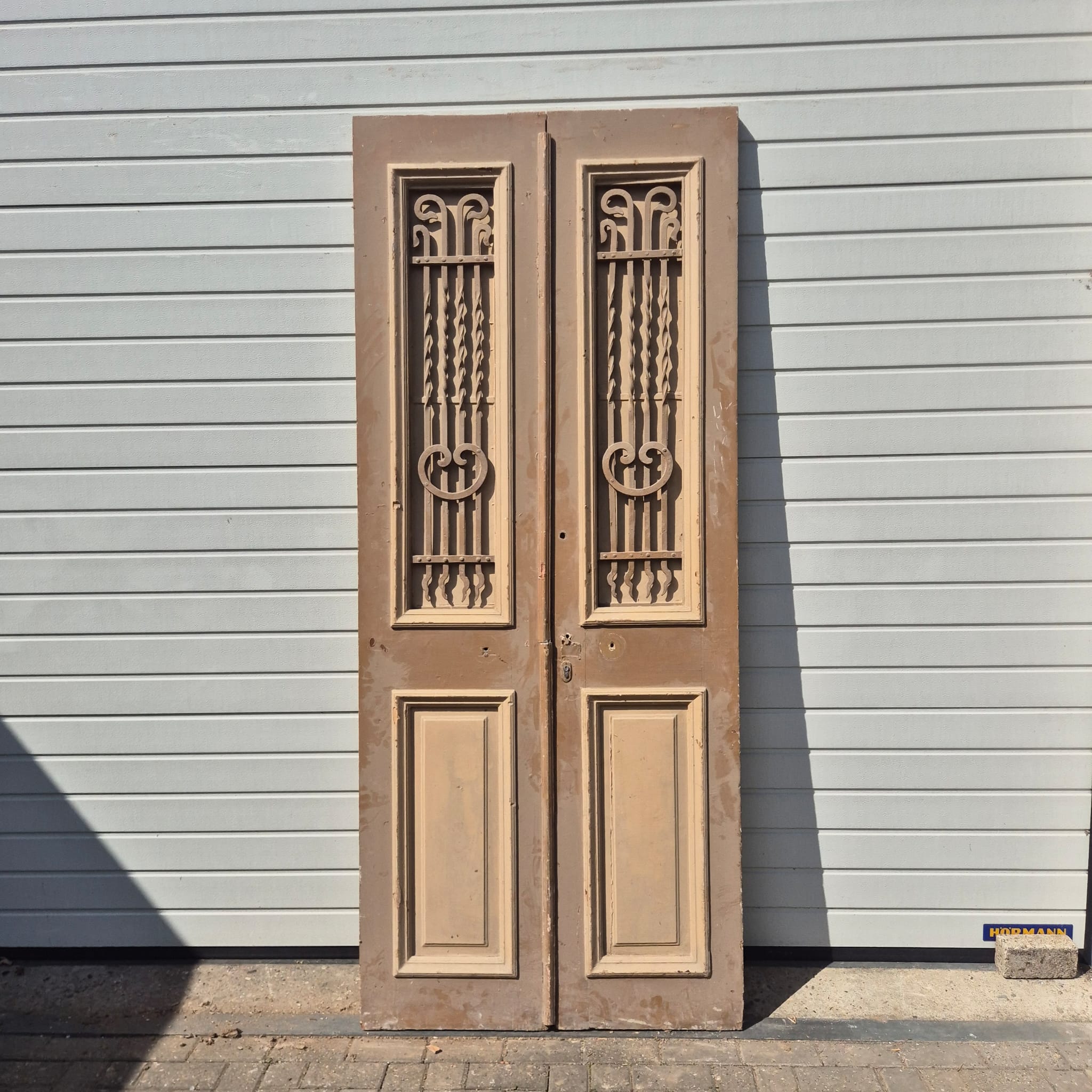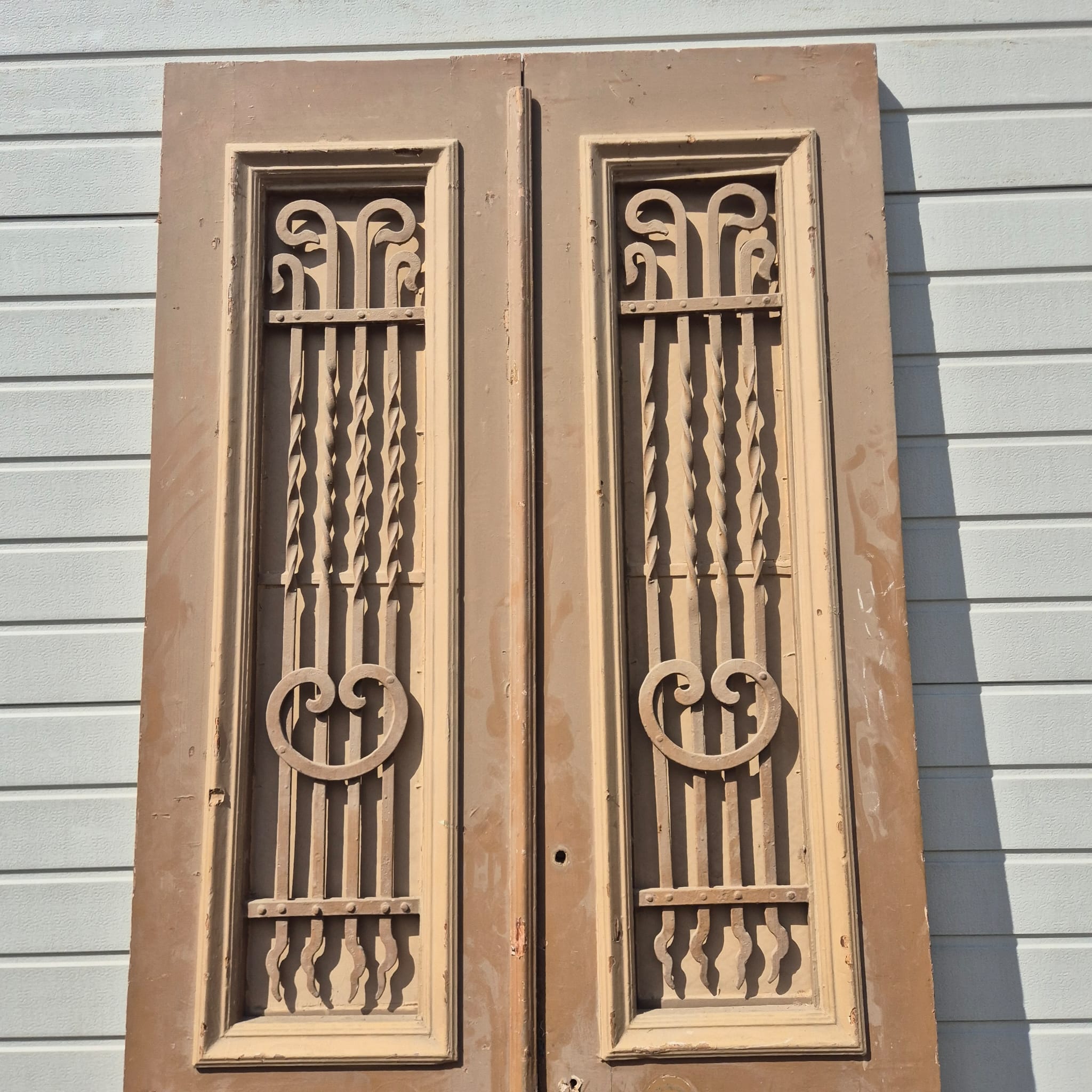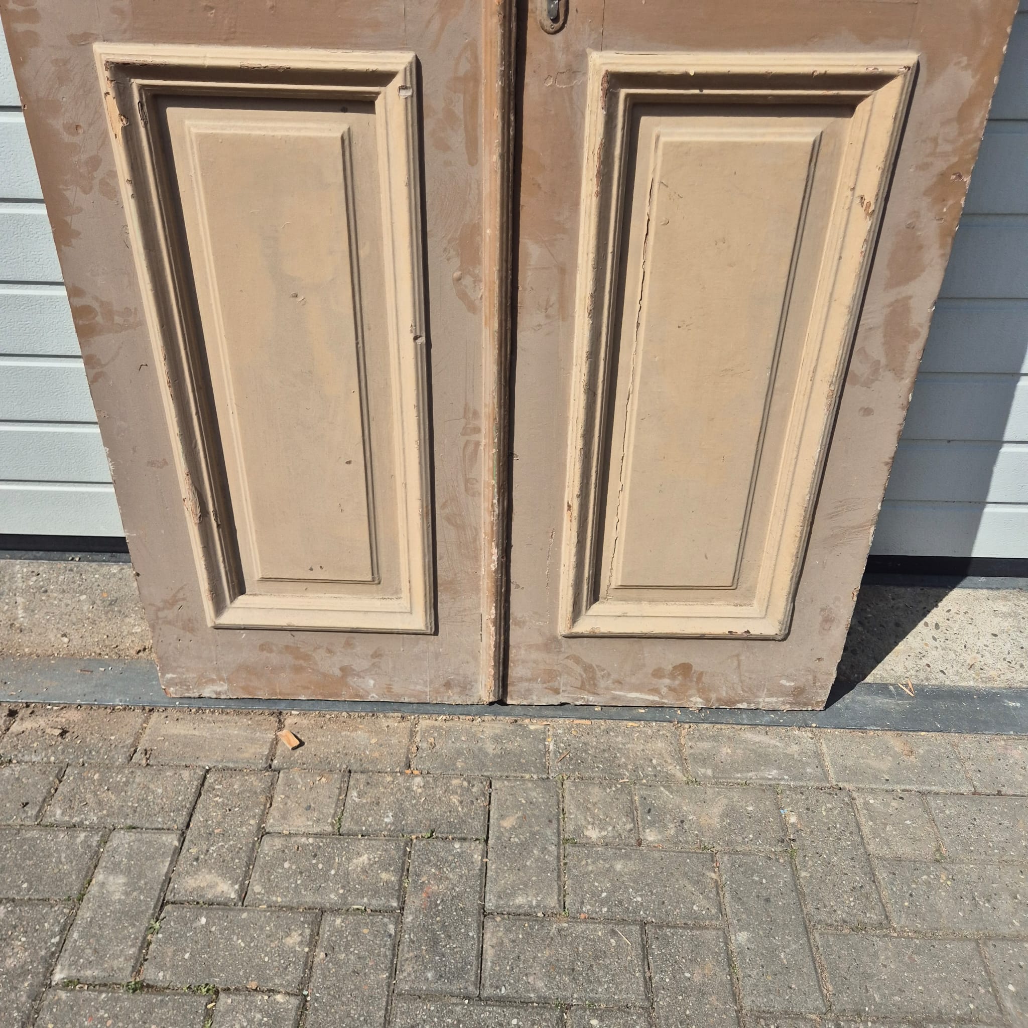 Historisch ontwerp: De deurvleugels zijn in ongerestaureerde originele staat met een fascinerende, meerlaagse beige afwerking die een unieke patina heeft ontwikkeld.