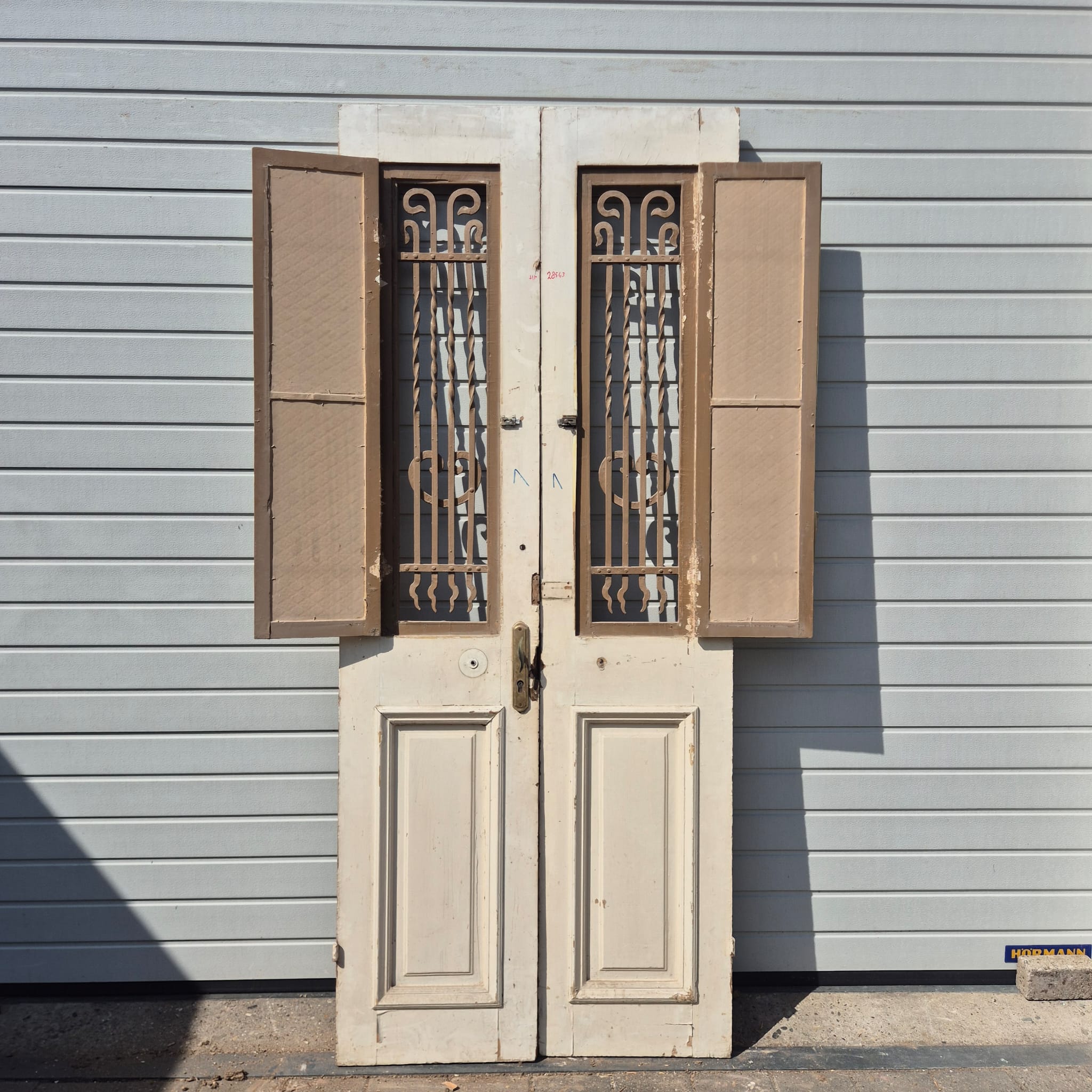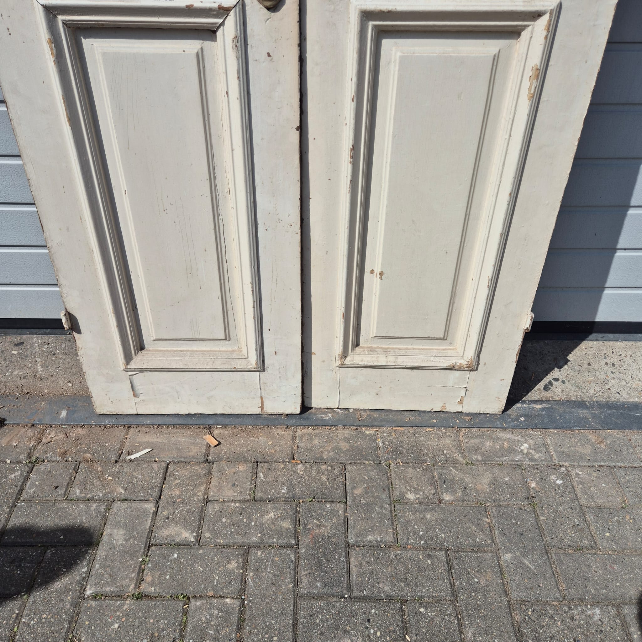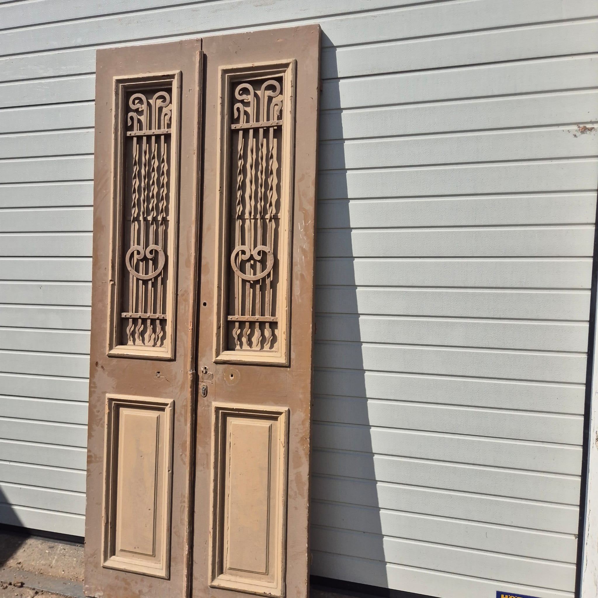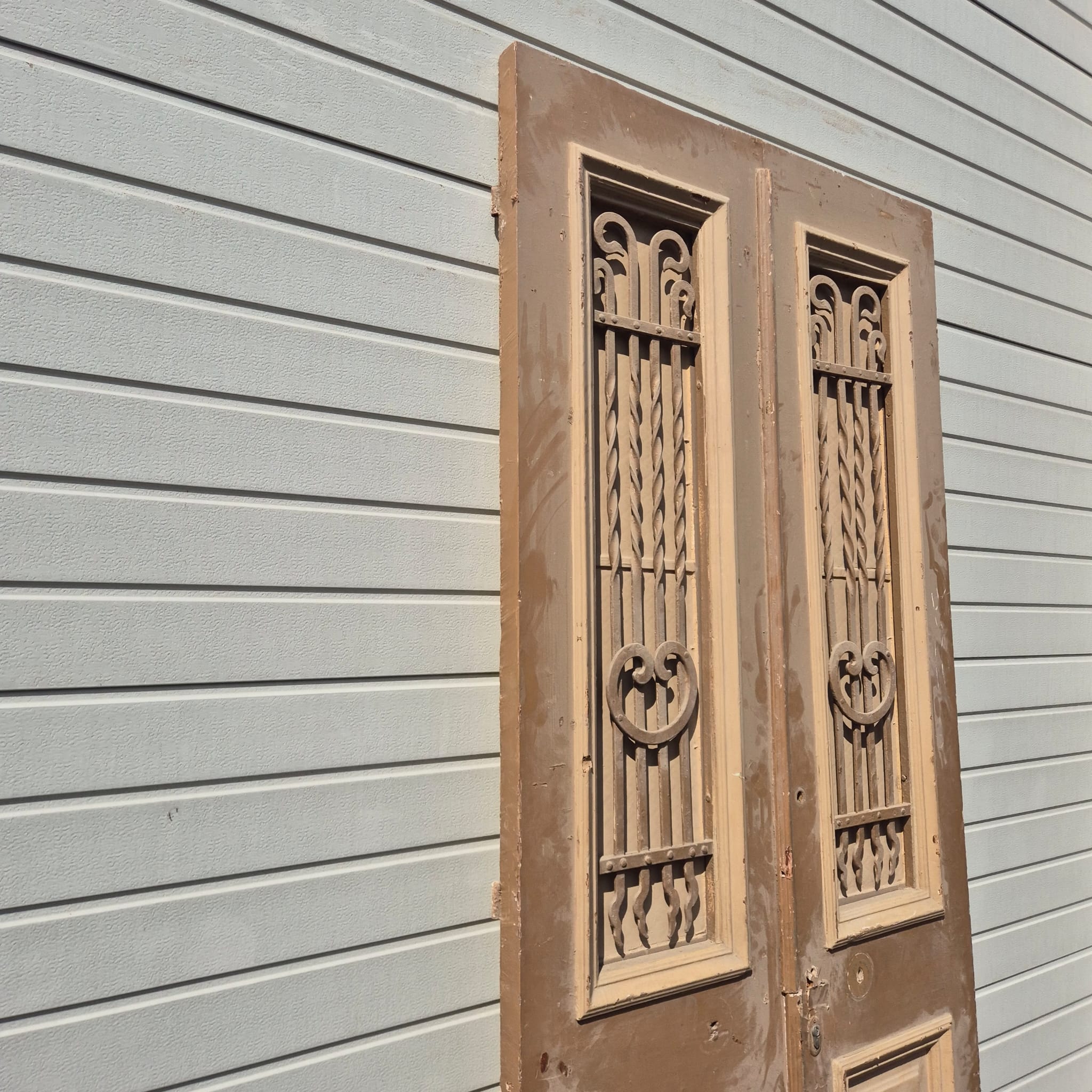 Historisch ontwerp: De deurvleugels zijn in ongerestaureerde originele staat met een fascinerende, meerlaagse beige afwerking die een unieke patina heeft ontwikkeld.