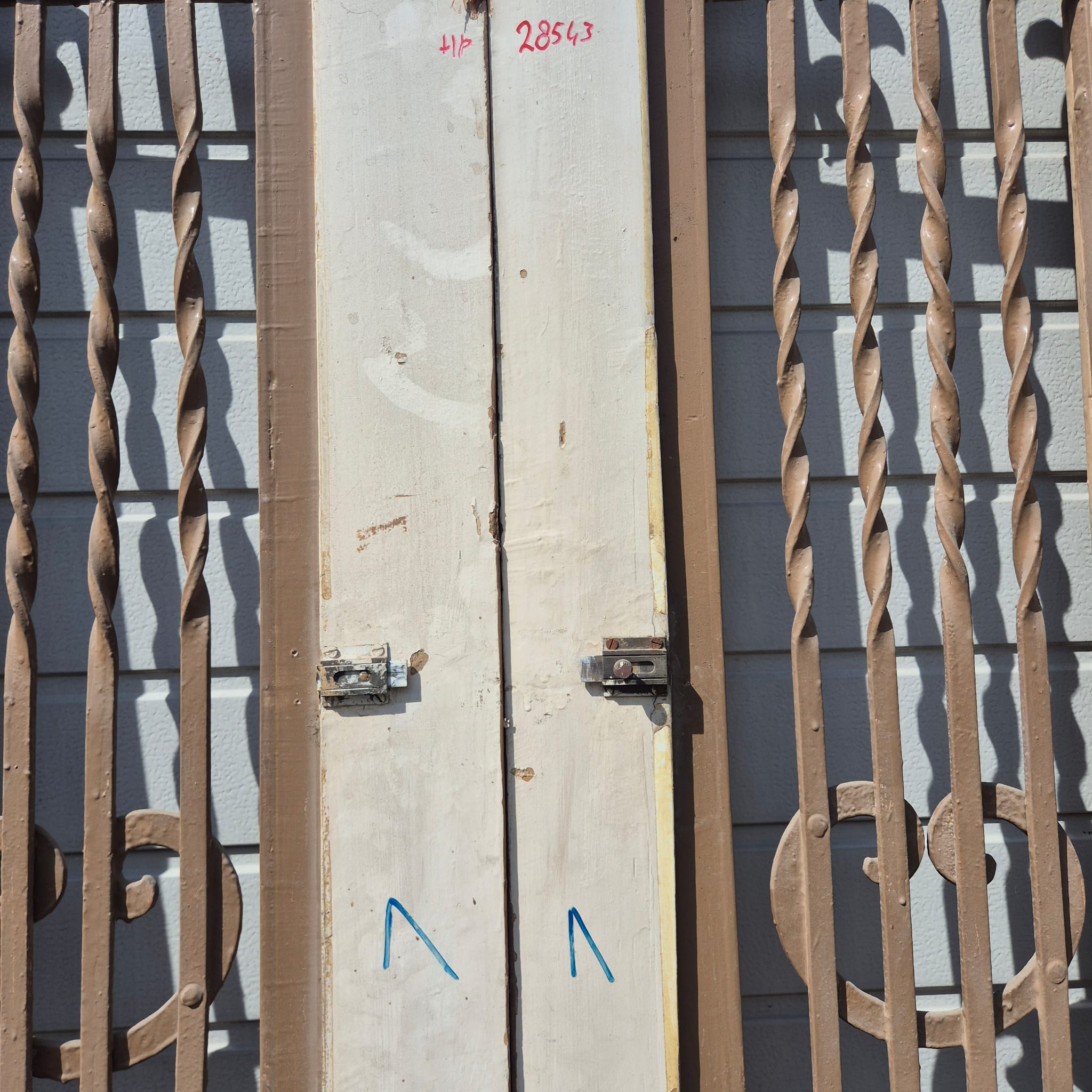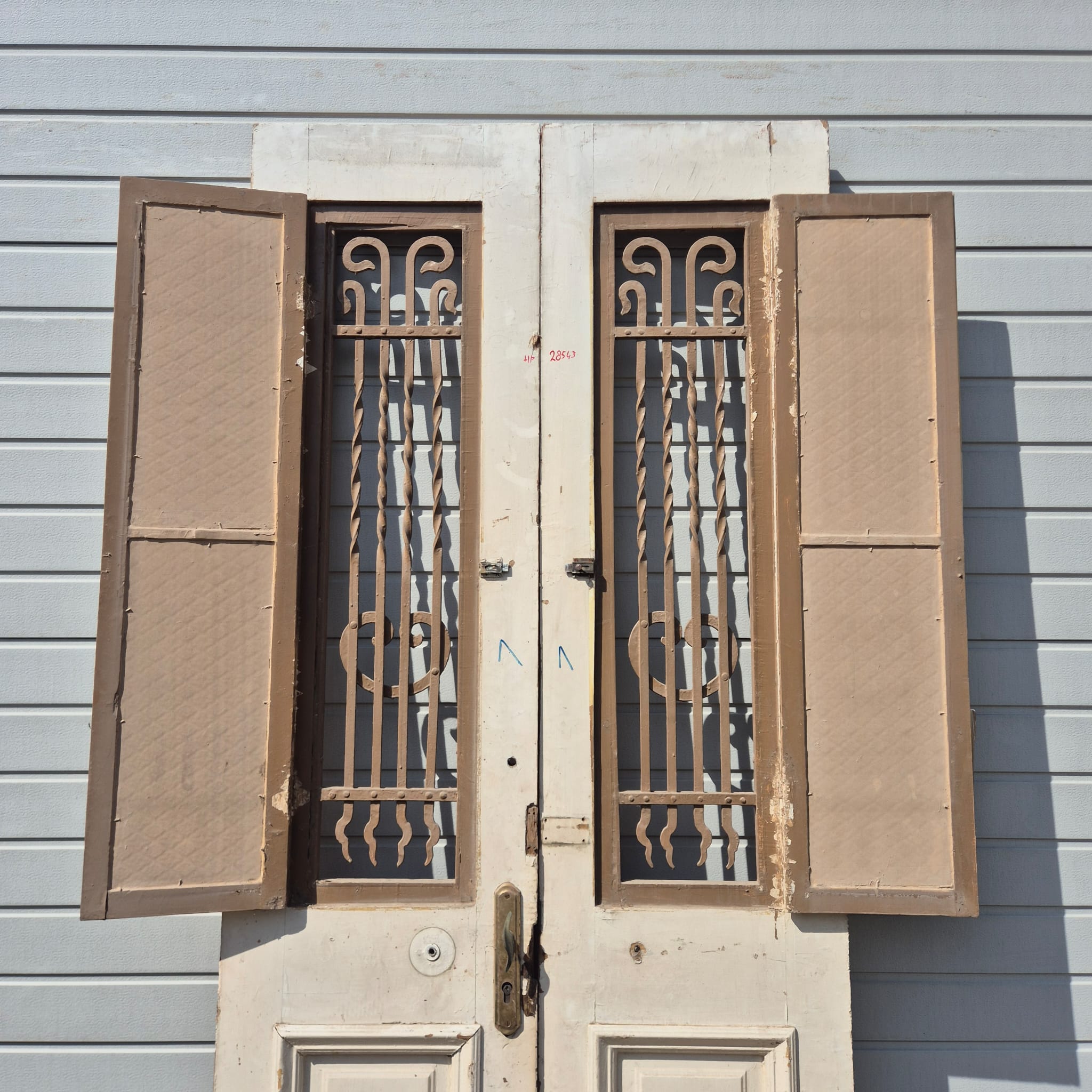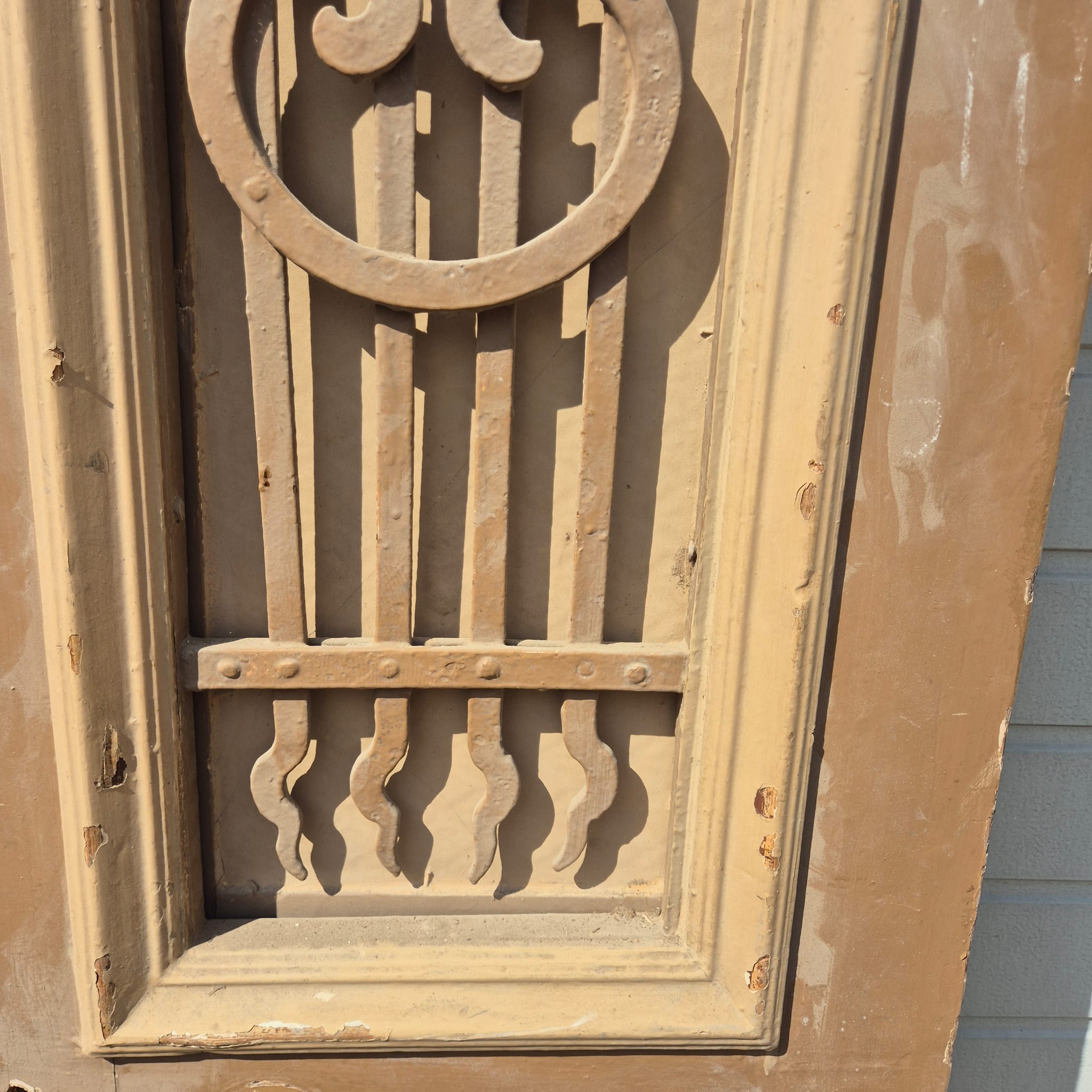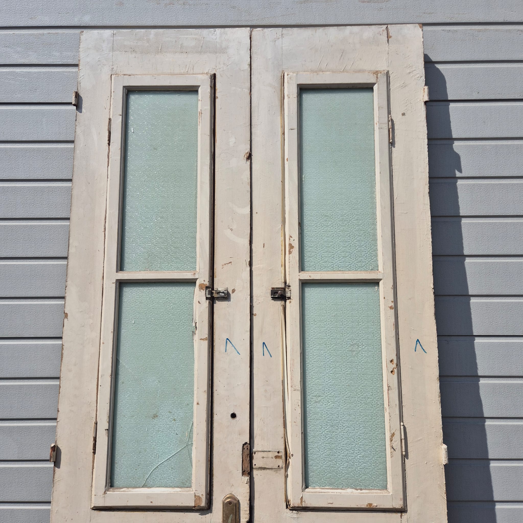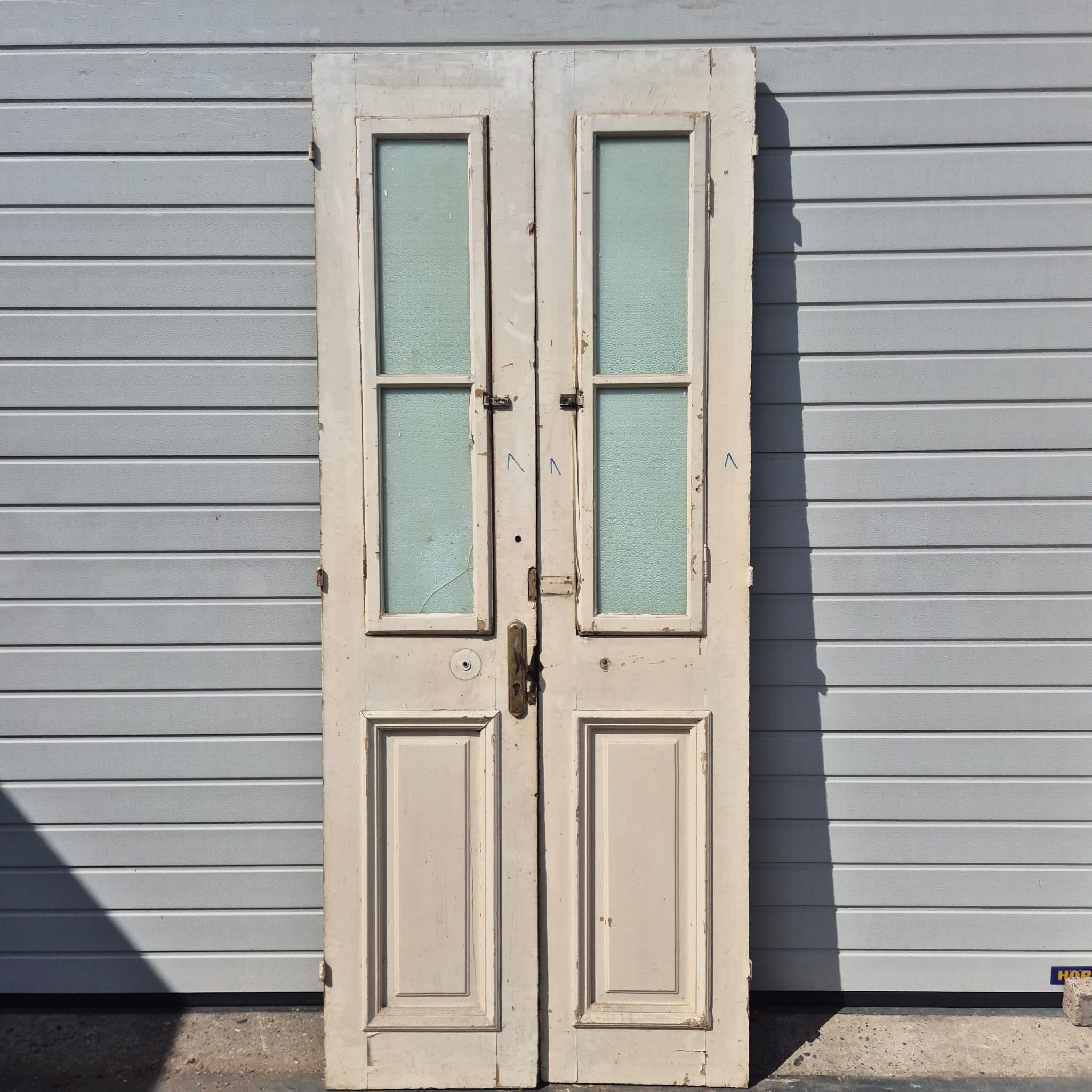Historisch ontwerp: De deurvleugels zijn in ongerestaureerde originele staat met een fascinerende, meerlaagse beige afwerking die een unieke patina heeft ontwikkeld.