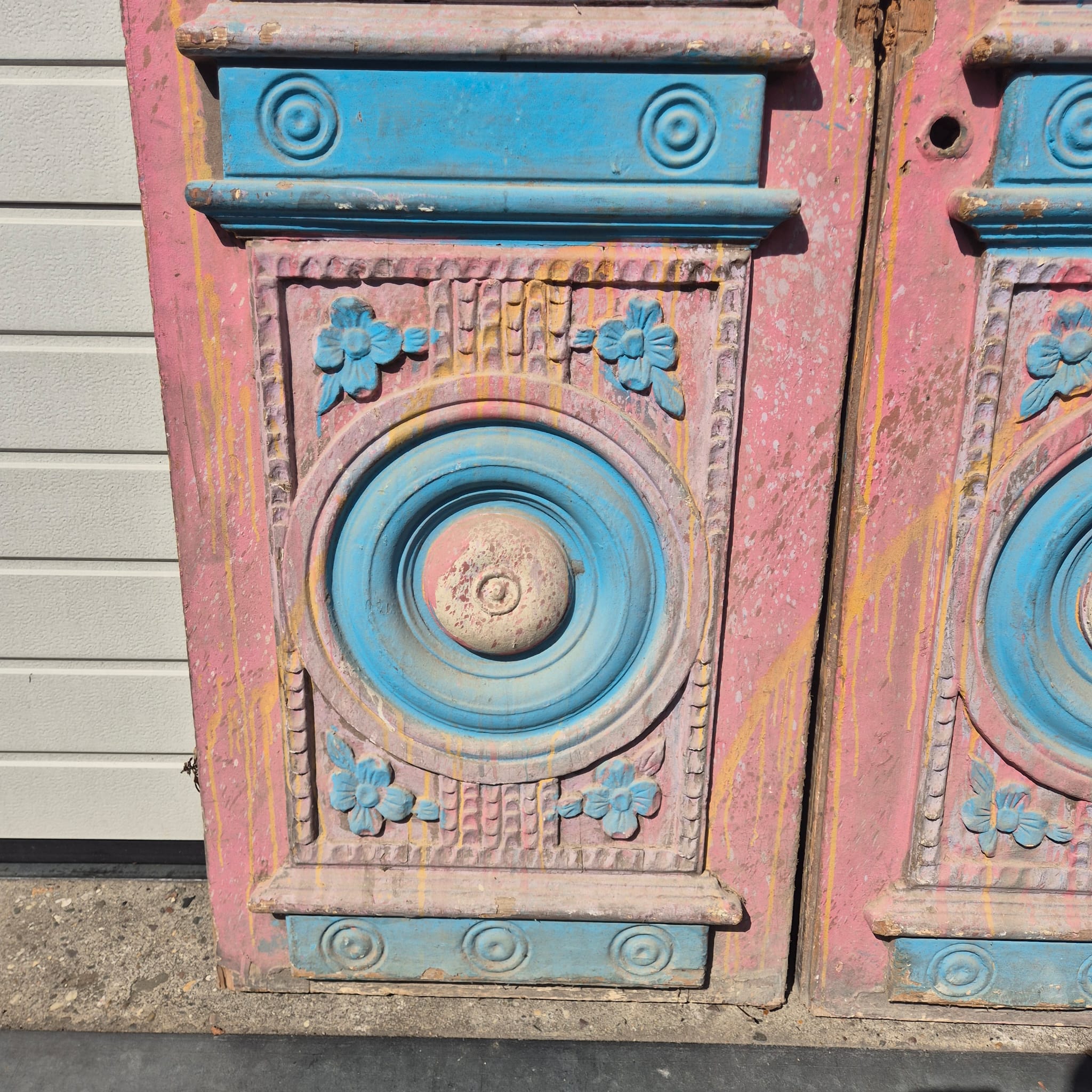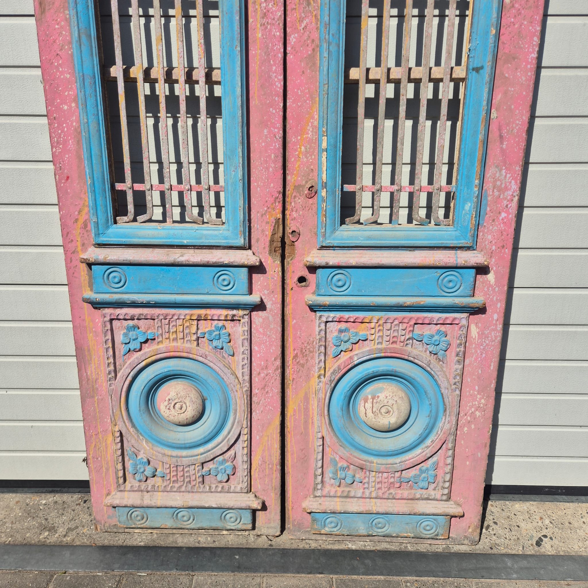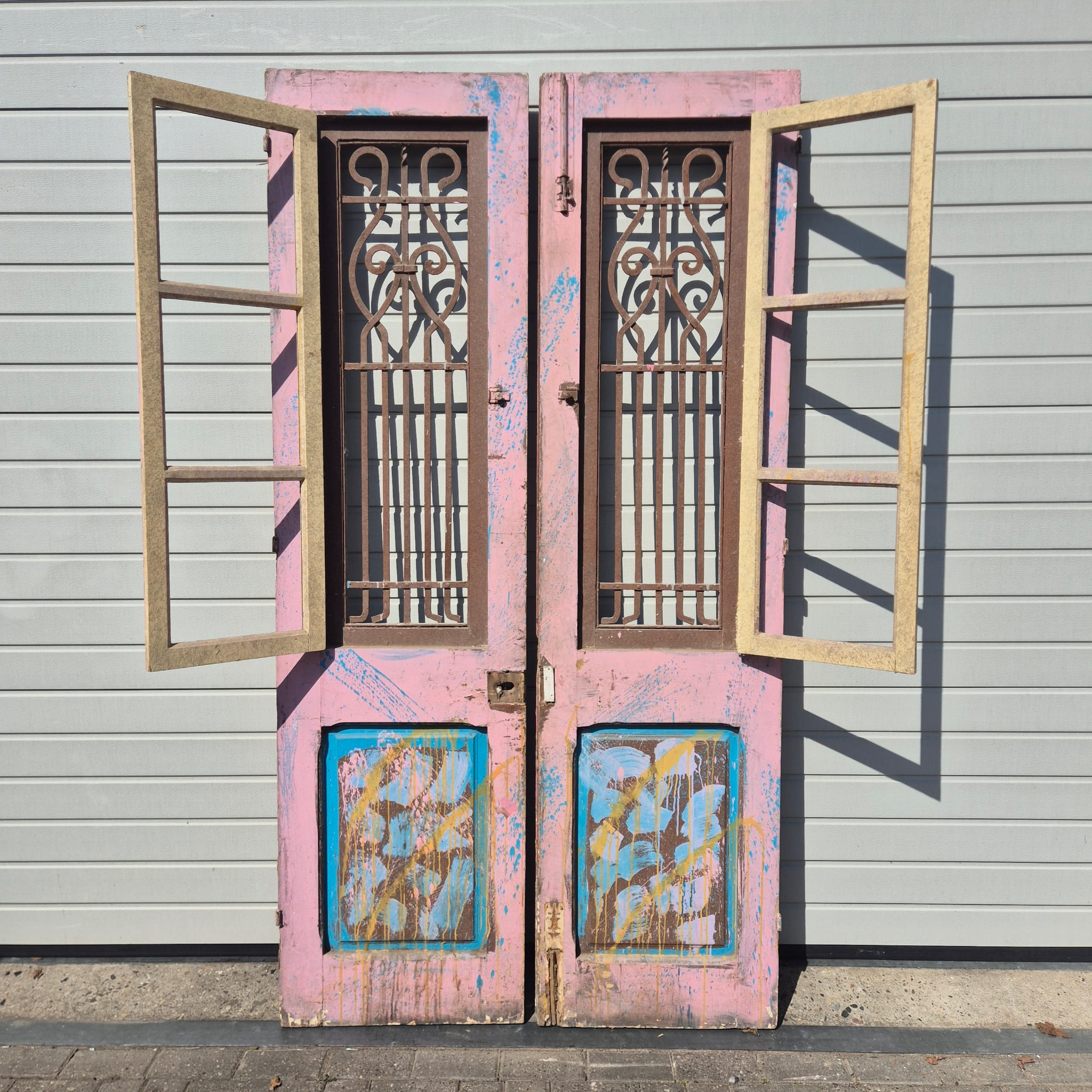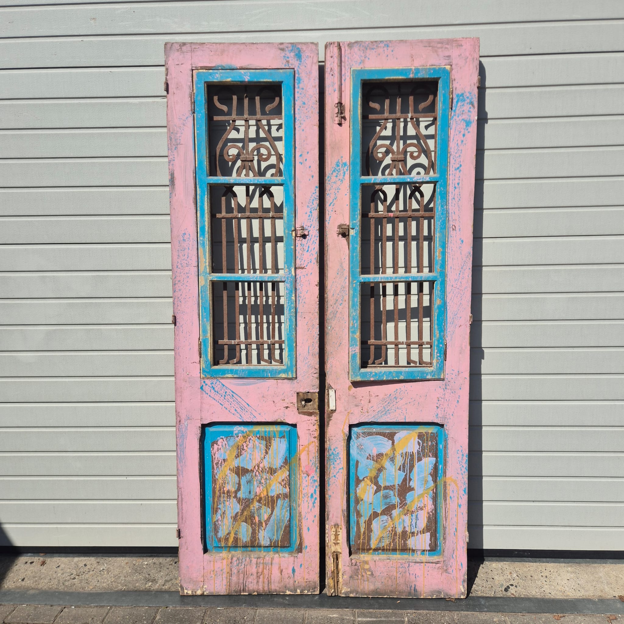 Historisch ontwerp: De deurvleugels zijn in ongerestaureerde originele staat met een fascinerende, meerlaagse verflaag in antiek roze en blauw, wat een unieke patina creëert.
