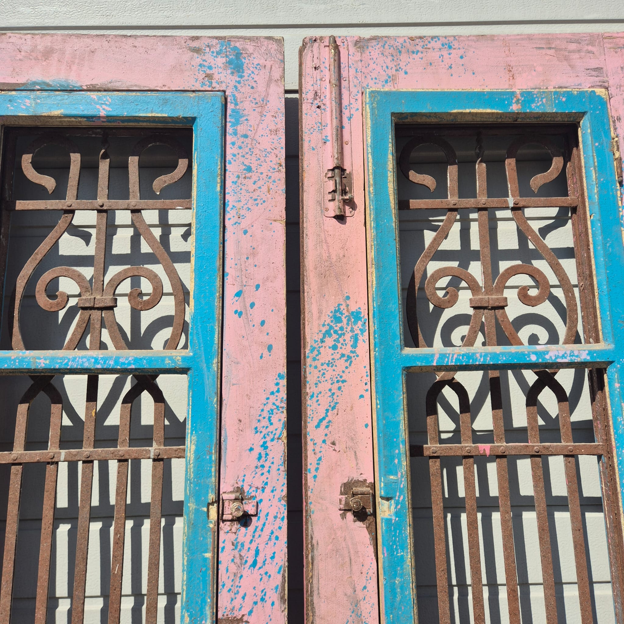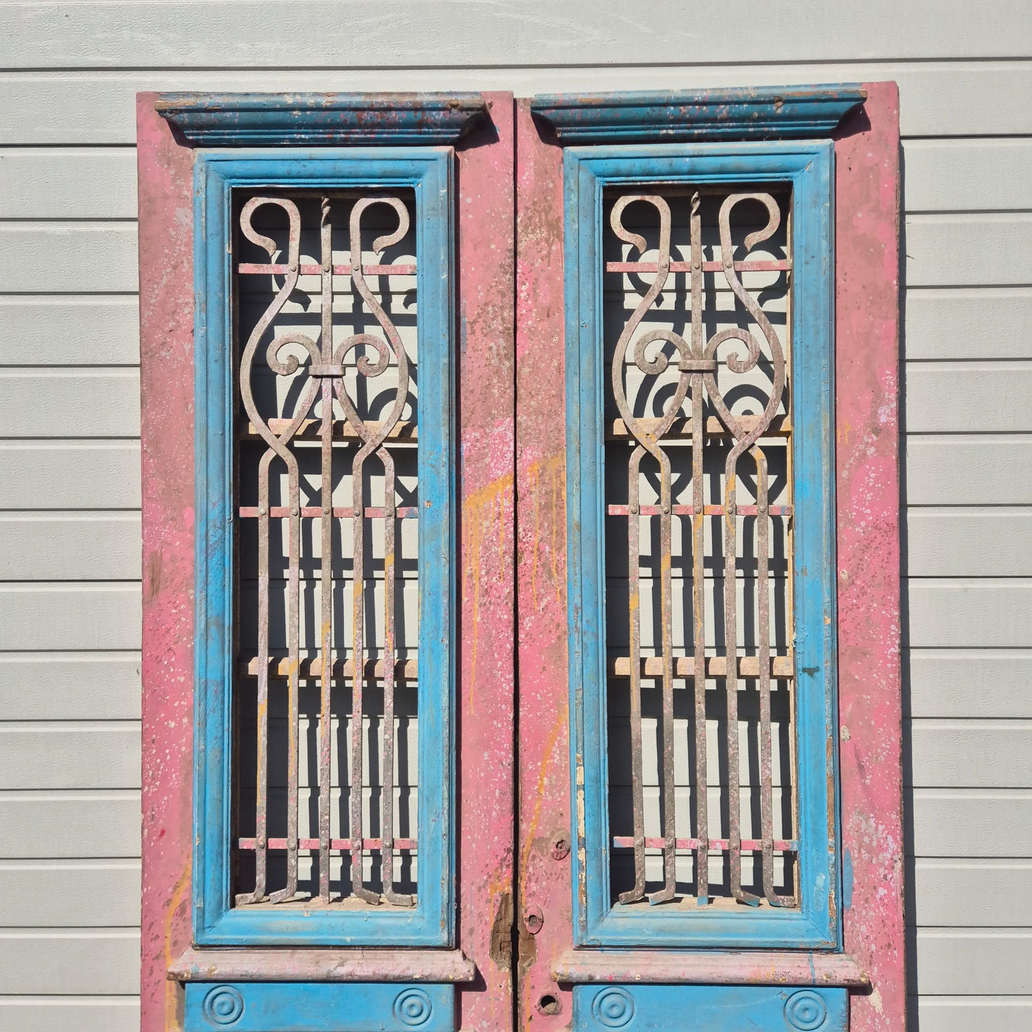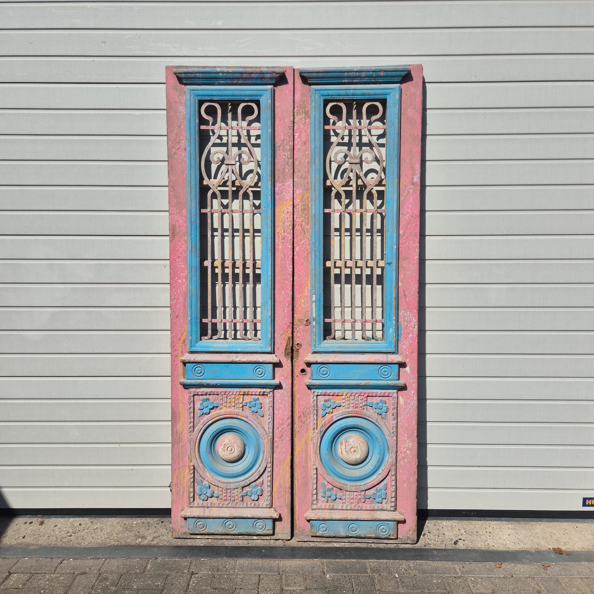 Historisch ontwerp: De deurvleugels zijn in ongerestaureerde originele staat met een fascinerende, meerlaagse verflaag in antiek roze en blauw, wat een unieke patina creëert.