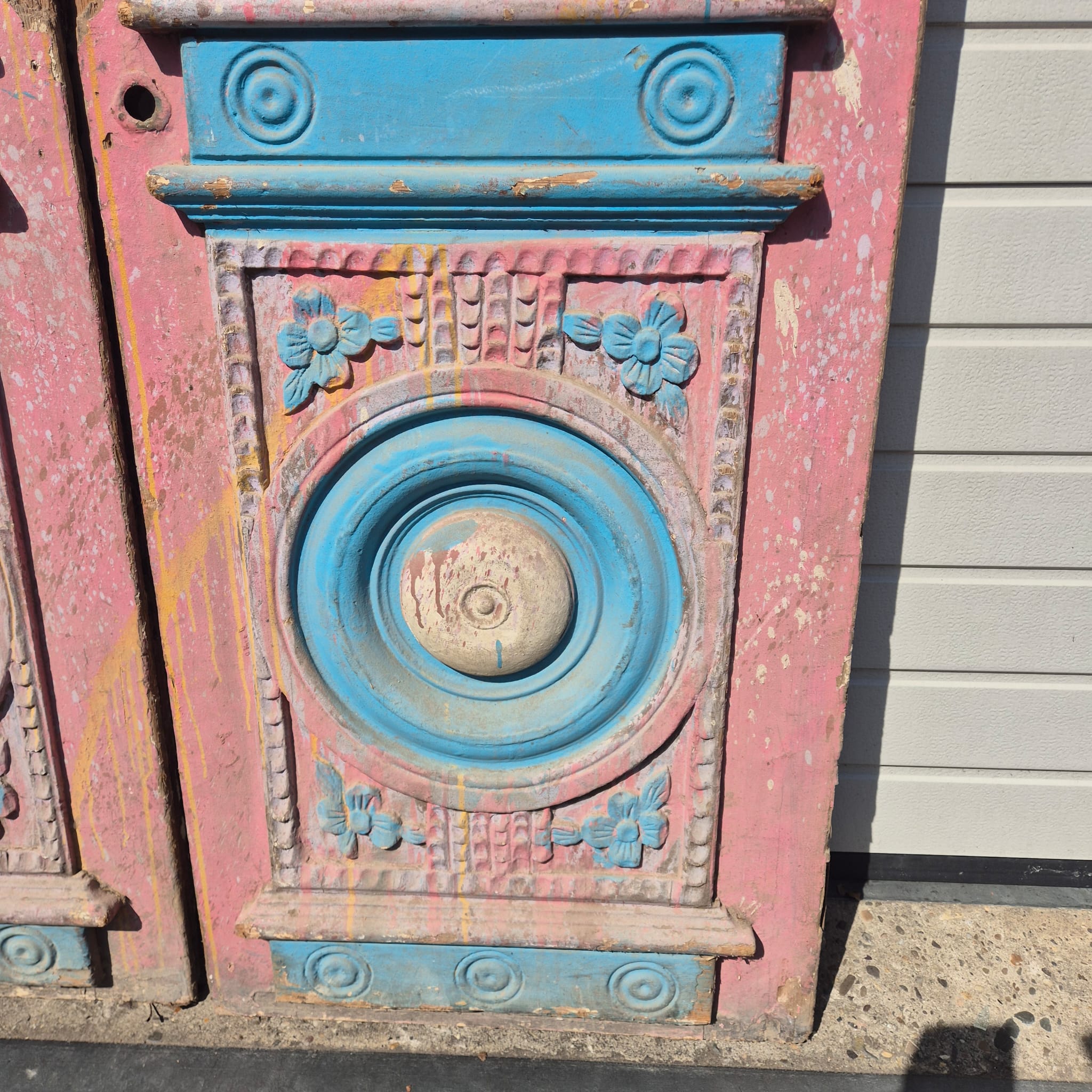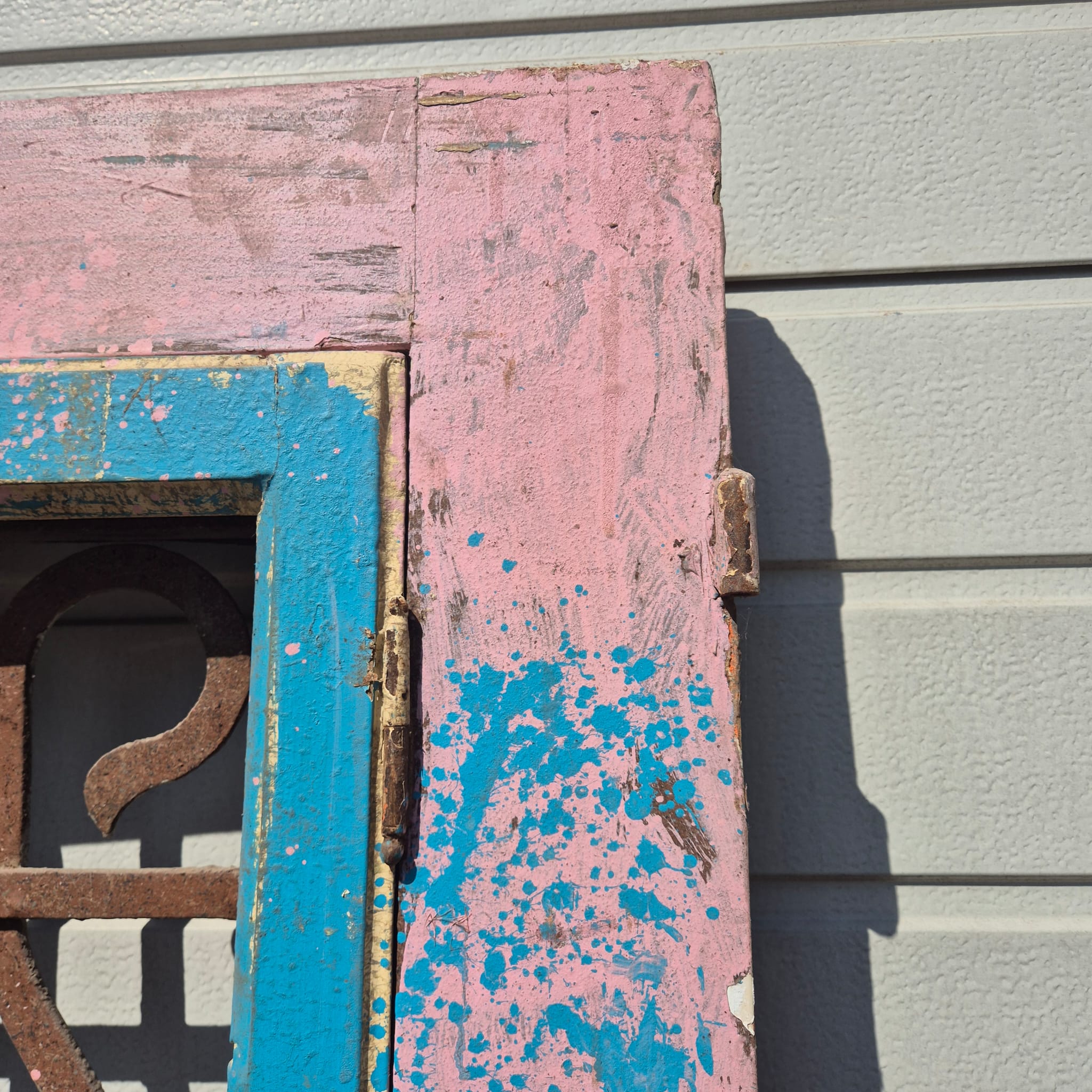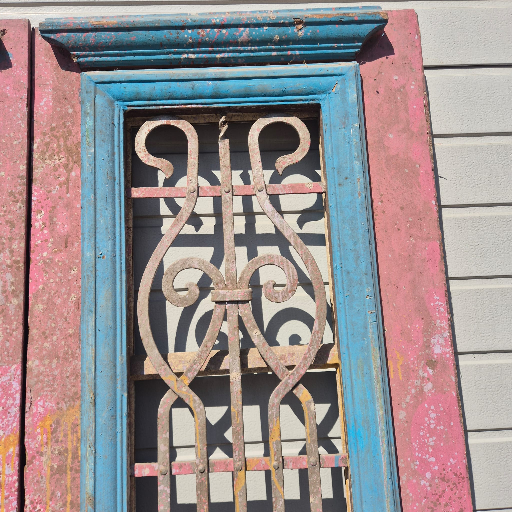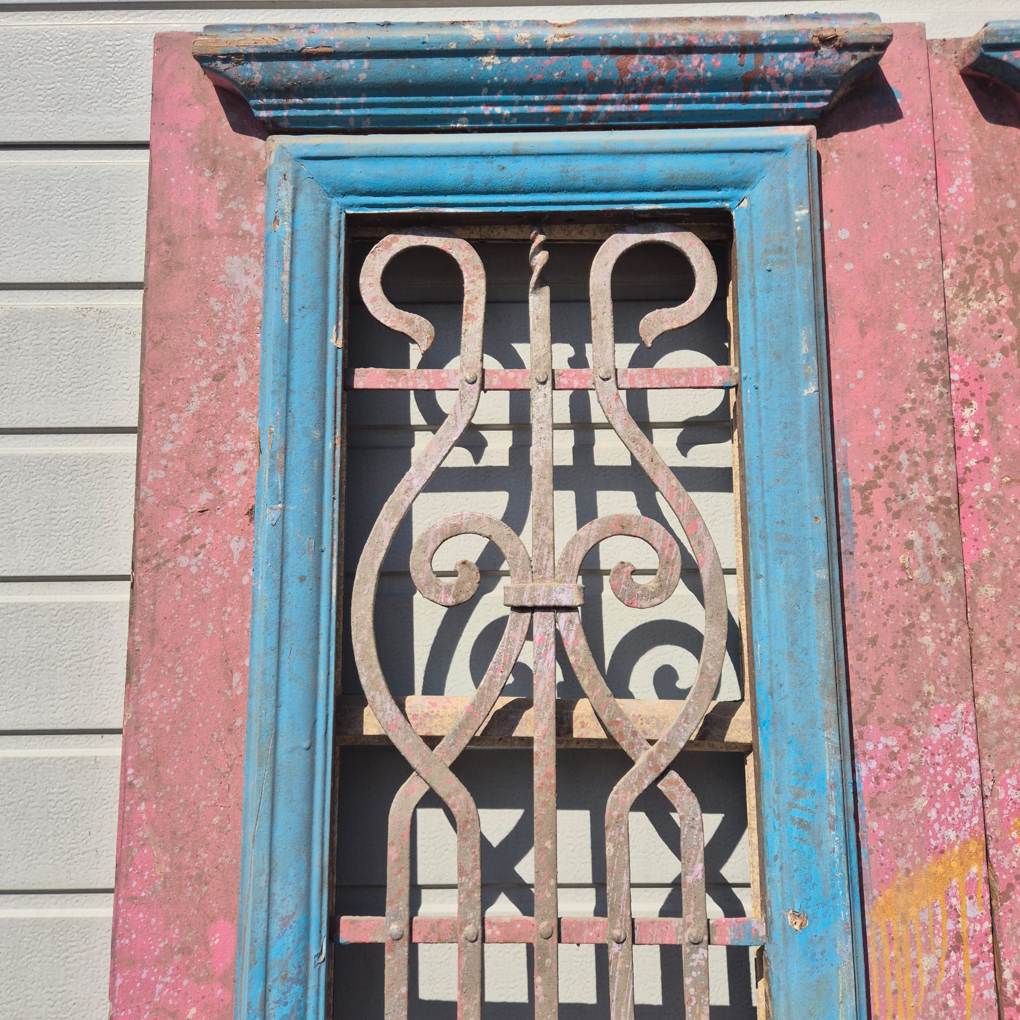 Historisch ontwerp: De deurvleugels zijn in ongerestaureerde originele staat met een fascinerende, meerlaagse verflaag in antiek roze en blauw, wat een unieke patina creëert.