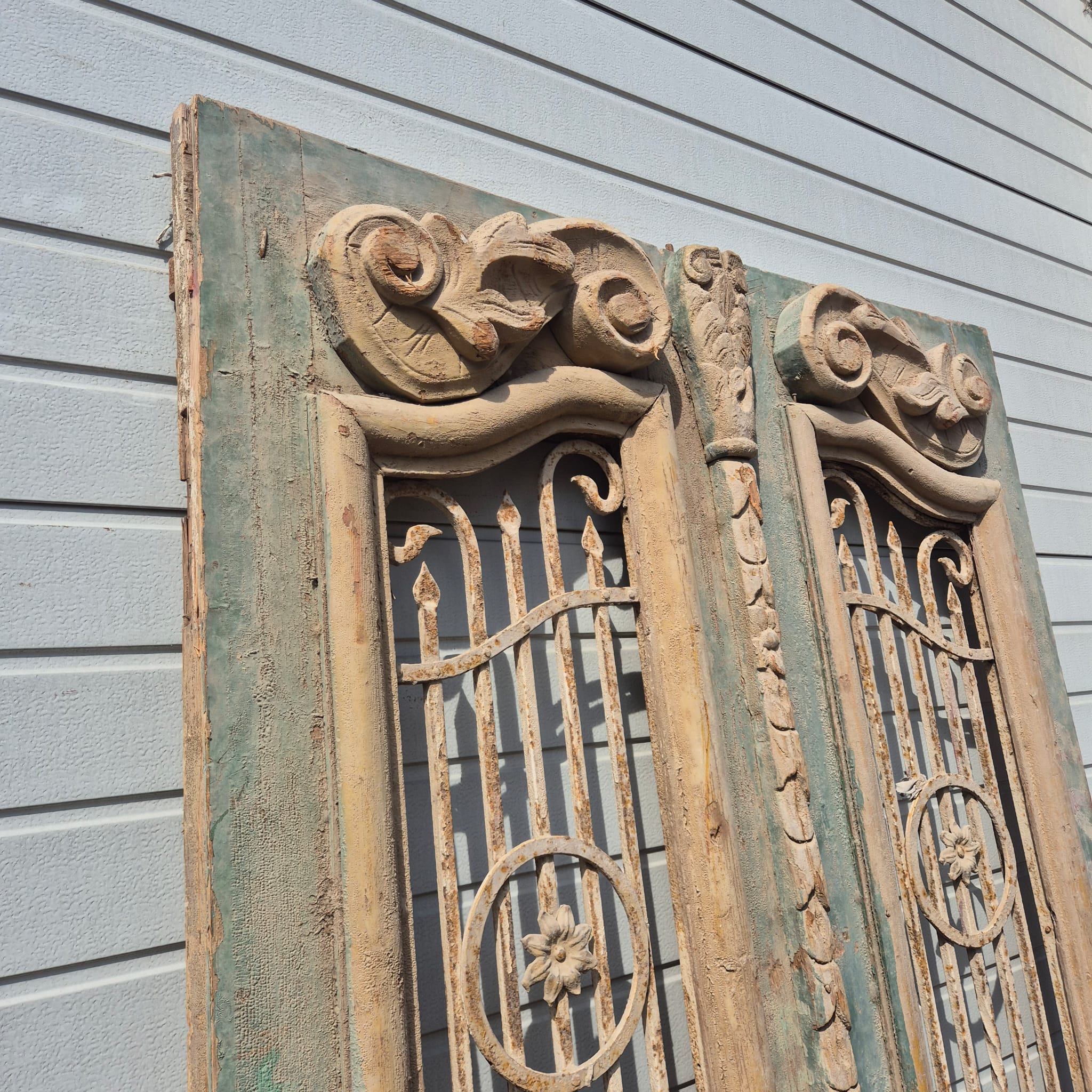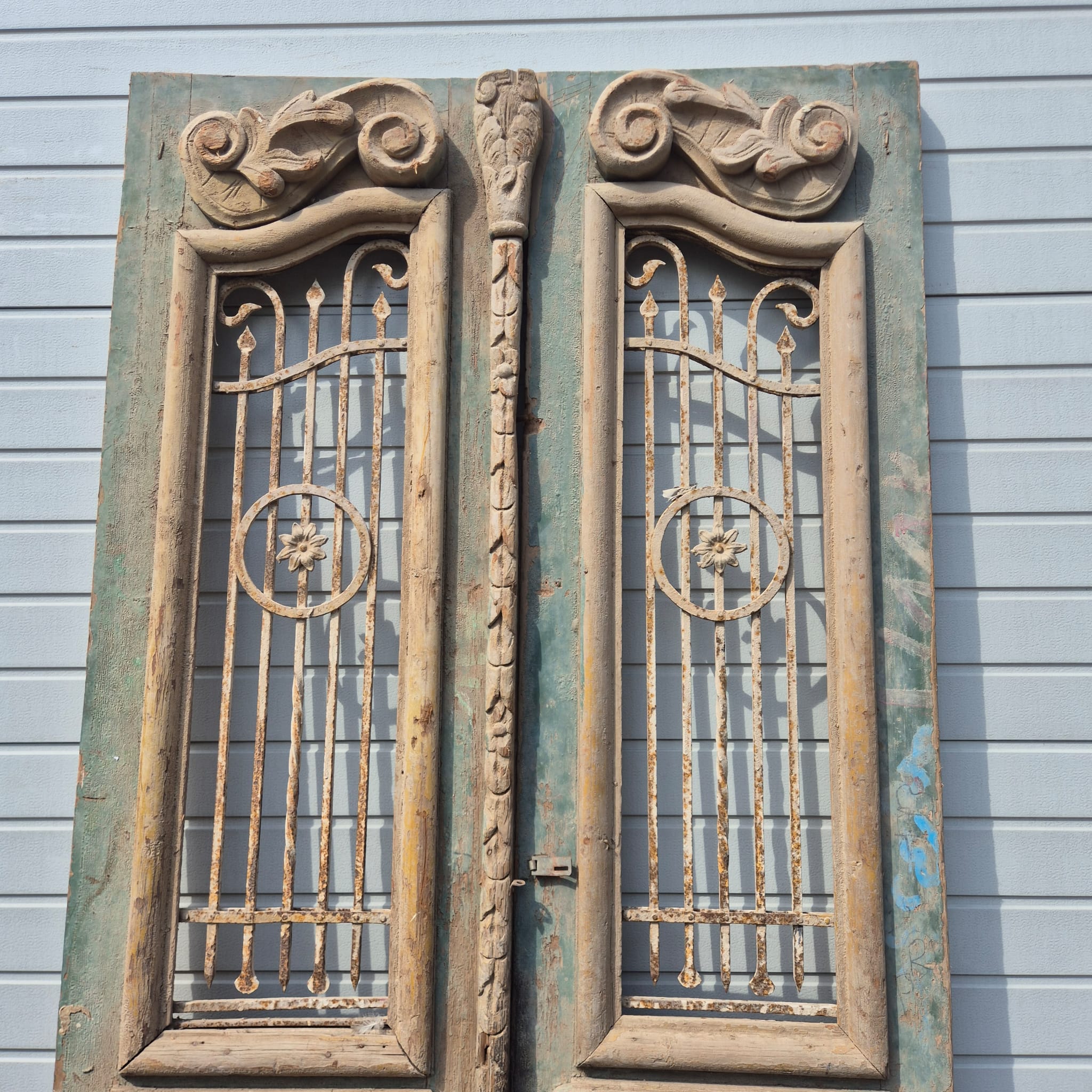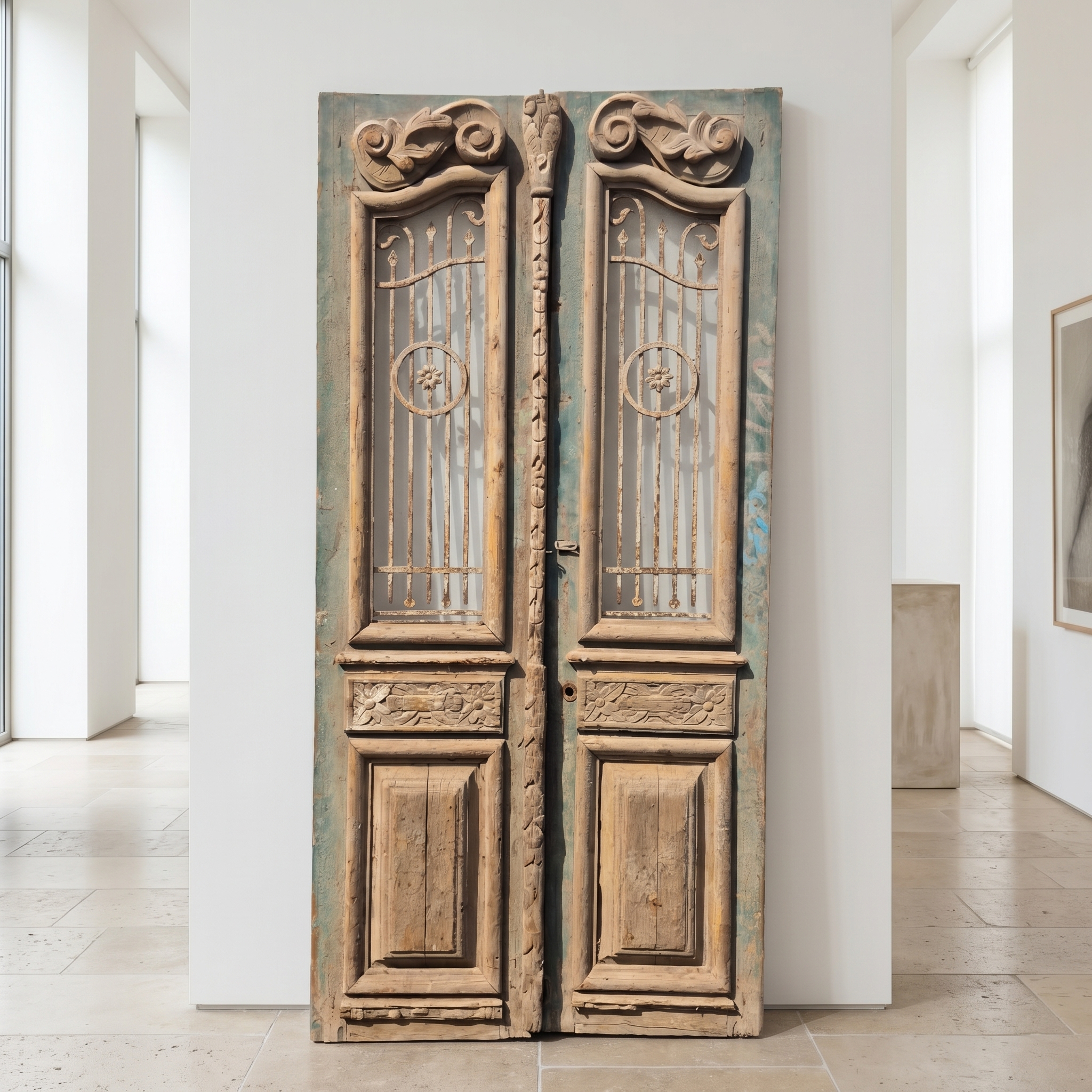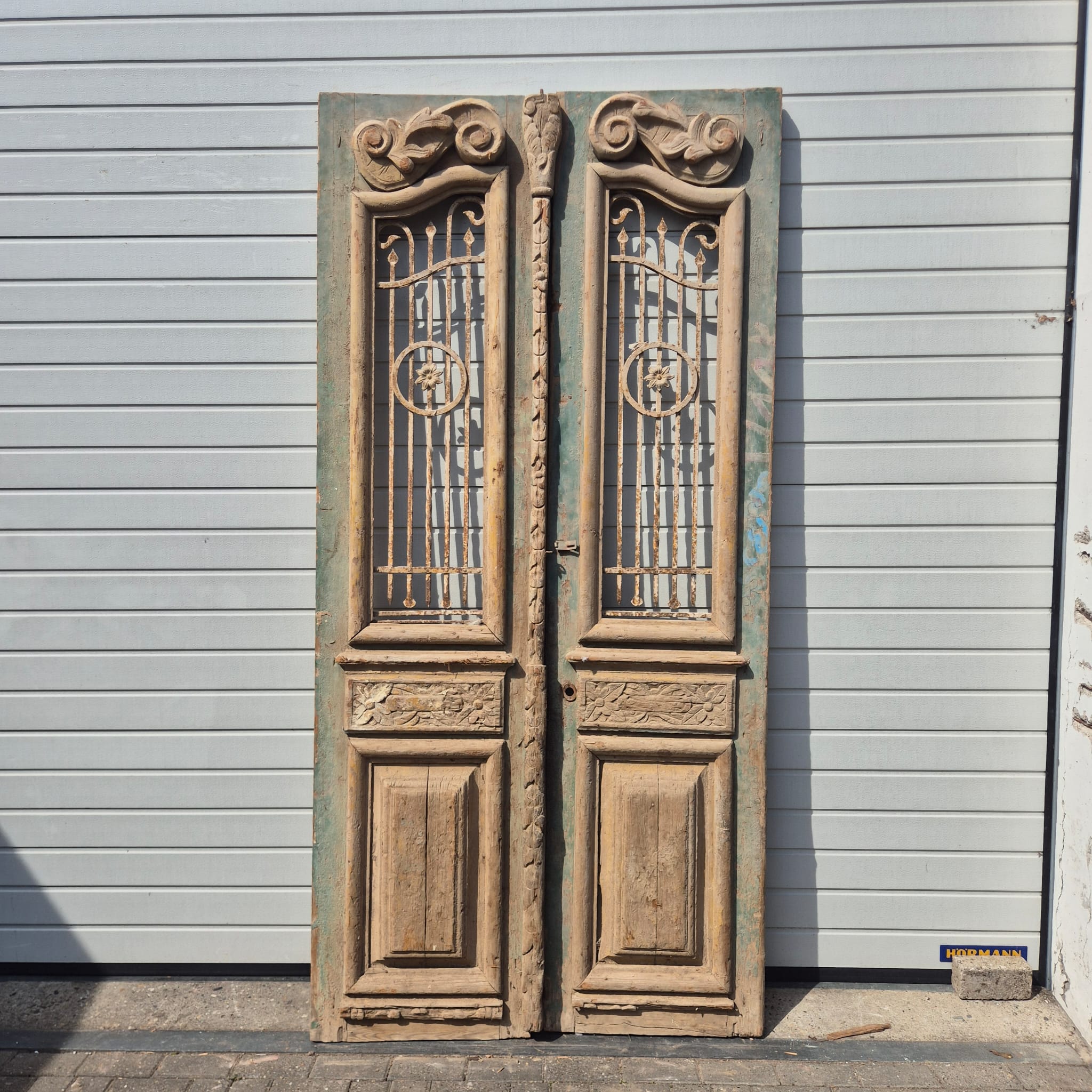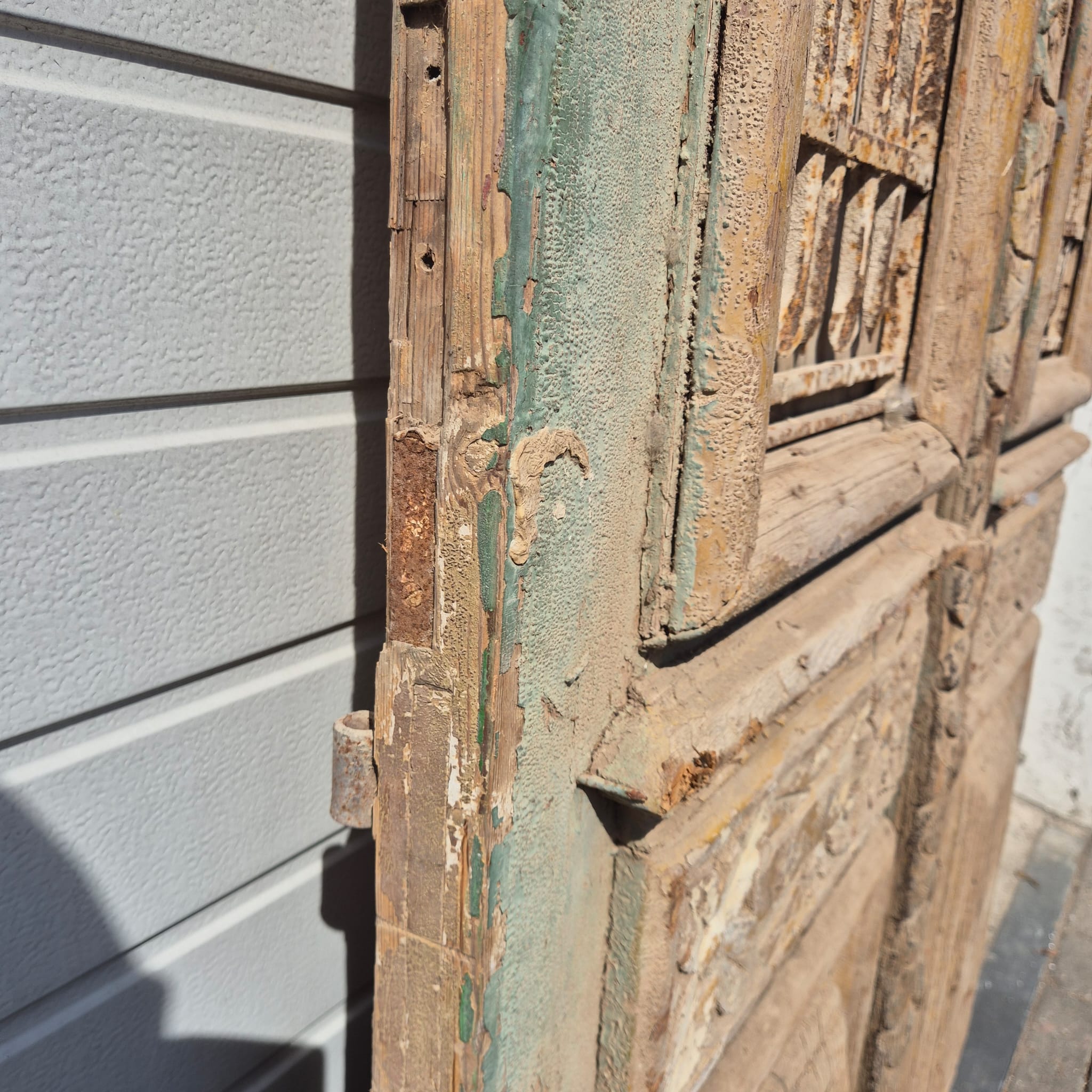 Historisch ontwerp: De deurvleugels zijn in originele, ongerestaureerde staat met een fascinerende, meerlaagse groenbeige verfafwerking die een unieke patina heeft ontwikkeld.