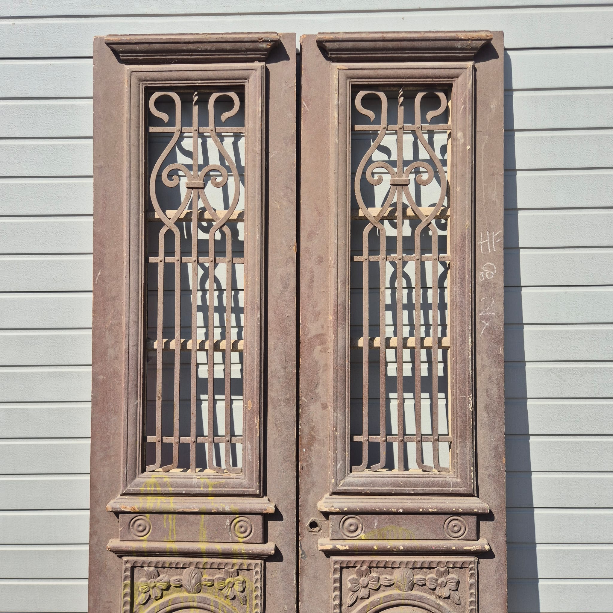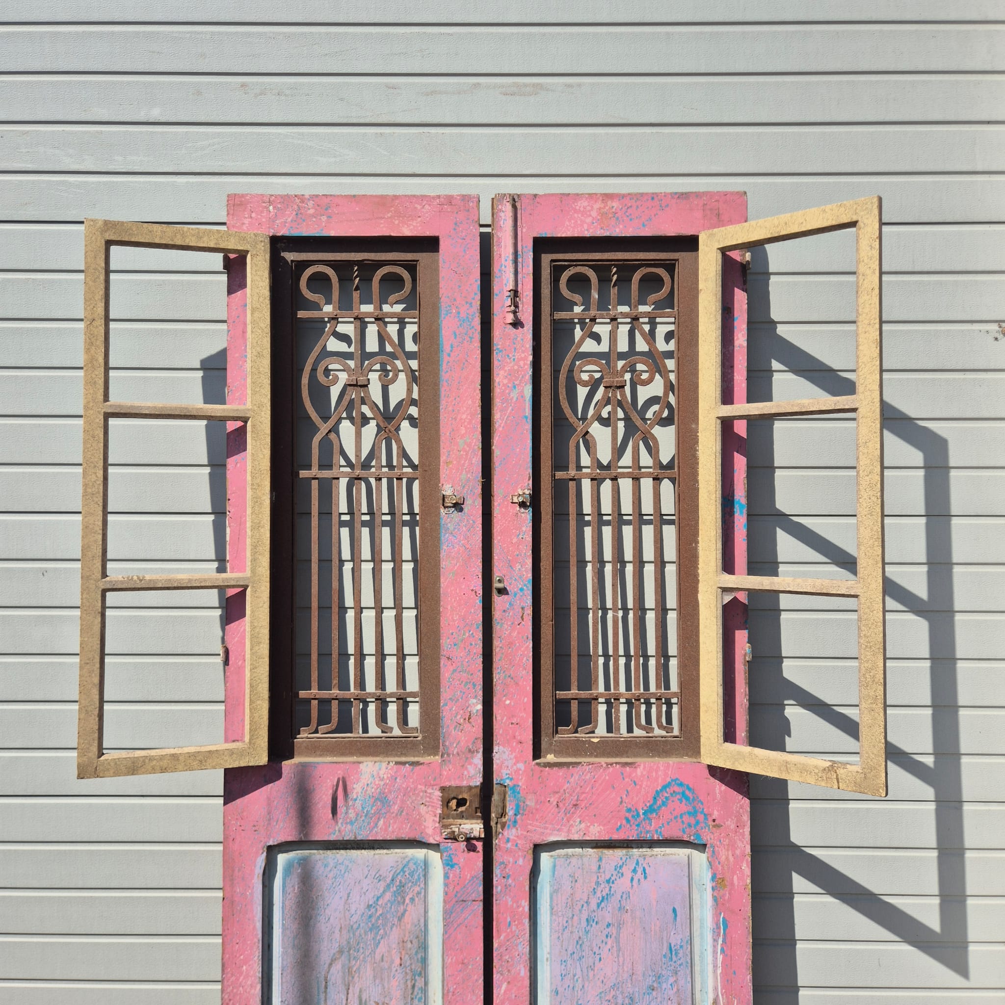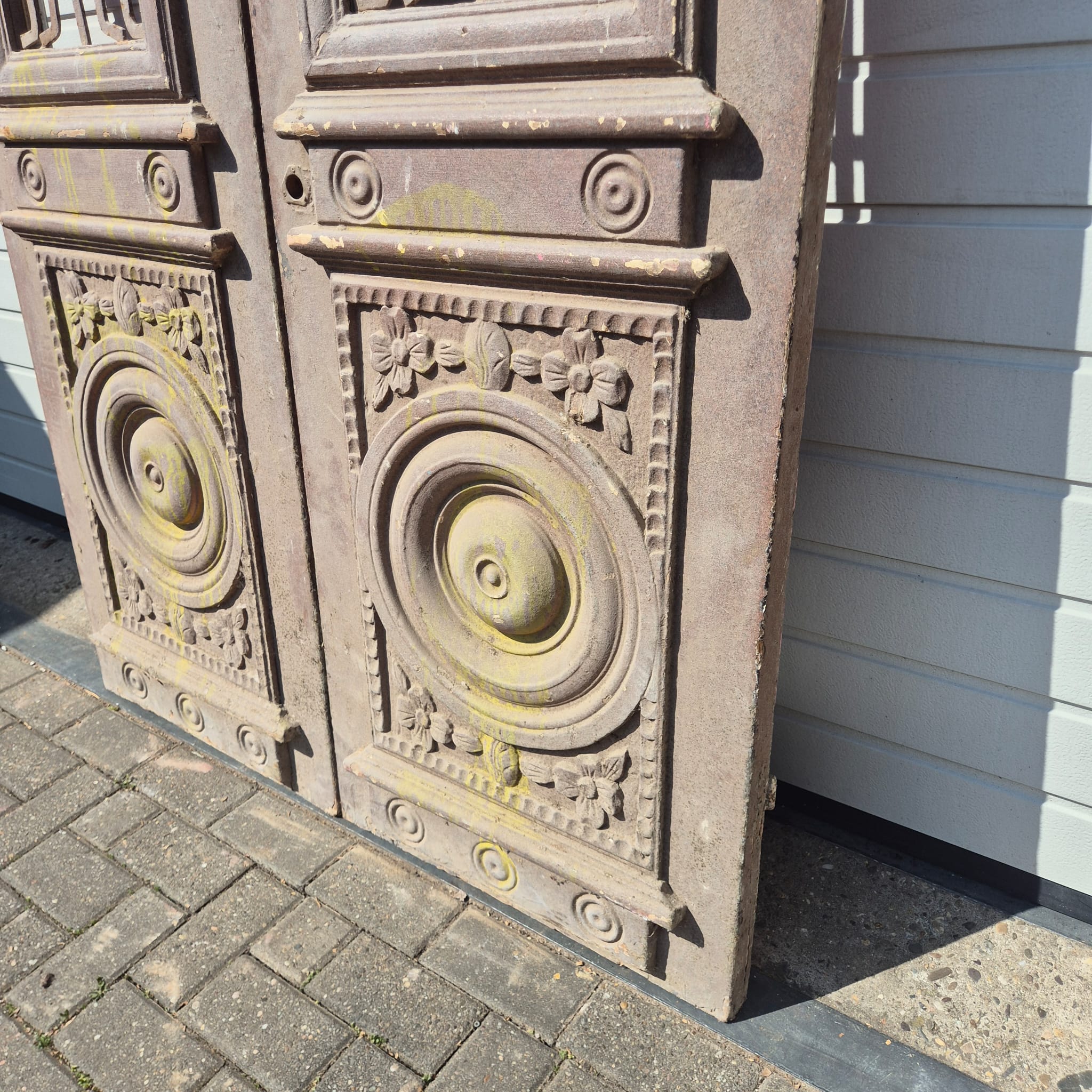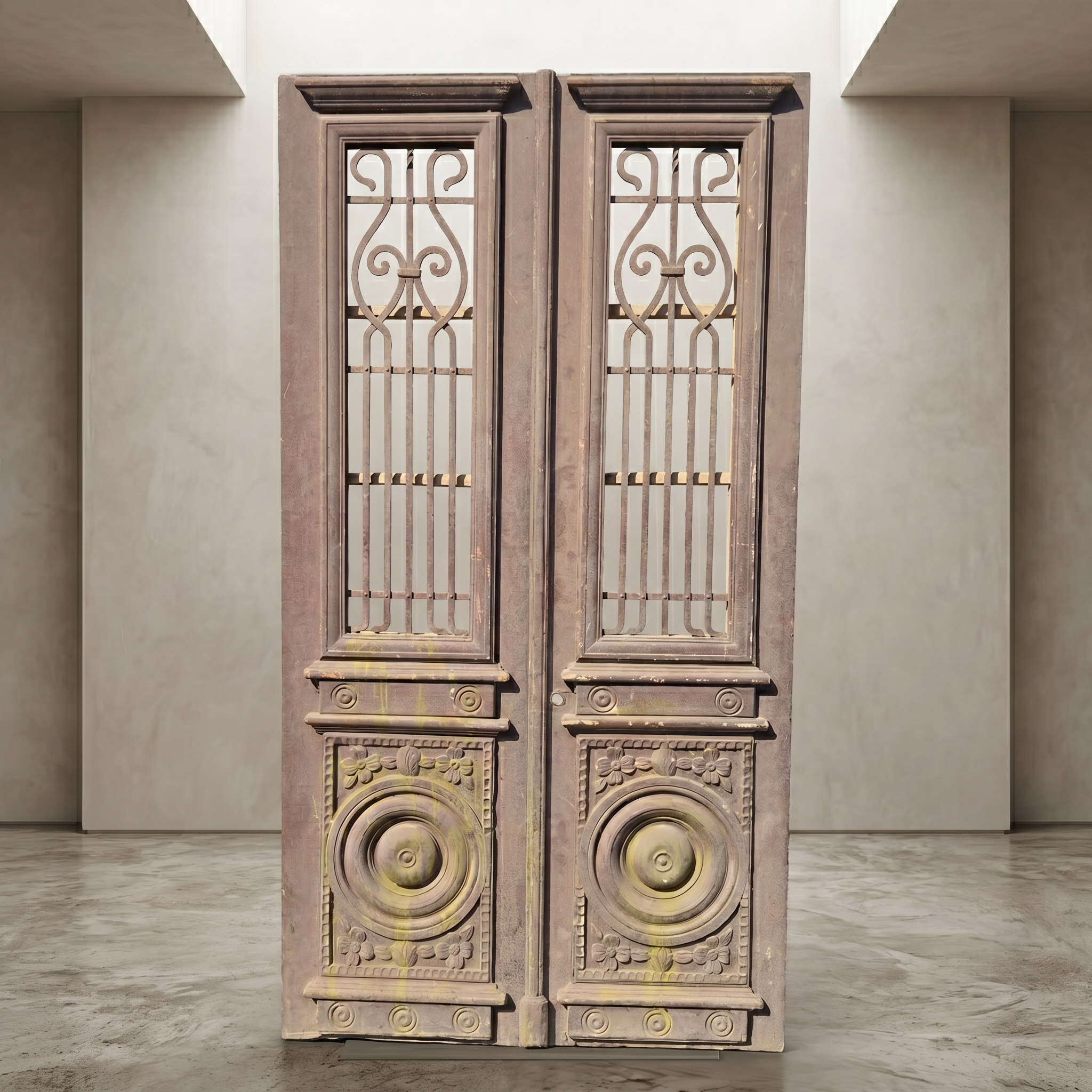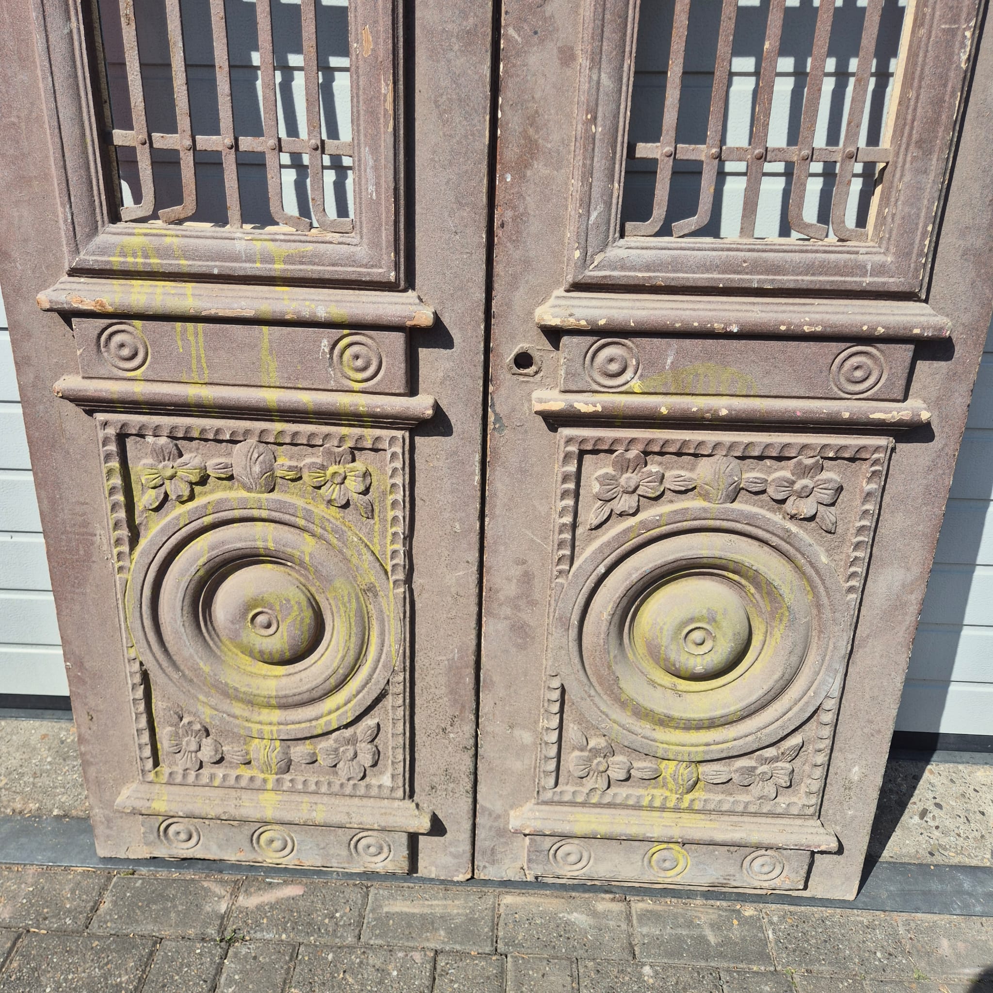 Historisch ontwerp: De deurvleugels zijn in originele, ongerestaureerde staat met een fascinerende, meerlaagse beige afwerking die een unieke patina heeft ontwikkeld.