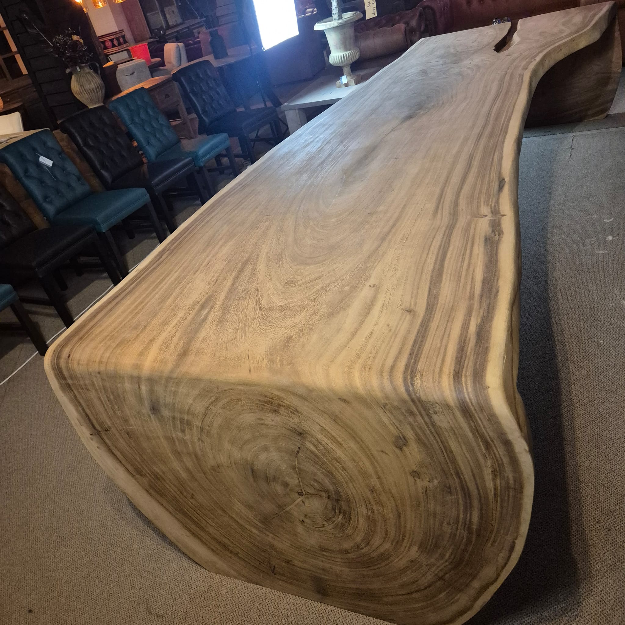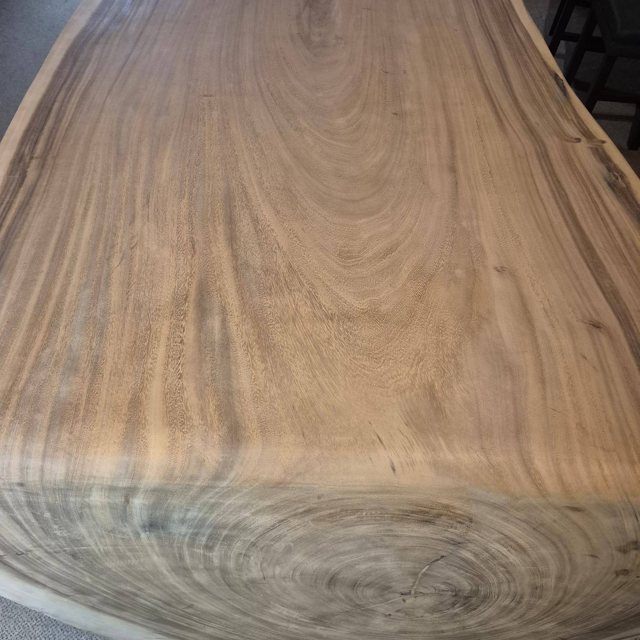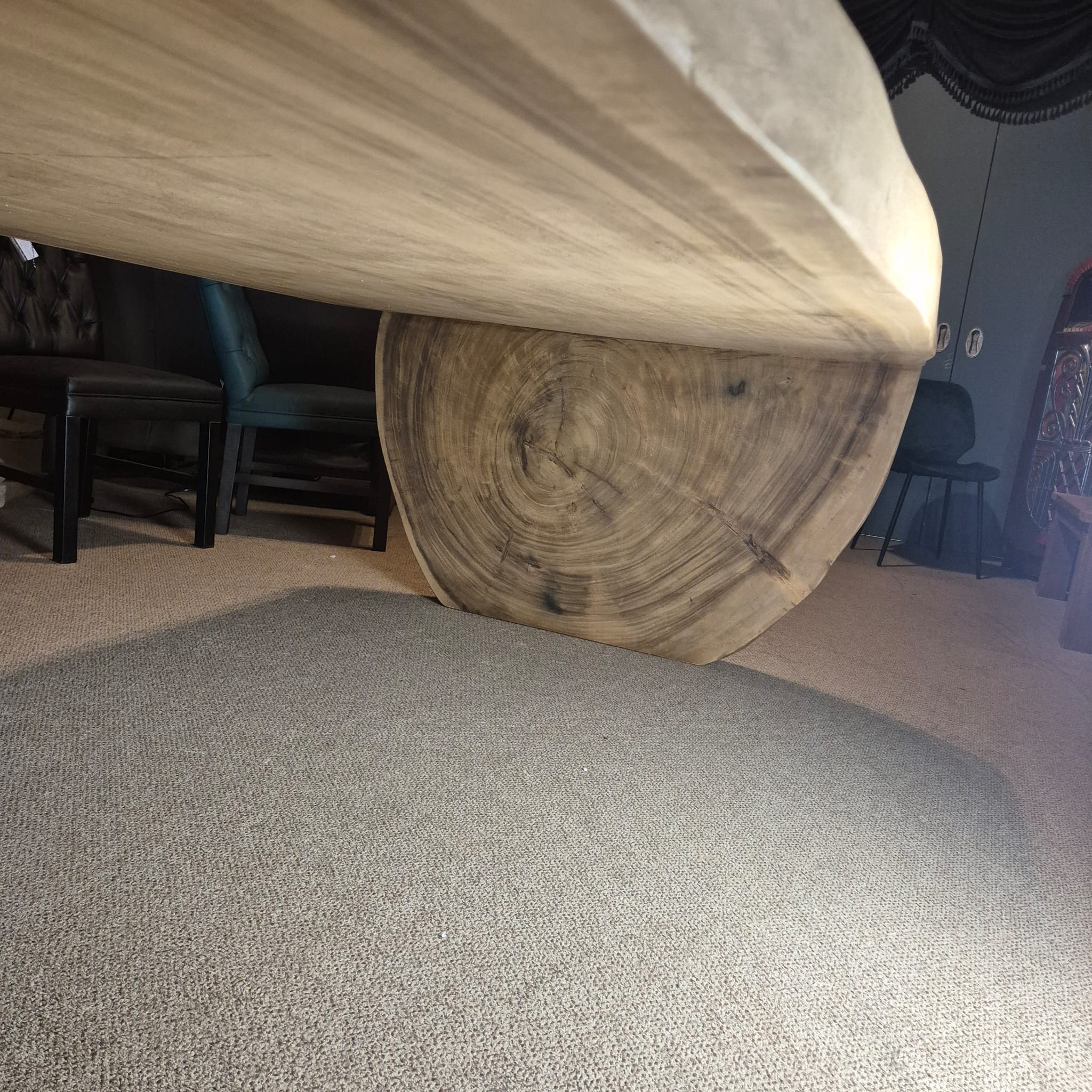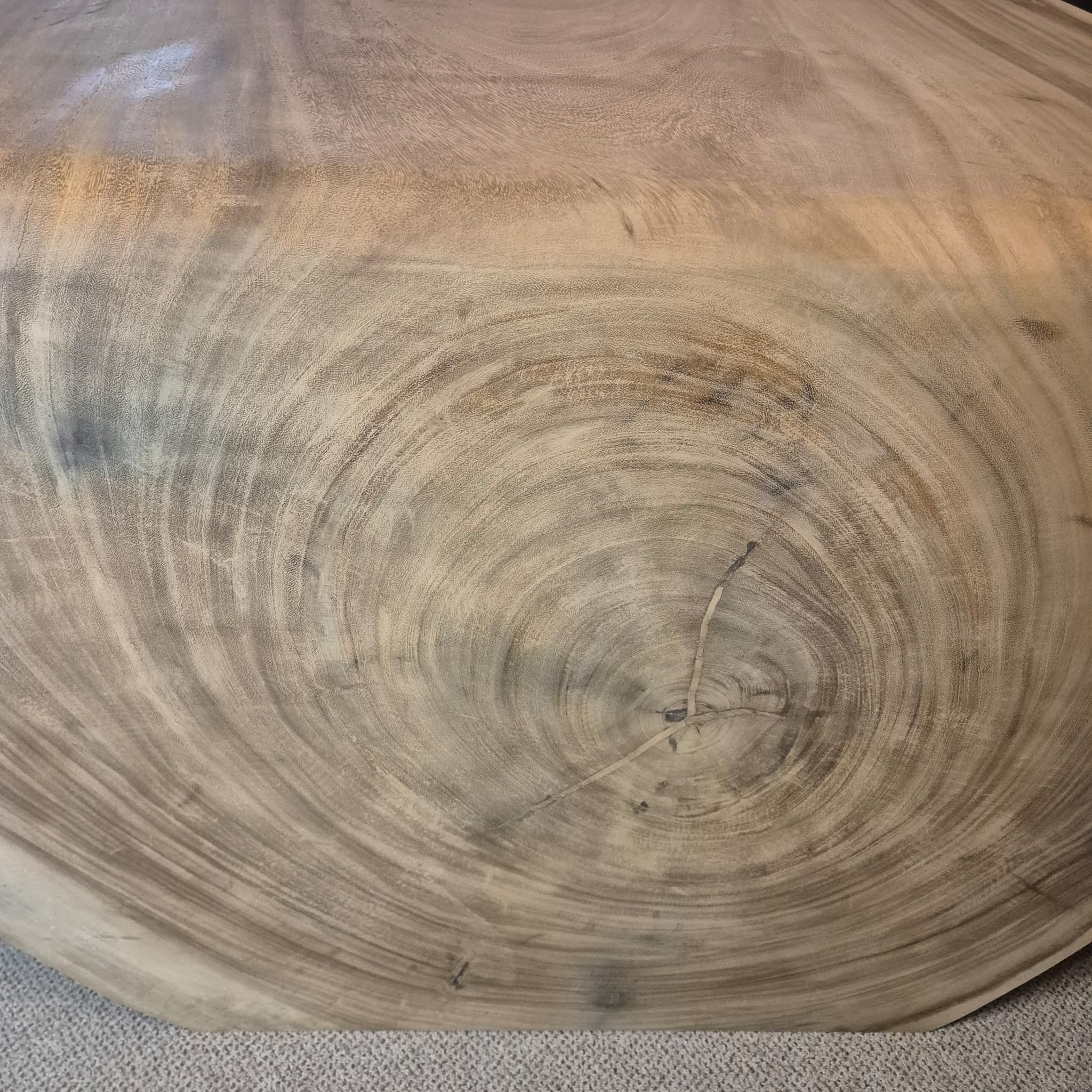 Deze prachtige tafel is gemaakt van één enkele, massieve acaciaboomstam, waardoor het een werkelijk uniek stuk is. De natuurgetrouwe afwerking en de indrukwekkende, doorlopende houtnerf geven deze tafel uitzonderlijke warmte en rustieke elegantie.