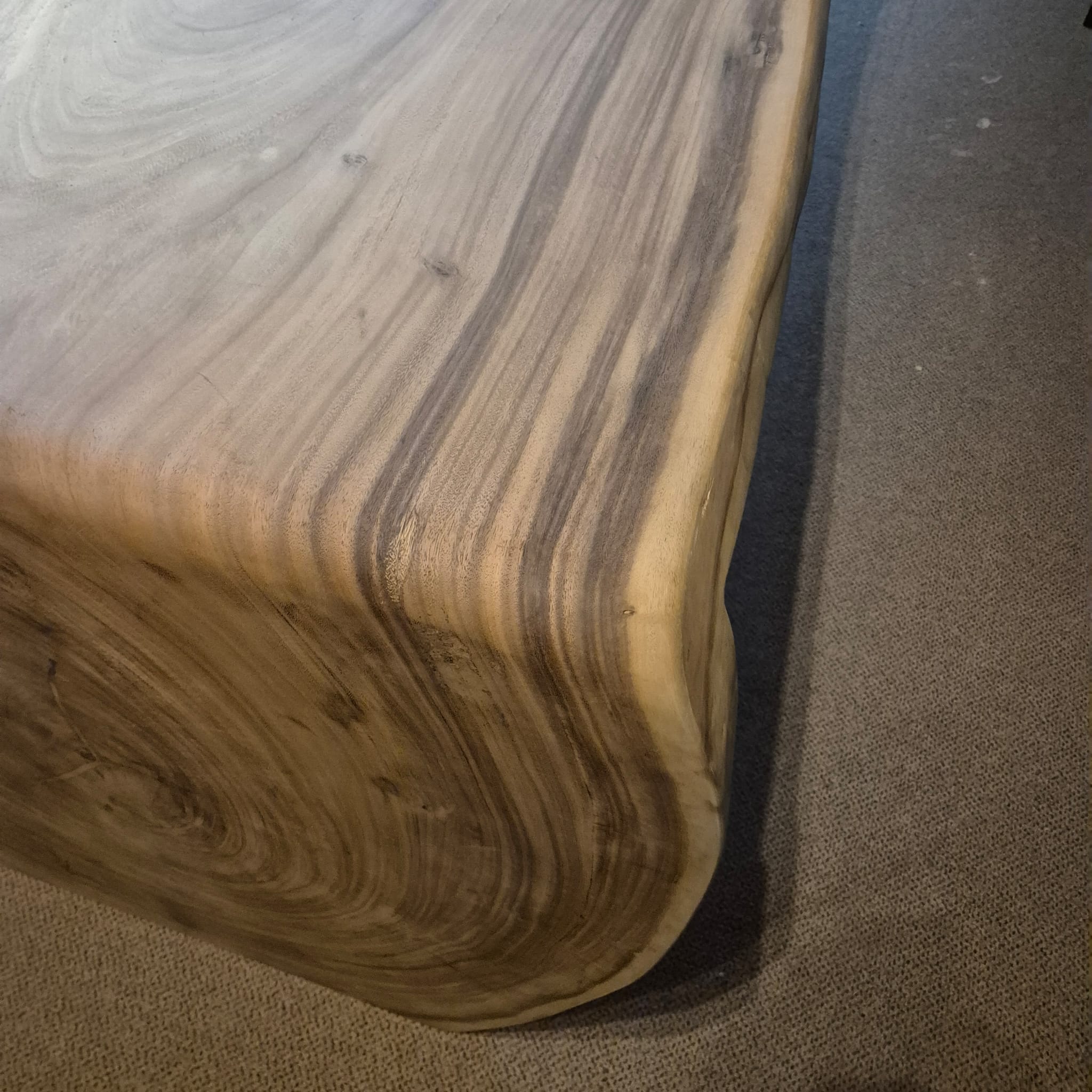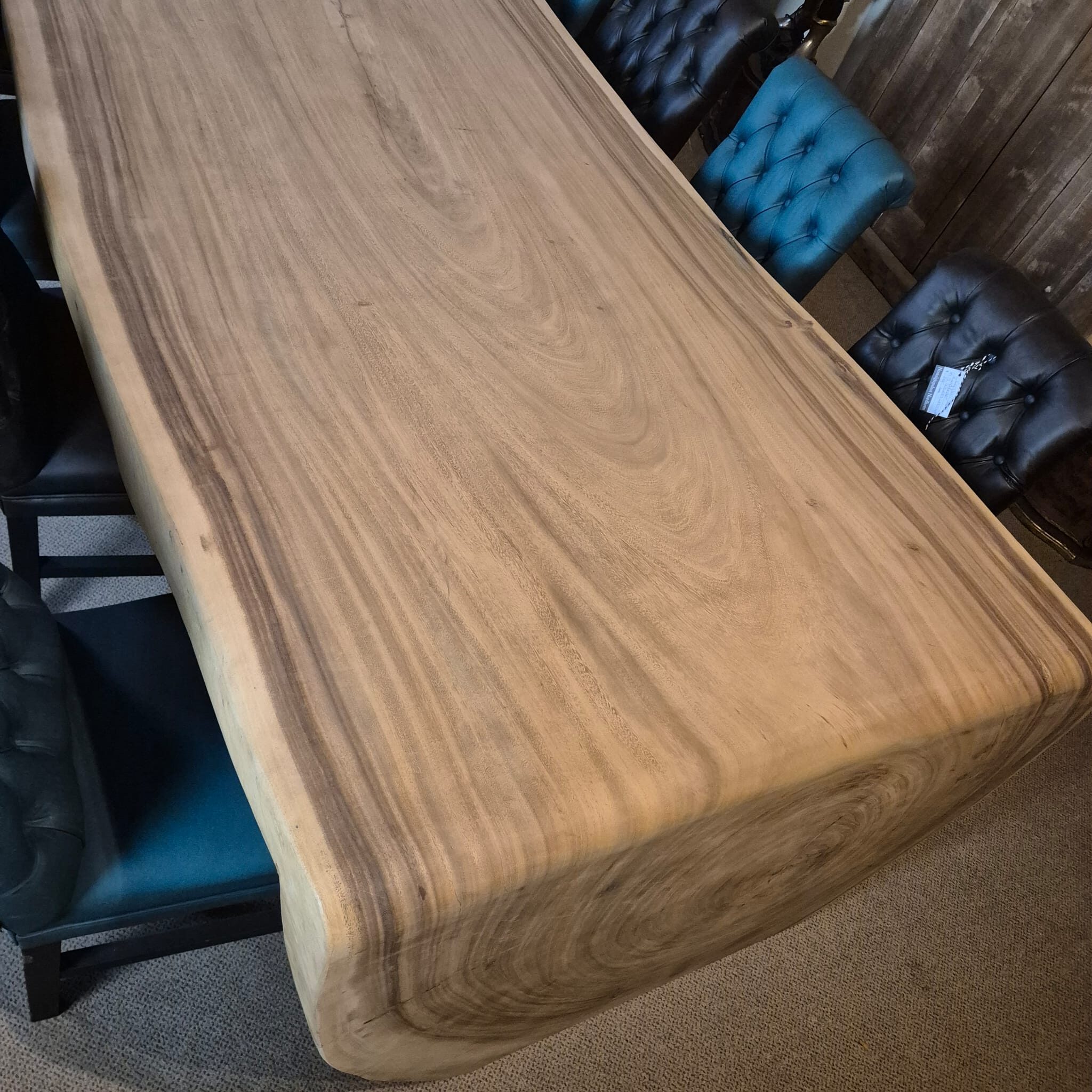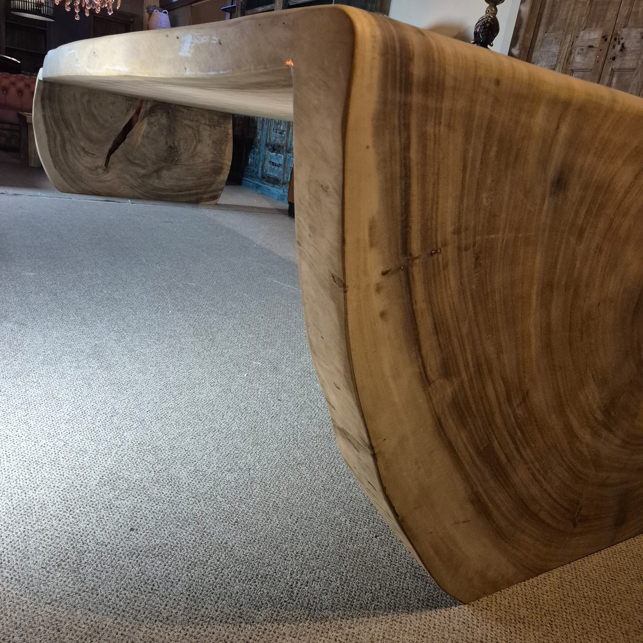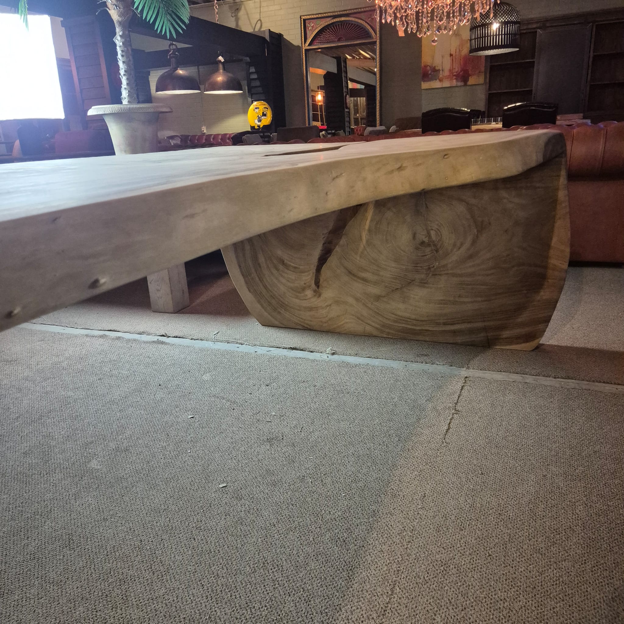 Deze prachtige tafel is gemaakt van één enkele, massieve acaciaboomstam, waardoor het een werkelijk uniek stuk is. De natuurgetrouwe afwerking en de indrukwekkende, doorlopende houtnerf geven deze tafel uitzonderlijke warmte en rustieke elegantie.