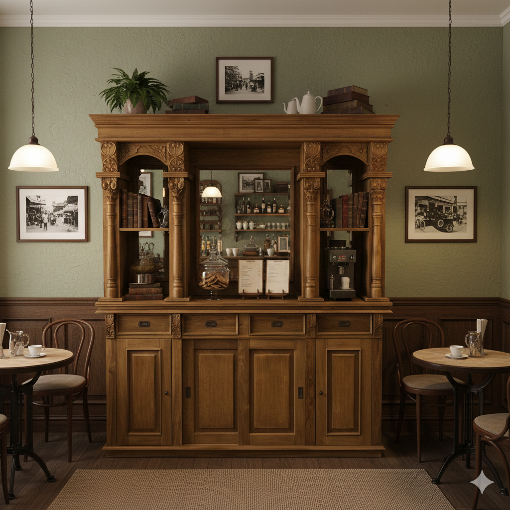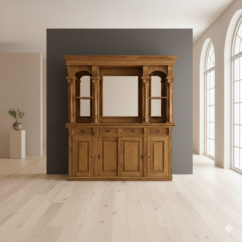 Dit stijlvol vormgegeven bar-buffet van massief teakhout dankt zijn bijzondere uitstraling aan de natuurlijke onregelmatigheden in het hout. Deze ontstaan door het gebruik van dit edele hout met zijn diverse kleuren en texturen, wat dit meubel een eigenzinnig karakter geeft en er een uniek exemplaar van maakt. De vlam en kleurschakering van het hout dragen aanzienlijk bij aan de visuele waarde van dit meubel, dat zowel decoratieve mogelijkheden als voldoende opbergruimte biedt. De combinatie van een nostalgische look en moderne functionaliteit is geschikt voor alle horecagelegenheden en vele andere toepassingen. Het meubel wordt volledig gemonteerd geleverd en is dus direct klaar voor gebruik. Demontabel (2-delig).