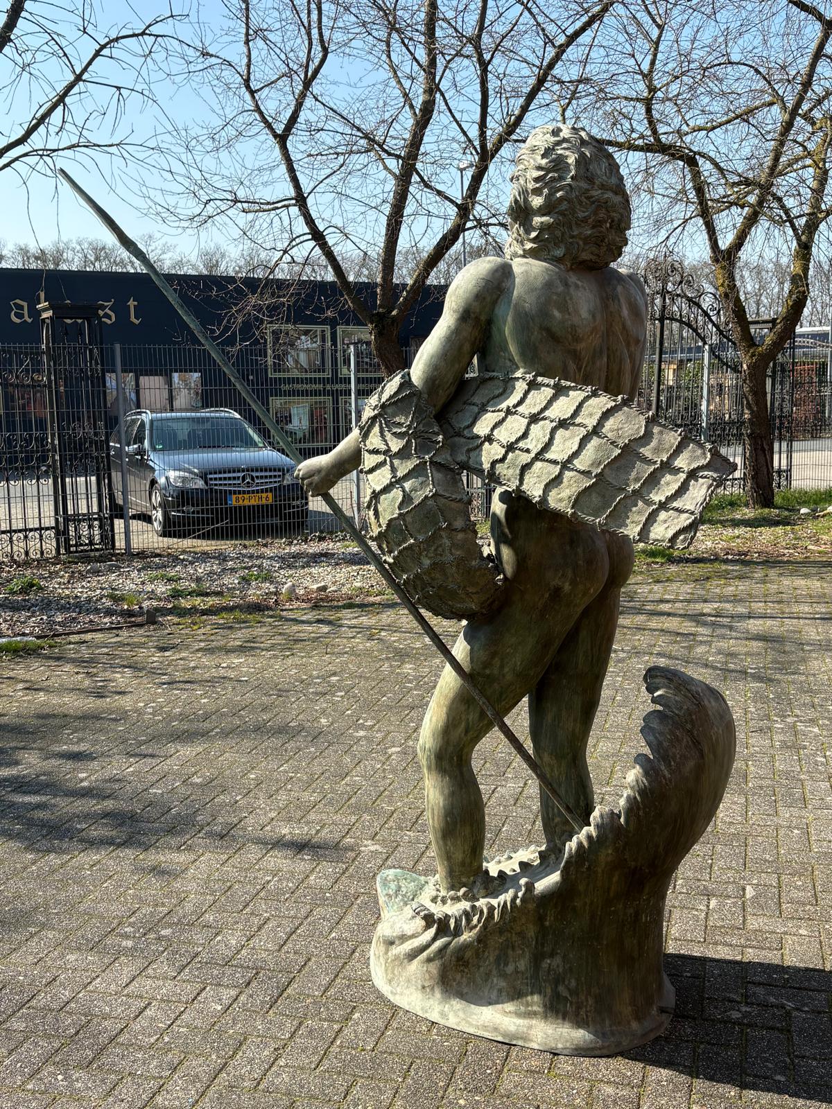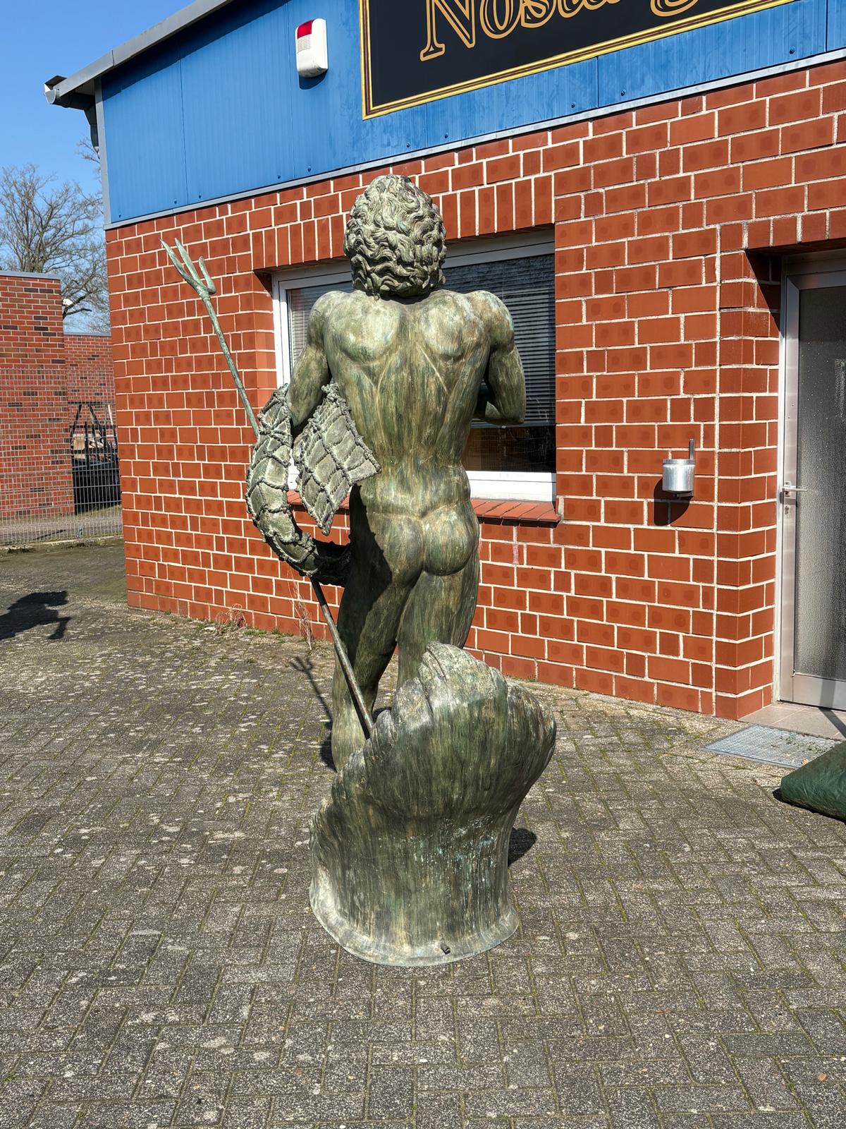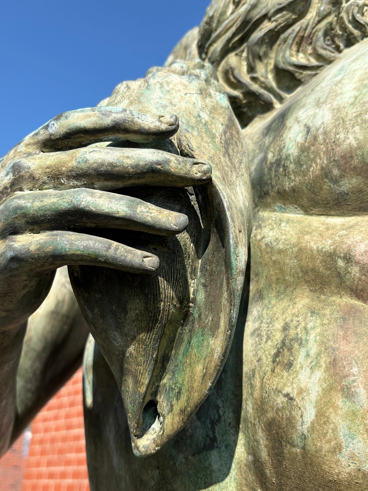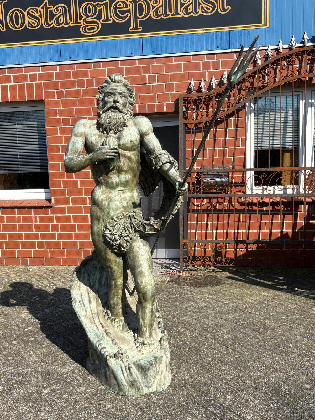 Wij bieden je een uitzonderlijke kans om een monumentale bronzen waterspuwer te bemachtigen. Deze indrukwekkende figuur beeldt Poseidon, de Griekse god van de zee (of Neptunus, zijn Romeinse tegenhanger), af in al zijn macht en majesteit.