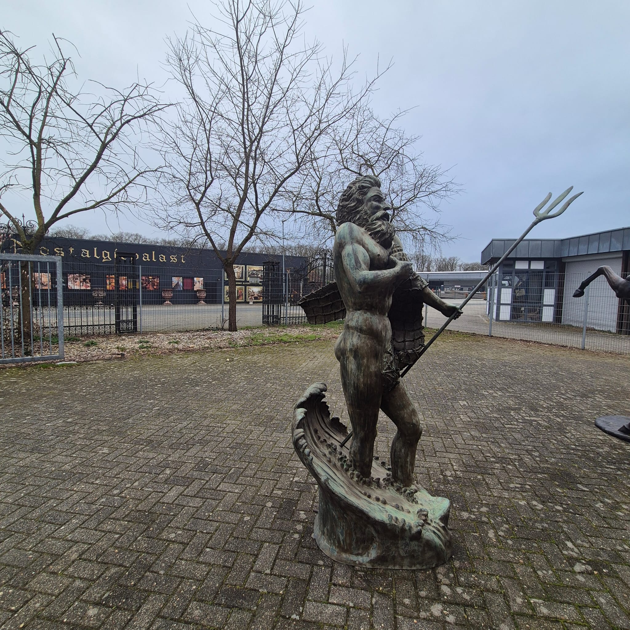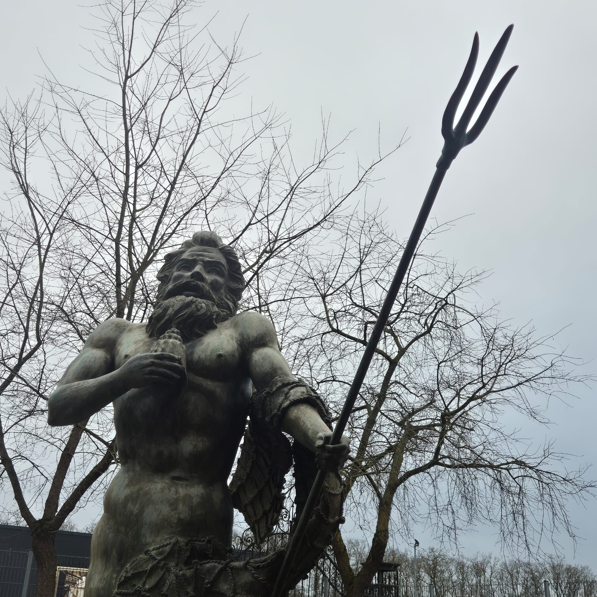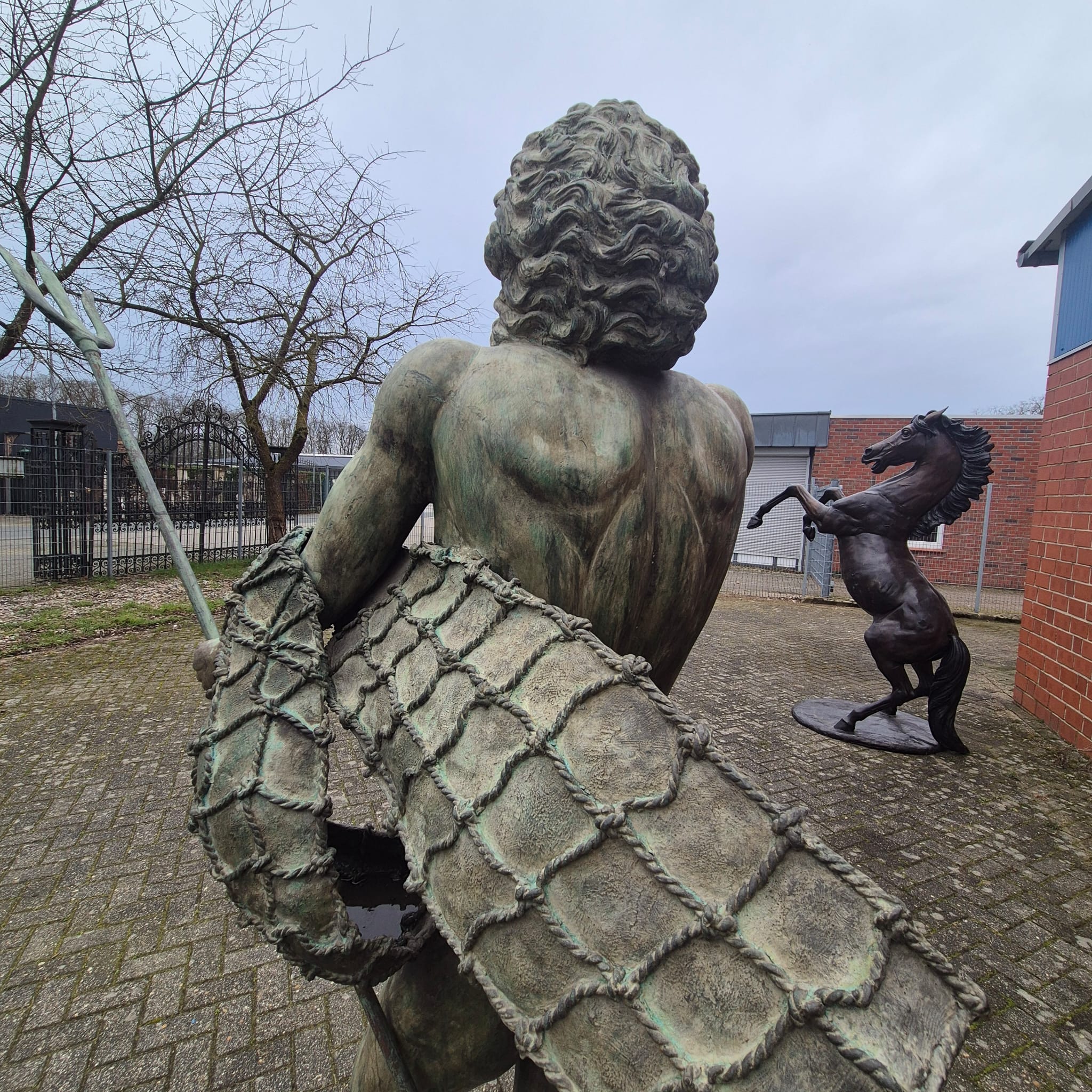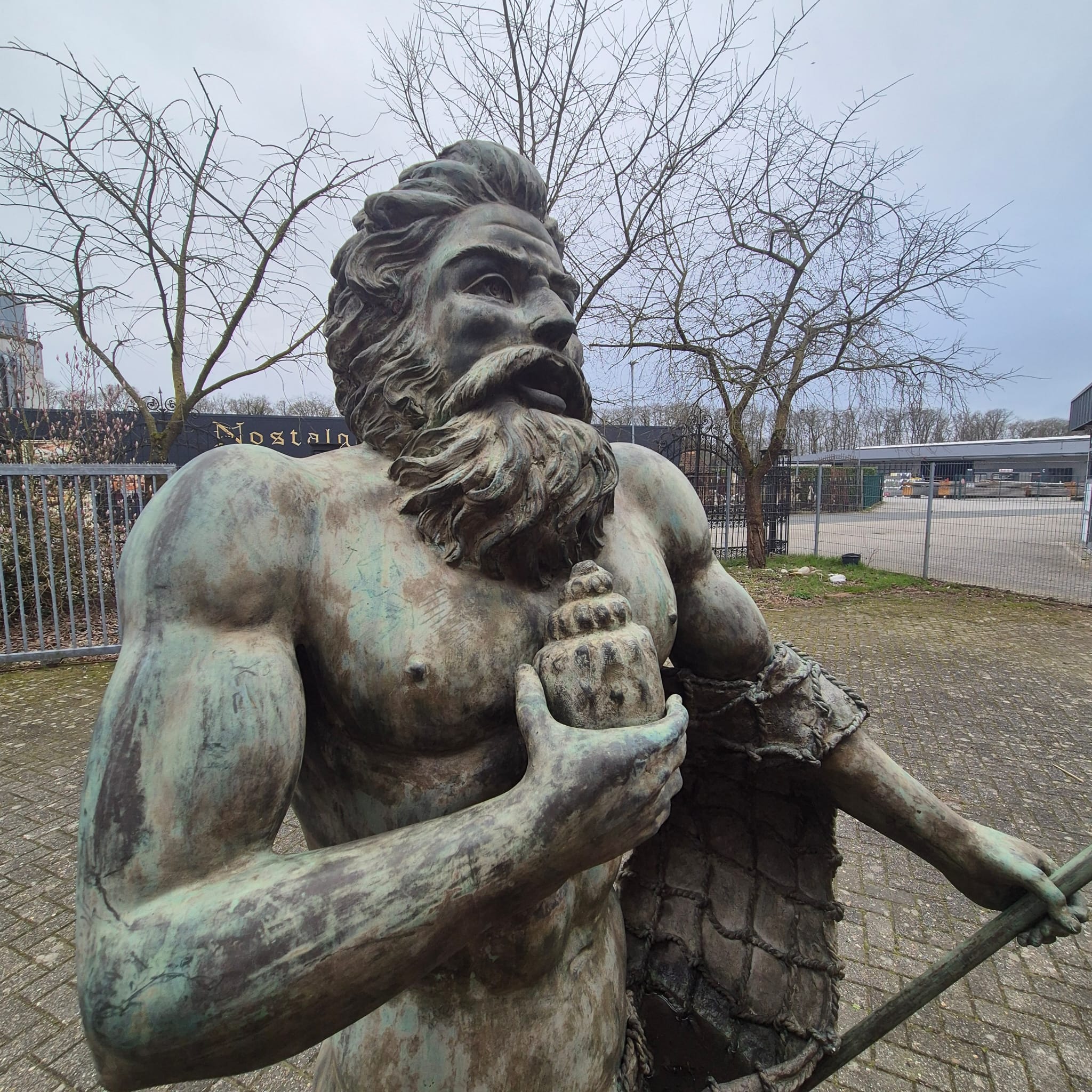 Hij houdt een schelp in zijn rechterhand en zijn beroemde drietand in zijn linkerhand.