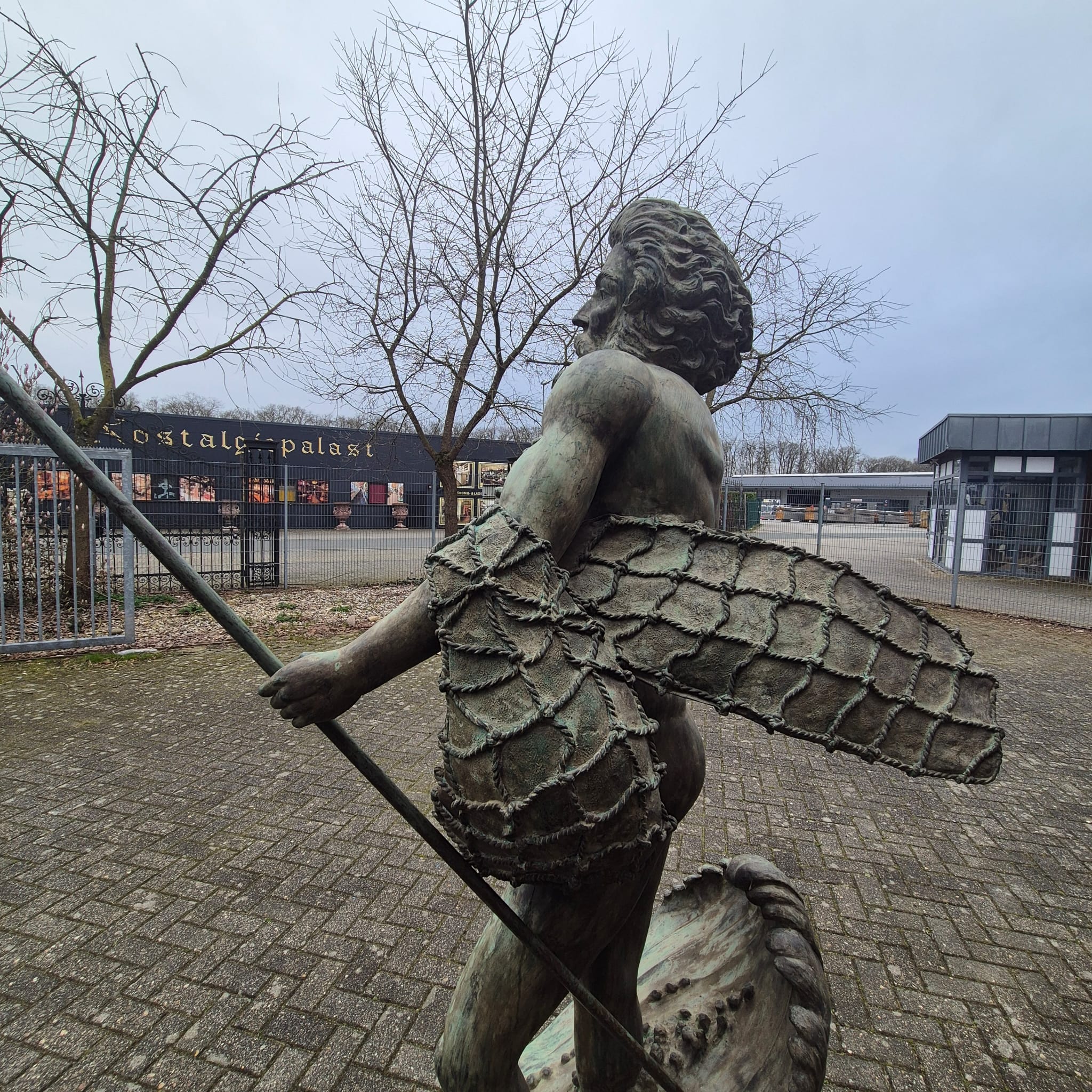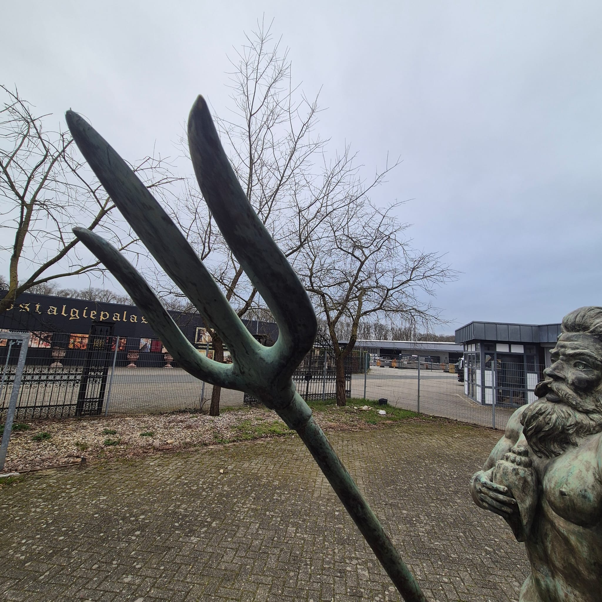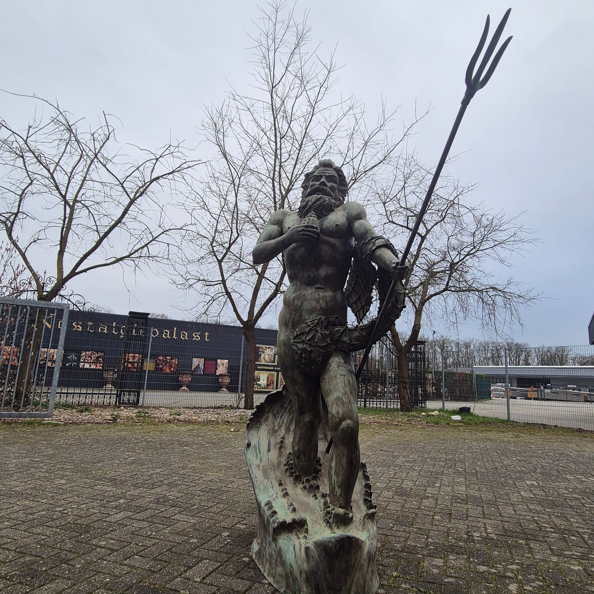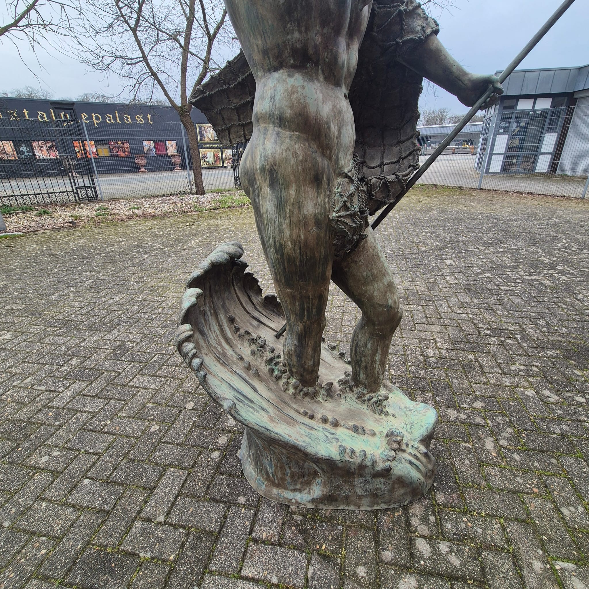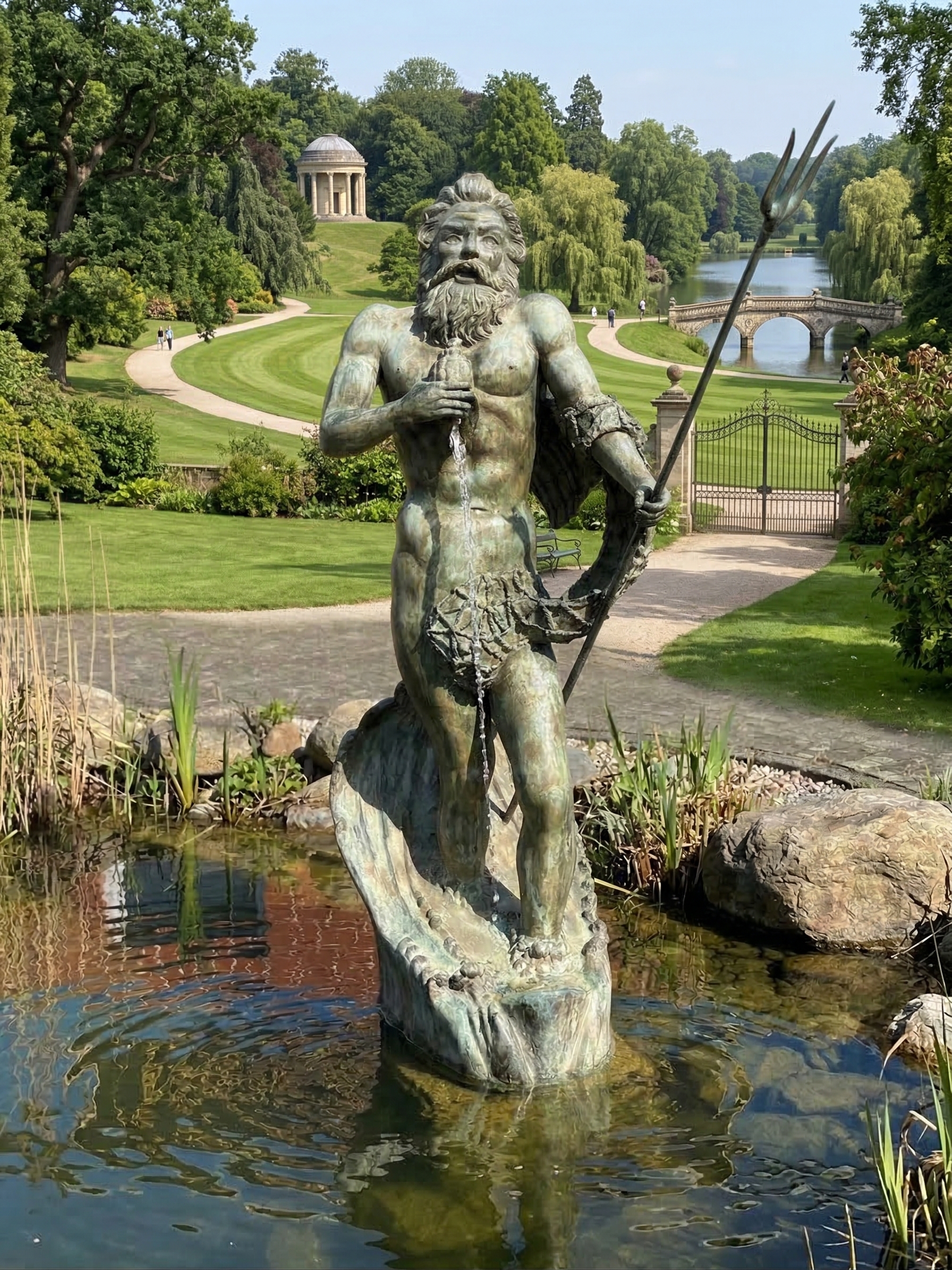 Hij houdt een schelp in zijn rechterhand en zijn beroemde drietand in zijn linkerhand.