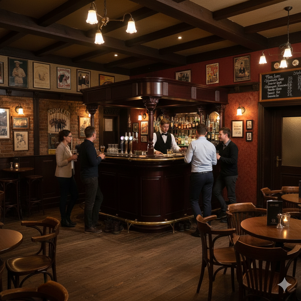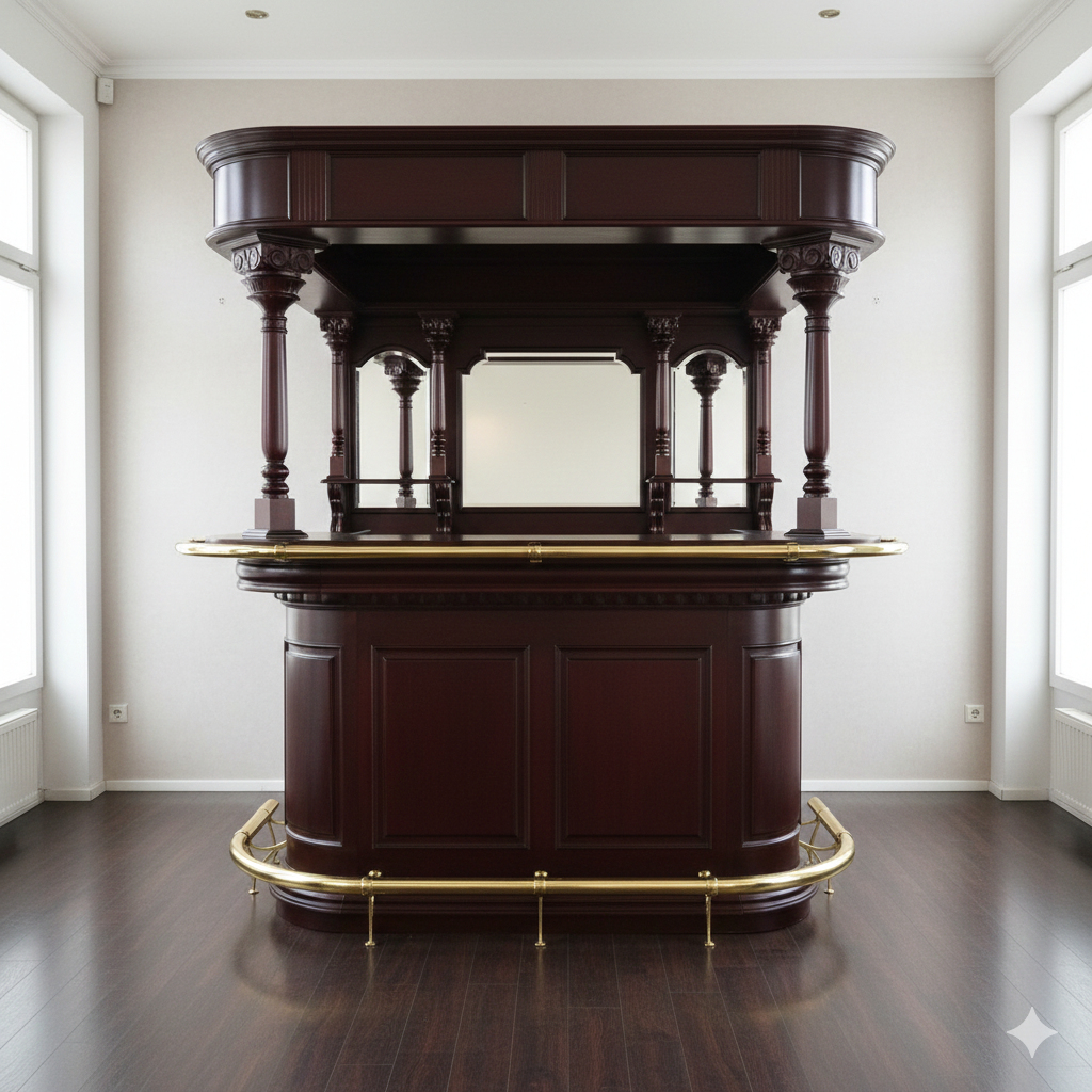 Huisbar in mahoniekleur, gemaakt van massief hout. De voorzijde is door middel van de luifel verbonden met de achterwand. Uitermate geschikt als (t)huisbar of voor uw horecagelegenheid.