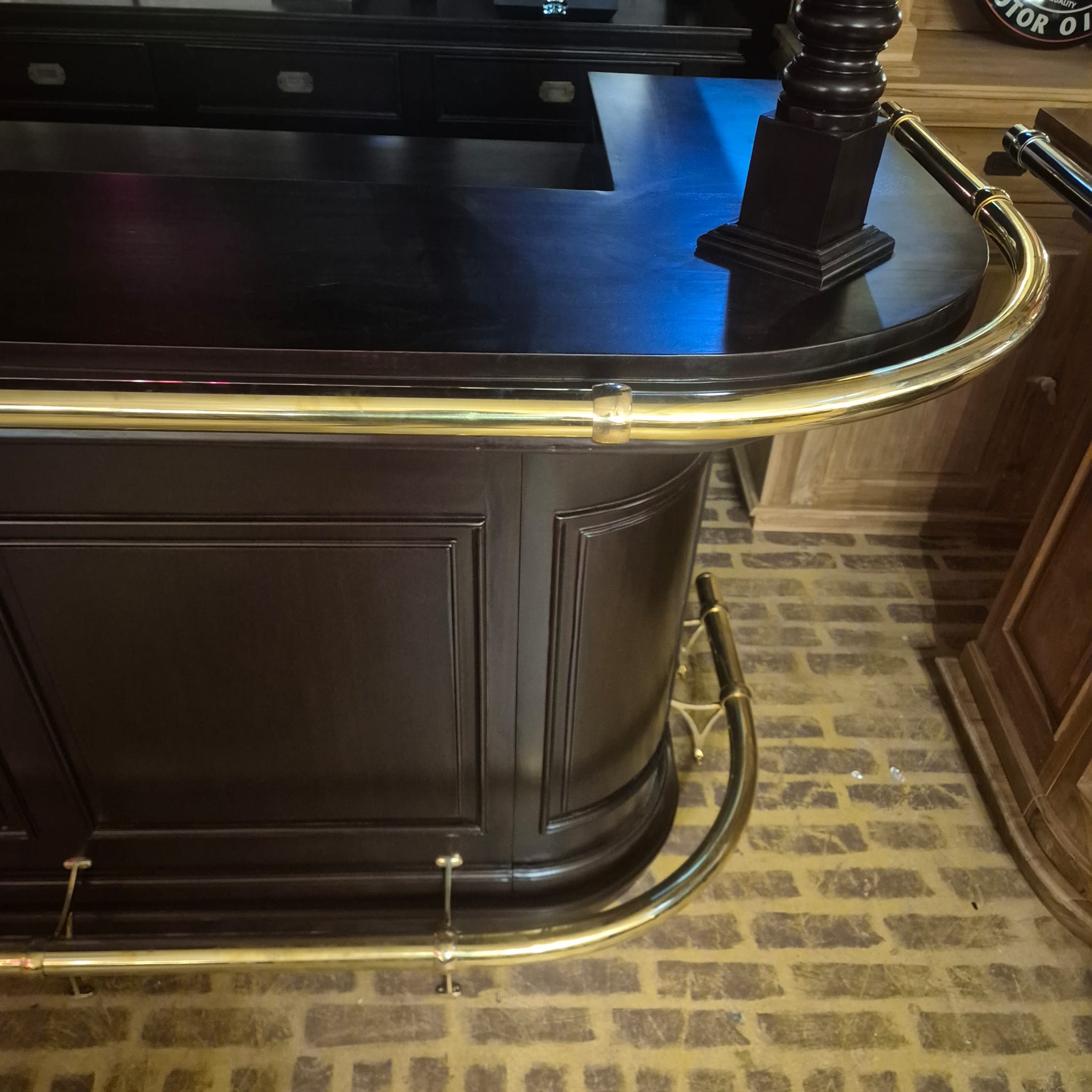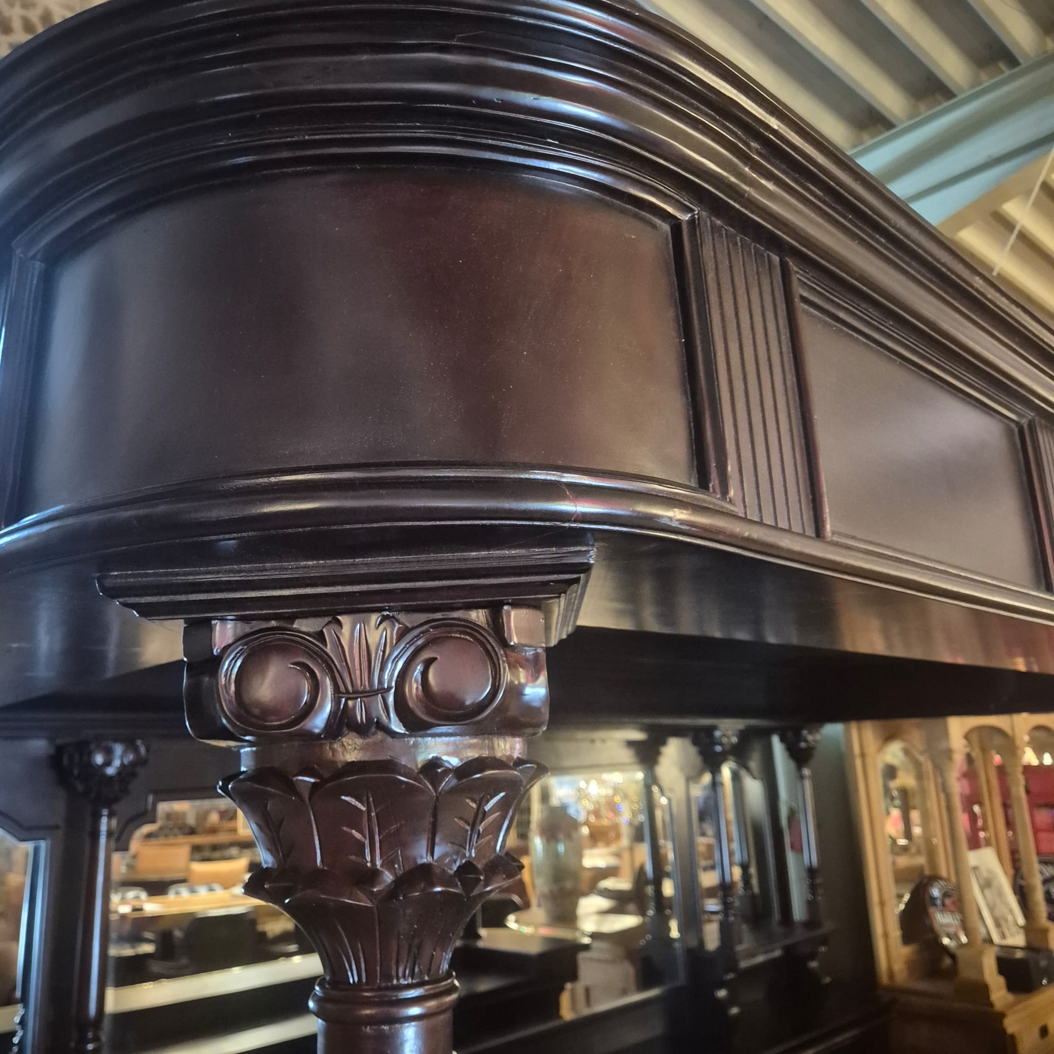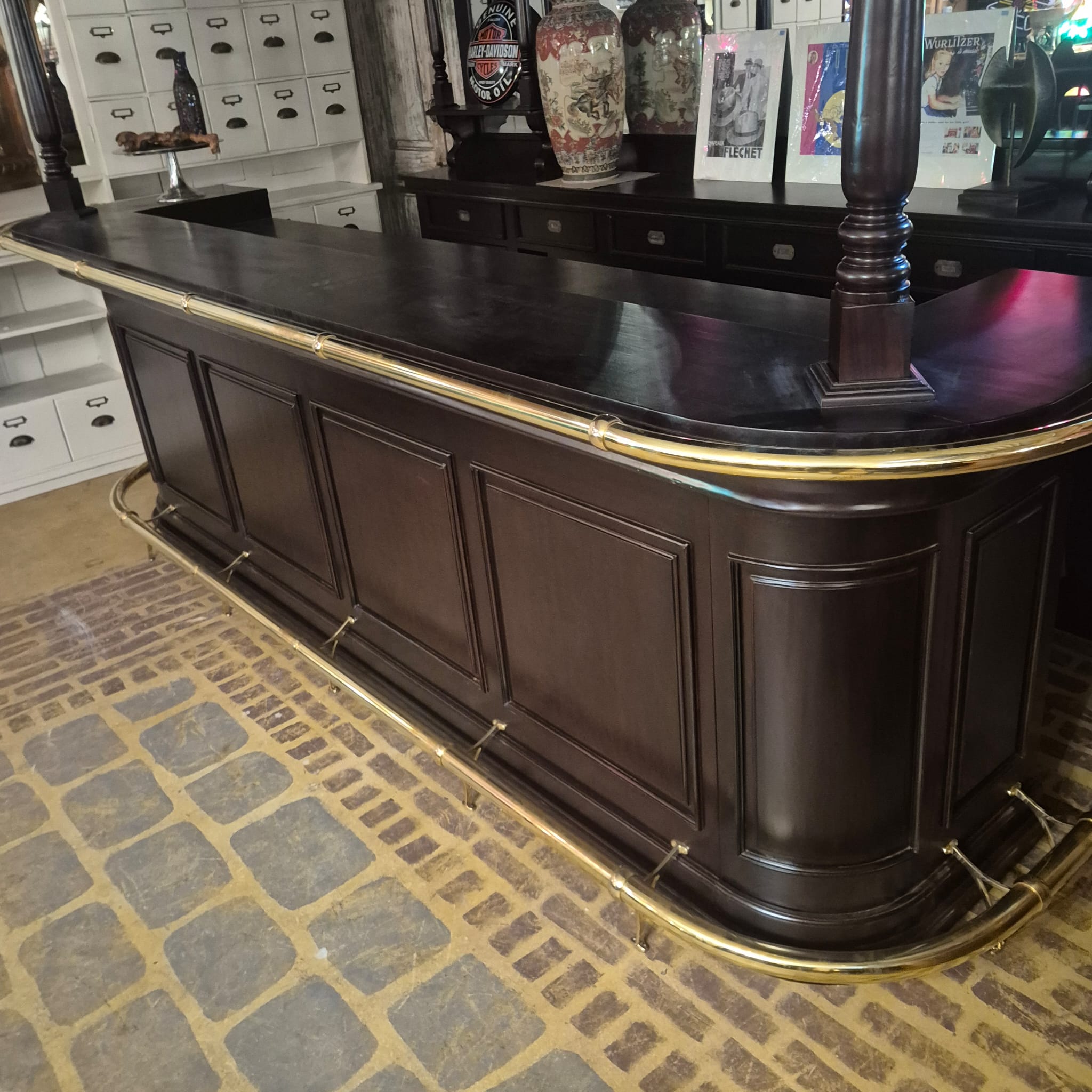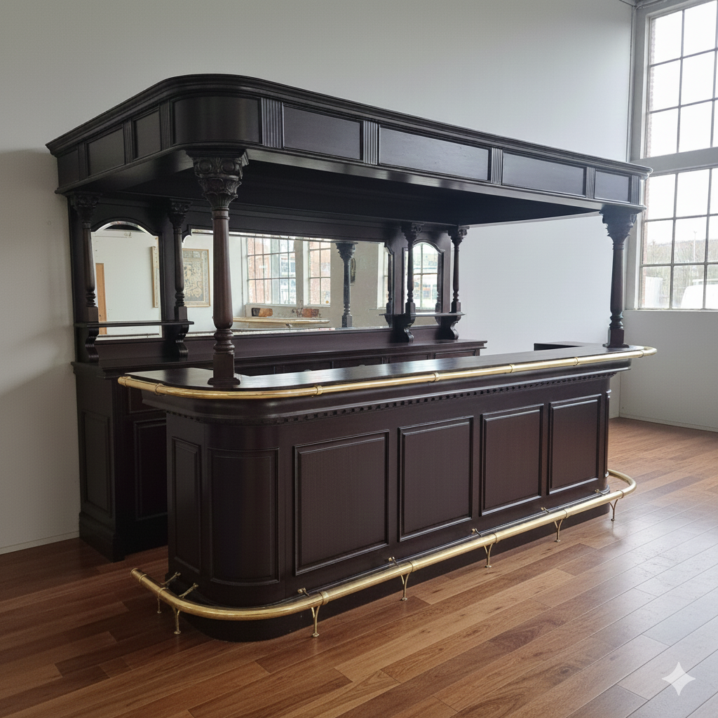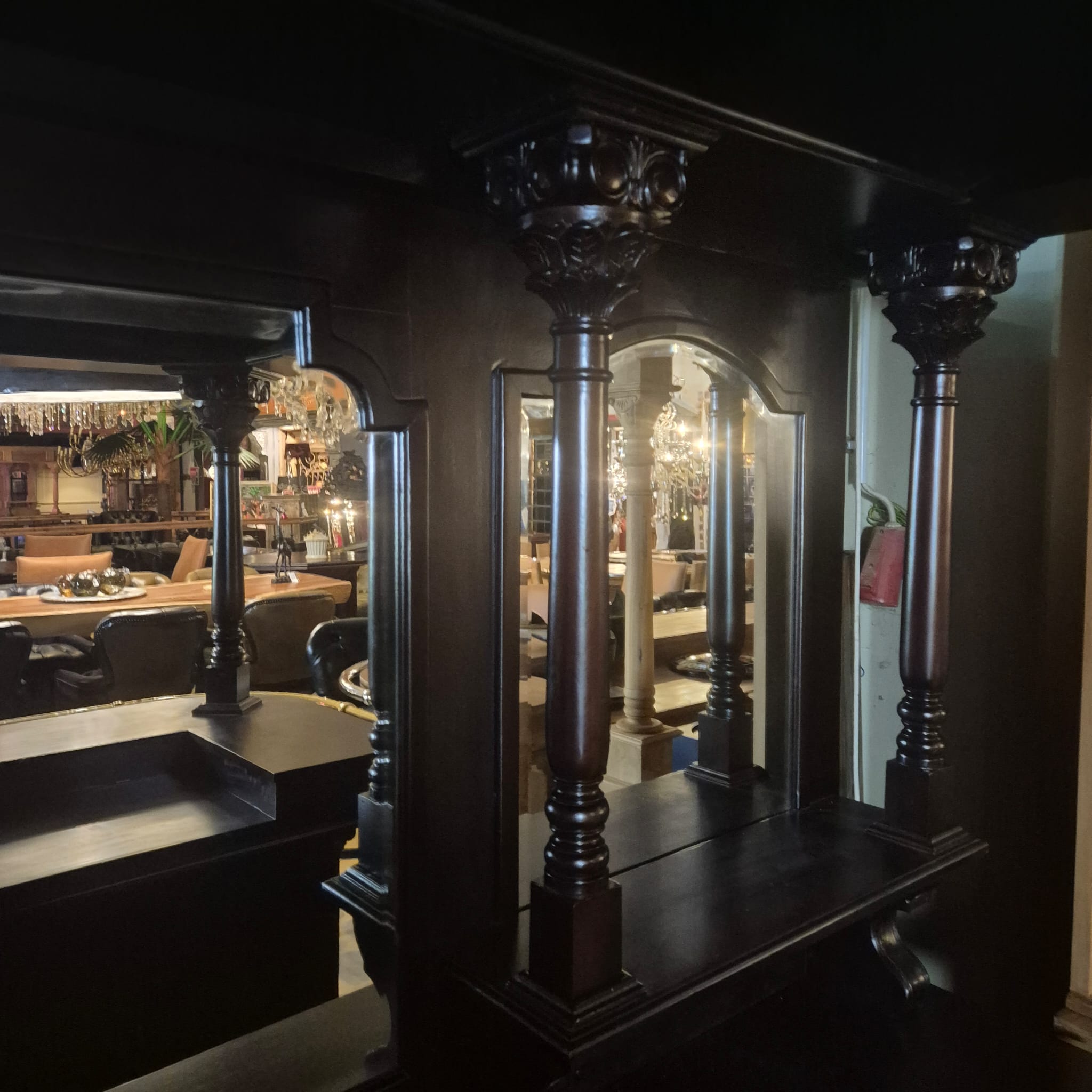 Huisbar gemaakt van massief hout, maakt indruk met zijn imposante uitstraling, evenals de stijlvolle achterkast met spiegels en zuilen. Demontabel (8-delig).
