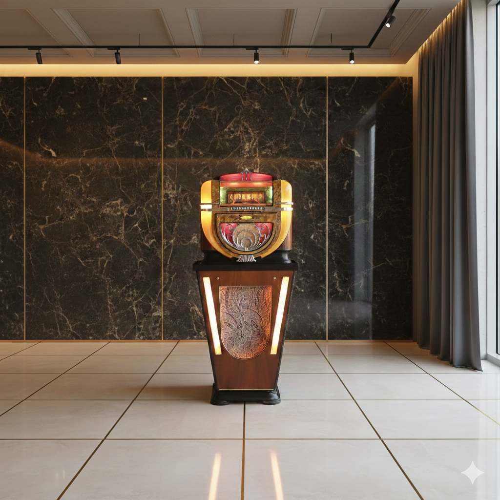 €7.999,00 Excl. btw:Deze hoogwaardige reproductie van de Wurlitzer Model 71 jukebox uit 1942, de Antique Apparatus CD-91, is geüpdatet met cd-technologie. De jukebox is gebouwd in 1991 van hardhout en op maat gebogen multiplex, bedekt met fineer van walnoot en Afrikaans hout, en is gebouwd met dezelfde hoge kwaliteit als het origineel. De gebogen goudgele kunststof onderdelen zijn voorzien van verchroomde spuitgietdelen en lichten op.