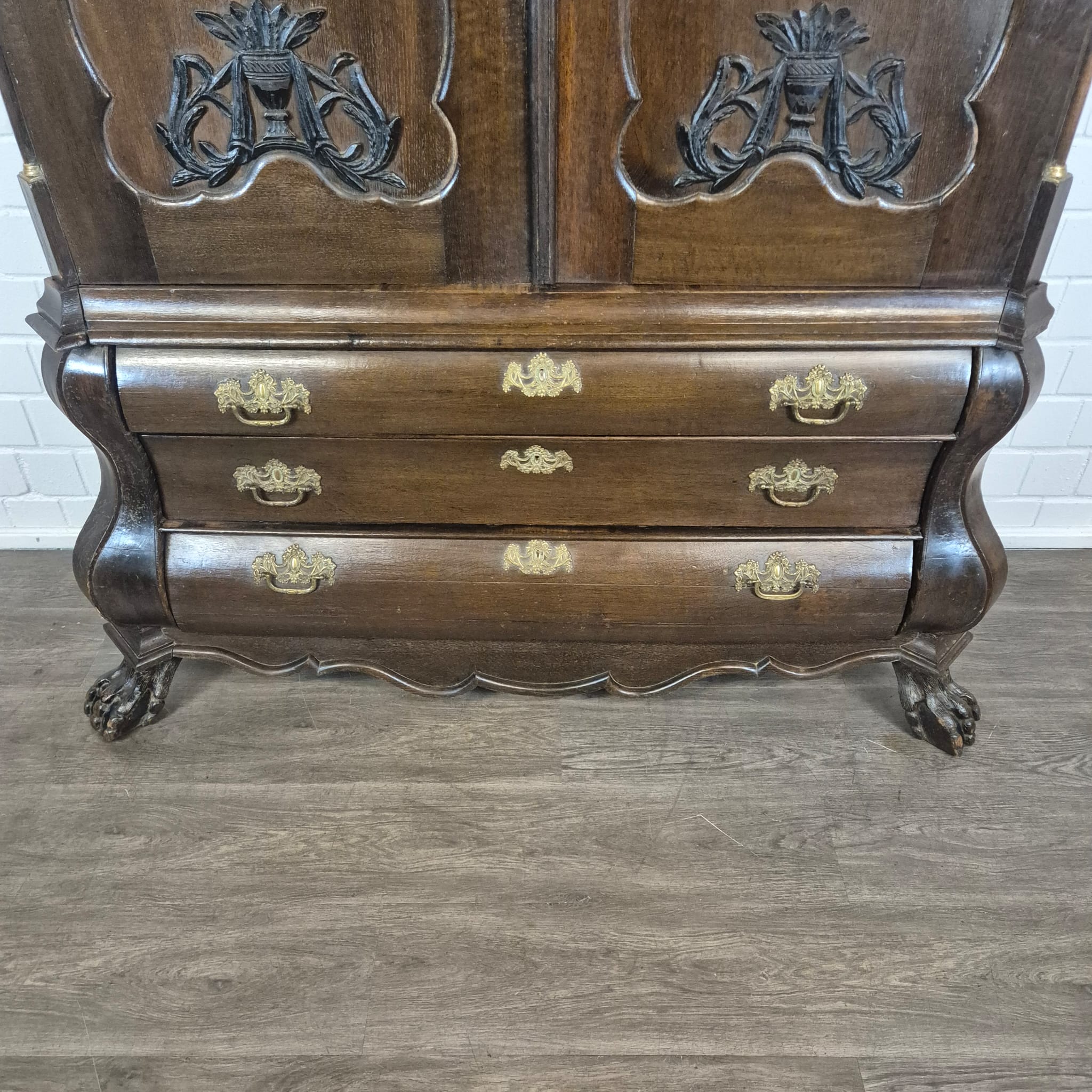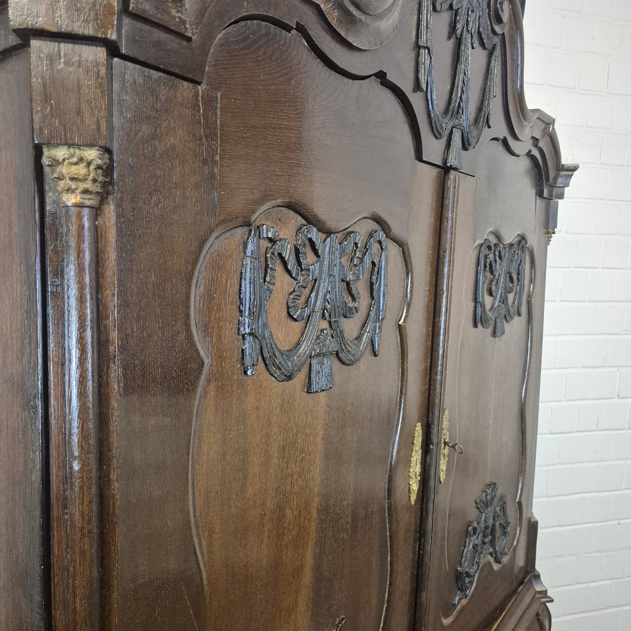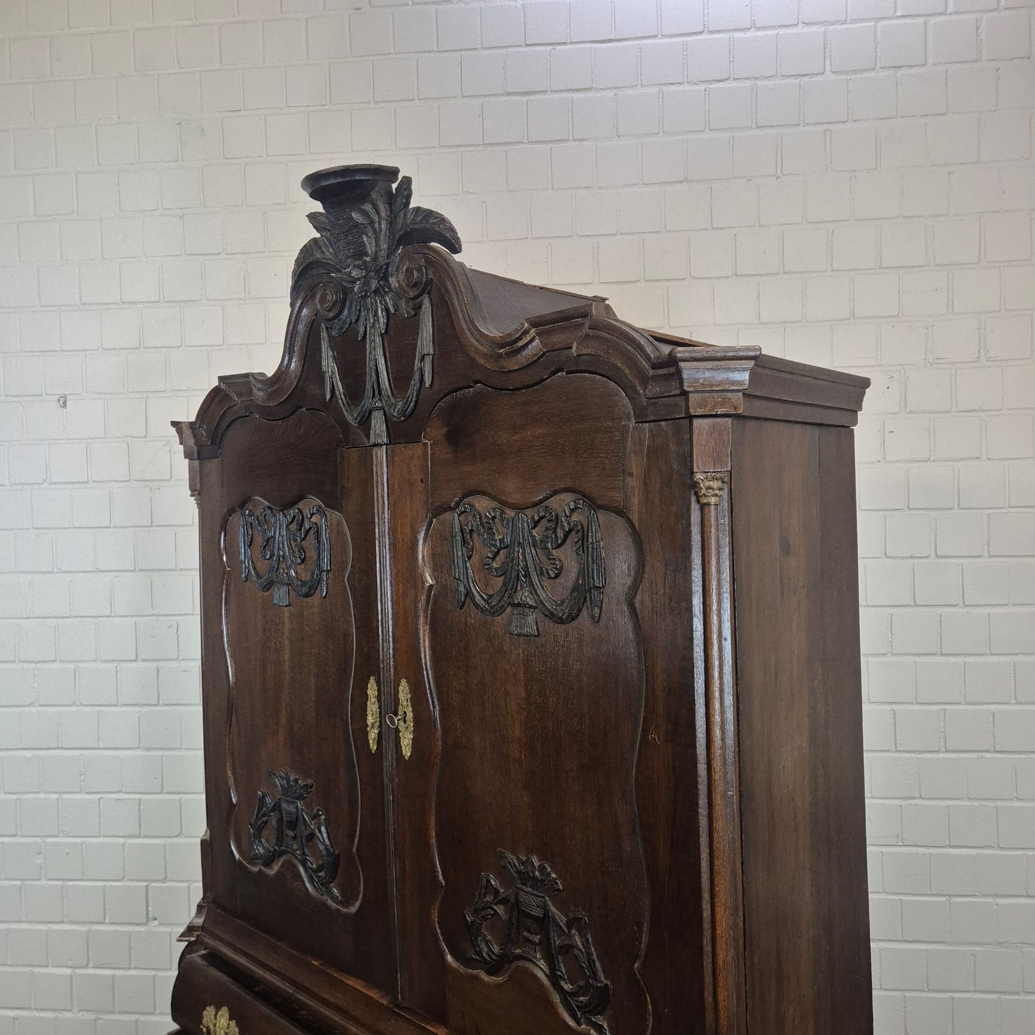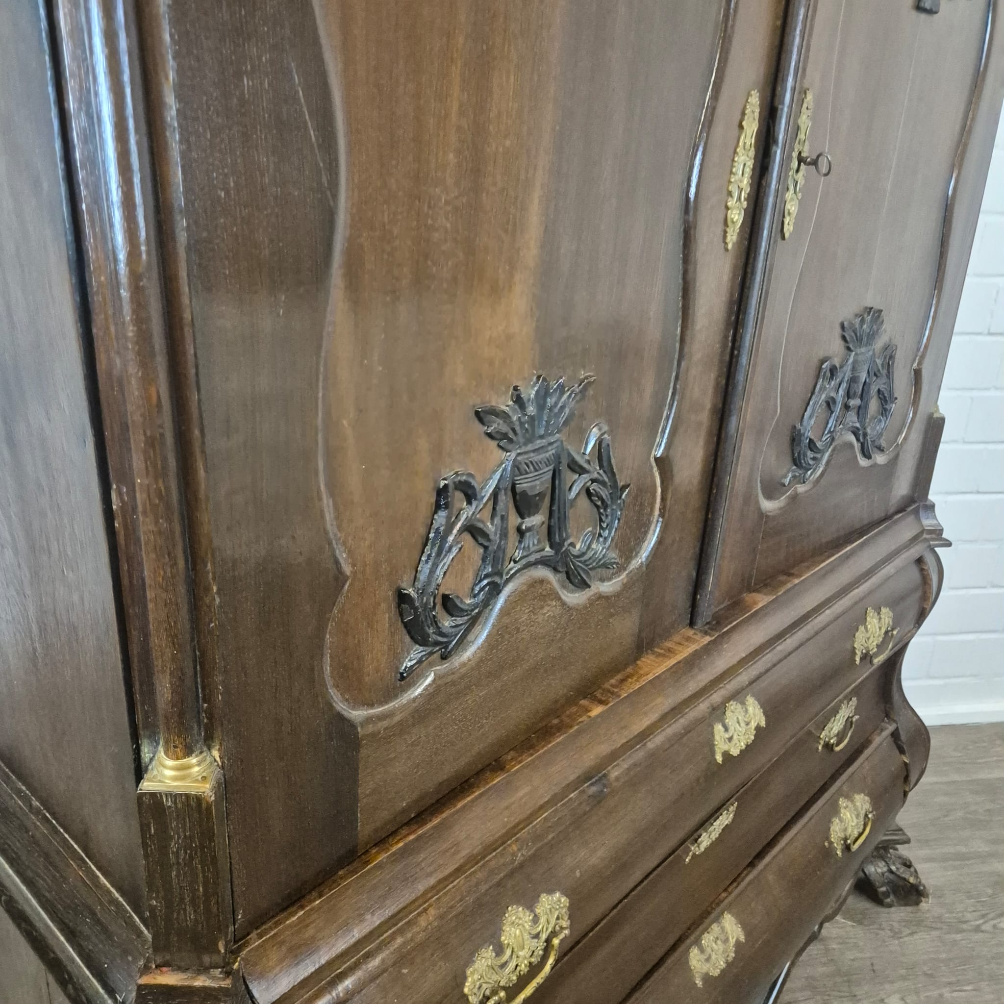 Gerestaureerde barok kast gemaakt van massief eiken (gewaxt) uit ca. 1770. De kast is in een goede staat en heeft lichte gebruikssporen. Demontabel (10-delig).