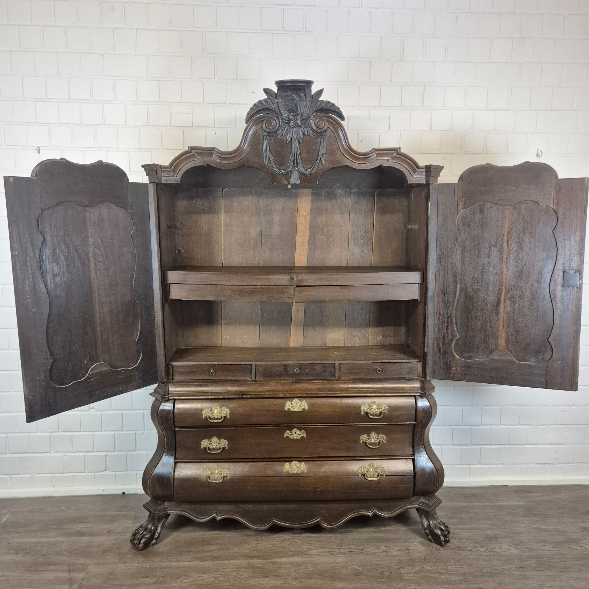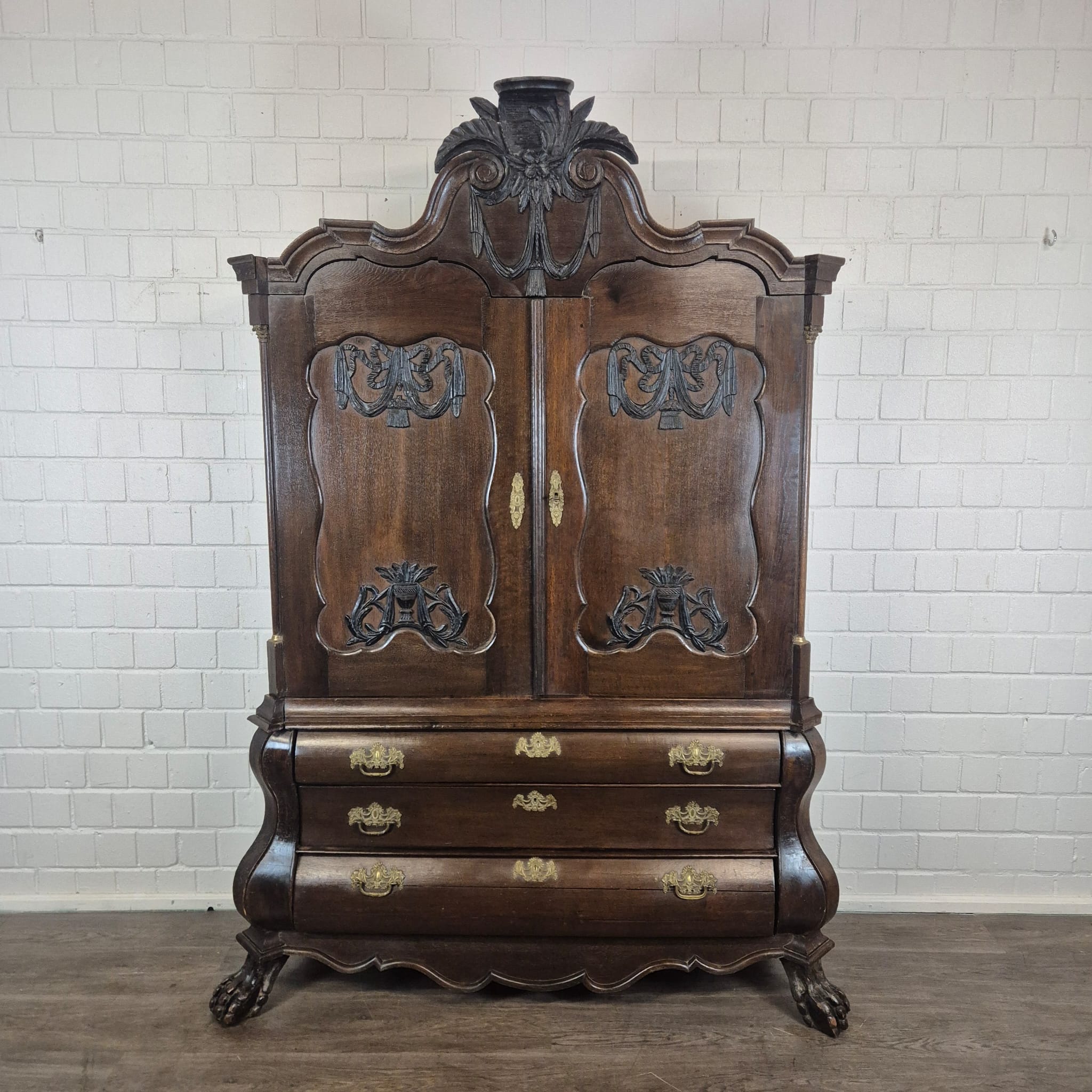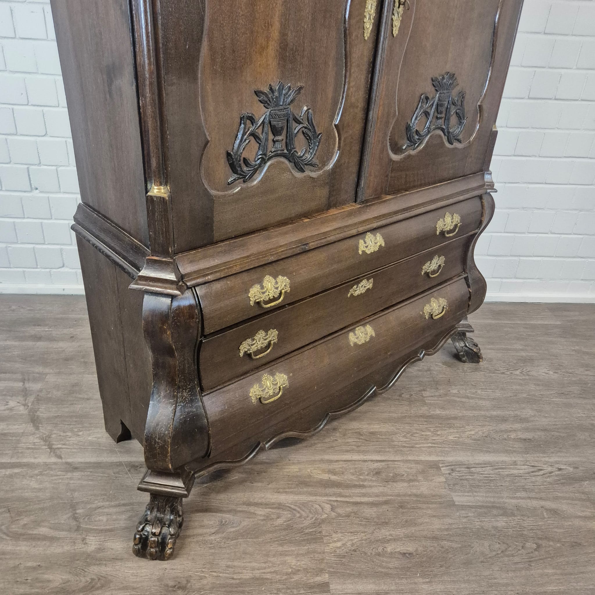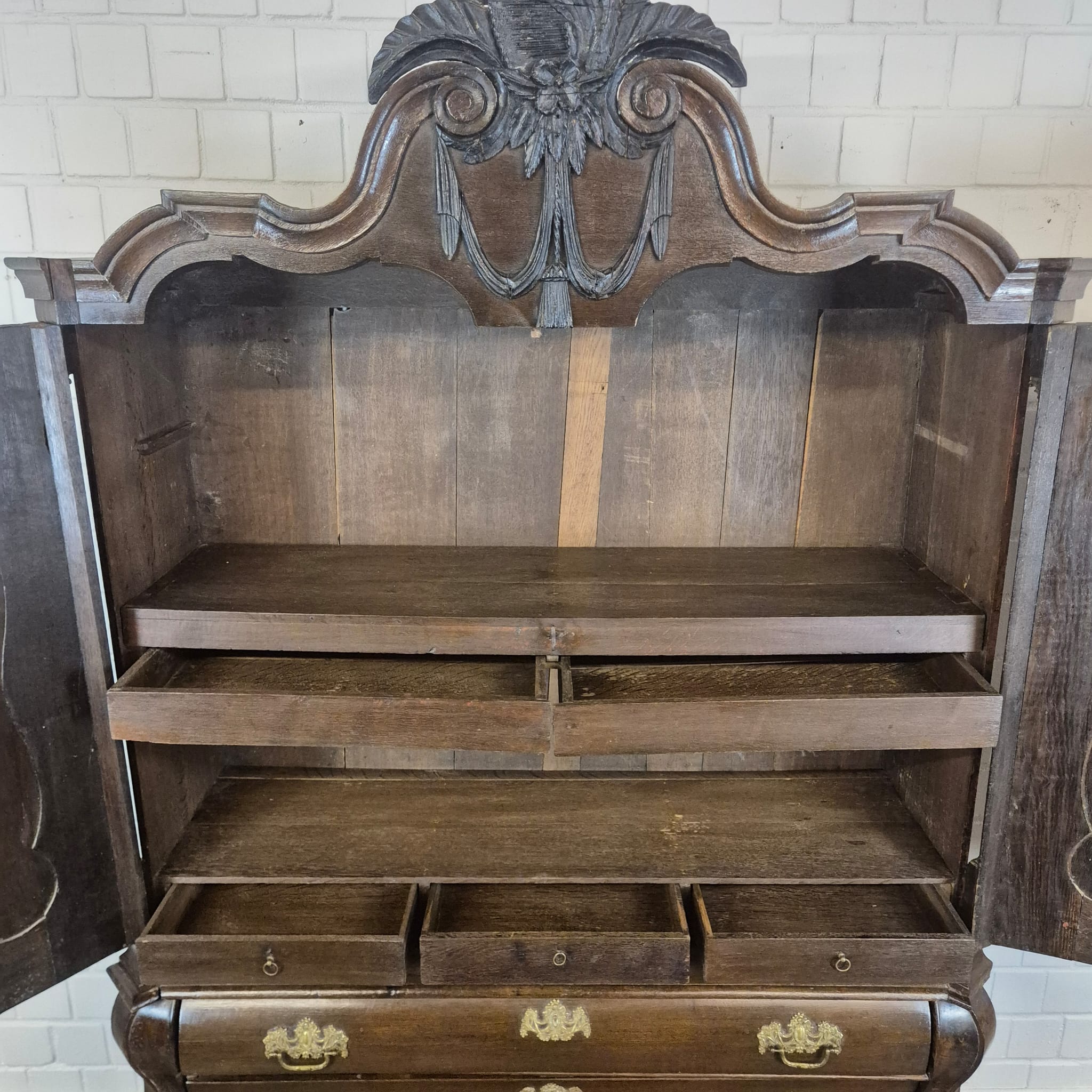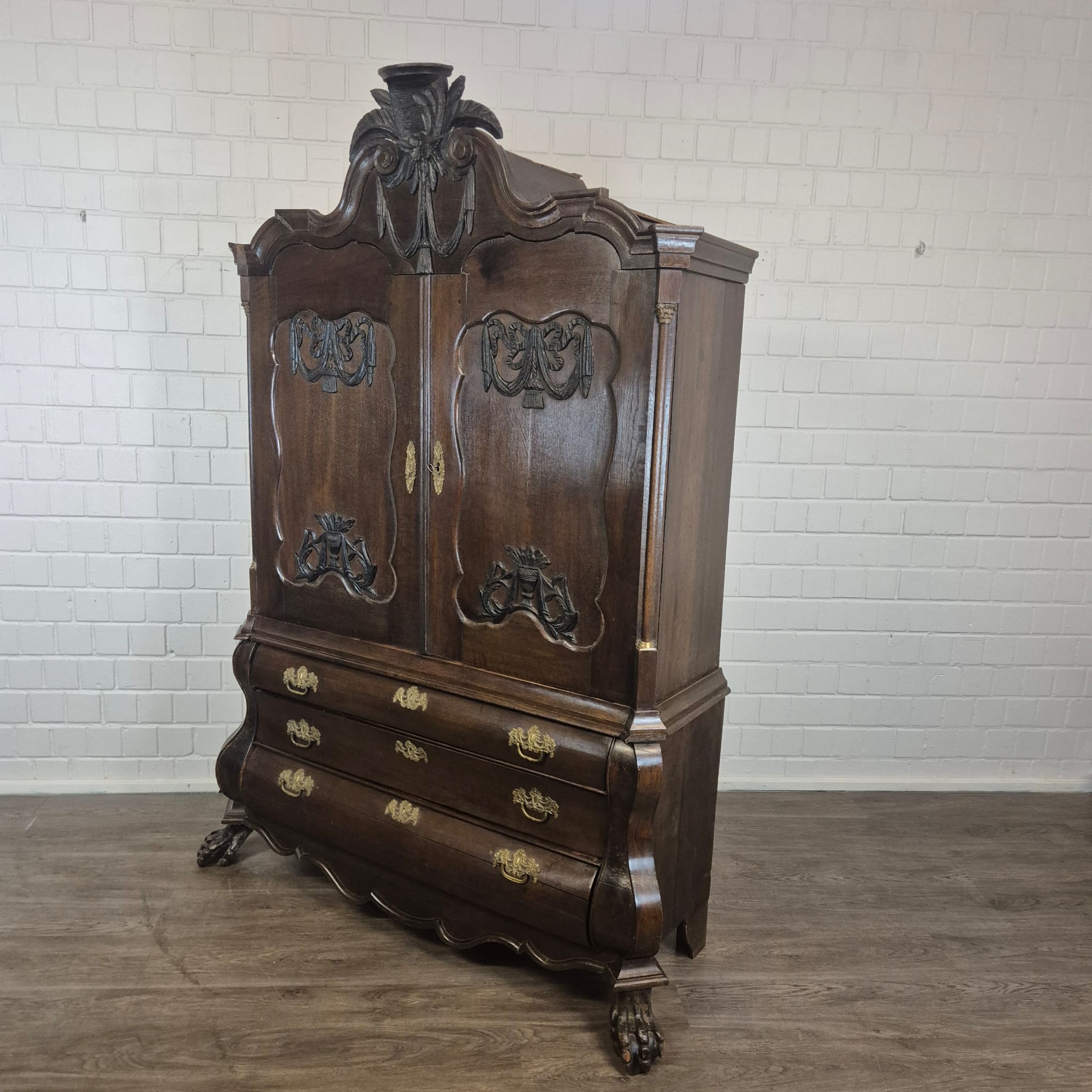 Gerestaureerde barok kast gemaakt van massief eiken (gewaxt) uit ca. 1770. De kast is in een goede staat en heeft lichte gebruikssporen. Demontabel (10-delig).