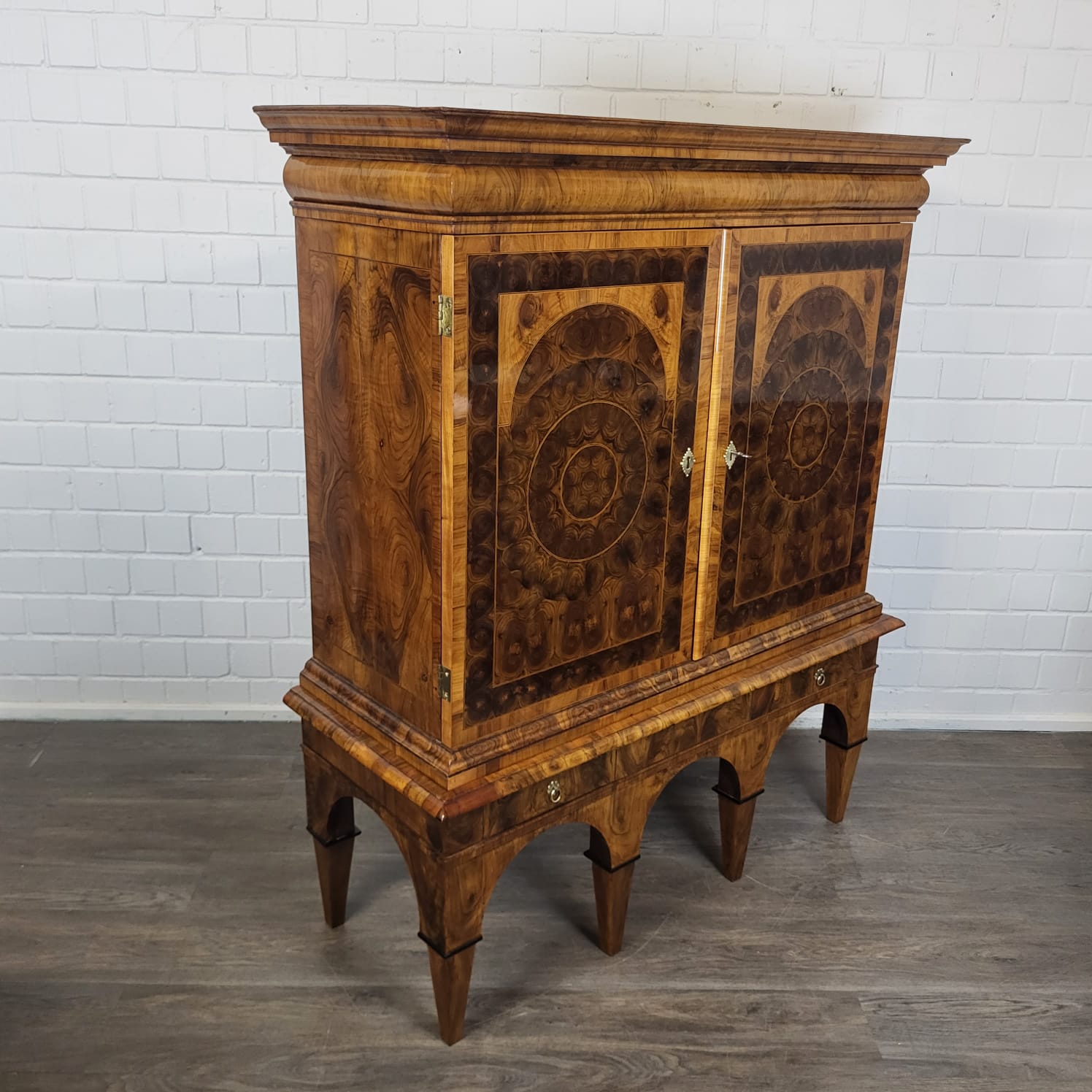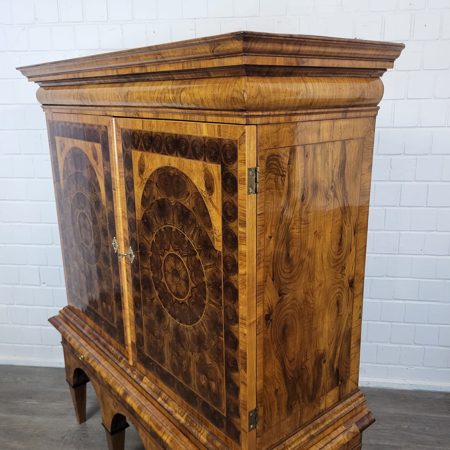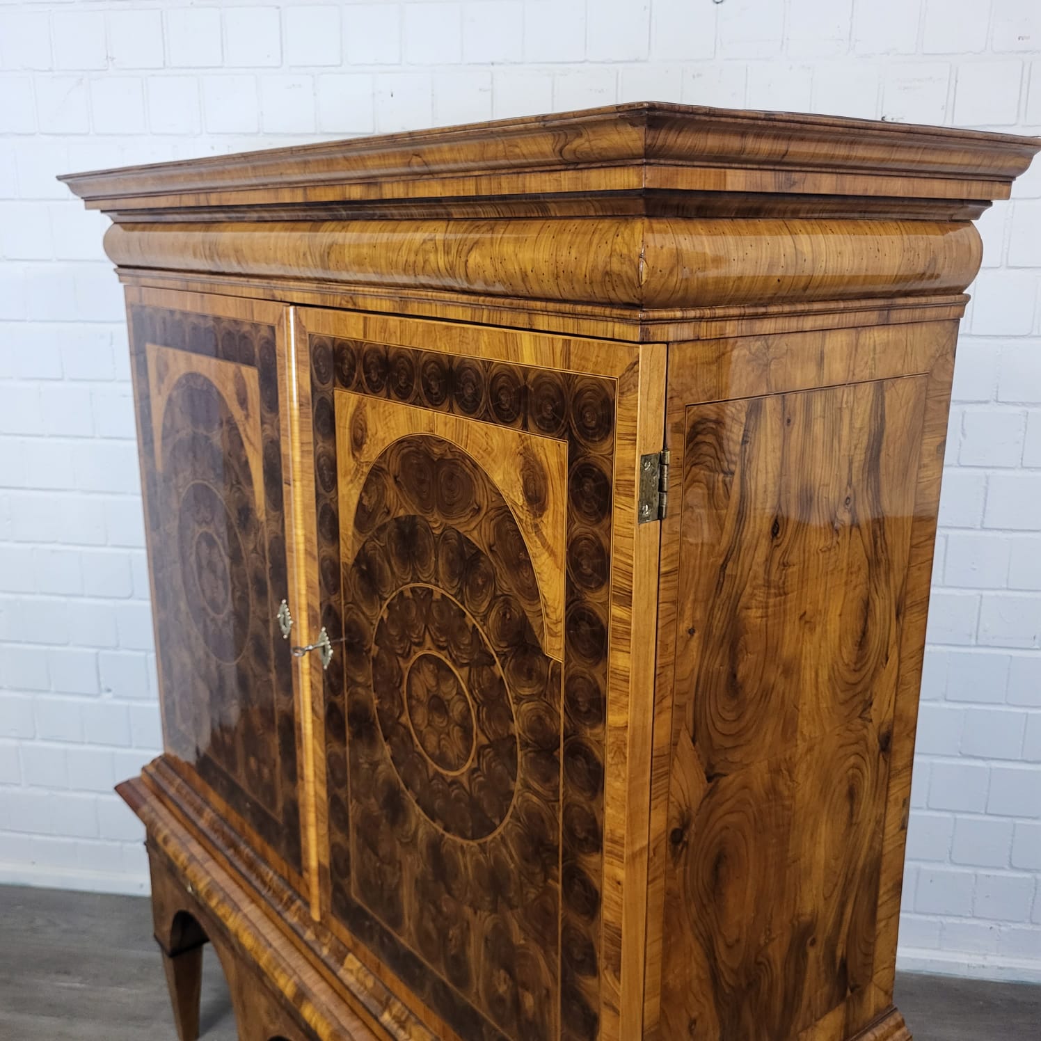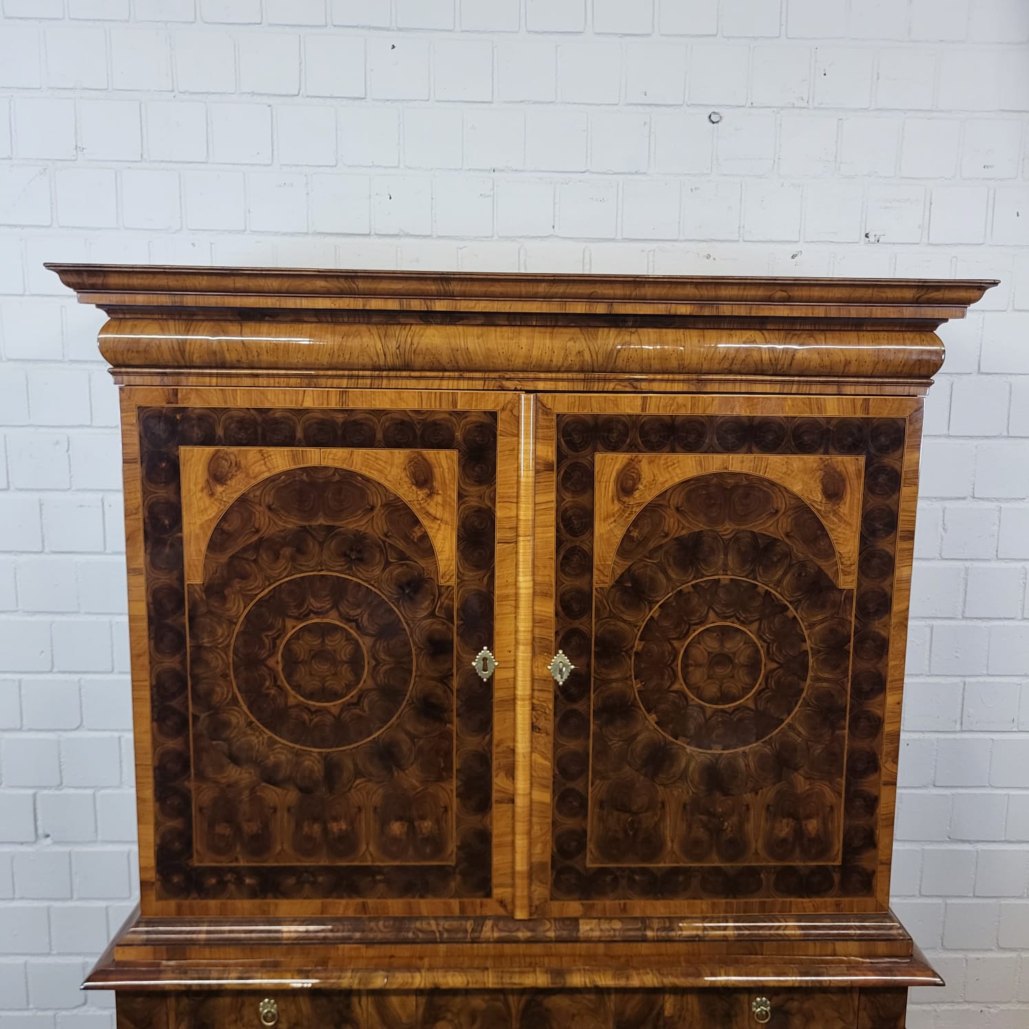 Gerestaureerde barok kast noten gefineerd en schellak gepolytourd uit ca. 1770. De ronde inlays accentueren de schoonheid van het hout nog beter. De kast, inclusief onderstel, is in zeer goede staat en vertoont slechts minimale gebruikssporen. Demontabel (2-delig).