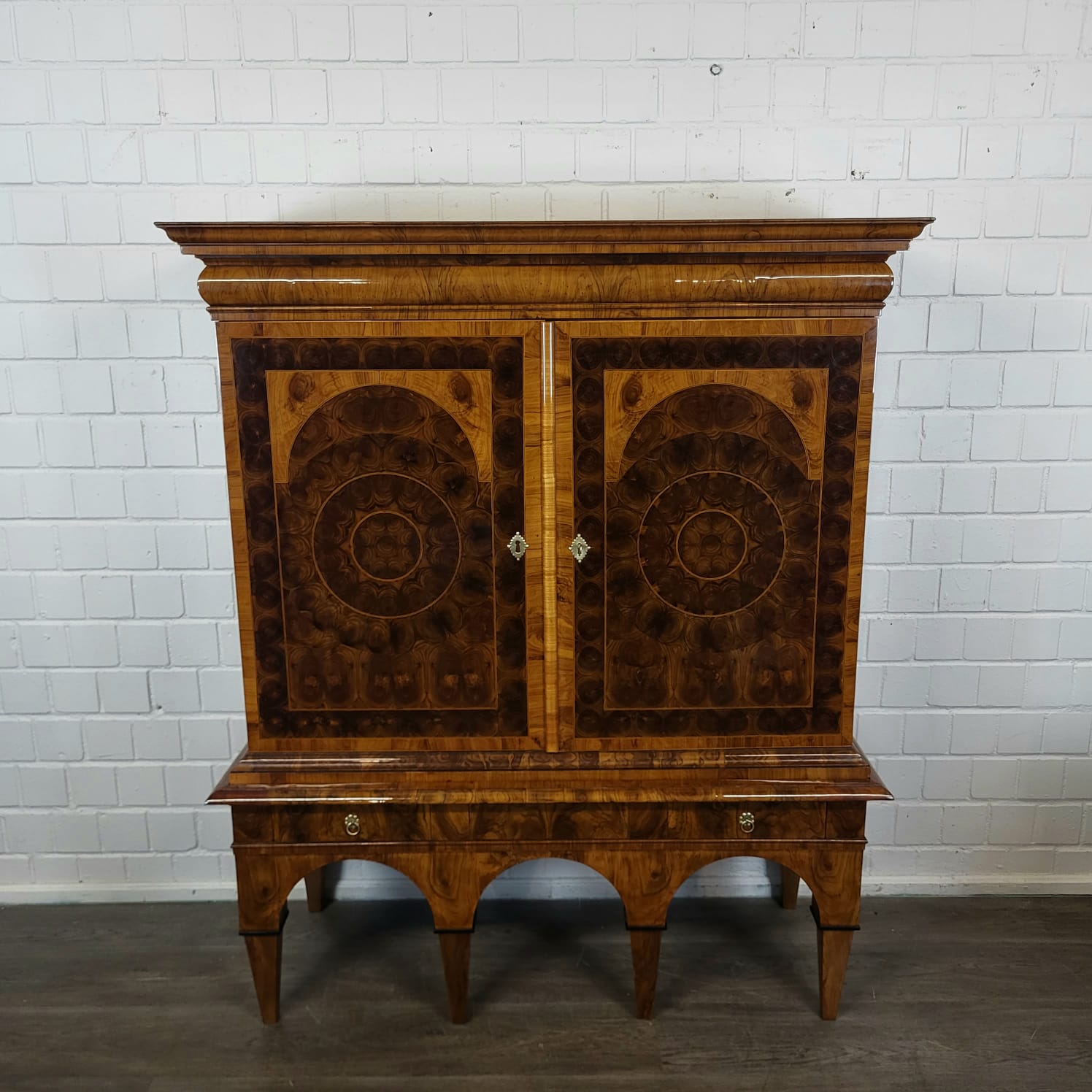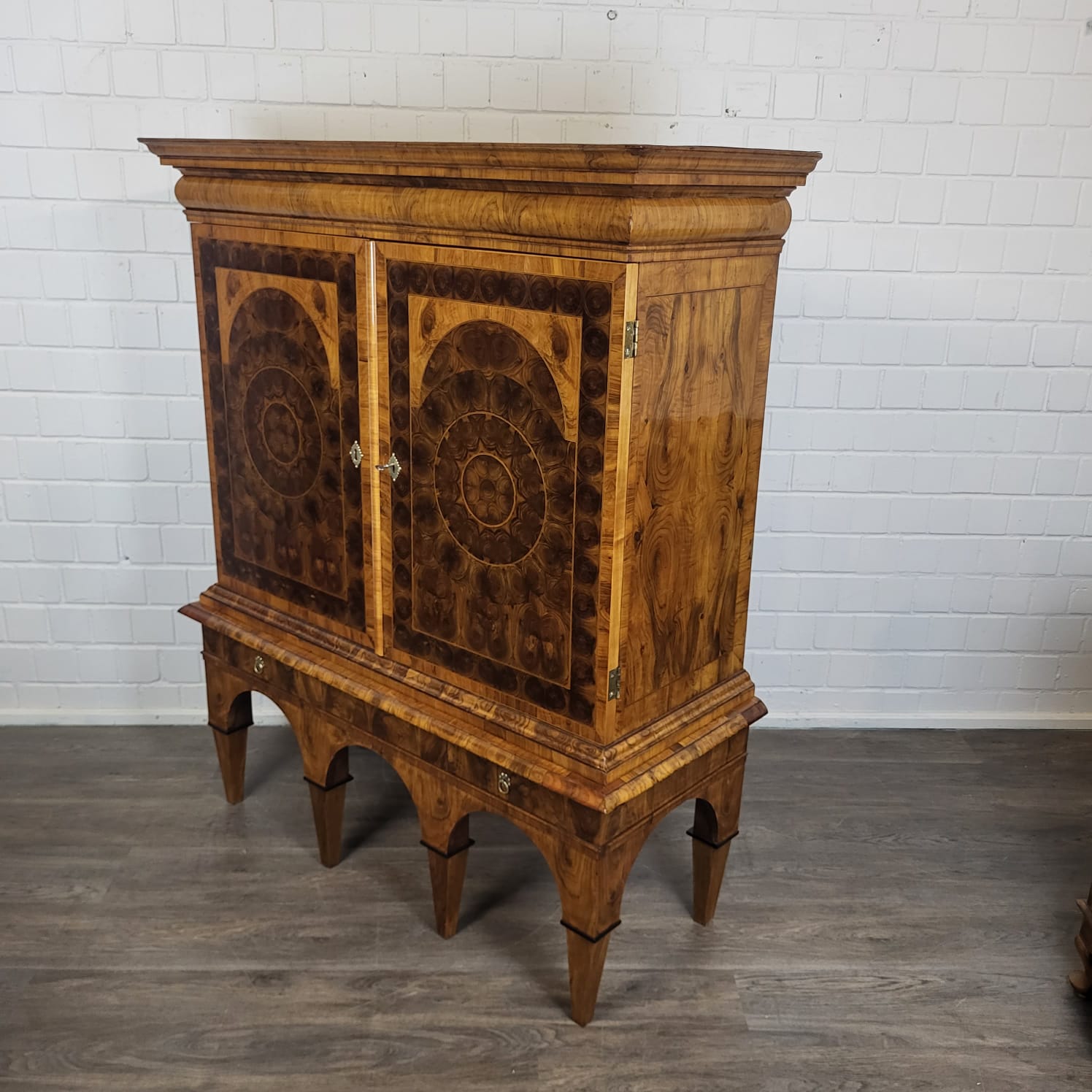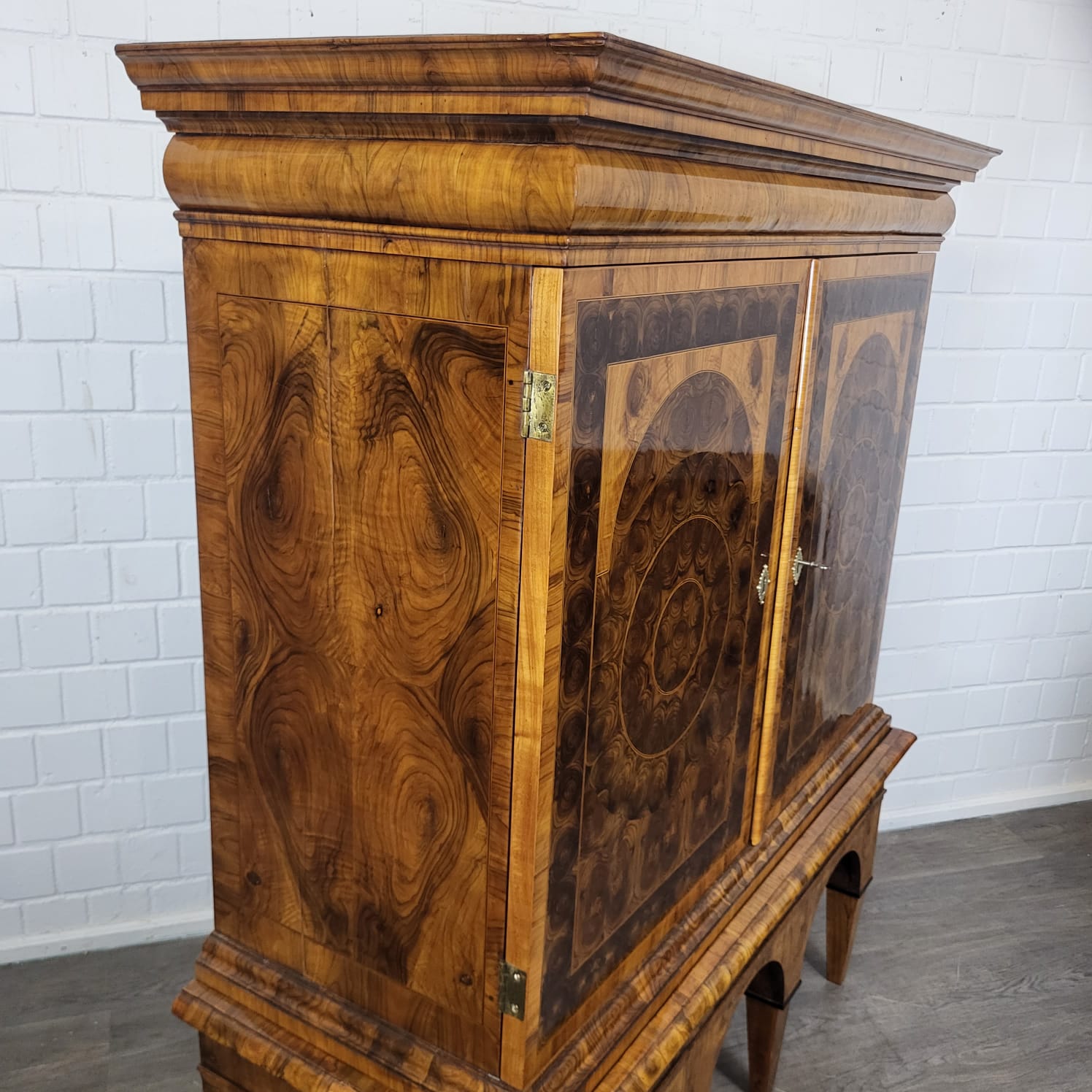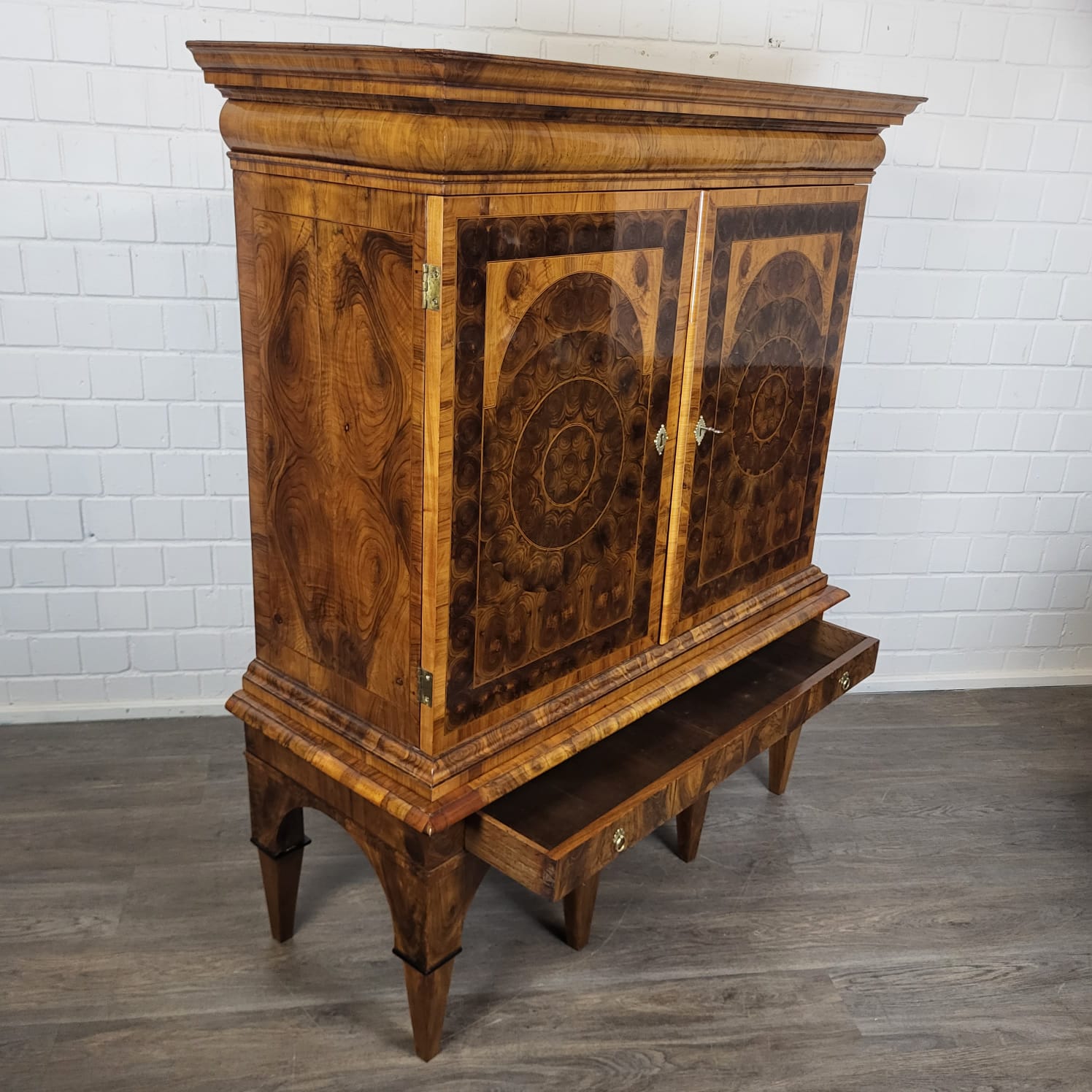 Gerestaureerde barok kast noten gefineerd en schellak gepolytourd uit ca. 1770. De ronde inlays accentueren de schoonheid van het hout nog beter. De kast, inclusief onderstel, is in zeer goede staat en vertoont slechts minimale gebruikssporen. Demontabel (2-delig).