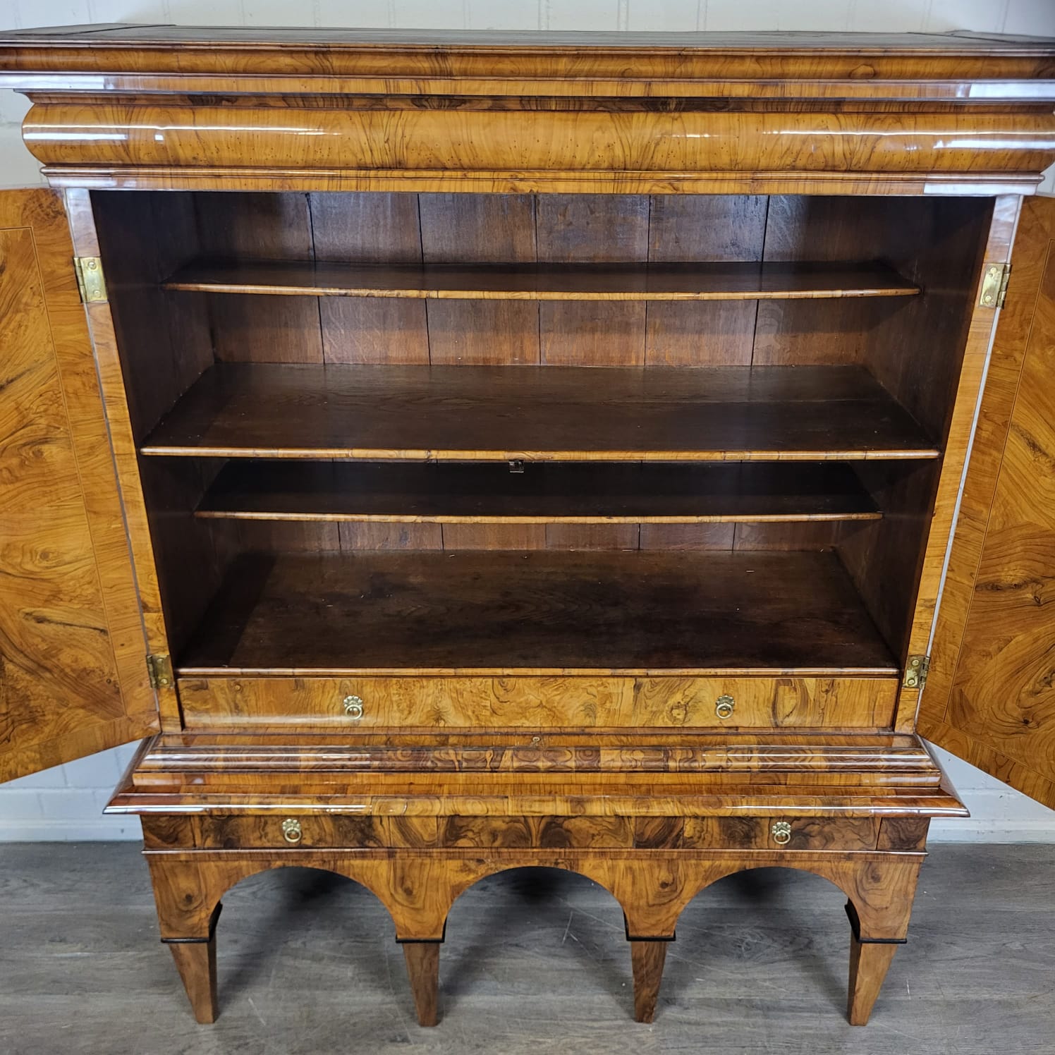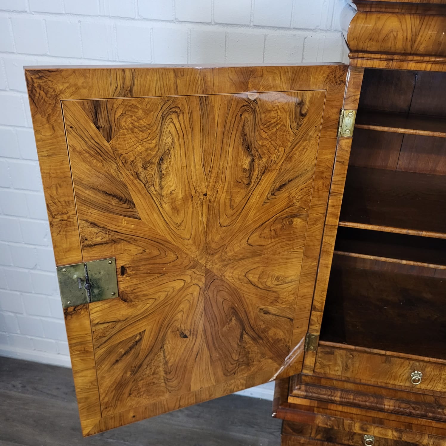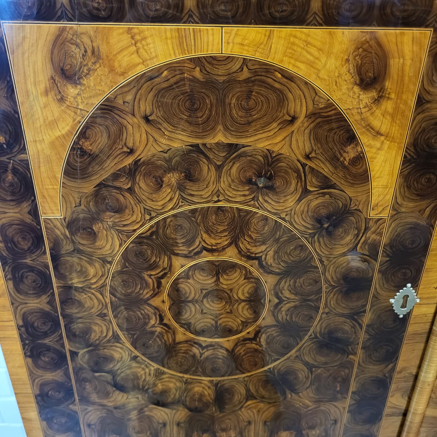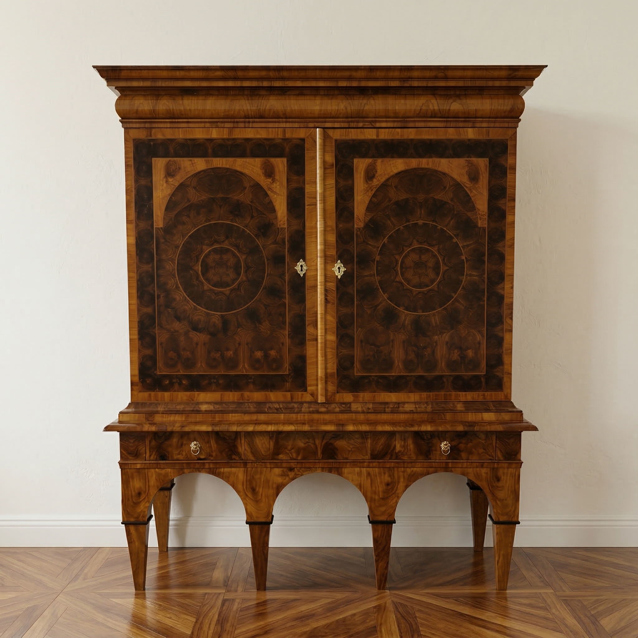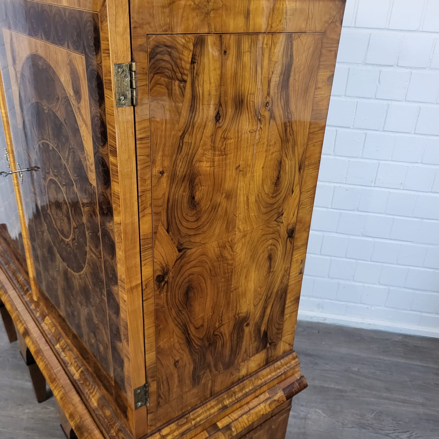 Gerestaureerde barok kast noten gefineerd en schellak gepolytourd uit ca. 1770. De ronde inlays accentueren de schoonheid van het hout nog beter. De kast, inclusief onderstel, is in zeer goede staat en vertoont slechts minimale gebruikssporen. Demontabel (2-delig).