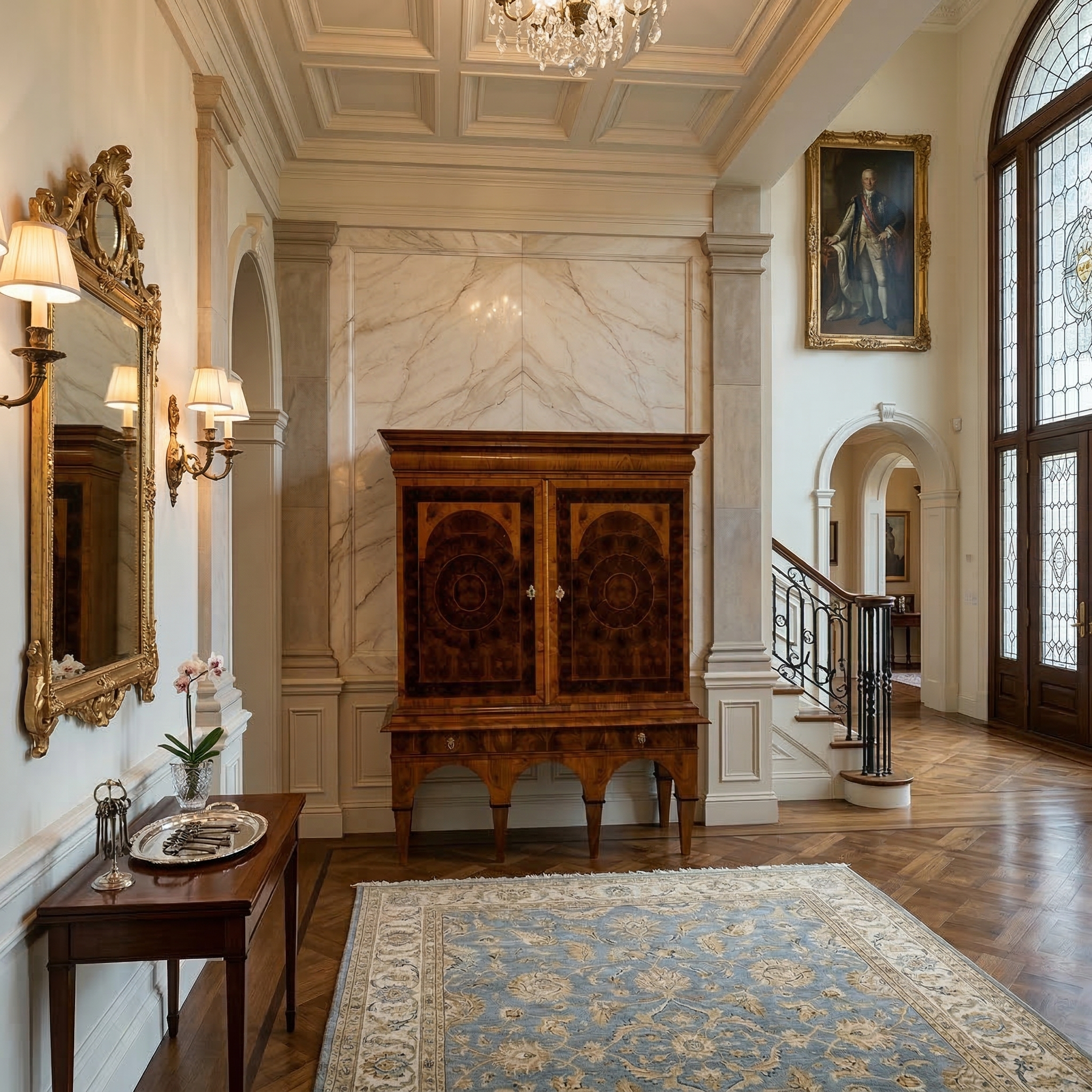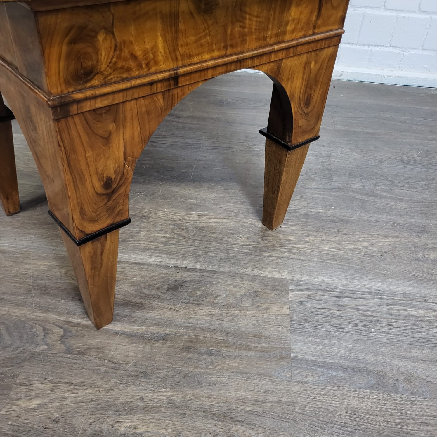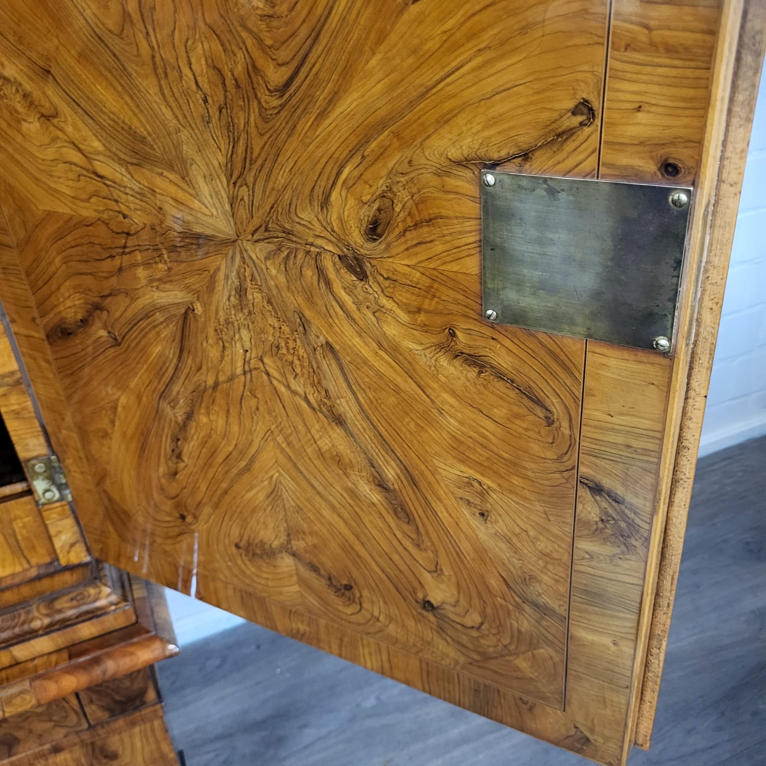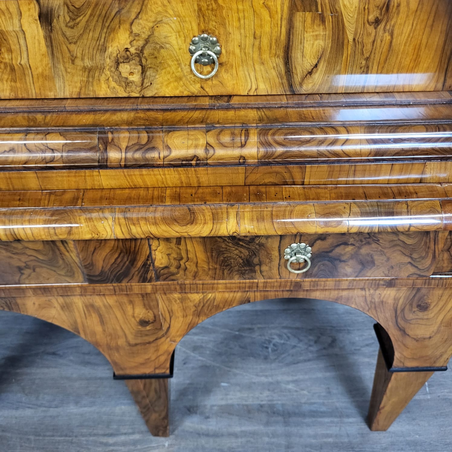 Gerestaureerde barok kast noten gefineerd en schellak gepolytourd uit ca. 1770. De ronde inlays accentueren de schoonheid van het hout nog beter. De kast, inclusief onderstel, is in zeer goede staat en vertoont slechts minimale gebruikssporen. Demontabel (2-delig).