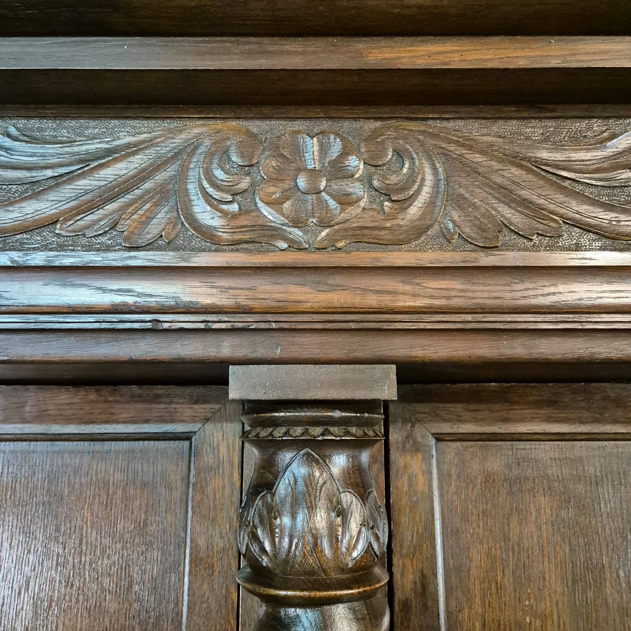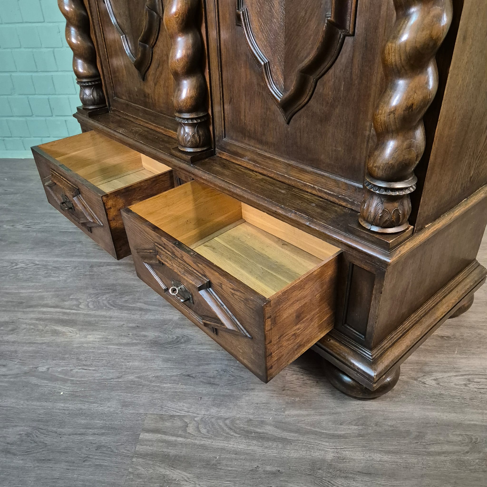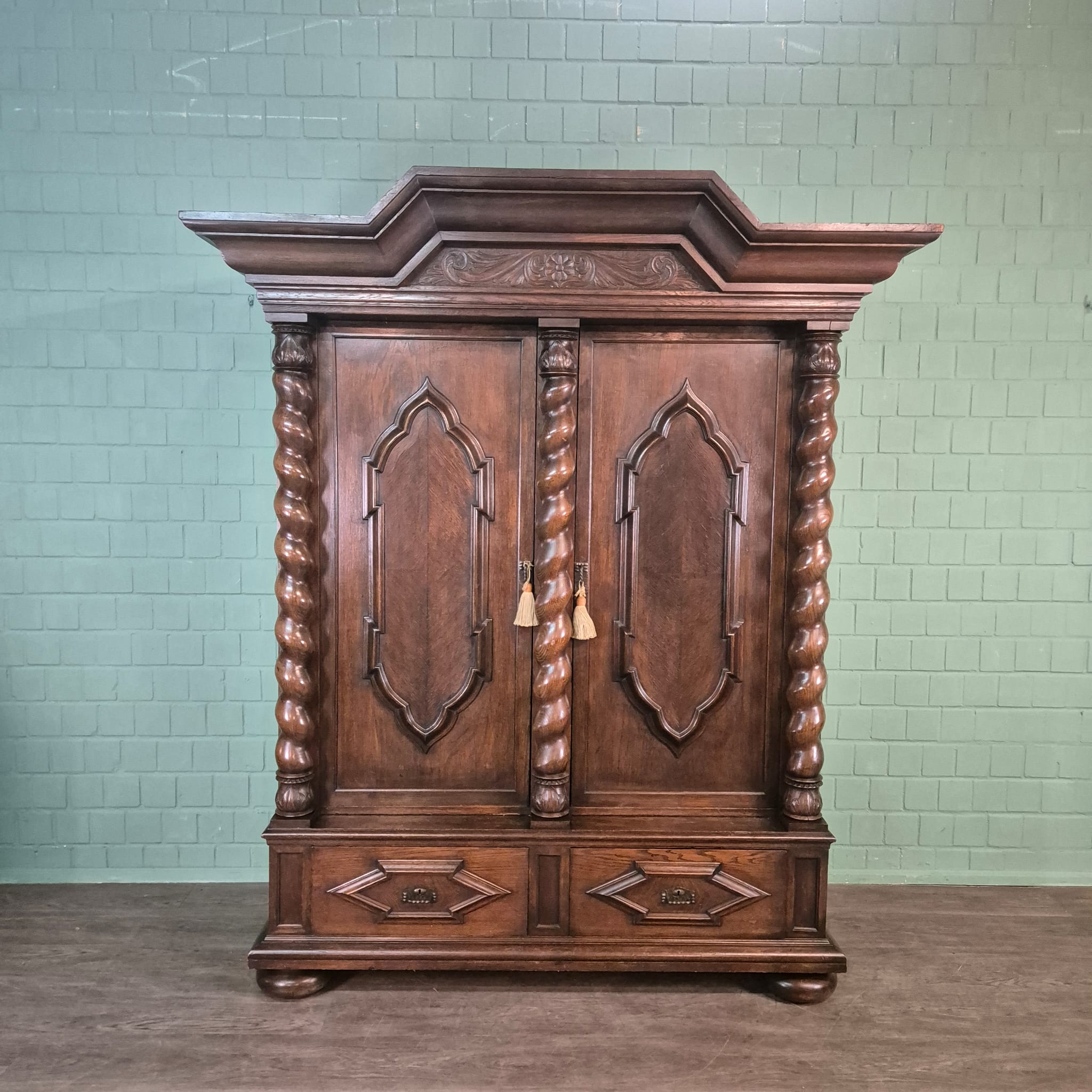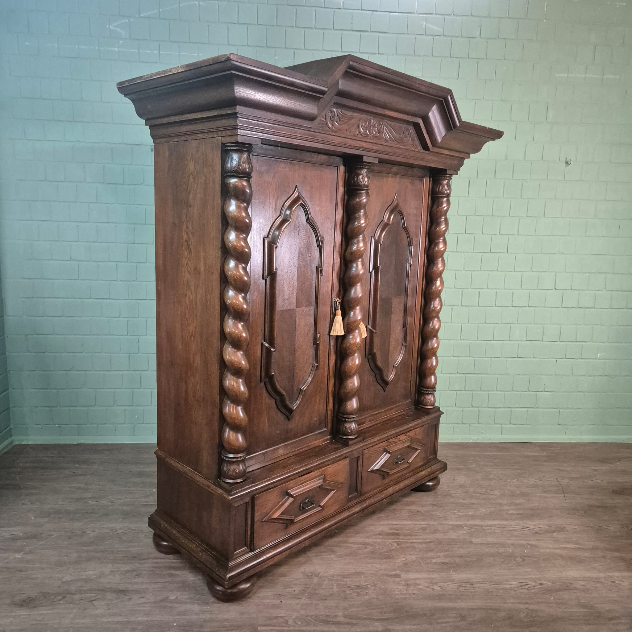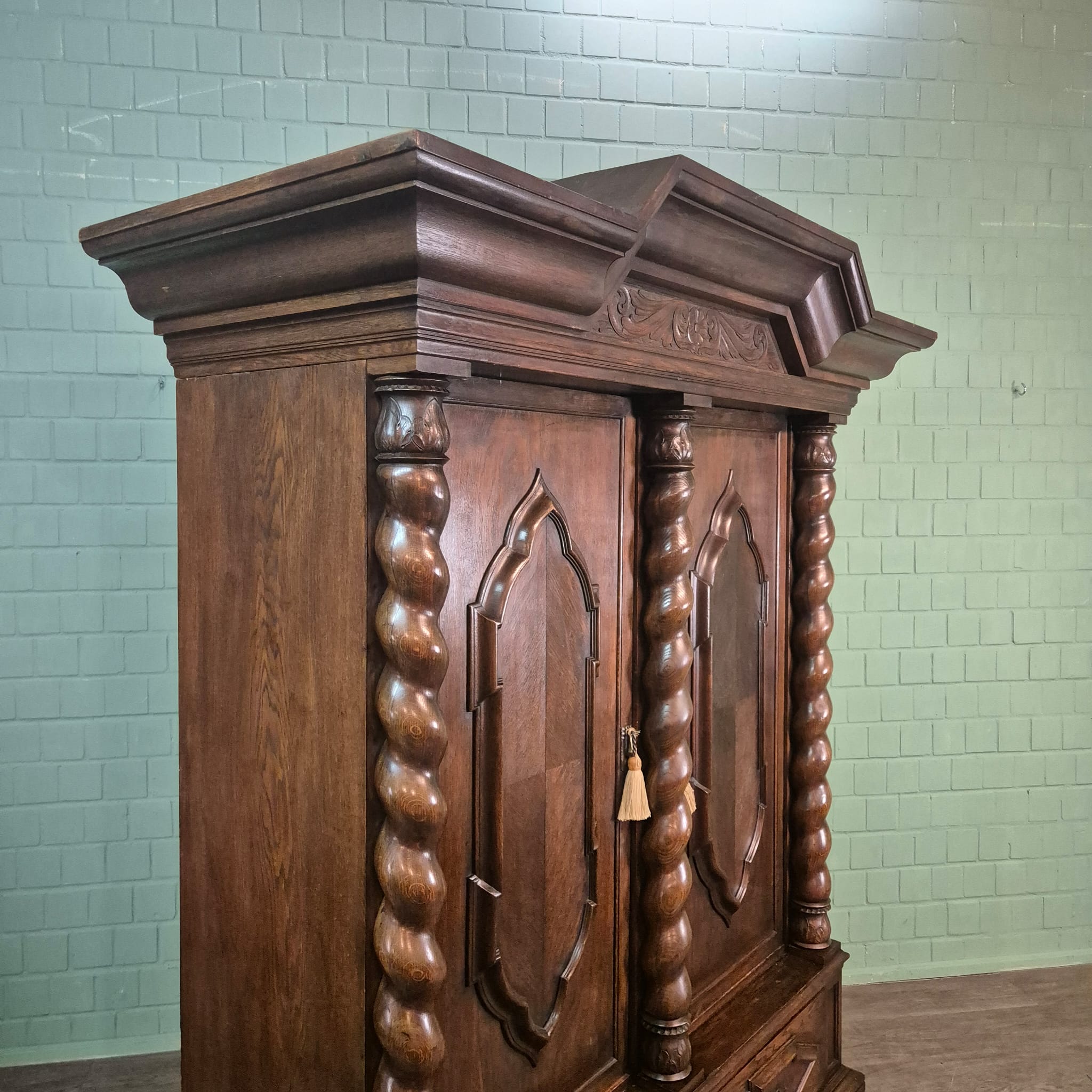 Gerestaureerde neo-barok kledingkast gemaakt van massief eiken (gewaxt) uit ca. 1910. De kledingkast is in een zeer goede staat en heeft minimale gebruikssporen. Demontabel (8-delig).