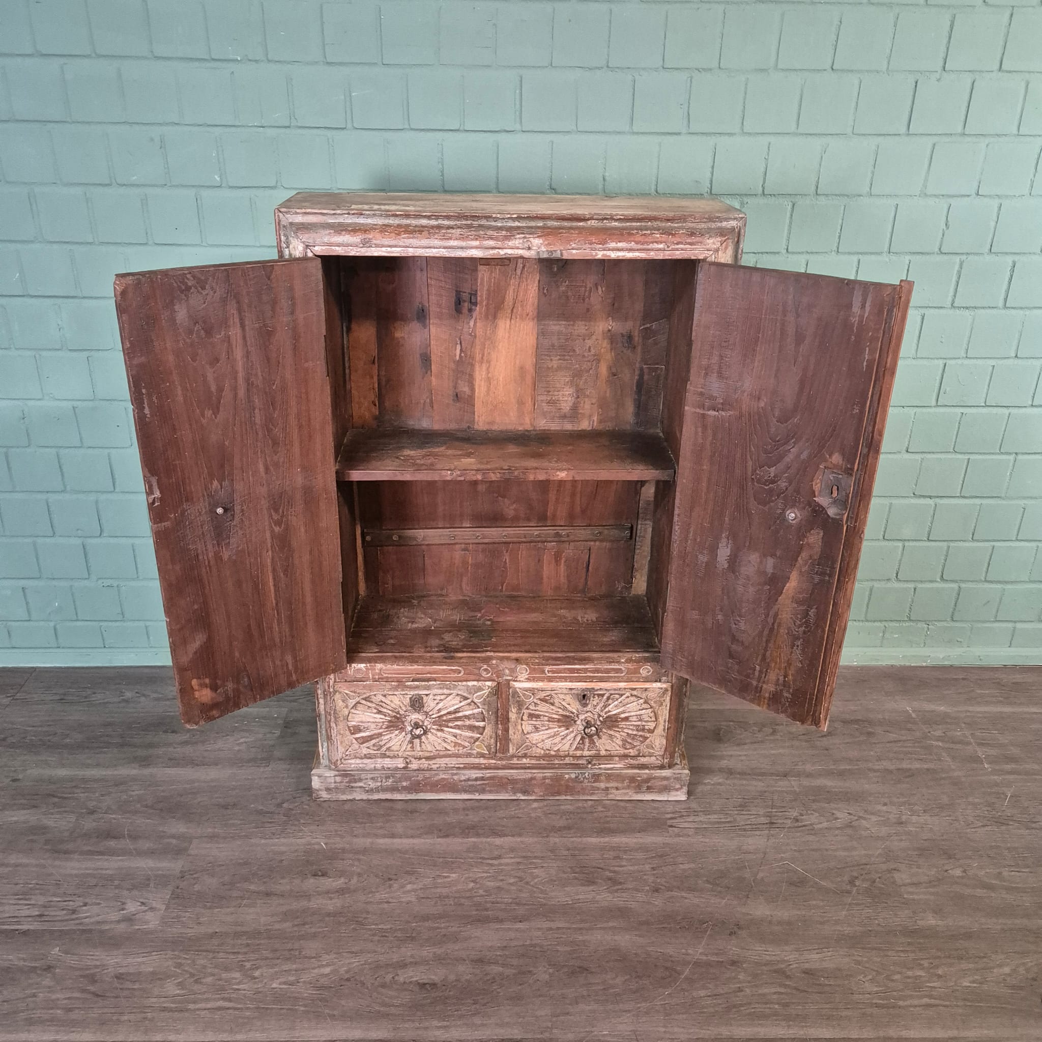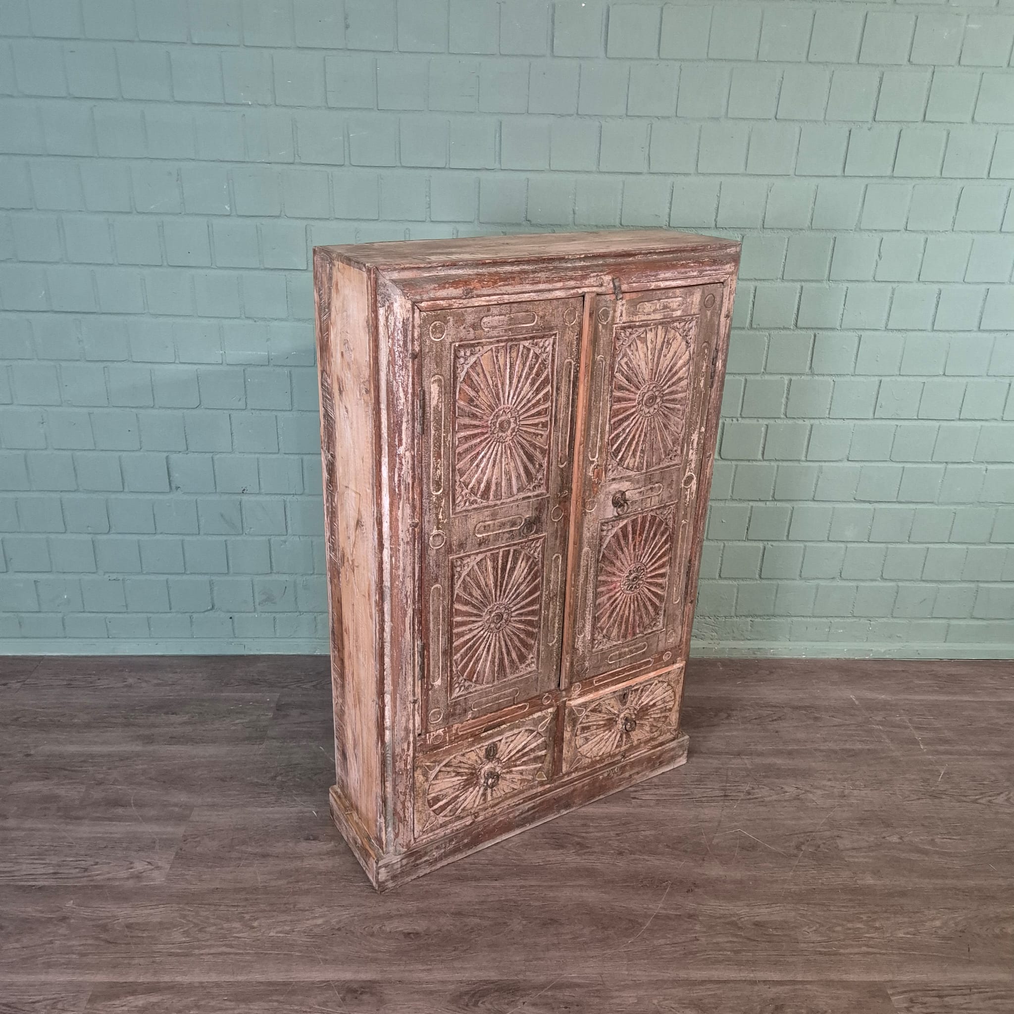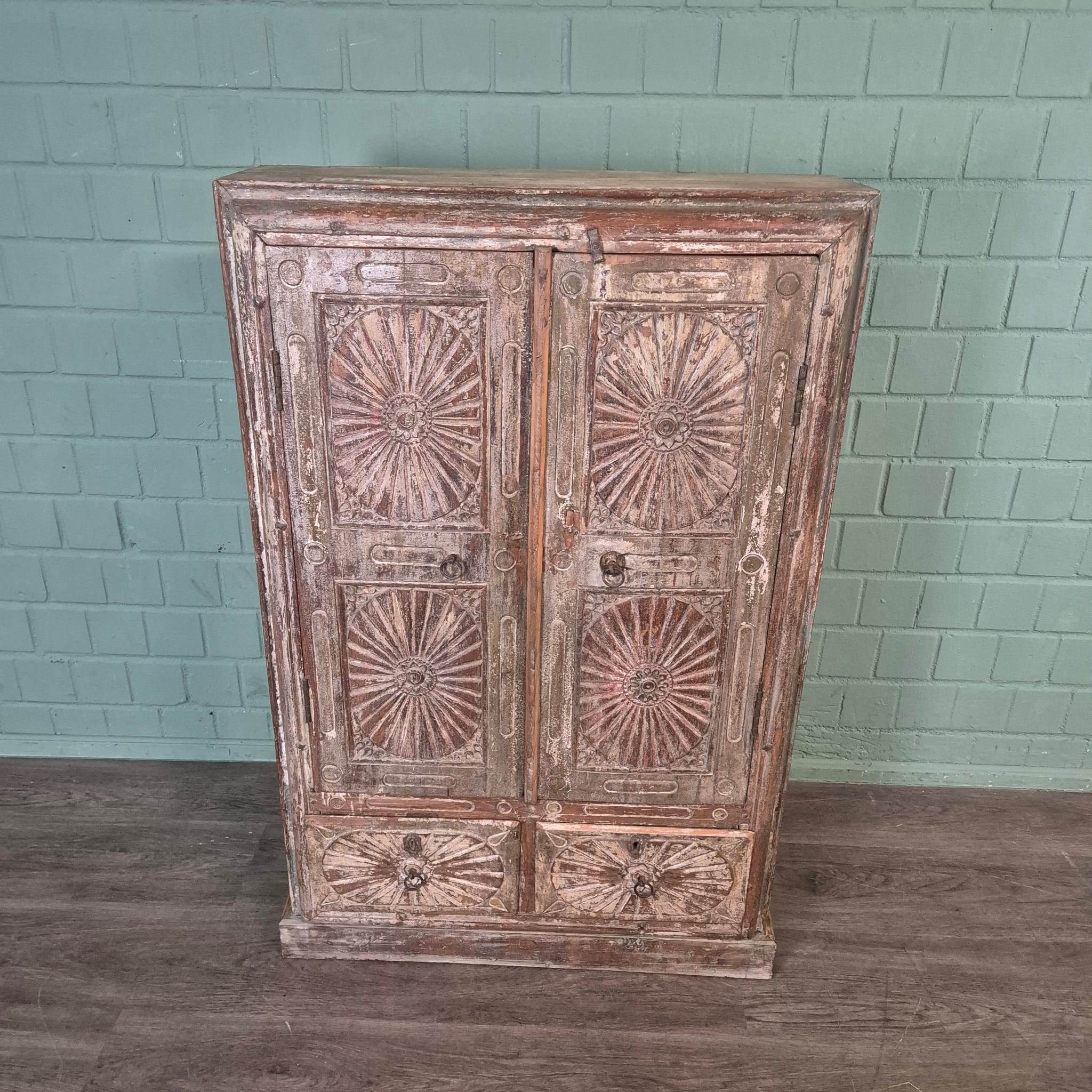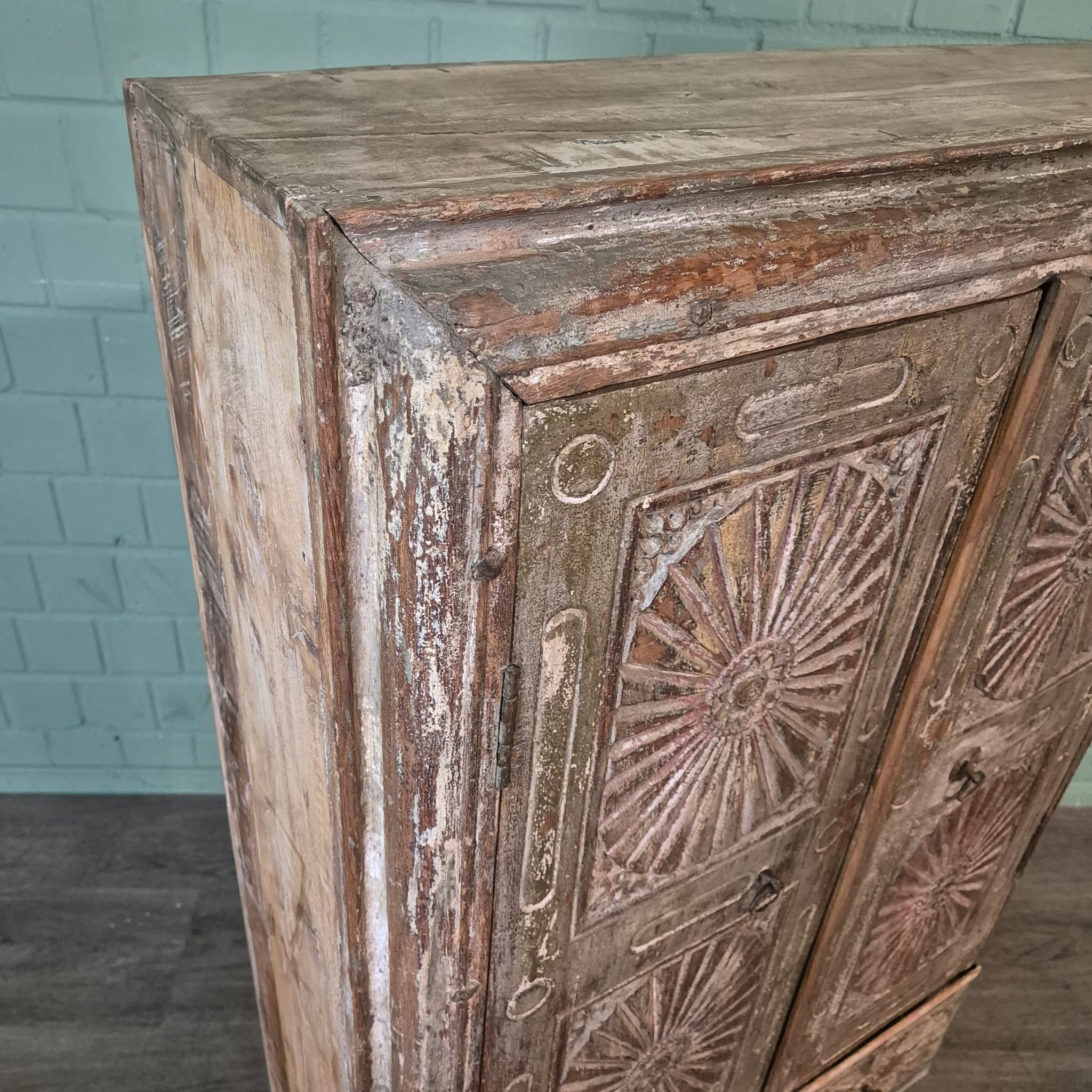Bijzonderheden – Sierlijk houtsnijwerk: Het ingewikkelde, ronde houtsnijwerk op de deurfronten is een absolute highlight. Deze zon- of stervormige patronen geven de kast een unieke textuur en een bijzondere etnische of koloniale touch die hem onderscheidt van gewone meubels. De handgrepen zijn eenvoudig en passen harmonieus bij het algehele ontwerp.