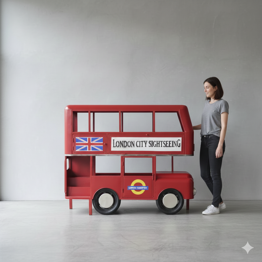 Origineel ontworpen kast in de vorm van een Londense dubbeldekker. Gemaakt van metaal.
