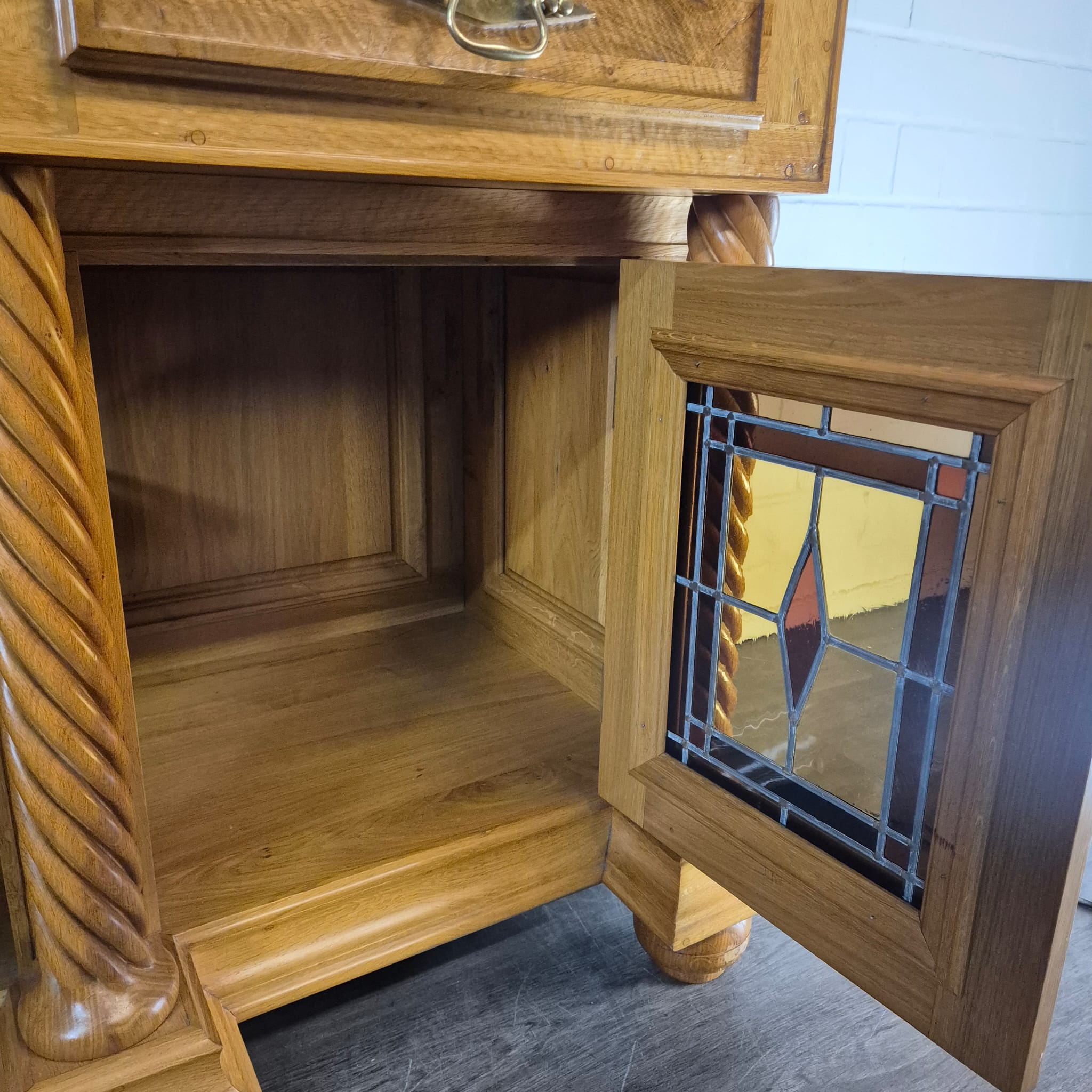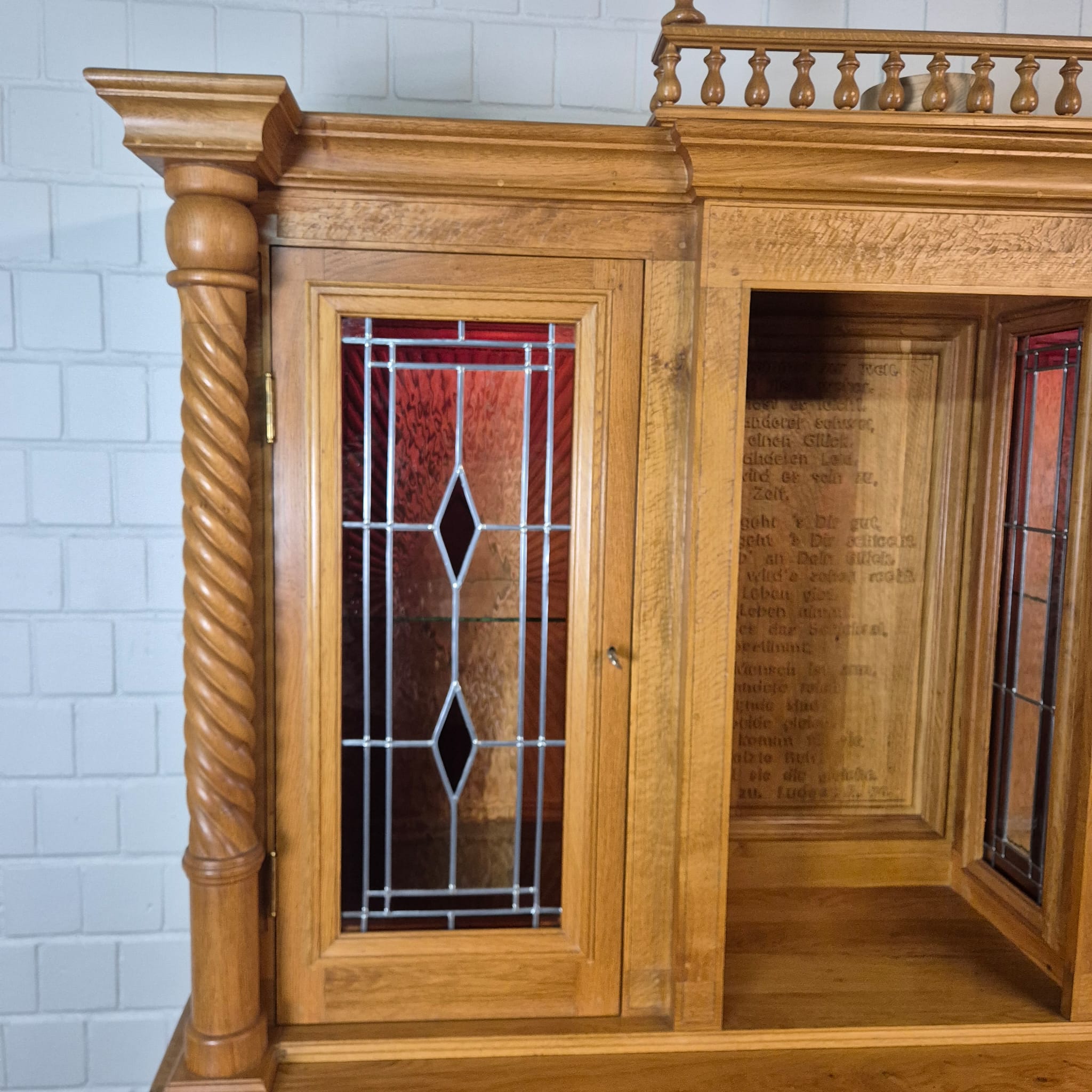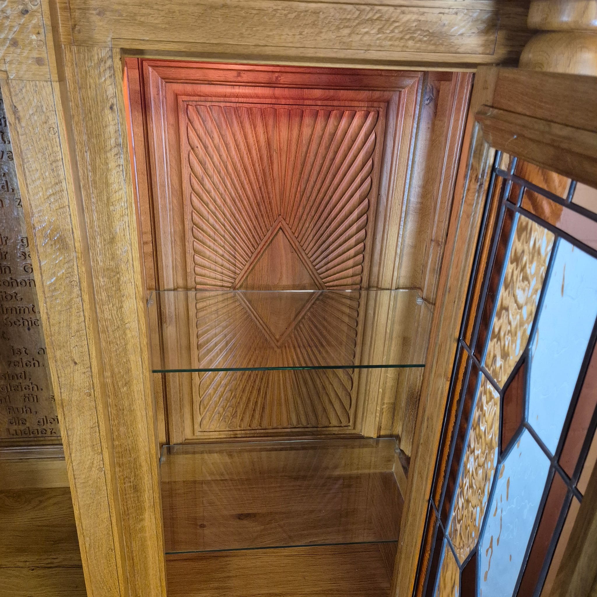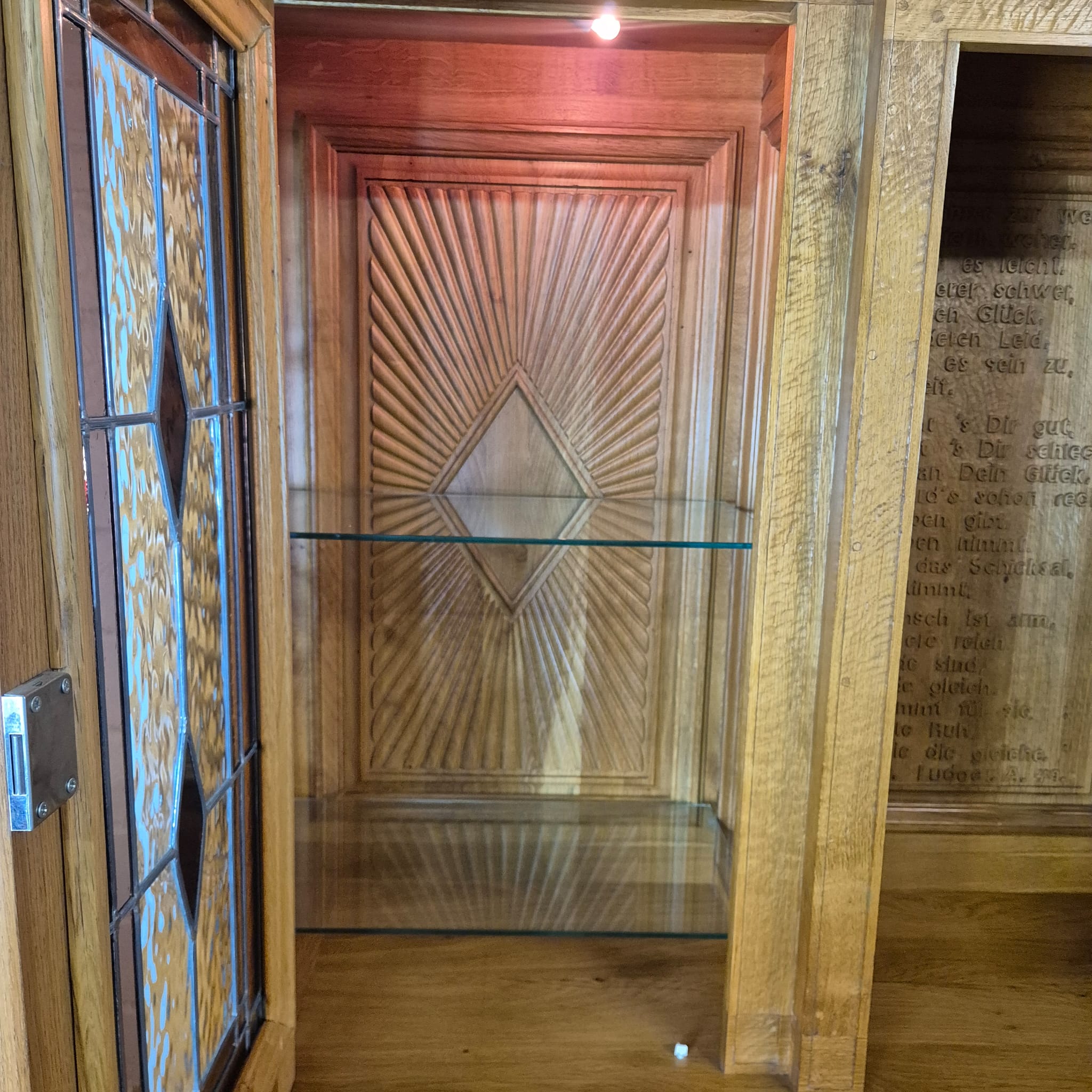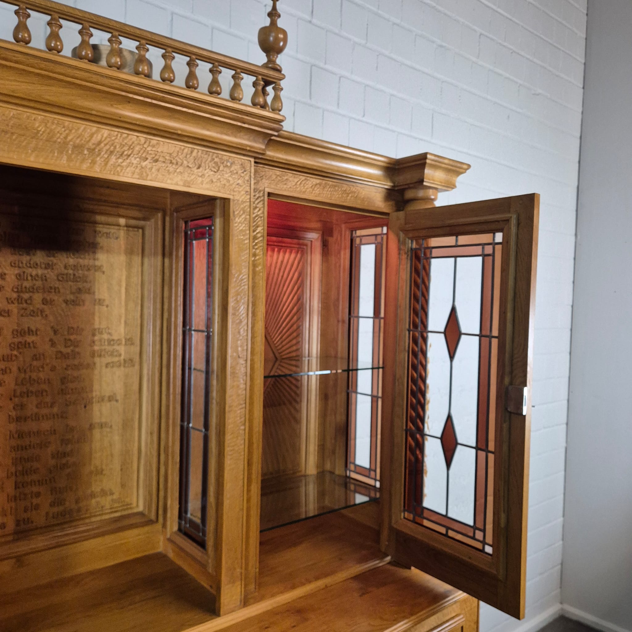 Originele kast uit een sacristie, gemaakt van massief eikenhout (gelakt) uit 1949. De kast, met glas-in-loodramen, is in zeer goede staat en vertoont slechts minimale gebruikssporen. De kast is demonteerbaar in twee delen. Op het centrale houten paneel van de kast staat het volgende opschrift: