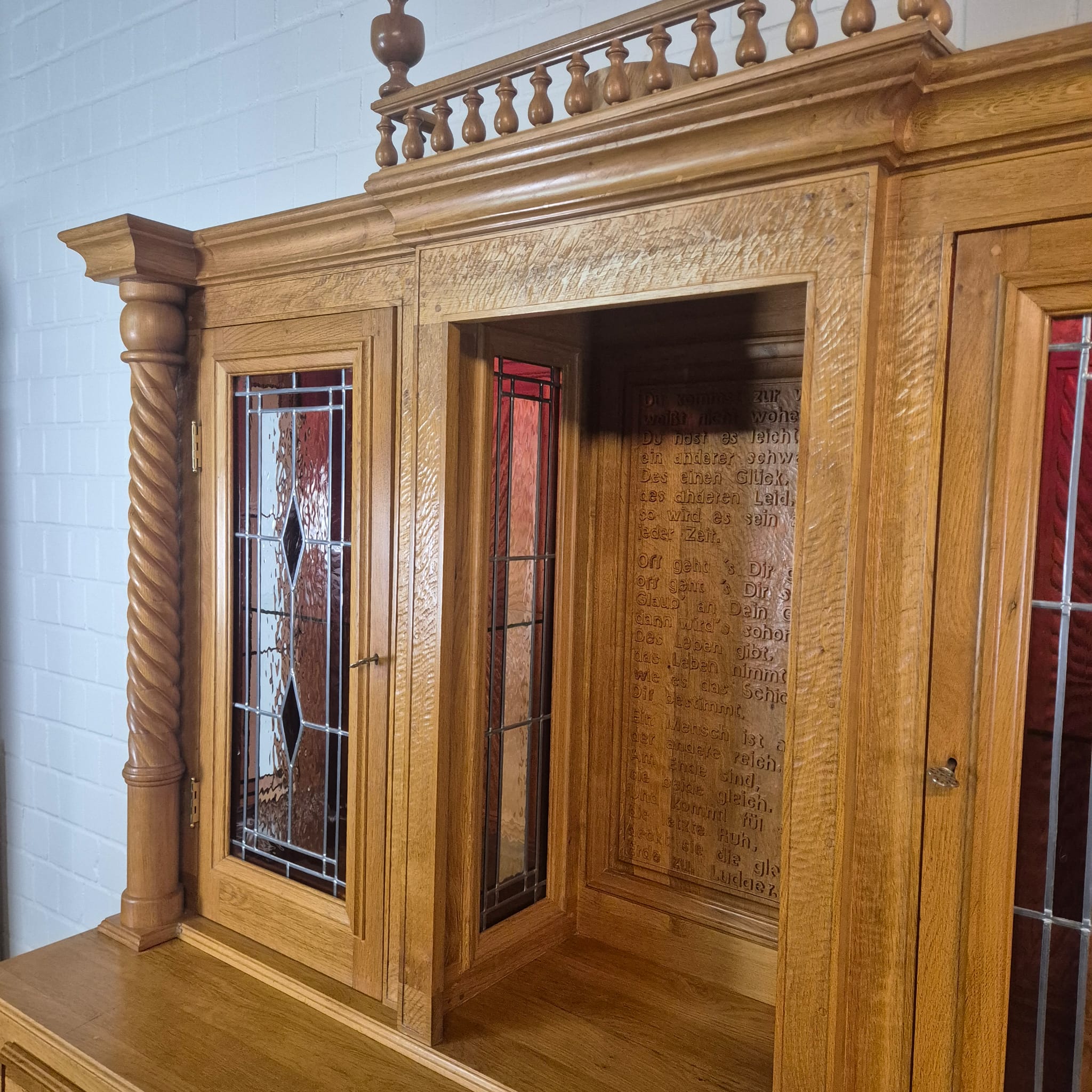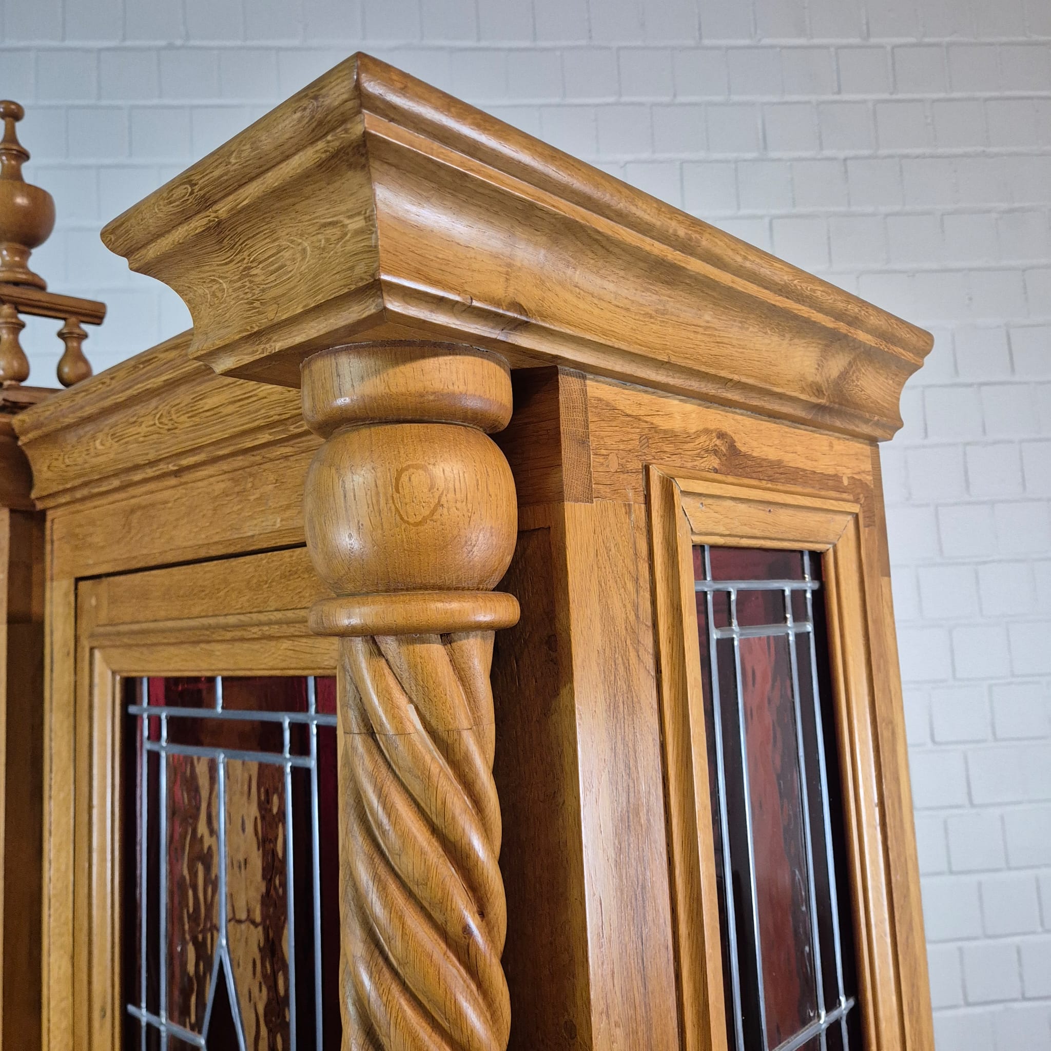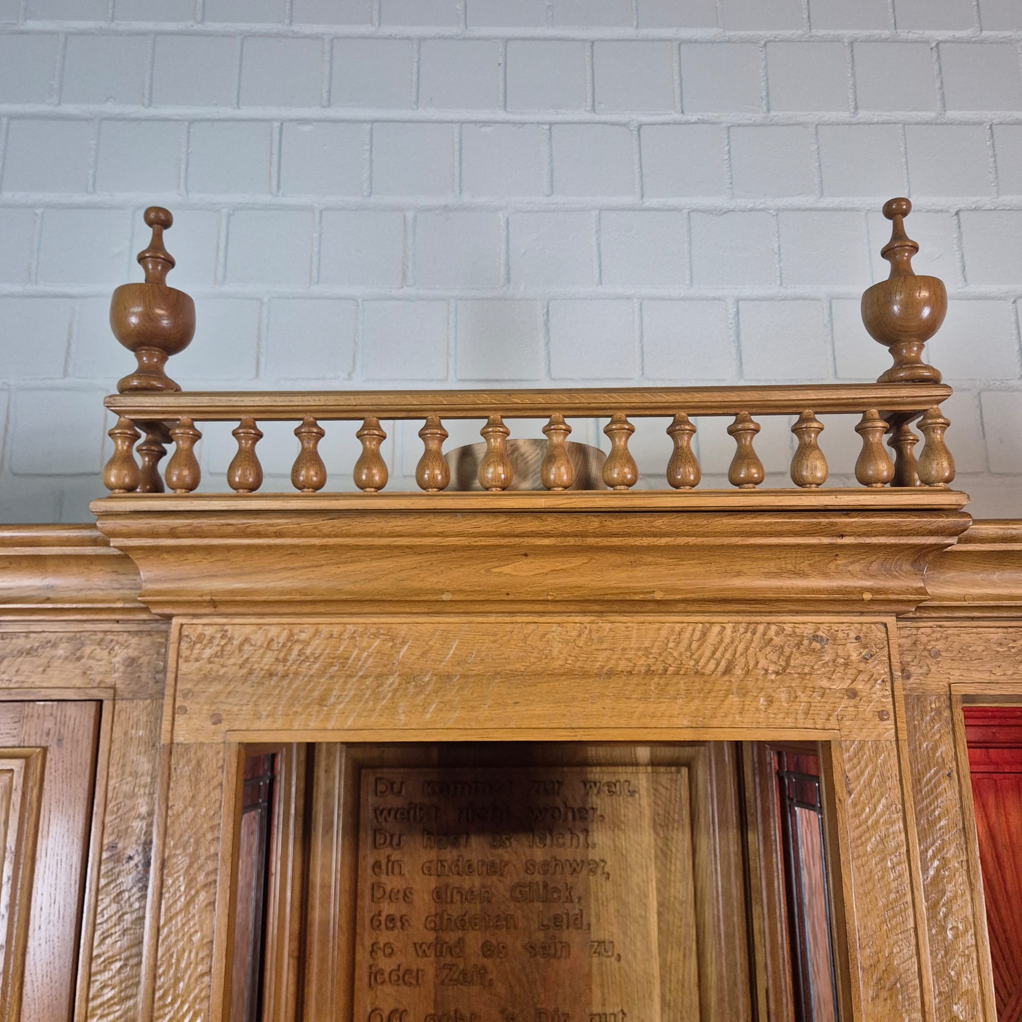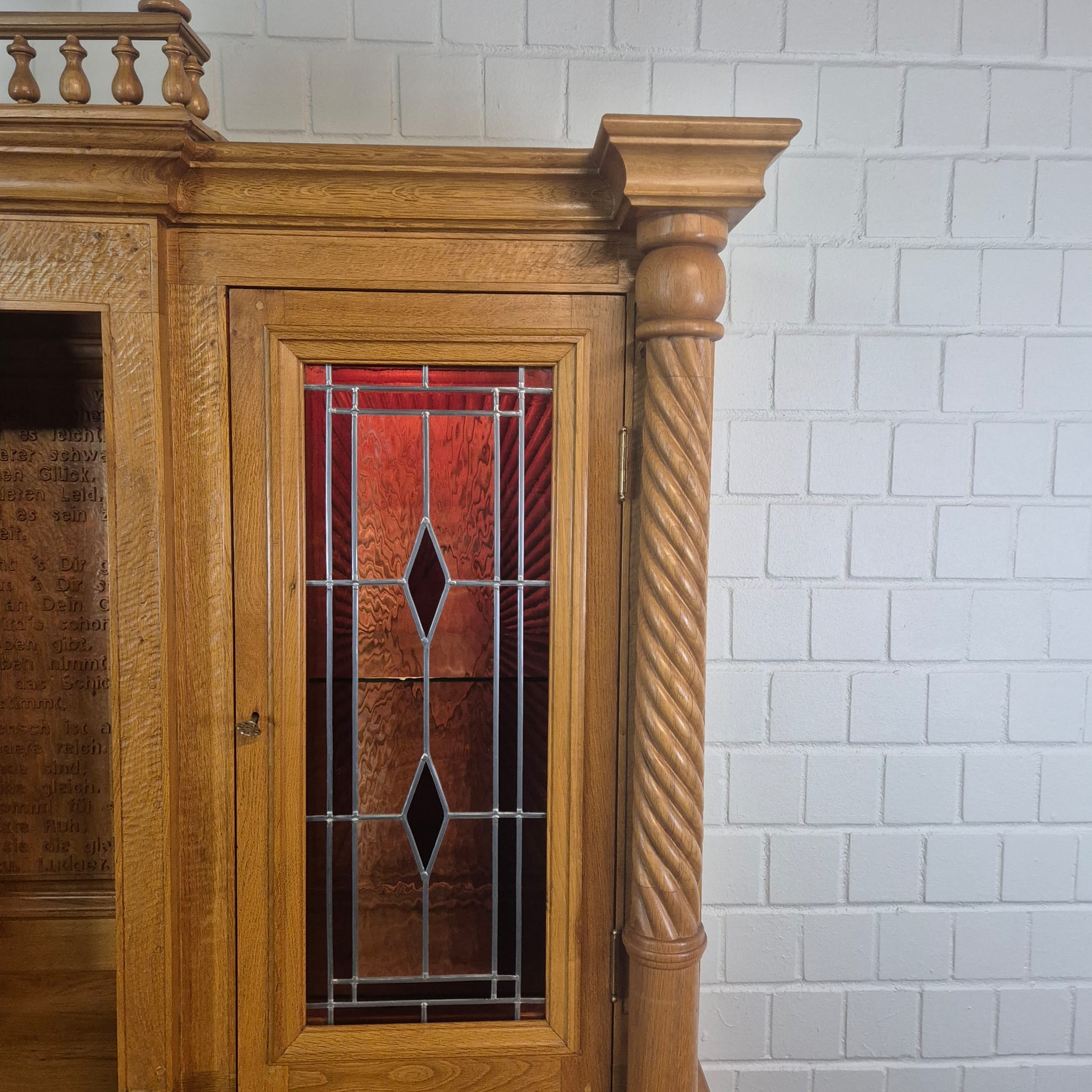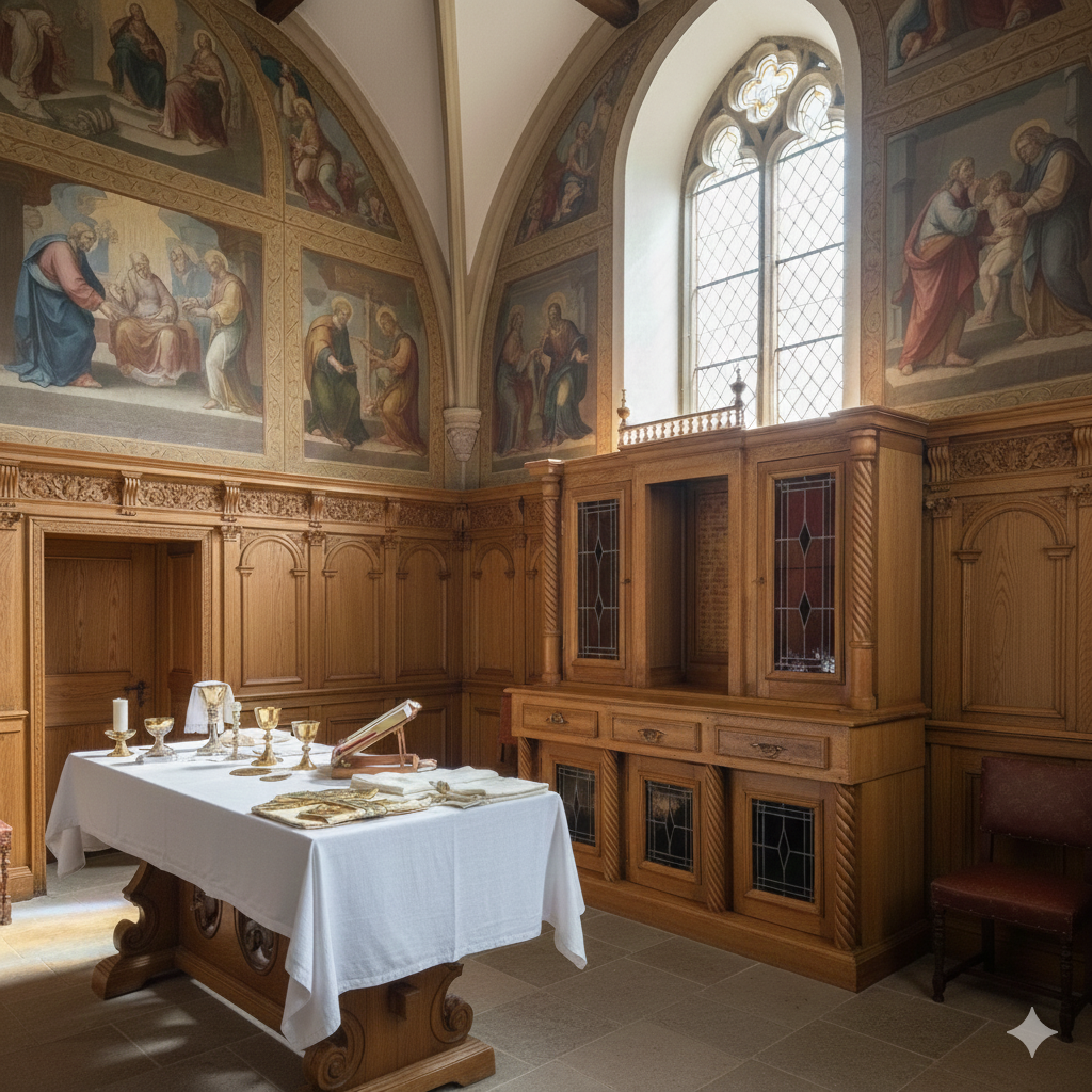 Originele kast uit een sacristie, gemaakt van massief eikenhout (gelakt) uit 1949. De kast, met glas-in-loodramen, is in zeer goede staat en vertoont slechts minimale gebruikssporen. De kast is demonteerbaar in twee delen. Op het centrale houten paneel van de kast staat het volgende opschrift: