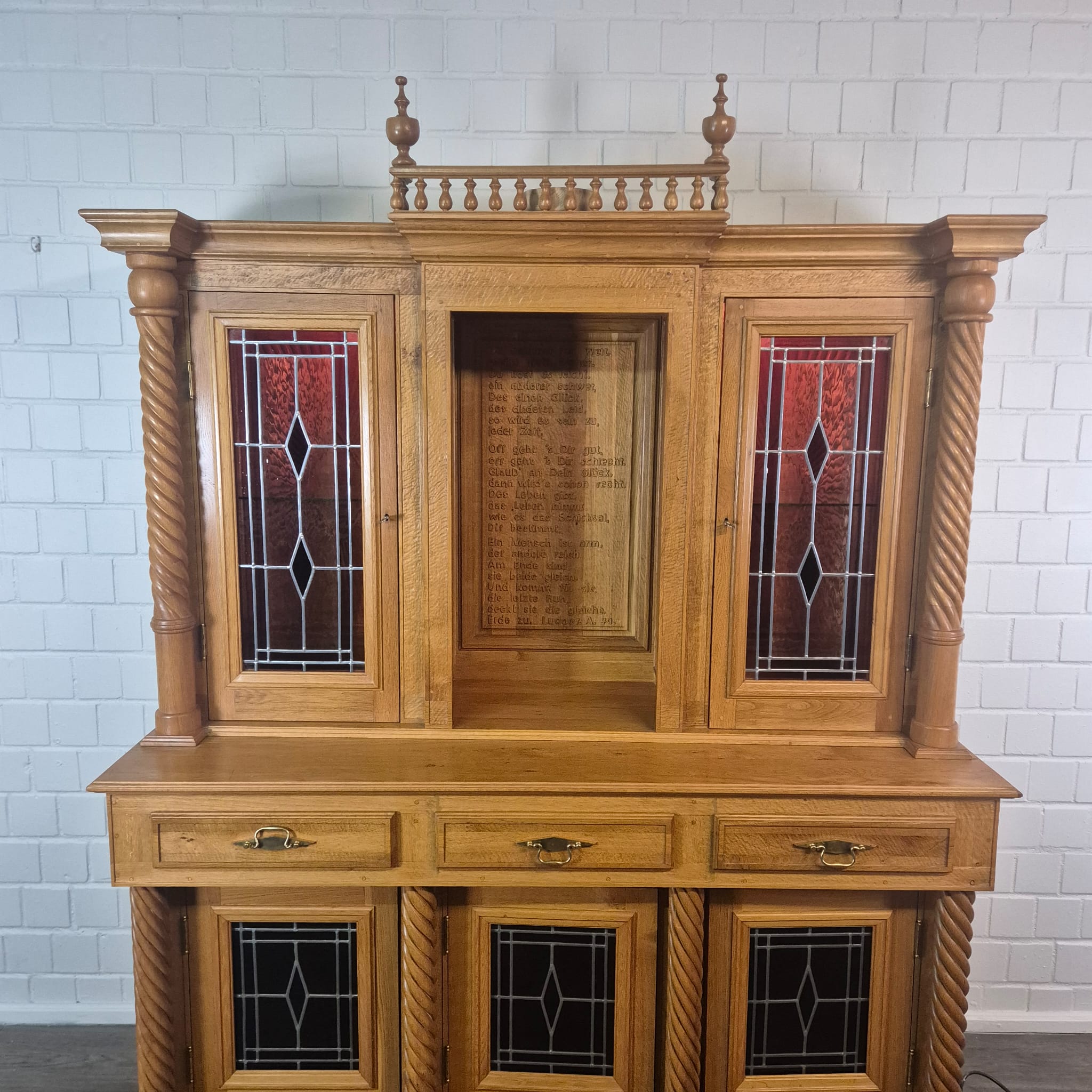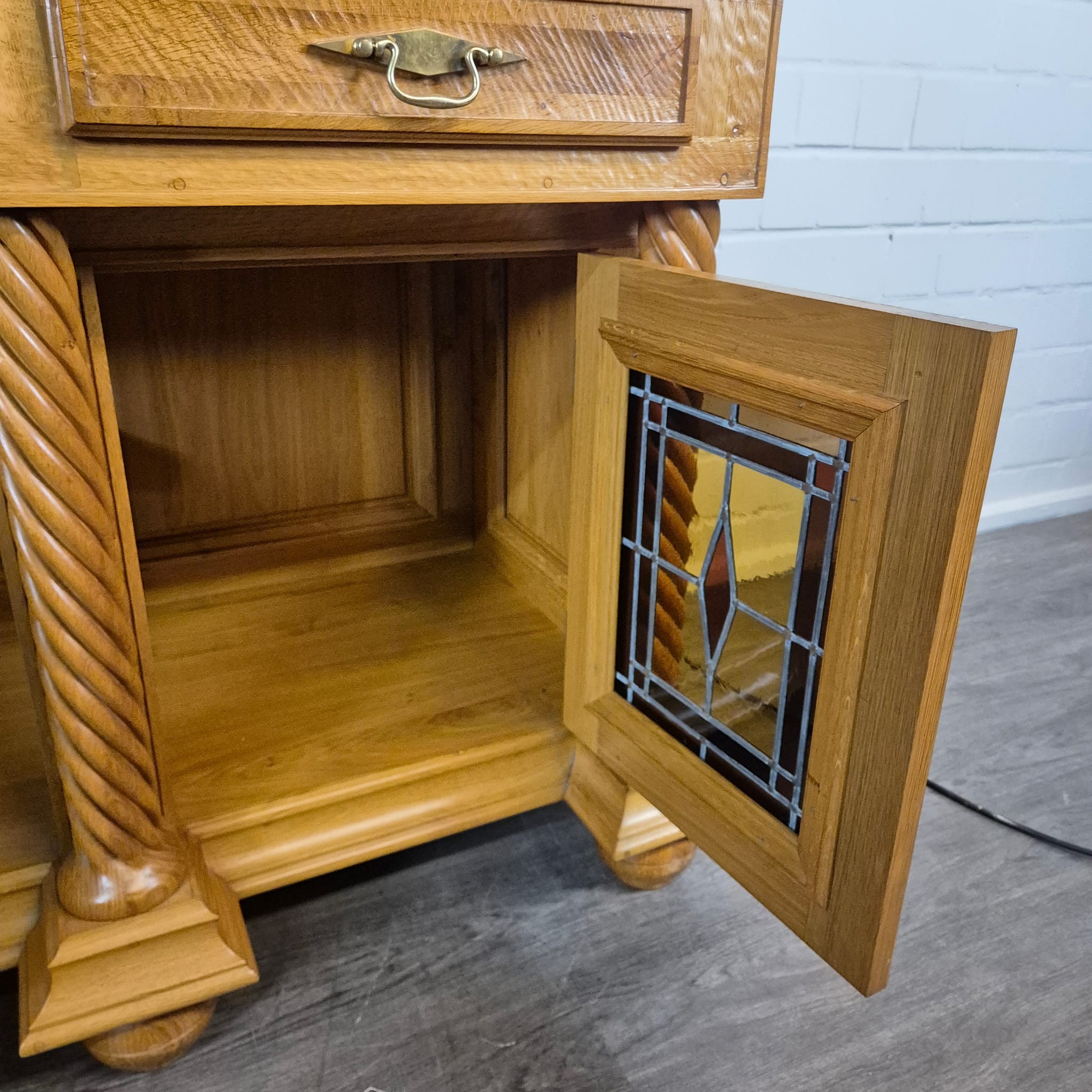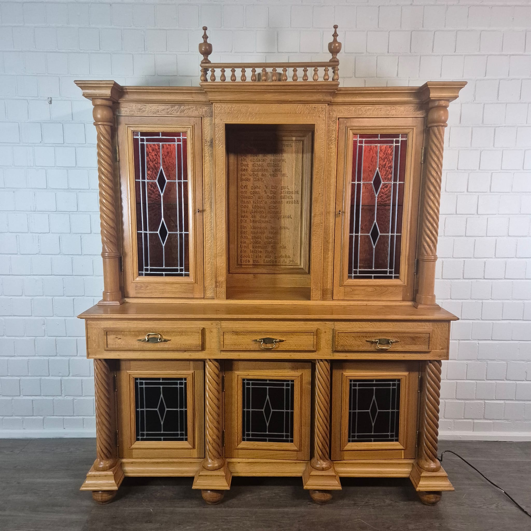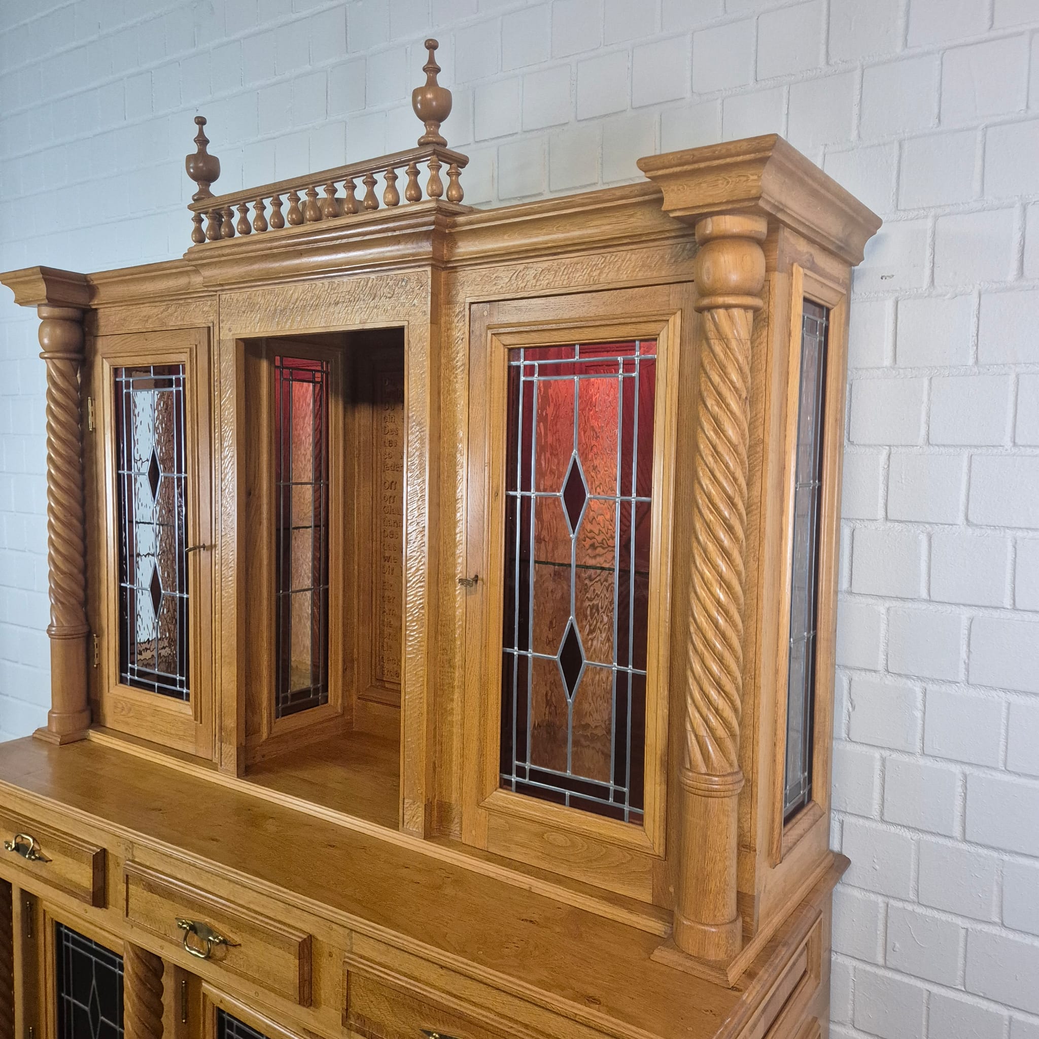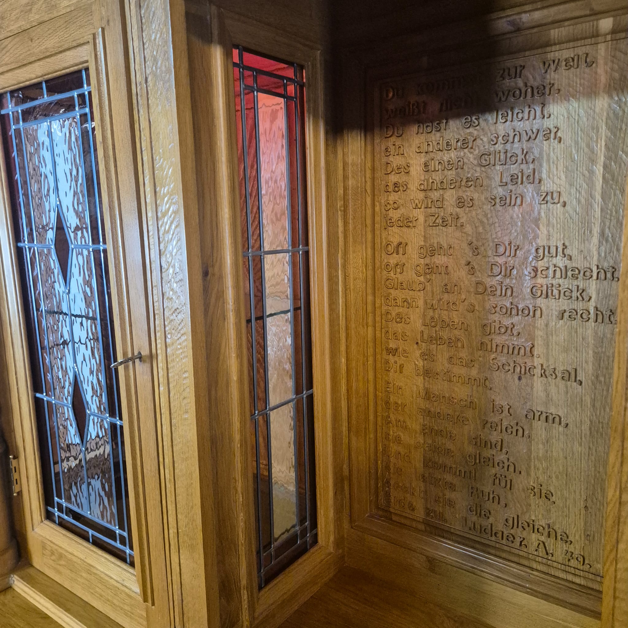Originele kast uit een sacristie, gemaakt van massief eikenhout (gelakt) uit 1949. De kast, met glas-in-loodramen, is in zeer goede staat en vertoont slechts minimale gebruikssporen. De kast is demonteerbaar in twee delen. Op het centrale houten paneel van de kast staat het volgende opschrift: