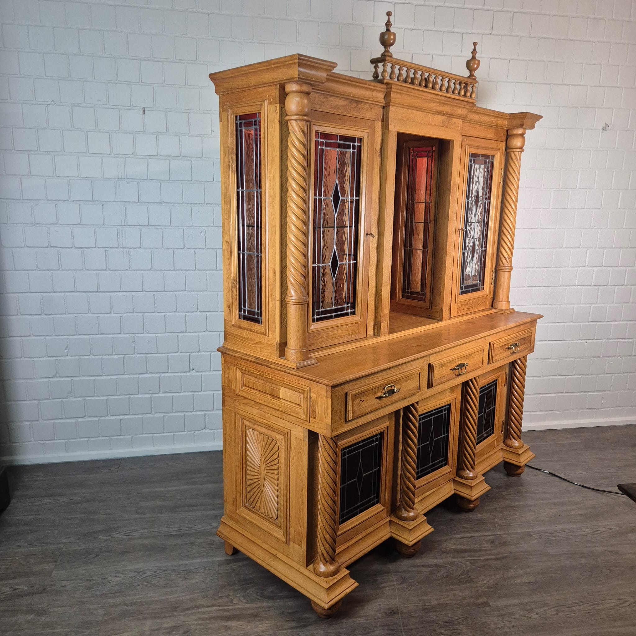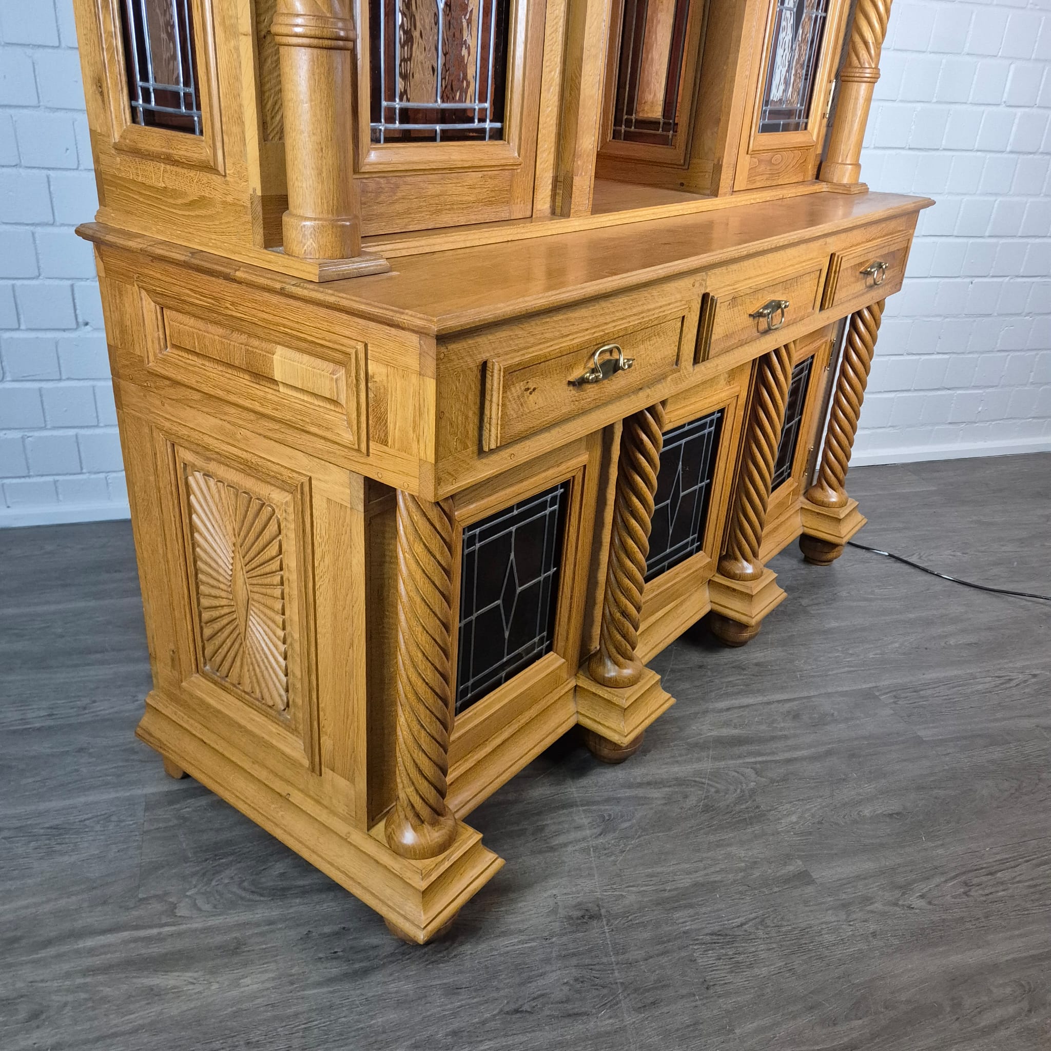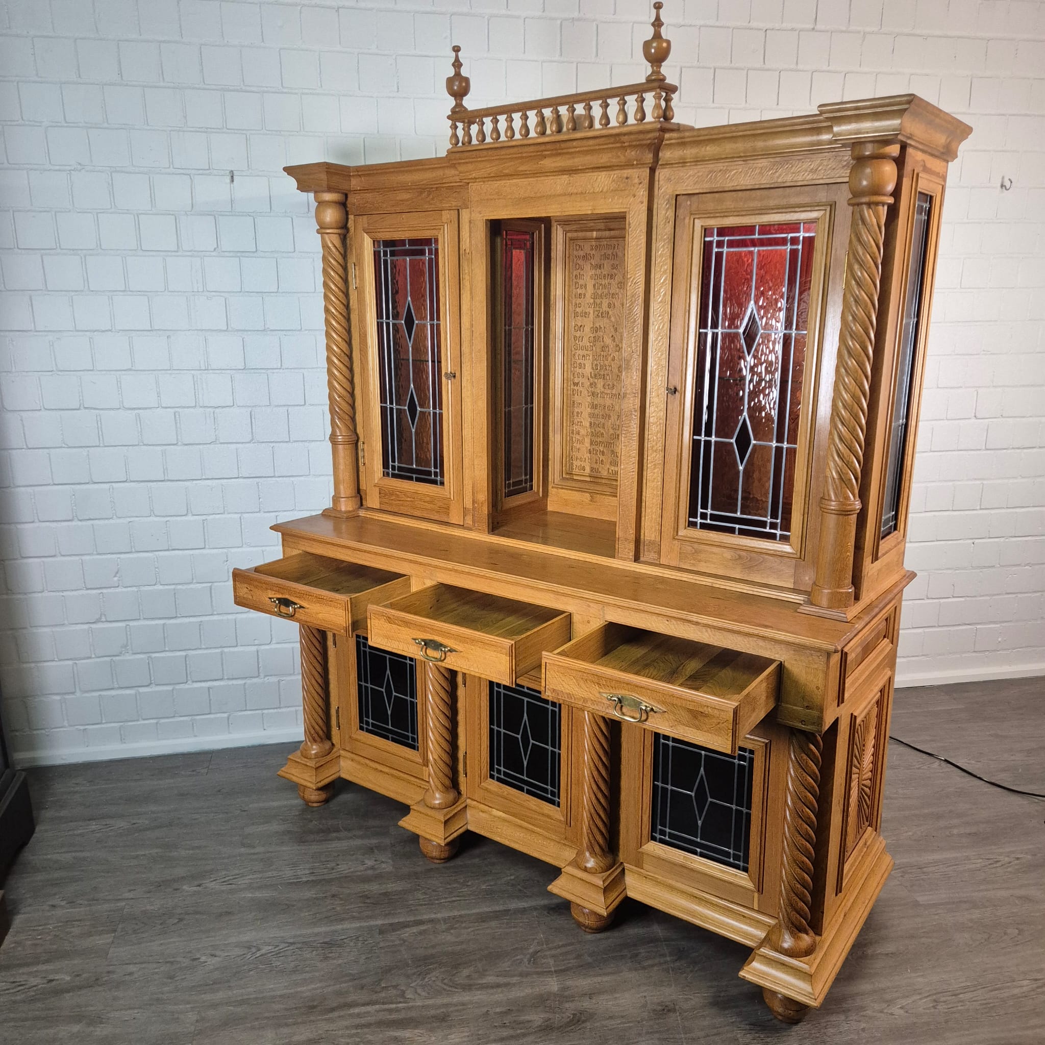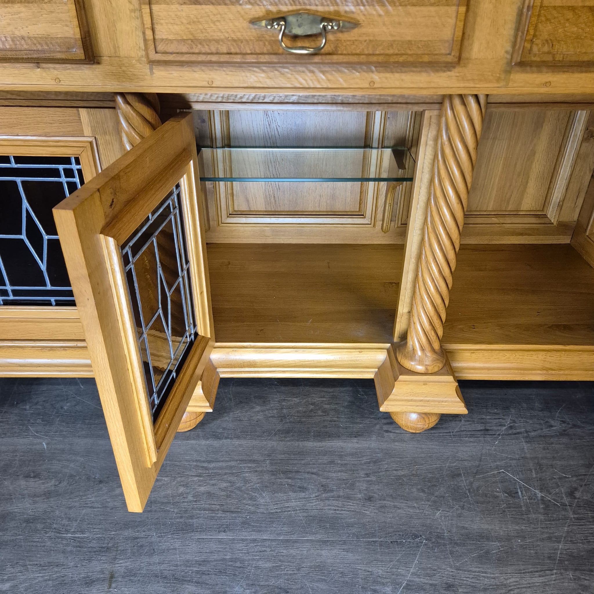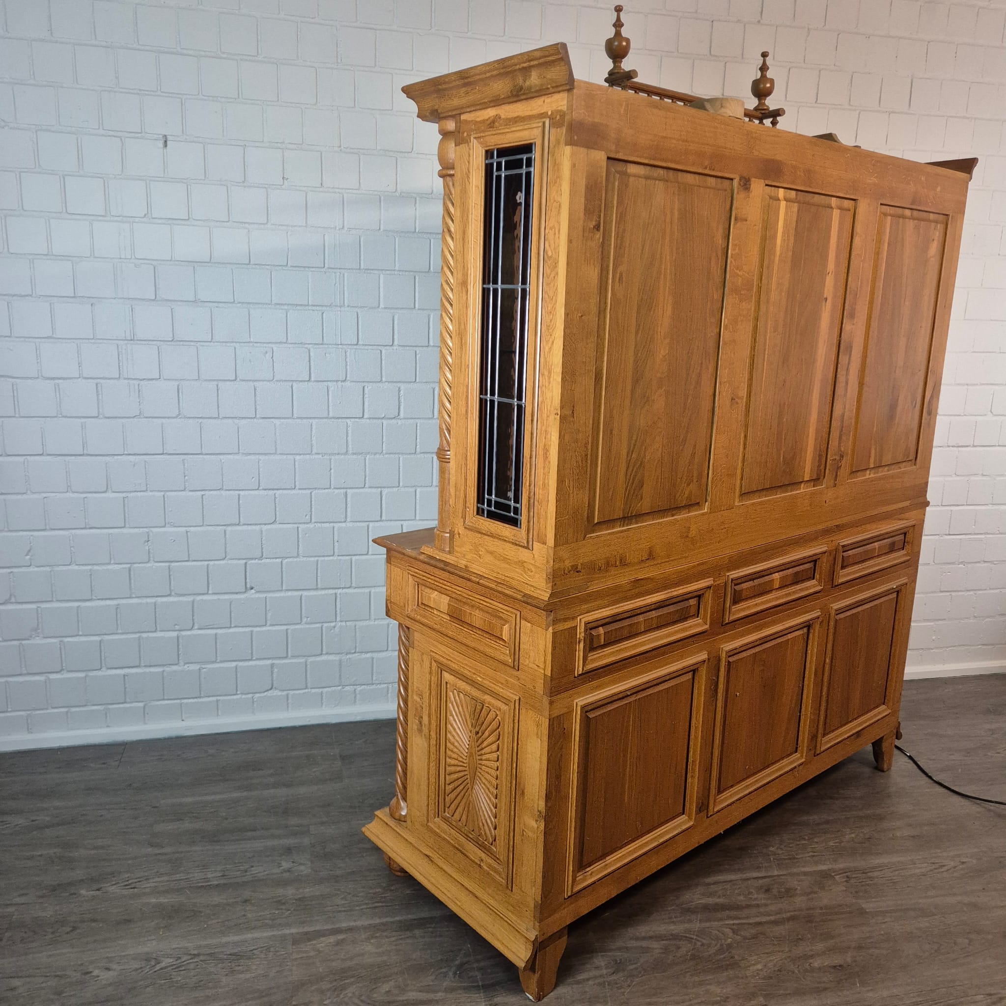 Originele kast uit een sacristie, gemaakt van massief eikenhout (gelakt) uit 1949. De kast, met glas-in-loodramen, is in zeer goede staat en vertoont slechts minimale gebruikssporen. De kast is demonteerbaar in twee delen. Op het centrale houten paneel van de kast staat het volgende opschrift: