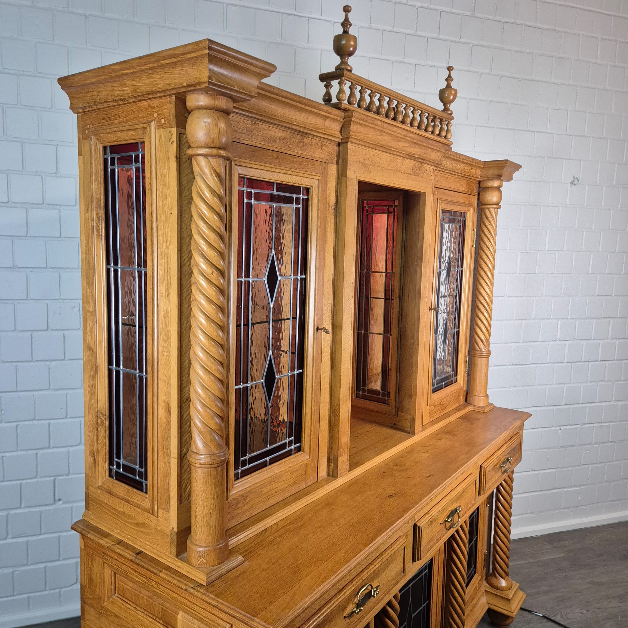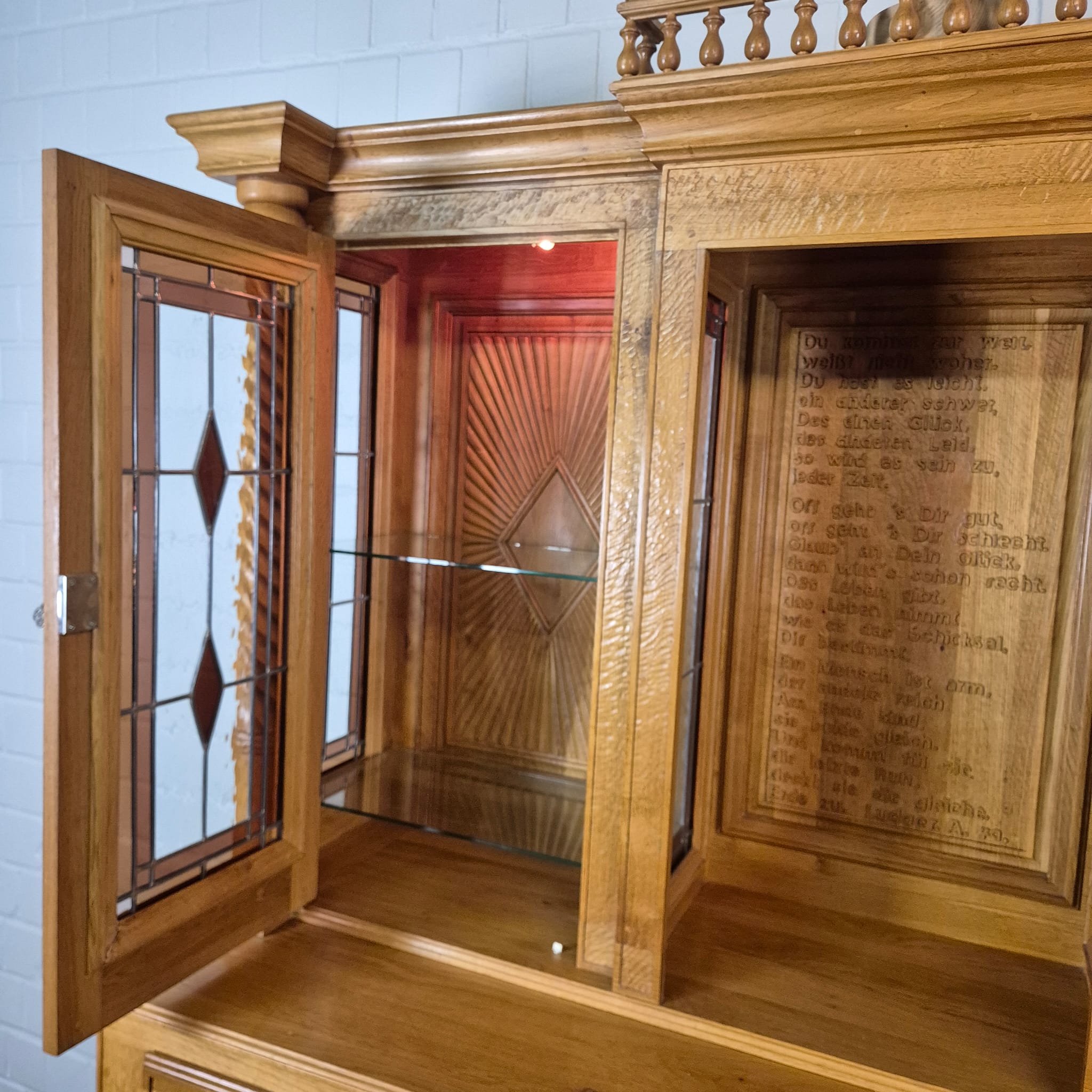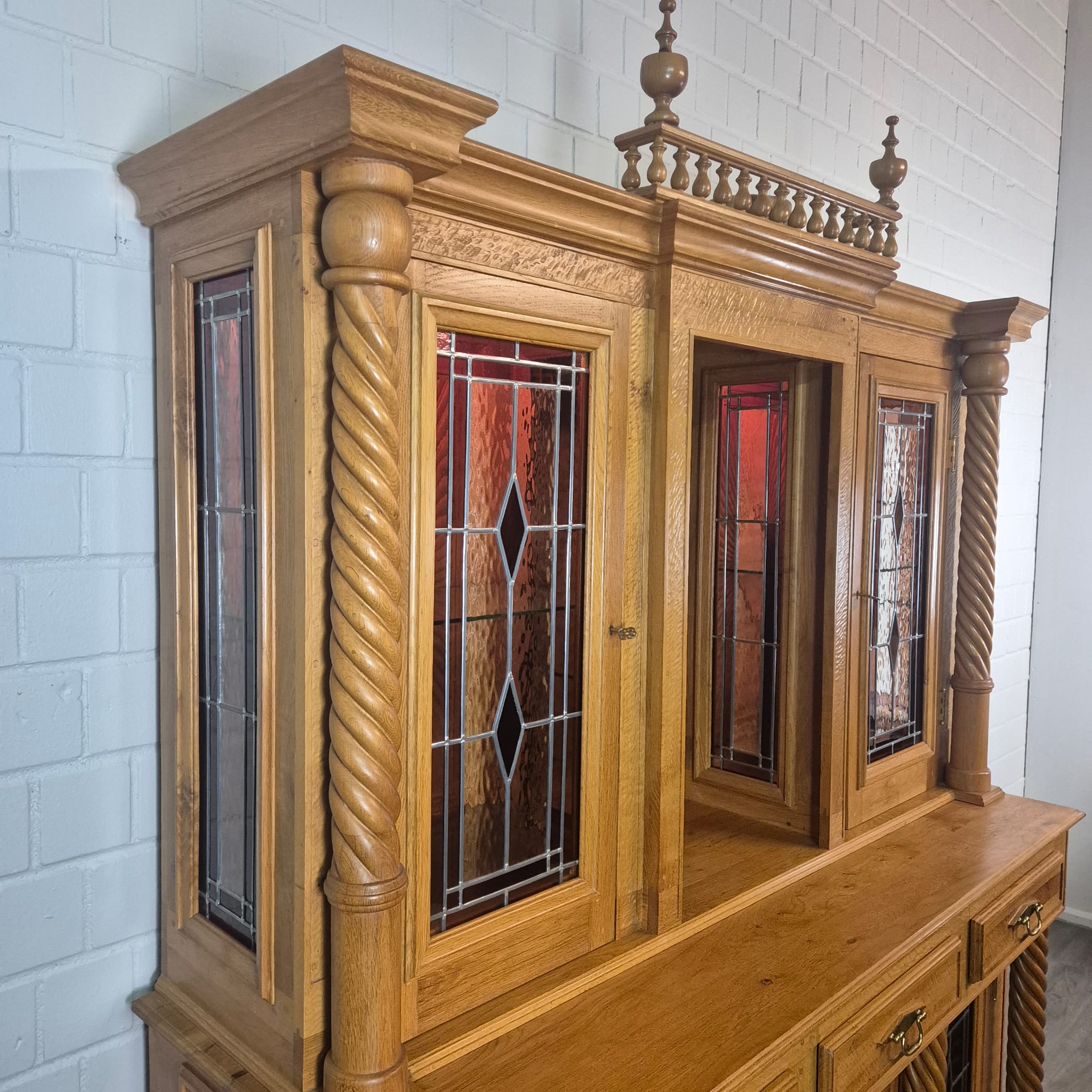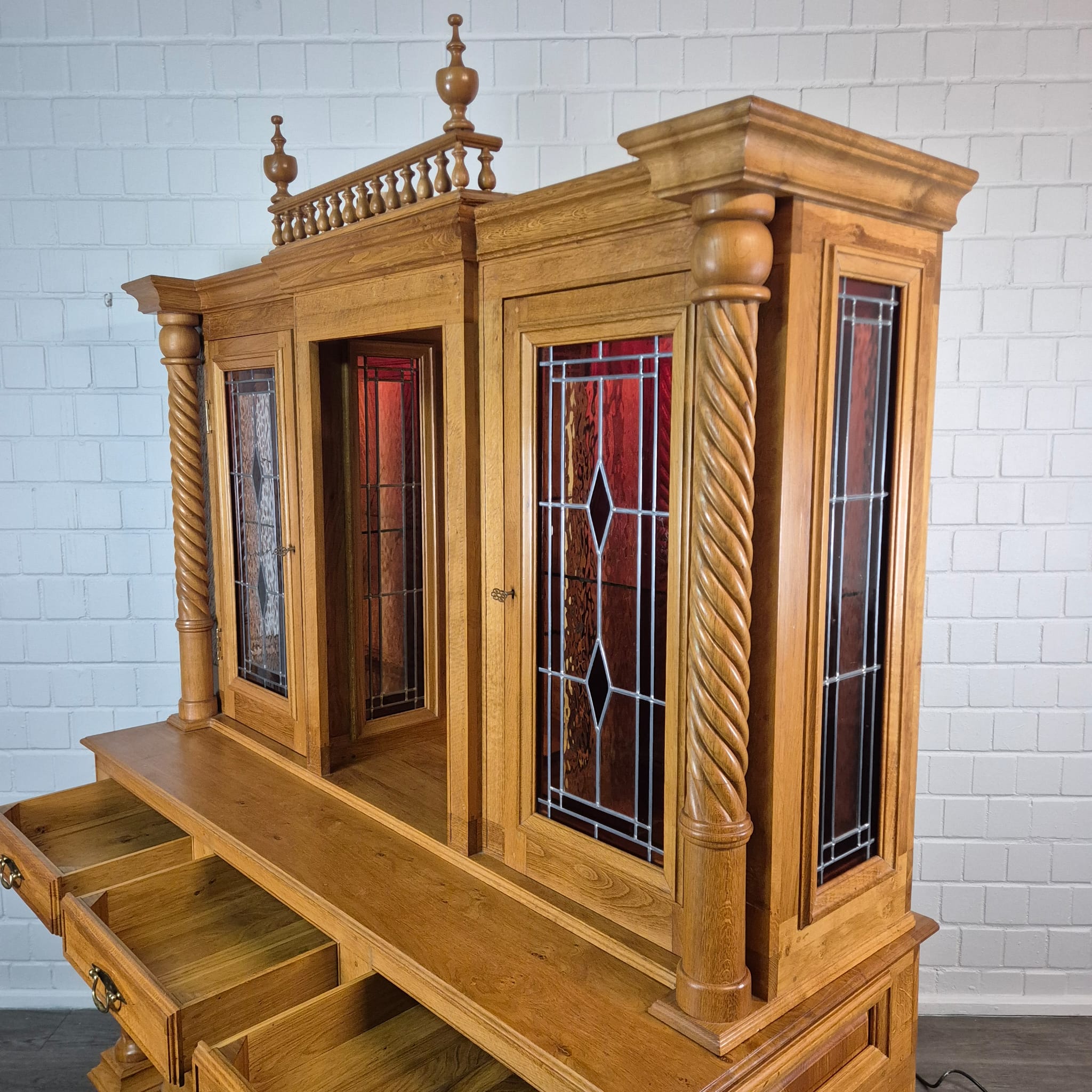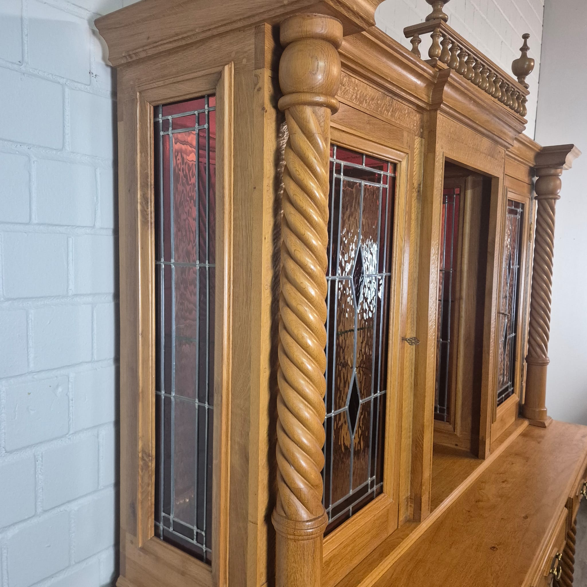 Originele kast uit een sacristie, gemaakt van massief eikenhout (gelakt) uit 1949. De kast, met glas-in-loodramen, is in zeer goede staat en vertoont slechts minimale gebruikssporen. De kast is demonteerbaar in twee delen. Op het centrale houten paneel van de kast staat het volgende opschrift: