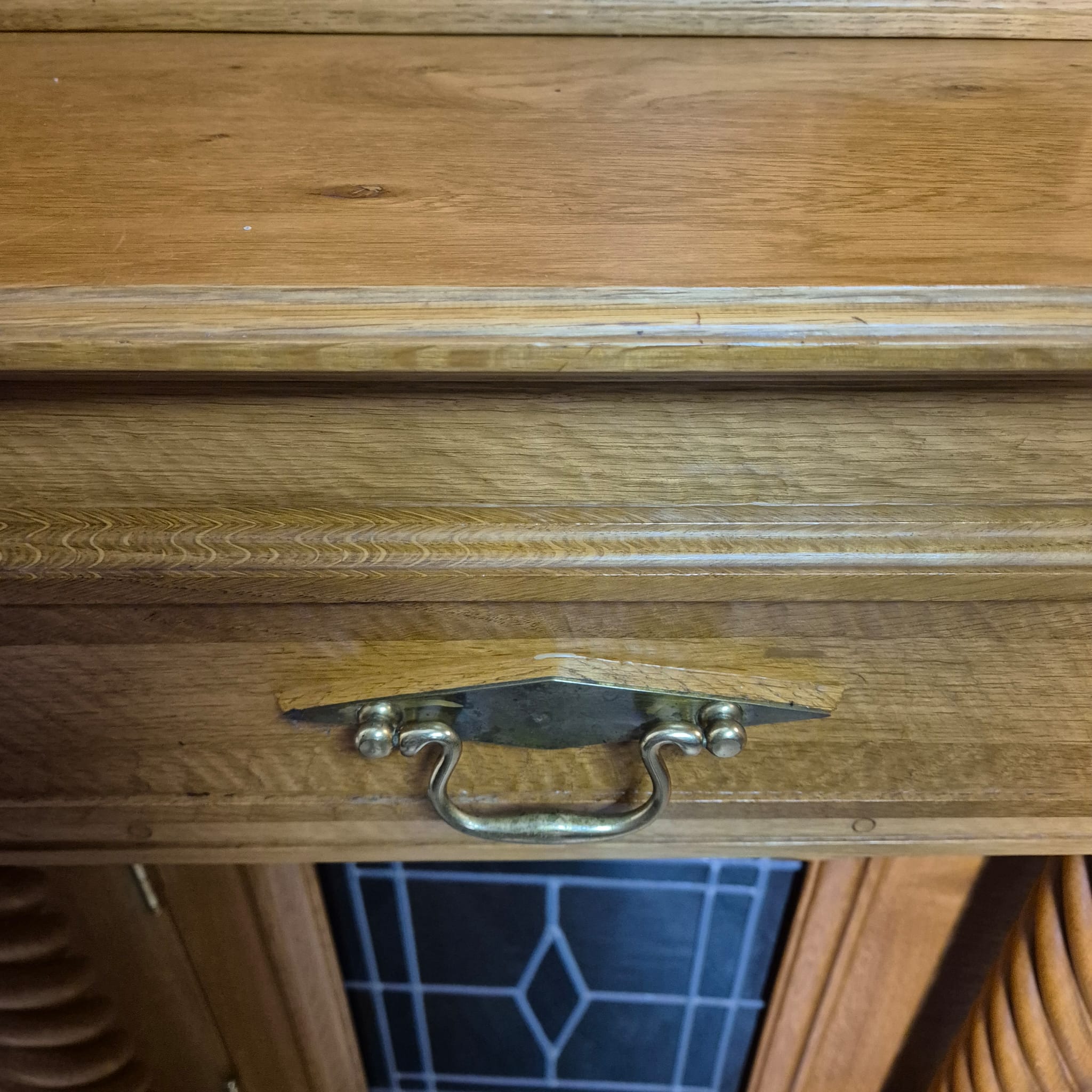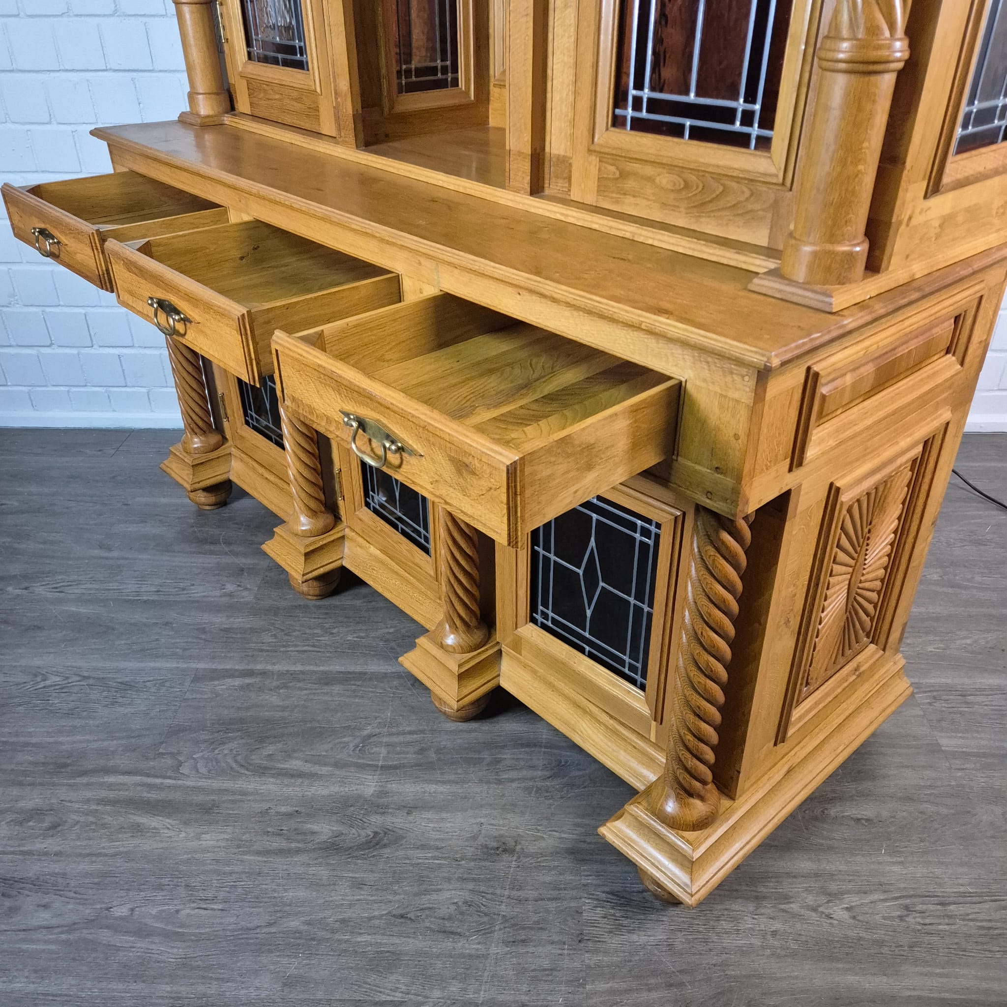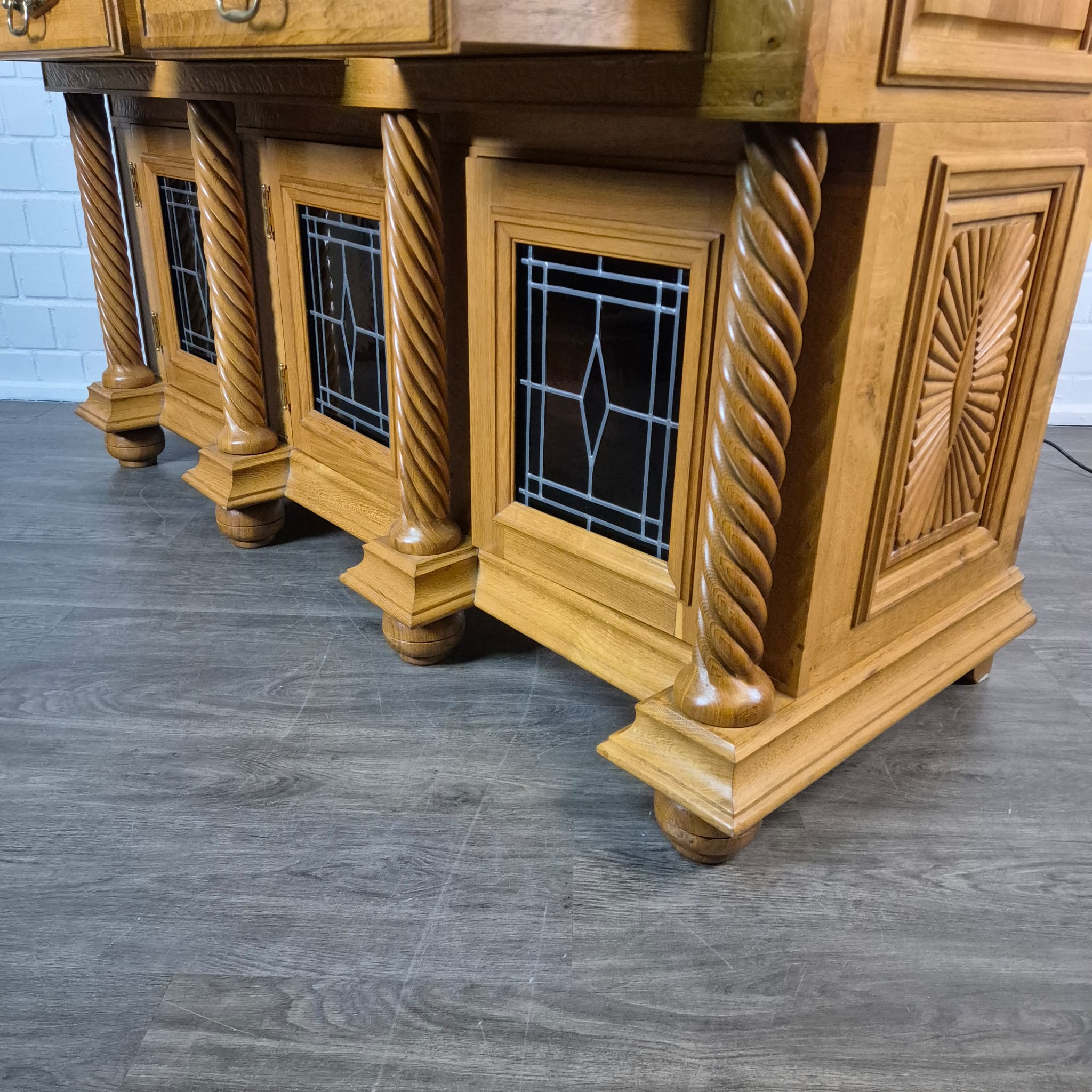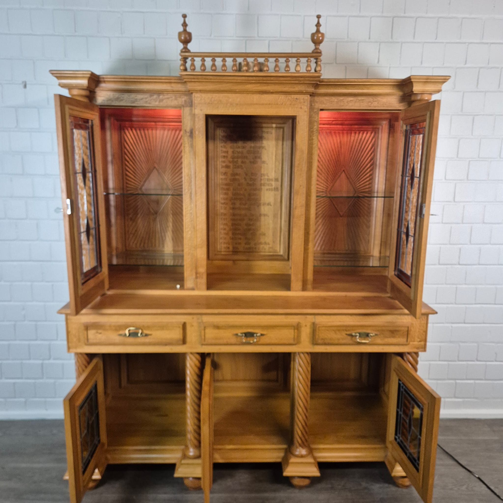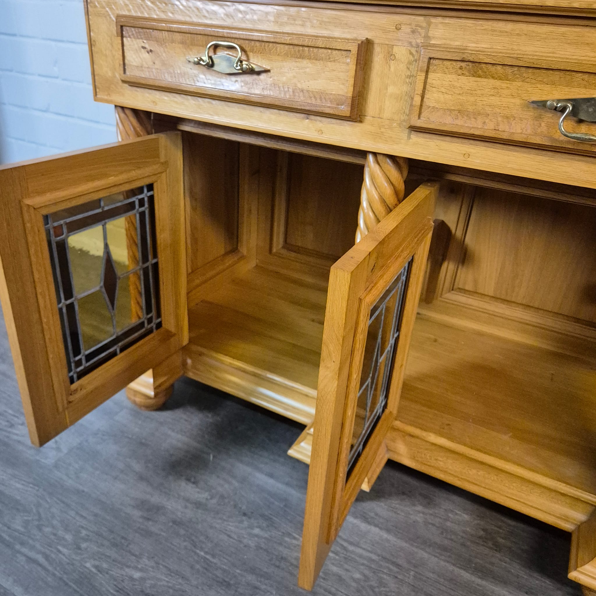 Originele kast uit een sacristie, gemaakt van massief eikenhout (gelakt) uit 1949. De kast, met glas-in-loodramen, is in zeer goede staat en vertoont slechts minimale gebruikssporen. De kast is demonteerbaar in twee delen. Op het centrale houten paneel van de kast staat het volgende opschrift: