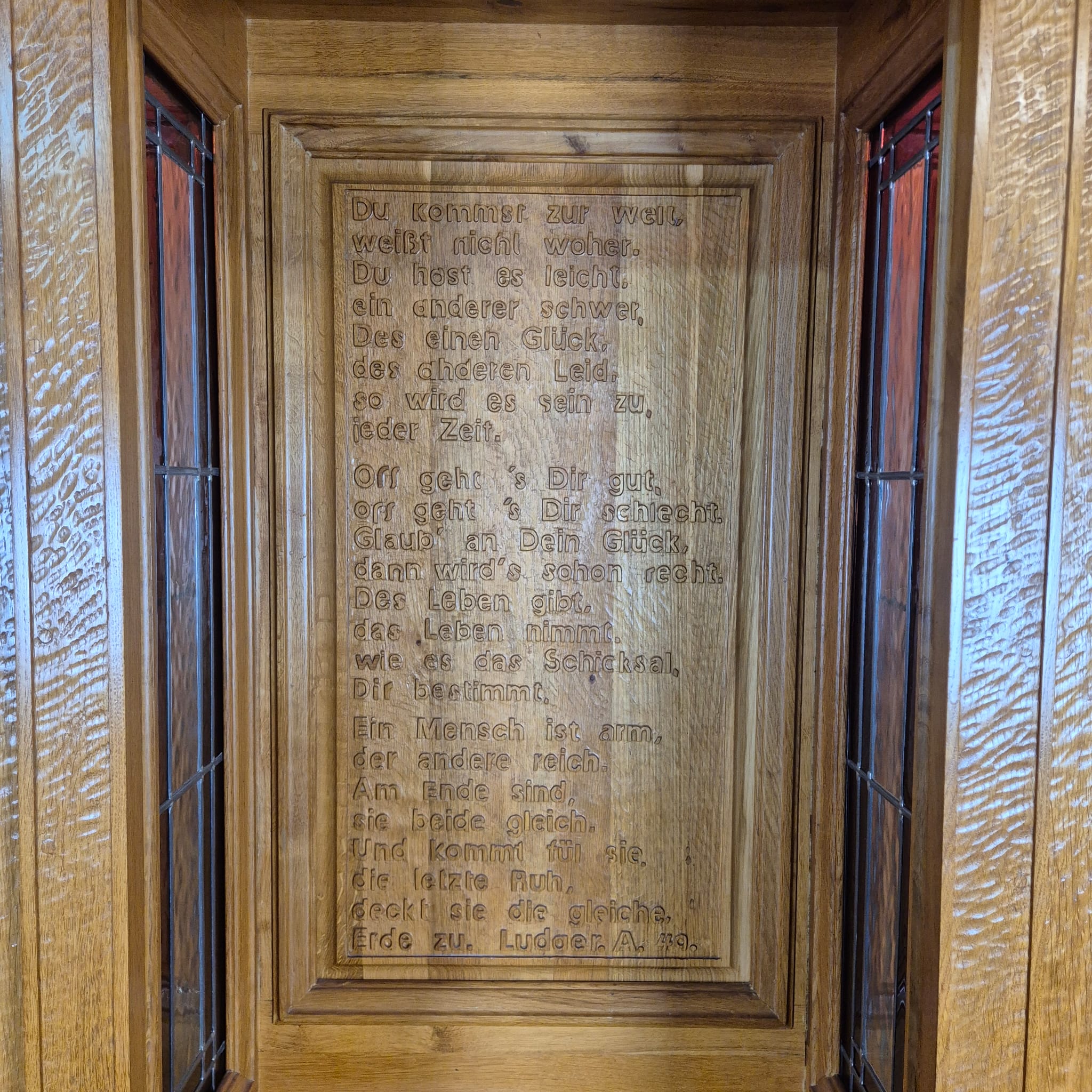 Ein Mensch ist arm, der andere reich. Am Ende sind sie beide gleich. Und kommt für sie die letzte Ruh, deckt sie die gleiche Erde zu. Ludger A. 49.“