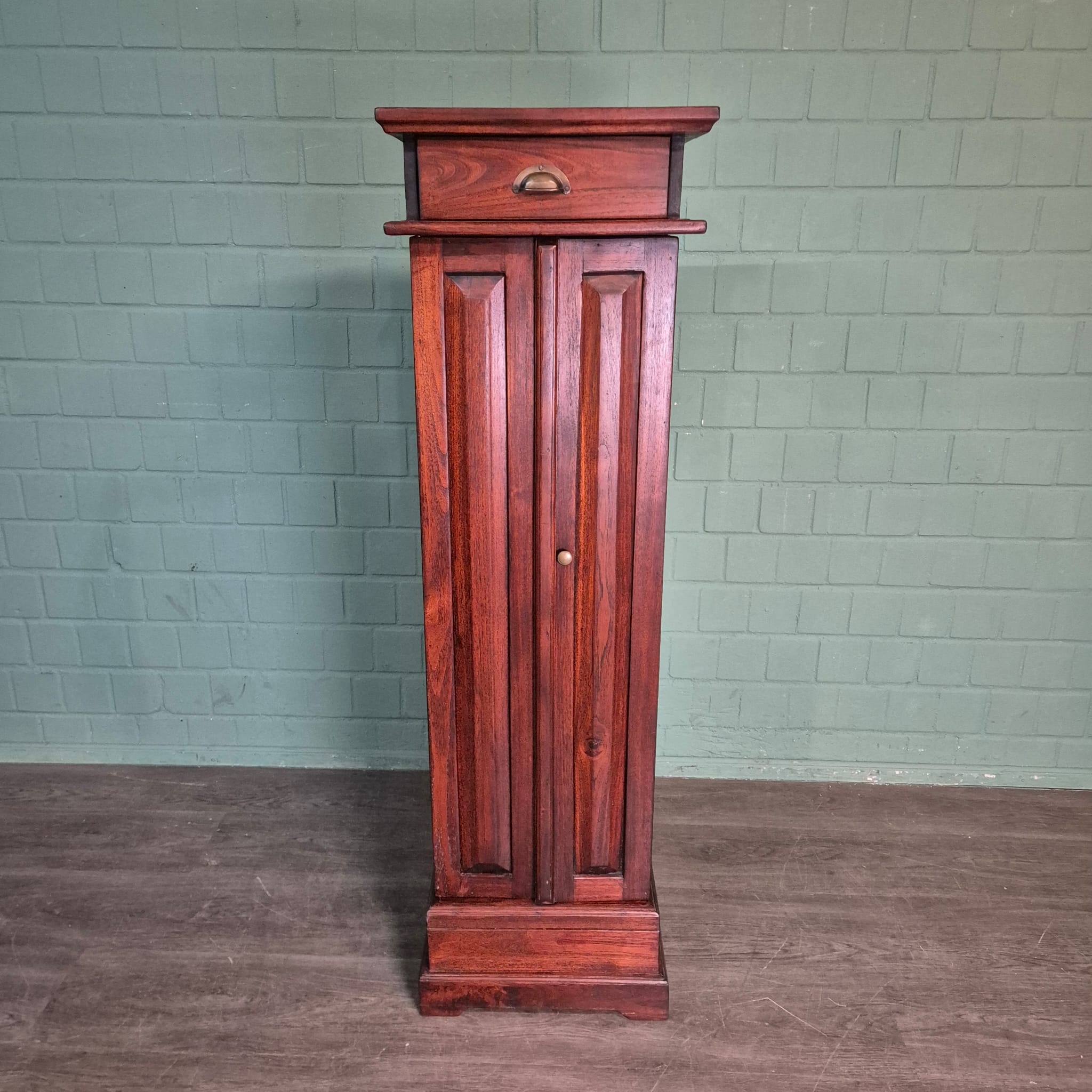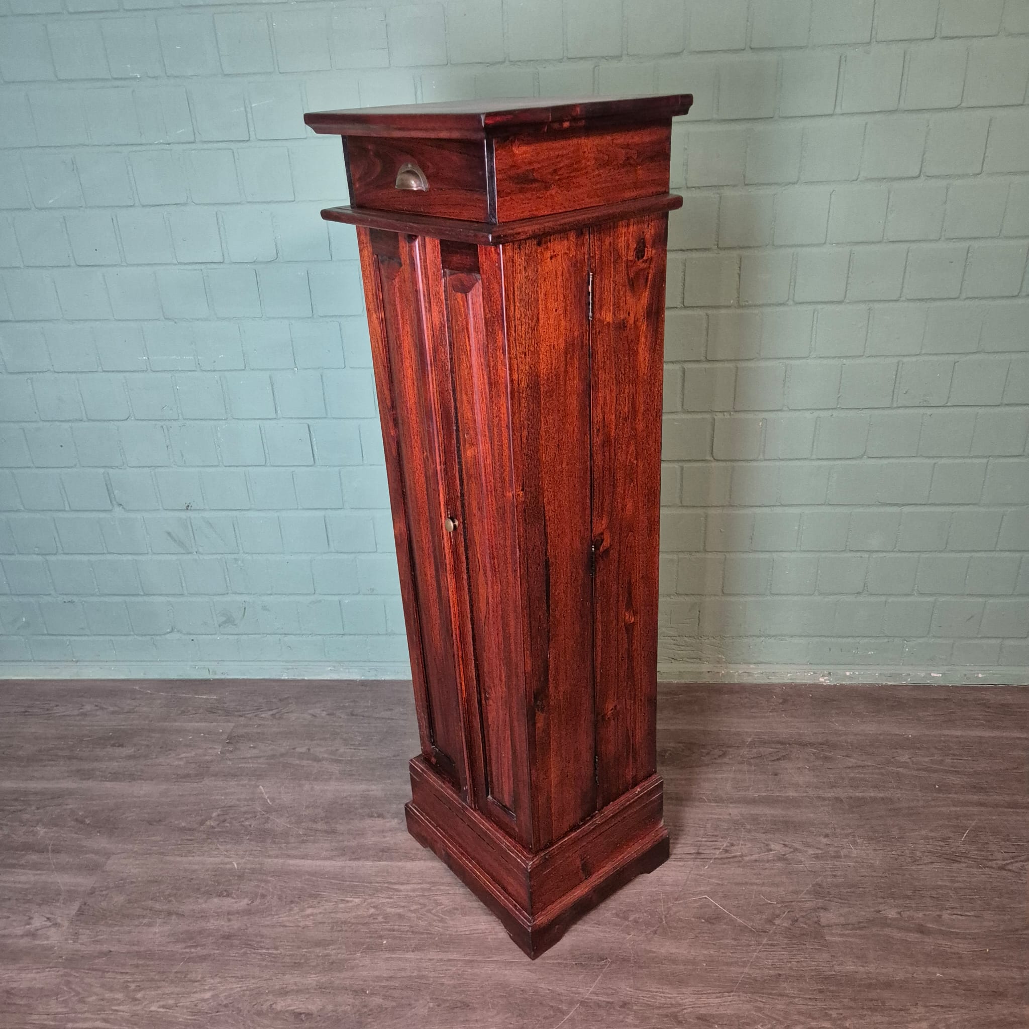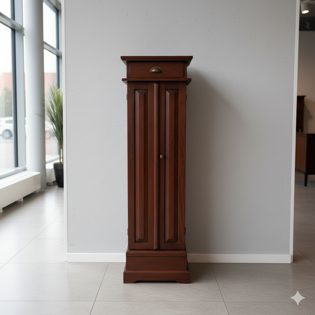 Voeg een vleugje elegantie toe aan uw huis met deze prachtige, slanke kast, gemaakt van hoogwaardig teakhout, gebeitst in een rijke mahonietint. Dit veelzijdige meubelstuk is niet alleen een visueel middelpunt, maar biedt ook praktische opbergruimte voor uw dierbare spullen.