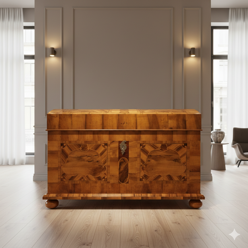 Gerestaureerde barok kist noten en ander hout gefineerd en schellak gepolytourd uit ca. 1780. De kist is in een zeer goede staat en heeft minimale gebruikssporen.