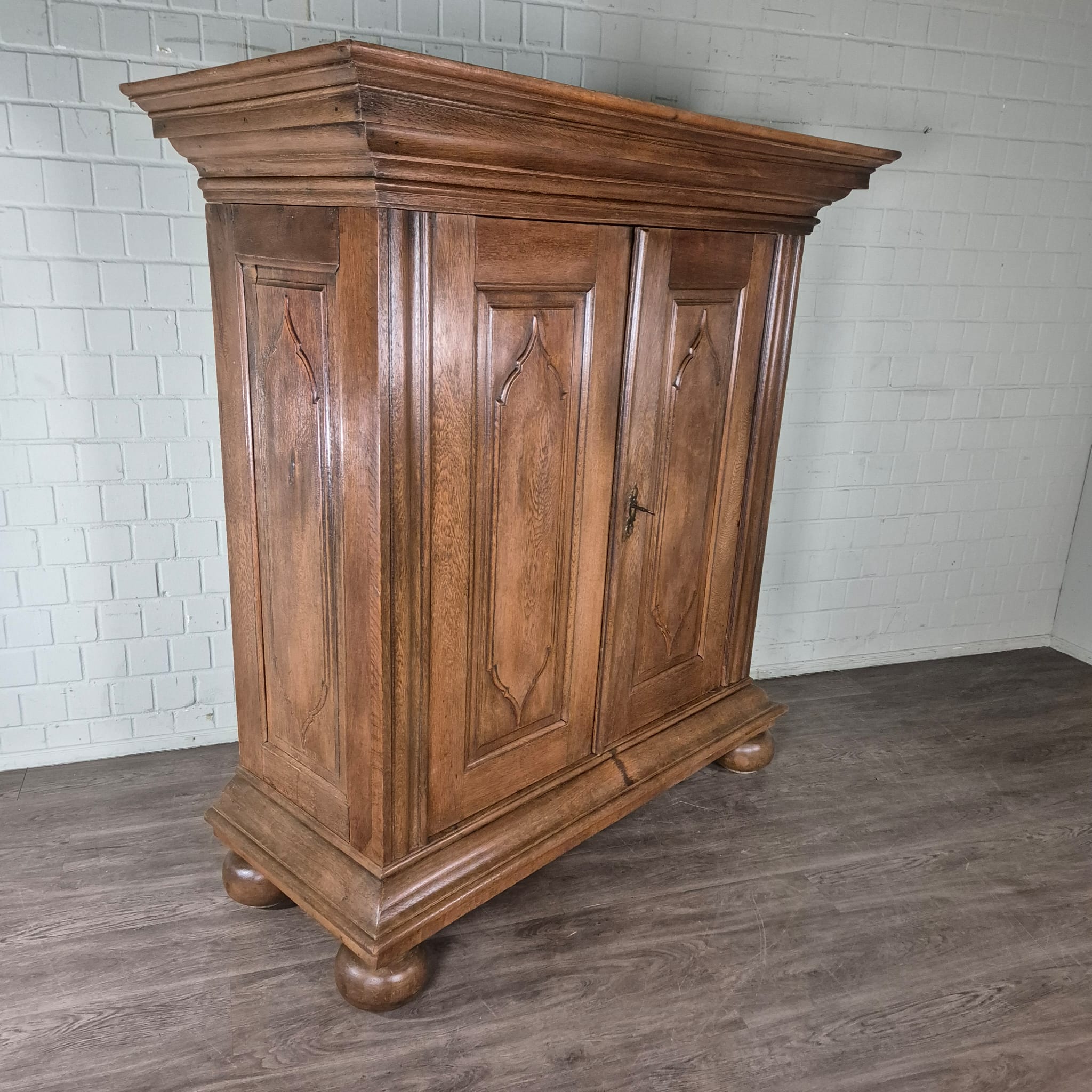 Gerestaureerde barok kledingkast gemaakt van massief eiken (gewaxt) uit ca. 1780. De kledingkast met nieuwe rugwand is in een zeer goede staat en heeft minimale gebruikssporen. Demontabel (7-delig).