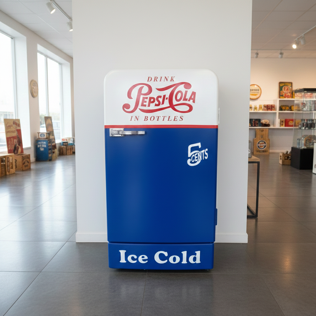 Design: Tweekleurig (blauw/wit) met het historische Pepsi-logo en de tekst "Ice Cold - 5 Cents".