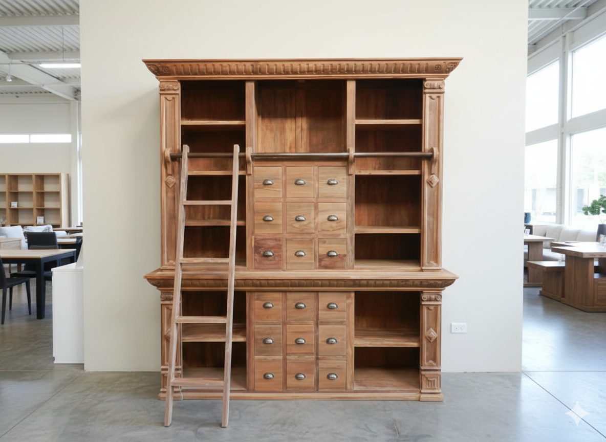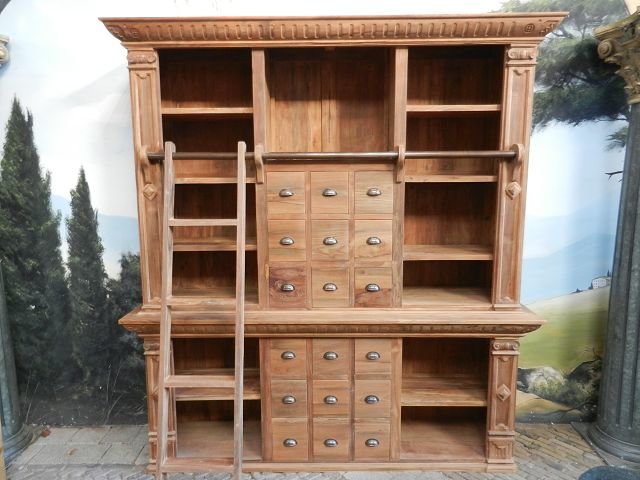 Dieser stilvoll gestaltete Schrank Modell Melinda aus massiv Teakholz erhält seine besondere Wirkung durch natürliche Unregelmäßigkeiten im Holz. Diese entstehen durch das verwendete Edelholz mit seinen verschiedenen Farben und Strukturen, welche diesem Stück einen eigentümlichen Charakter verleihen und es zu einem Unikat machen. Maserung und Farbton des Holzes tragen sehr zum optischen Wert dieses Möbels bei, das sowohl dekorative Möglichkeiten als auch genügend Stauraum bietet. Die Kombination von nostalgischer Optik und moderner Funktionalität ist für alle Ladeneinrichtungen sowie vielen weiteren Einsatzgebieten geeignet. Der Schrank wird komplett fertig montiert geliefert und ist somit sofort einsatzbereit. Zerlegbar (2-teilig).