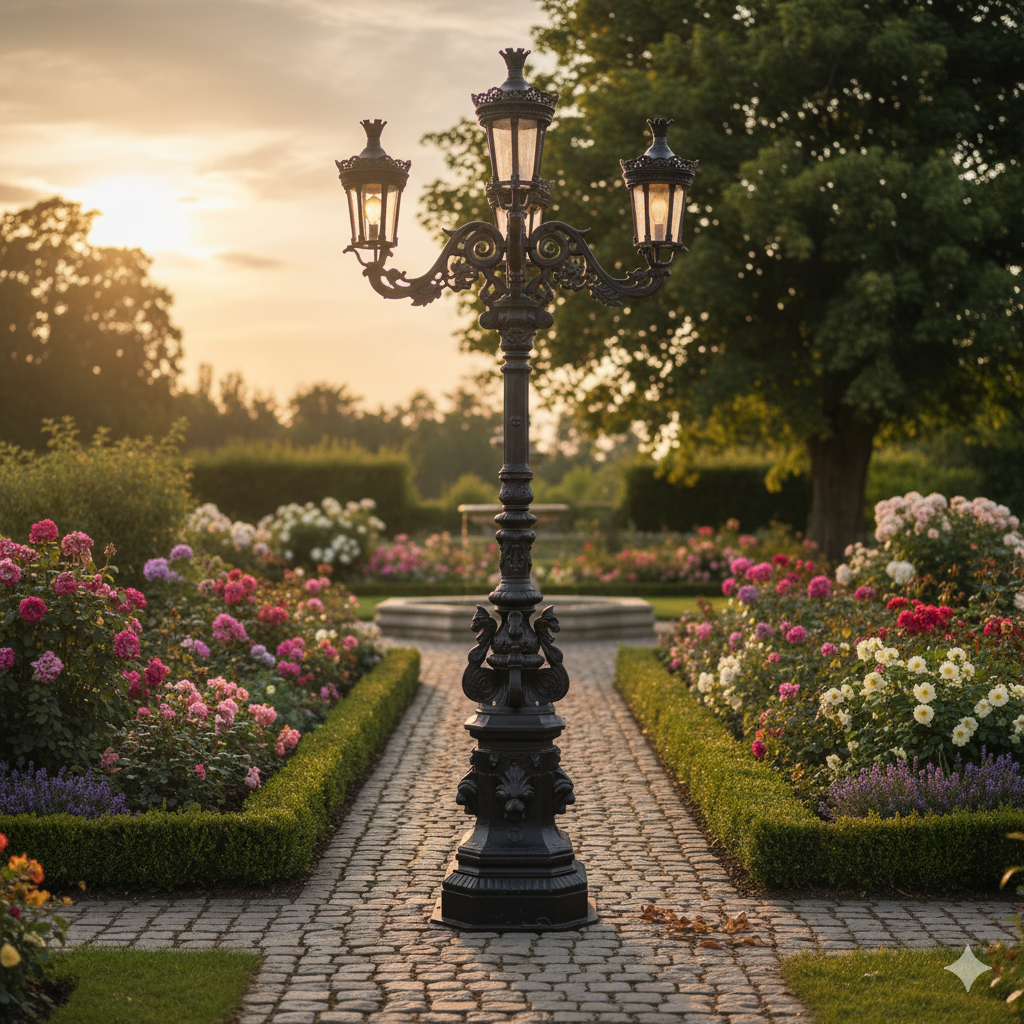 Tuinlantaarn gemaakt van gietijzer met glazen lampenkappen. Uitneembaar (7-delig).
