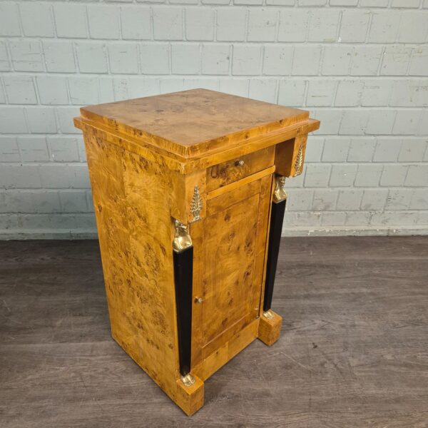 Voeg een vleugje tijdloze elegantie toe aan uw slaapkamer of woonkamer met dit prachtige kleine meubelstuk in Biedermeier- of classicistische stijl. Dit meubelstuk is gemaakt van fijn wortelnotenhout en valt op door de unieke nerfstructuur en fijne details, waardoor het een echte blikvanger is.