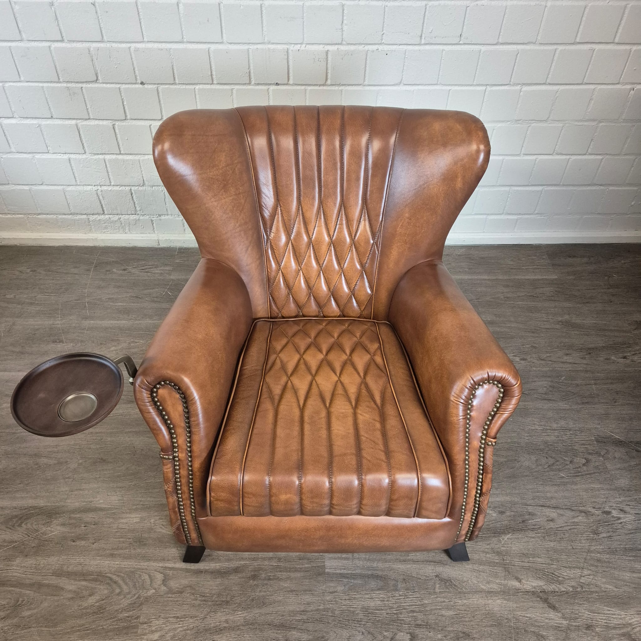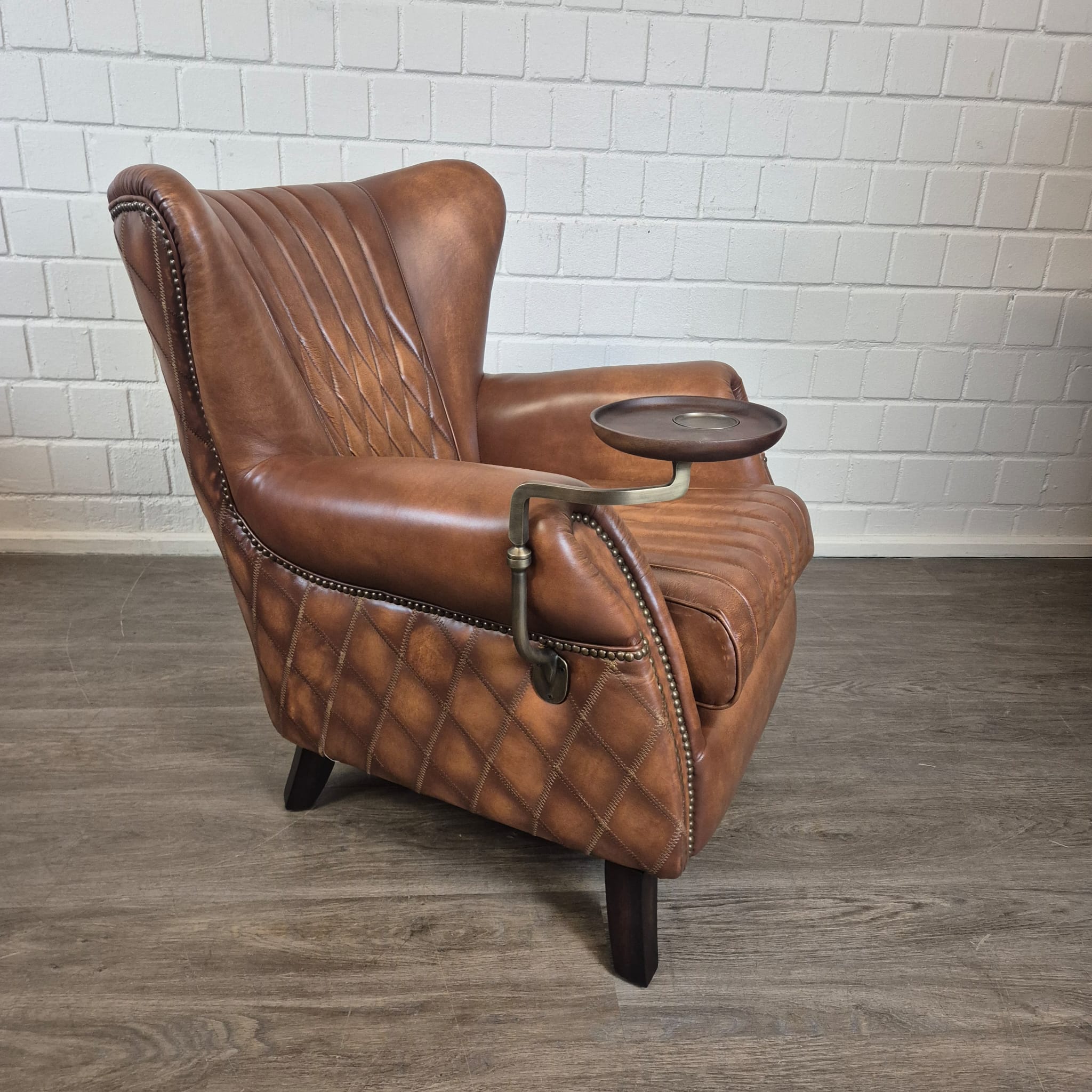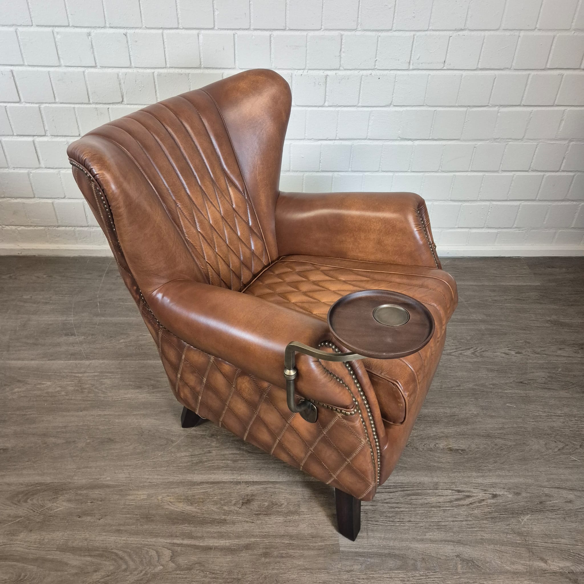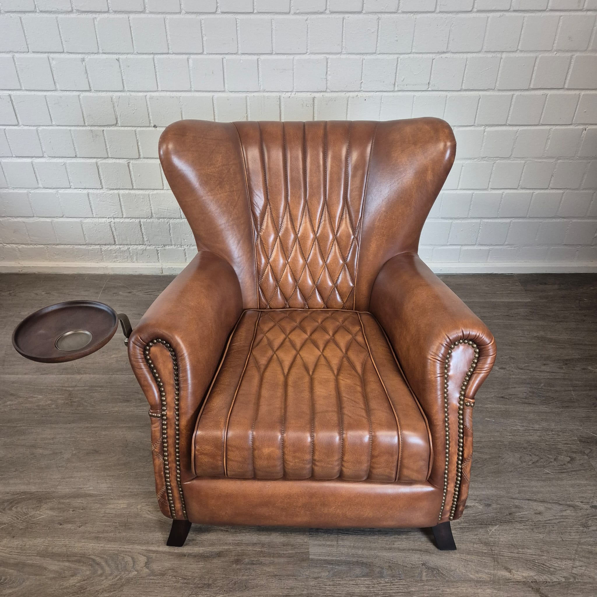 Exclusieve fauteuil met hoge rugleuning in echt leer en draaibaar dienblad