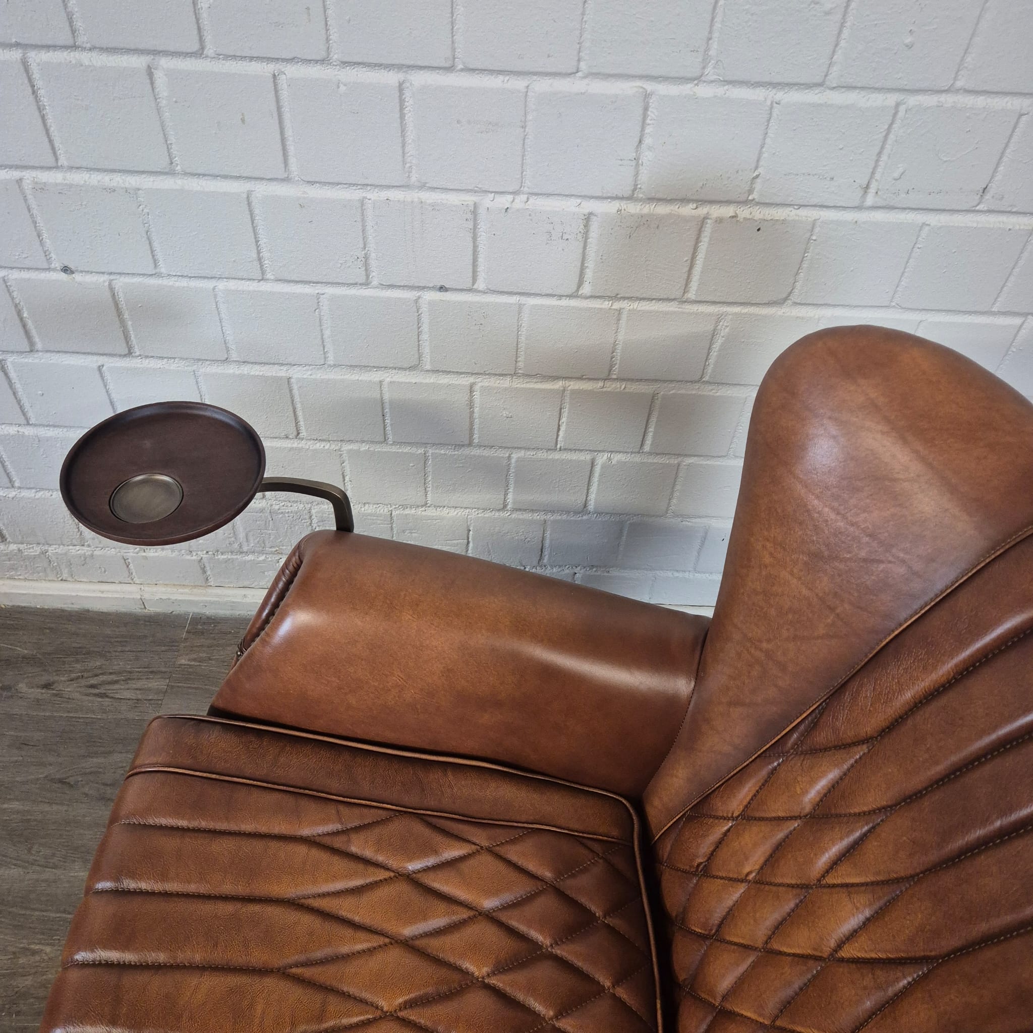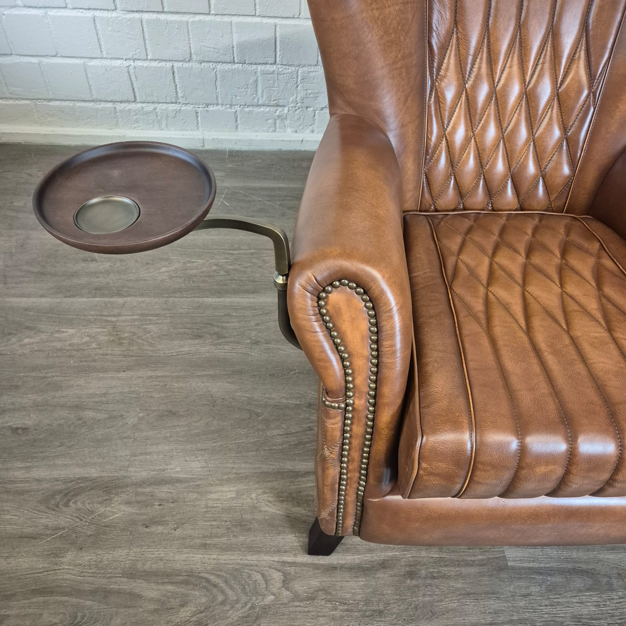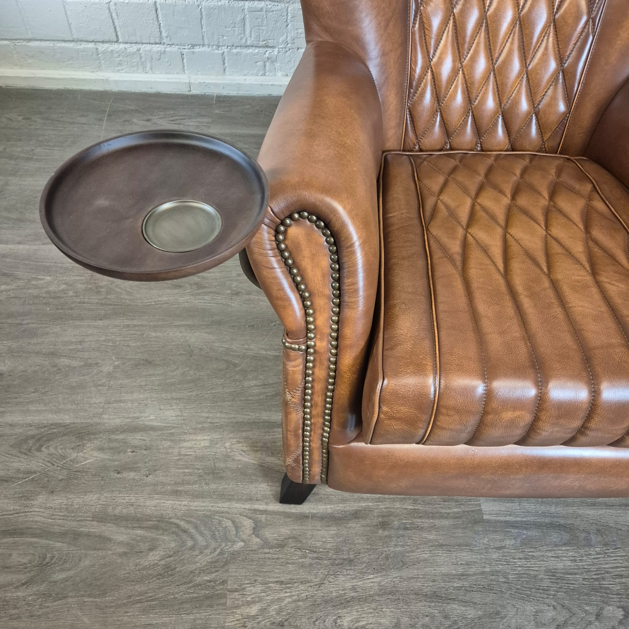 Exclusieve fauteuil met hoge rugleuning in echt leer en draaibaar dienblad